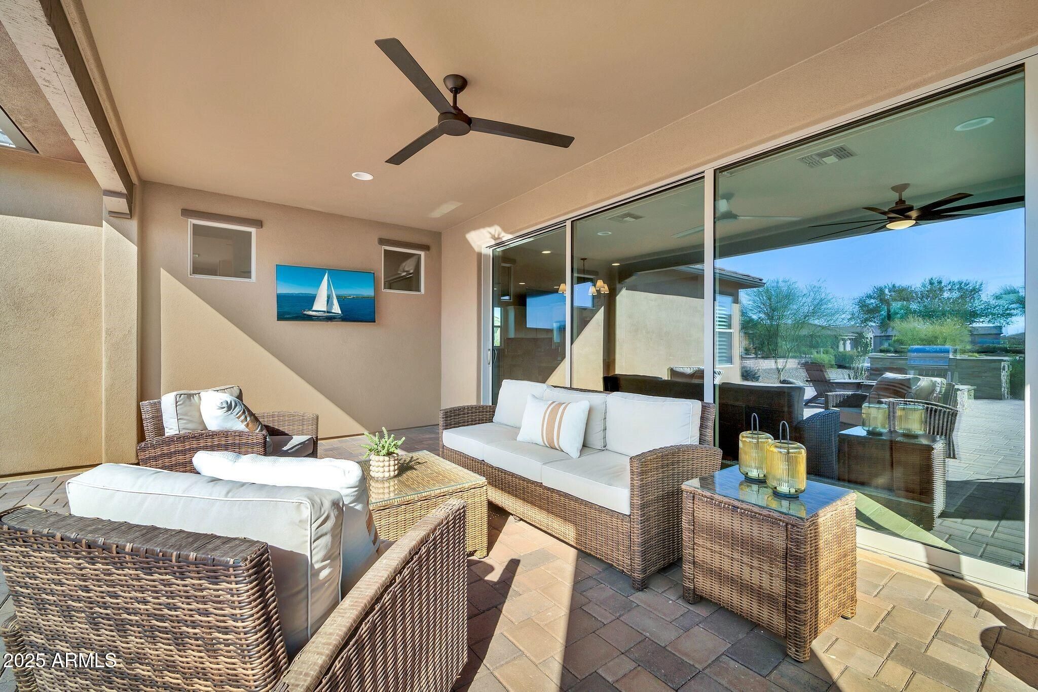 TAKE IN VIEWS OF THE FOUR PEAKS ON YOUR EXTENDED PATIO WITH A BUILT-IN GAS FIREPIT AND GRILL AT TRILOGY VR GOLF RESORT. This beautifully upgraded popular Ironwood floor plan has an on office/den with French doors designed to convert to a 3rd bedroom. Known for its open concept great room, dining area & kitchen, it has tons of Quartz counter space, a large island and gorgeous white cabinets. The home is outfitted with plantation shutters, a central vacuum system and 2 built-in desks in the smart space. Large sliding glass doors with electric blinds open to the covered patio with an outdoor TV set up. Home features an extended 2 car garage with epoxy floors & mini split A/C situated on a private cul-de-sac lot. Why wait to build when you could be living the AZ lifestyle right now?