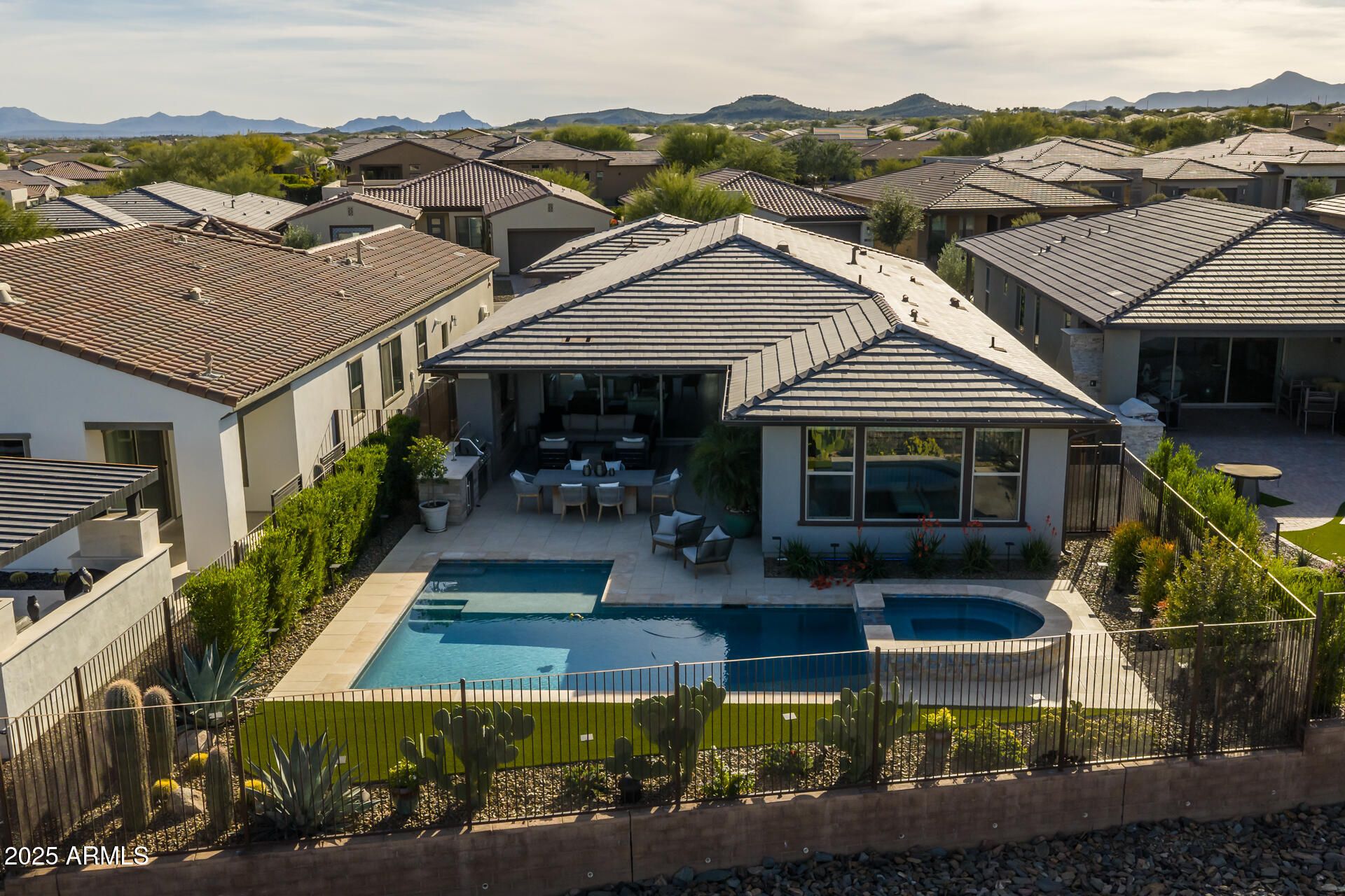 Set against the Tonto National Forest, this Ironwood floorplan showcases expansive mountain views and the privacy buyers crave in Trilogy at Verde River! Inside, the home is immaculately maintained, with no detail overlooked. The open great room features surround sound and a multi-panel sliding door that frames the views and seamlessly connects indoor and outdoor living. The kitchen is stunning with quartz countertops, a waterfall-edge breakfast bar, multiple ovens, and a built-in refrigerator. The primary suite is a private retreat, offering beautiful mountain views right from the windows. Additional living space includes two bedrooms plus a den, a stylish powder room accented with tile walls and a framed mirror, and a highly functional laundry room complete with cabinets, a desk , sink, and beverage refrigerator. Step outside to a backyard designed for both relaxation and entertaining. Enjoy the pool and spa, upgraded pool decking, built-in BBQ, and outdoor heaters, all surrounded by meticulous landscaping with easy-care artificial turf and thoughtfully lit Sonoran plants. Additional features include a 2-car garage with epoxy flooring, 4 ft extension, and custom cabinets, further enhancing the home's clean, move-in-ready appeal. This is a rare opportunity to live a life with mountain views, privacy, and thoughtful upgrades, all in a pristine, forest-backed setting. The amenities at Verde River are World Class with Tom Lehman inspired eighteen-hole Golf course, tennis courts, pickleball courts, and bocce ball, heated lap pool and Resort style swimming pool, hot tub, Afterburn fitness center, Helen's demonstration Kitchen for cooking classes and a 7.5 acre dog park. The community center has casual poolside dining at Eddy's Diner and gourmet dining at award-winning Needle Rock Kitchen and Tap, Alvea Spa with full-service Salon and Spa amenities, Art Loft and events center. Trilogy at Verde River is adjacent to the Tonto National Forest and is situated in the middle of miles and miles of hiking and biking trails.