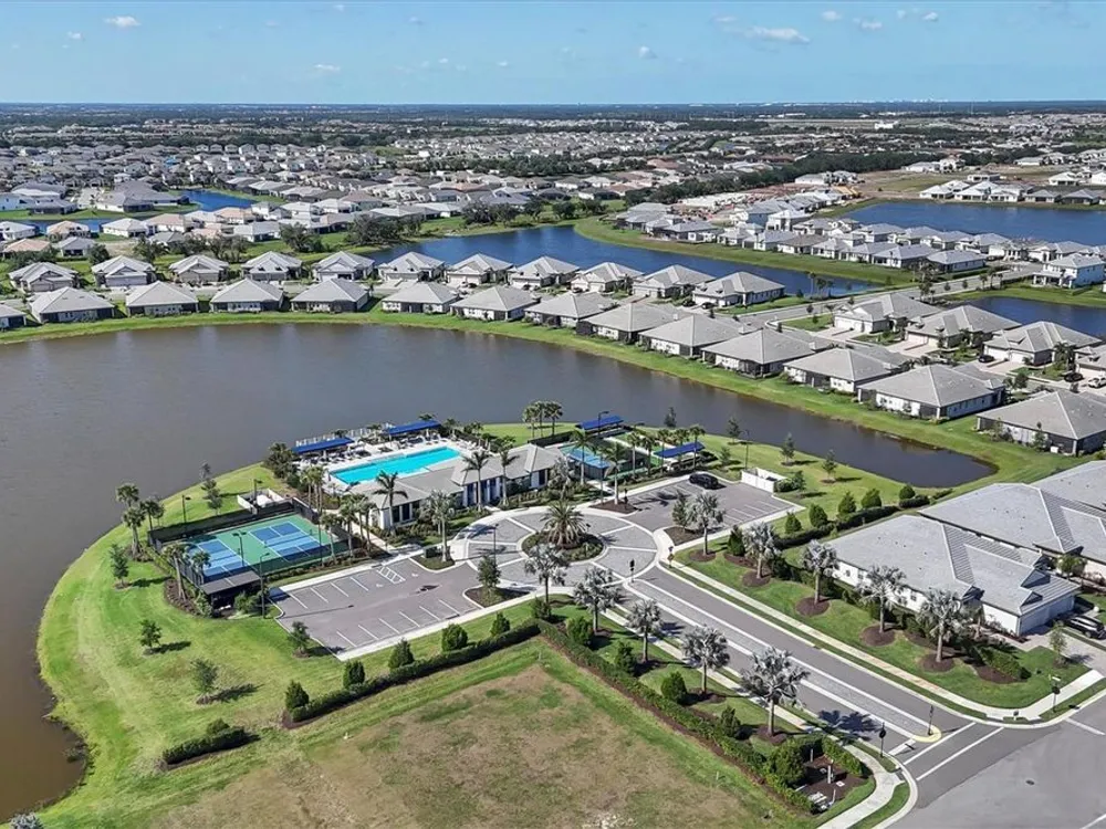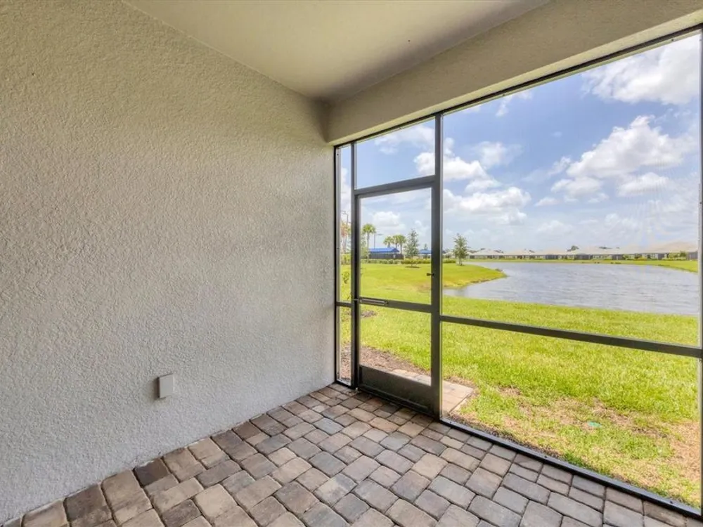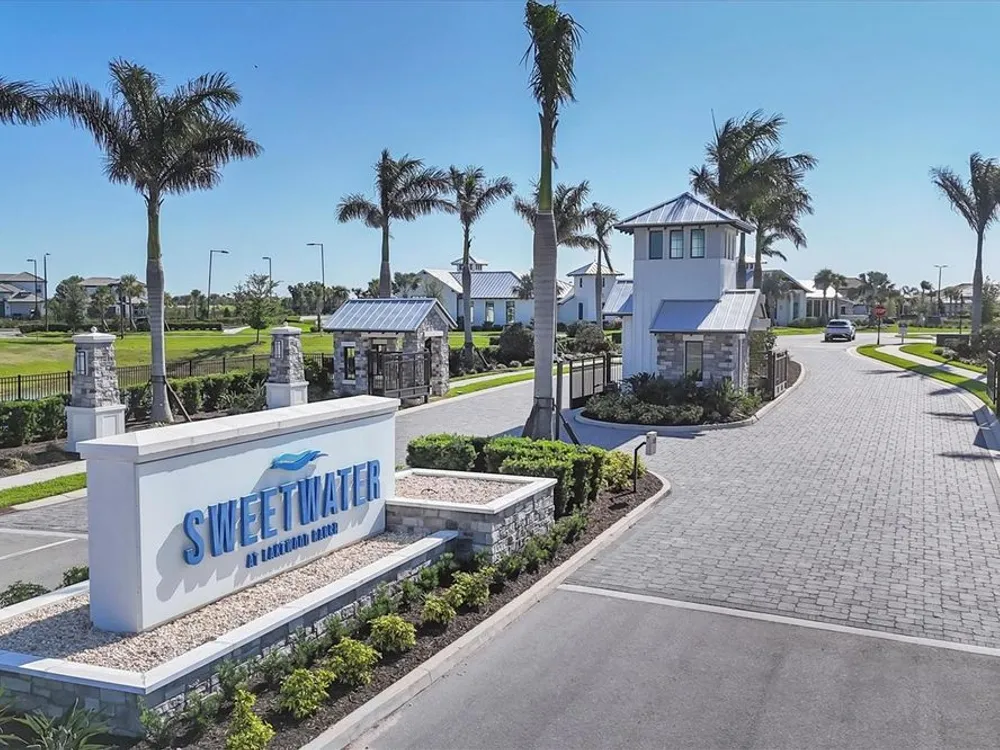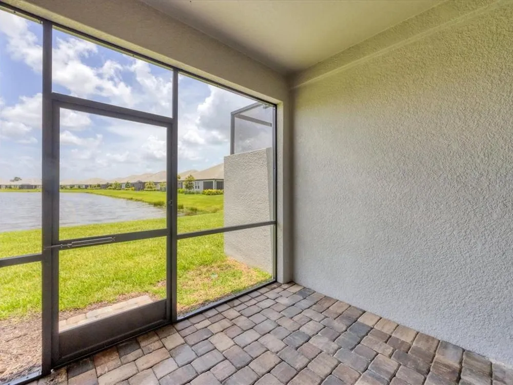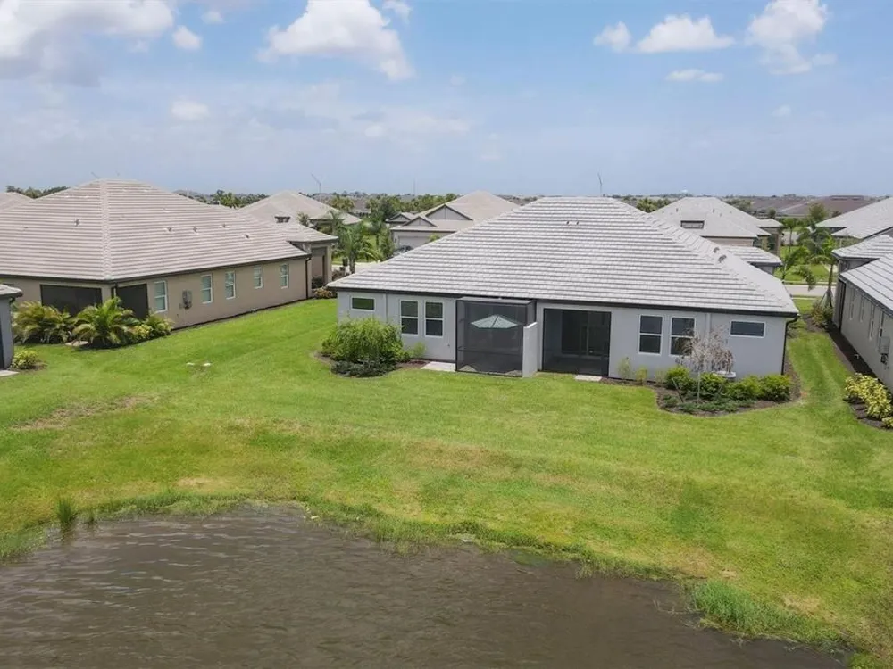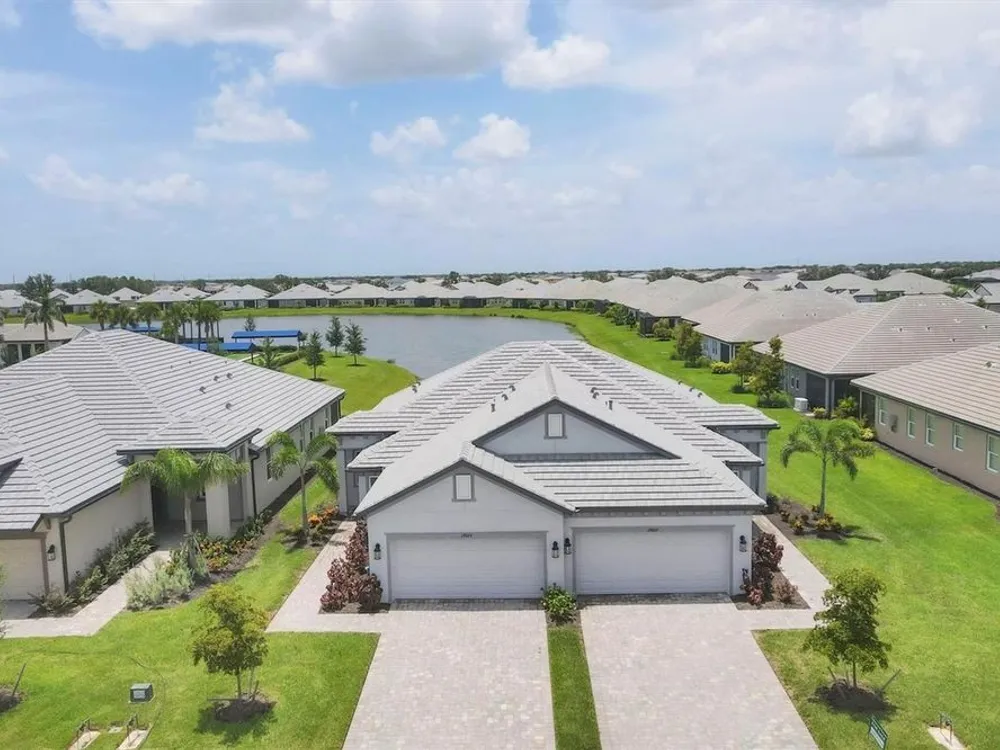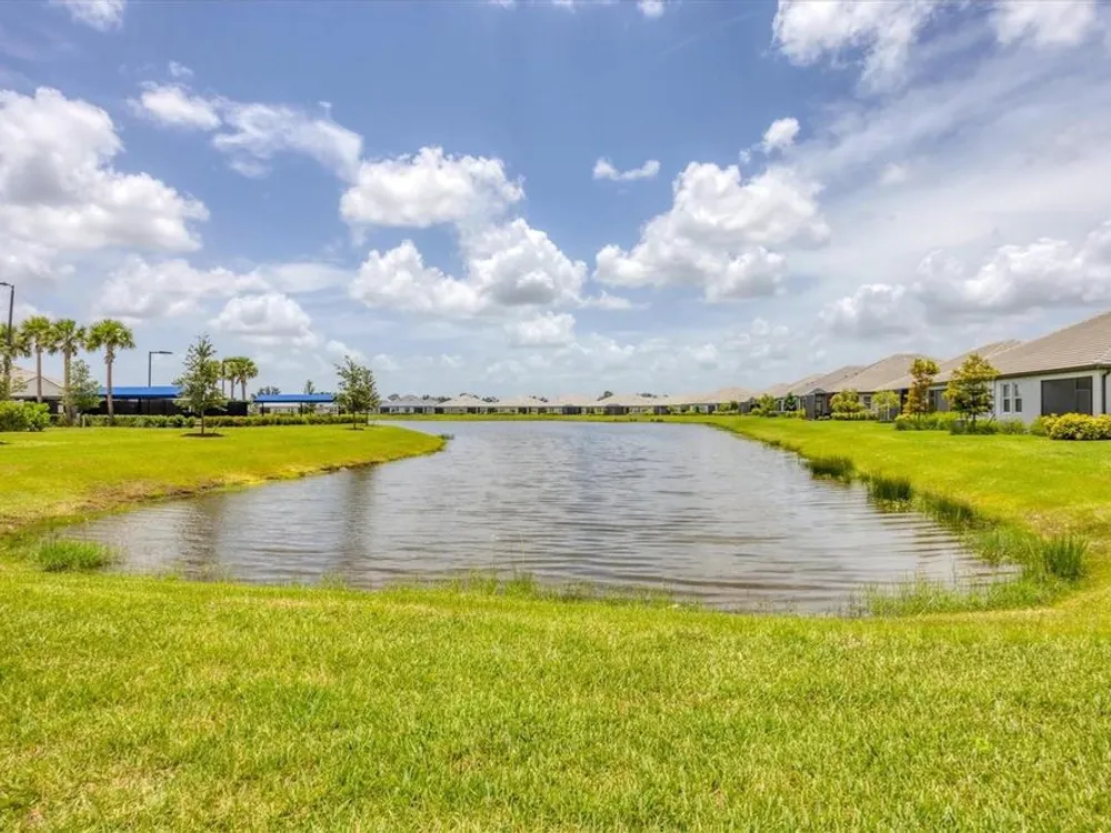 One or more photo(s) has been virtually staged. Why wait to build when you can move right into this new, never-lived-in Emerald model by M/I Homes? Enjoy serene, long water views from this beautifully designed maintenance-free villa near the Sweetwater Villas amenity center and pool. This thoughtfully laid-out home features two bedrooms plus a versatile den with double doors, ideal as a home office, guest room or hobby space. The open-concept floor plan flows seamlessly from the spacious great room to the paver, screened lanai overlooking the lake, an ideal setting for relaxing or entertaining. Inside, you'll find neutral tile flooring throughout, bright white paint and an elegant kitchen featuring white cabinetry, new stainless steel appliances, quartz countertops, a breakfast bar and a sleek glossy white backsplash. The primary suite offers peaceful lake views, a large walk-in closet, and an en-suite bath with dual sinks, quartz counters, white cabinetry and a walk-in glass-enclosed shower. The guest suite is privately tucked away and includes a stylish bath with a marbled tile walk-in shower. A two-car garage and paver driveway complete this move-in-ready home. Enjoy effortless, maintenance-free living with professional landscaping and irrigation included, all in a gated neighborhood offering plentiful resort-style amenities for a carefree lifestyle. Sweetwater at Lakewood Ranch offers an exceptional array of amenities, including two amenity centers, heated pool, playground, multi-purpose sports court, pickleball courts, bocce ball courts, a 24-hour fitness room, social hall, festival lawn and amphitheater. Easy living, lock and leave, ideal for a winter getaway! Your new home awaits in this vibrant, amenity-rich community. This is Florida living at its finest.