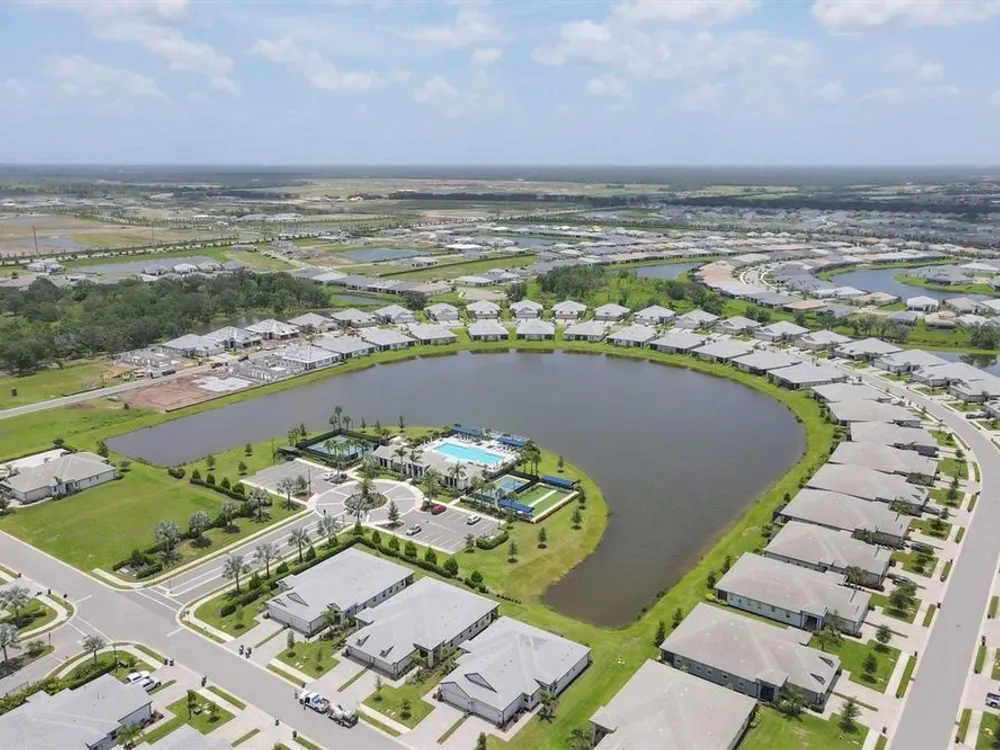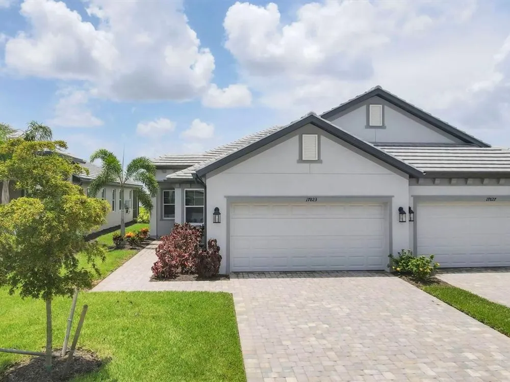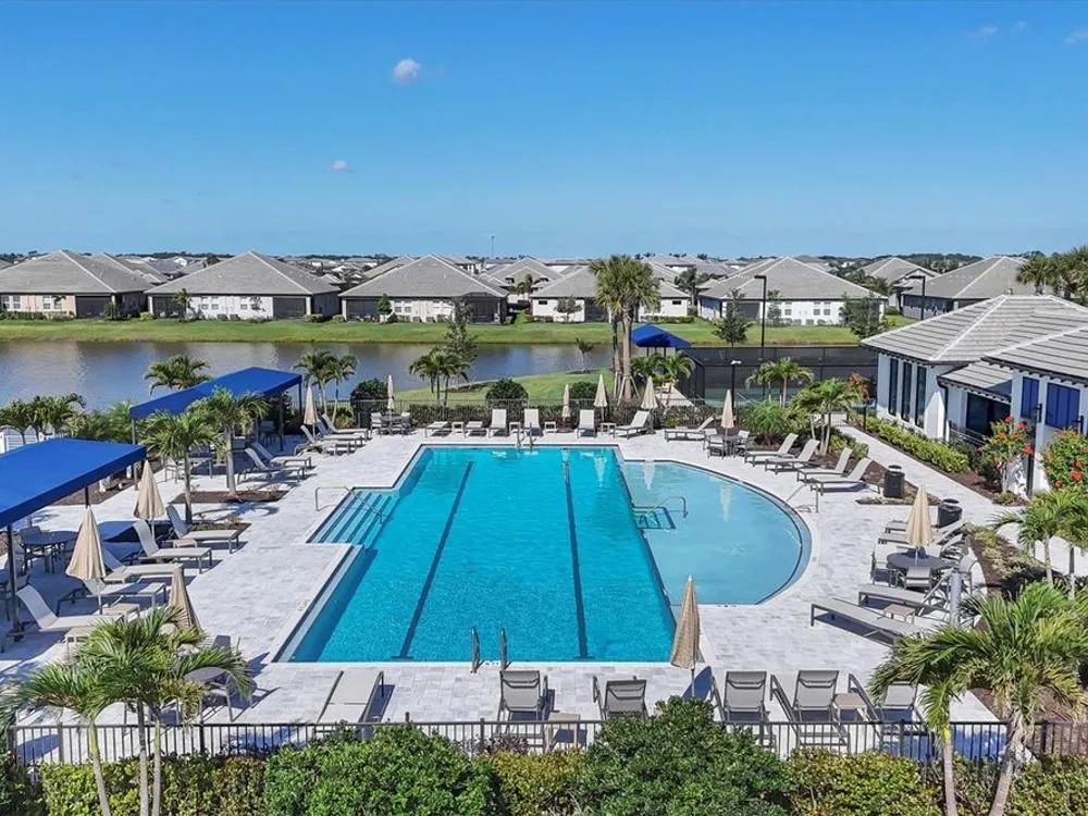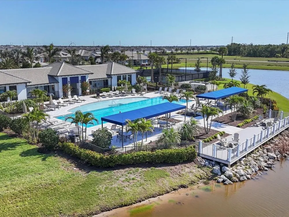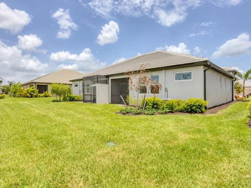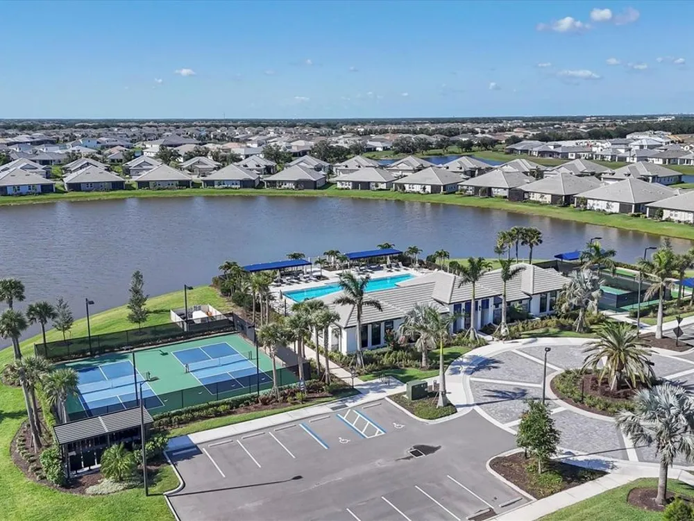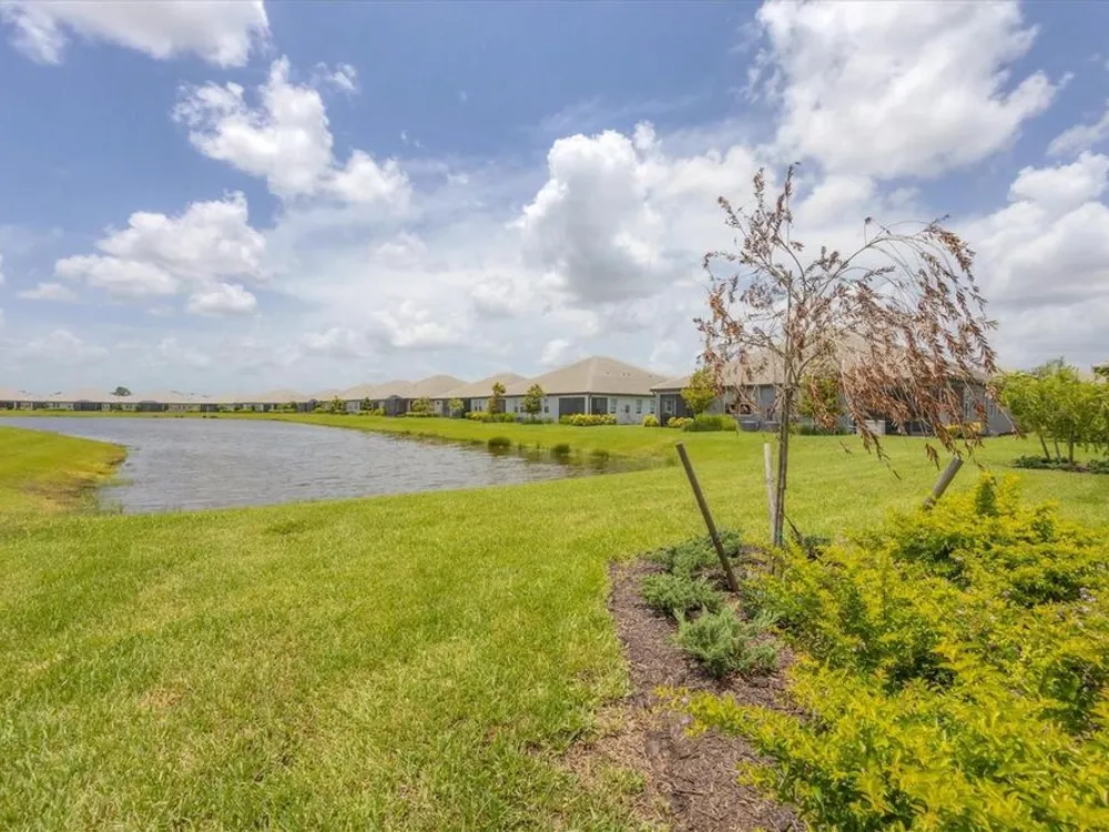 One or more photo(s) has been virtually staged. Why wait to build when you can move right into this new, never-lived-in Emerald model by M/I Homes? Enjoy serene, long water views from this beautifully designed maintenance-free villa near the Sweetwater Villas amenity center and pool. This thoughtfully laid-out home features two bedrooms plus a versatile den with double doors, ideal as a home office, guest room or hobby space. The open-concept floor plan flows seamlessly from the spacious great room to the paver, screened lanai overlooking the lake, an ideal setting for relaxing or entertaining. Inside, you'll find neutral tile flooring throughout, bright white paint and an elegant kitchen featuring white cabinetry, new stainless steel appliances, quartz countertops, a breakfast bar and a sleek glossy white backsplash. The primary suite offers peaceful lake views, a large walk-in closet, and an en-suite bath with dual sinks, quartz counters, white cabinetry and a walk-in glass-enclosed shower. The guest suite is privately tucked away and includes a stylish bath with a marbled tile walk-in shower. A two-car garage and paver driveway complete this move-in-ready home. Enjoy effortless, maintenance-free living with professional landscaping and irrigation included, all in a gated neighborhood offering plentiful resort-style amenities for a carefree lifestyle. Sweetwater at Lakewood Ranch offers an exceptional array of amenities, including two amenity centers, heated pool, playground, multi-purpose sports court, pickleball courts, bocce ball courts, a 24-hour fitness room, social hall, festival lawn and amphitheater. Easy living, lock and leave, ideal for a winter getaway! Your new home awaits in this vibrant, amenity-rich community. This is Florida living at its finest.