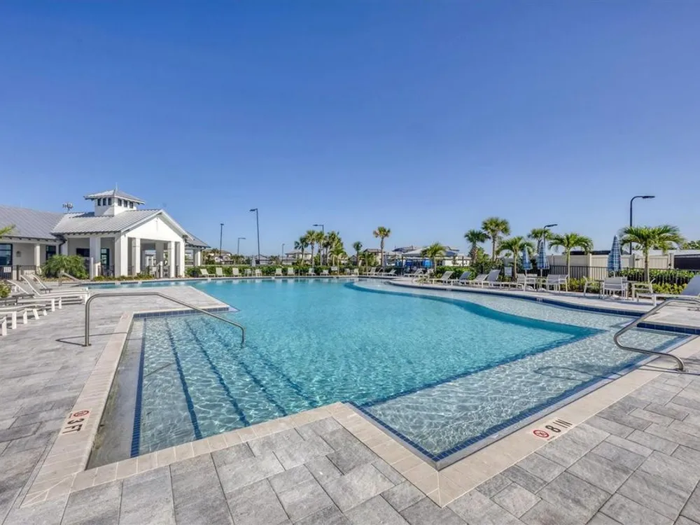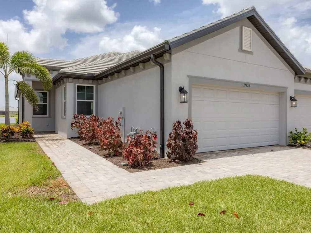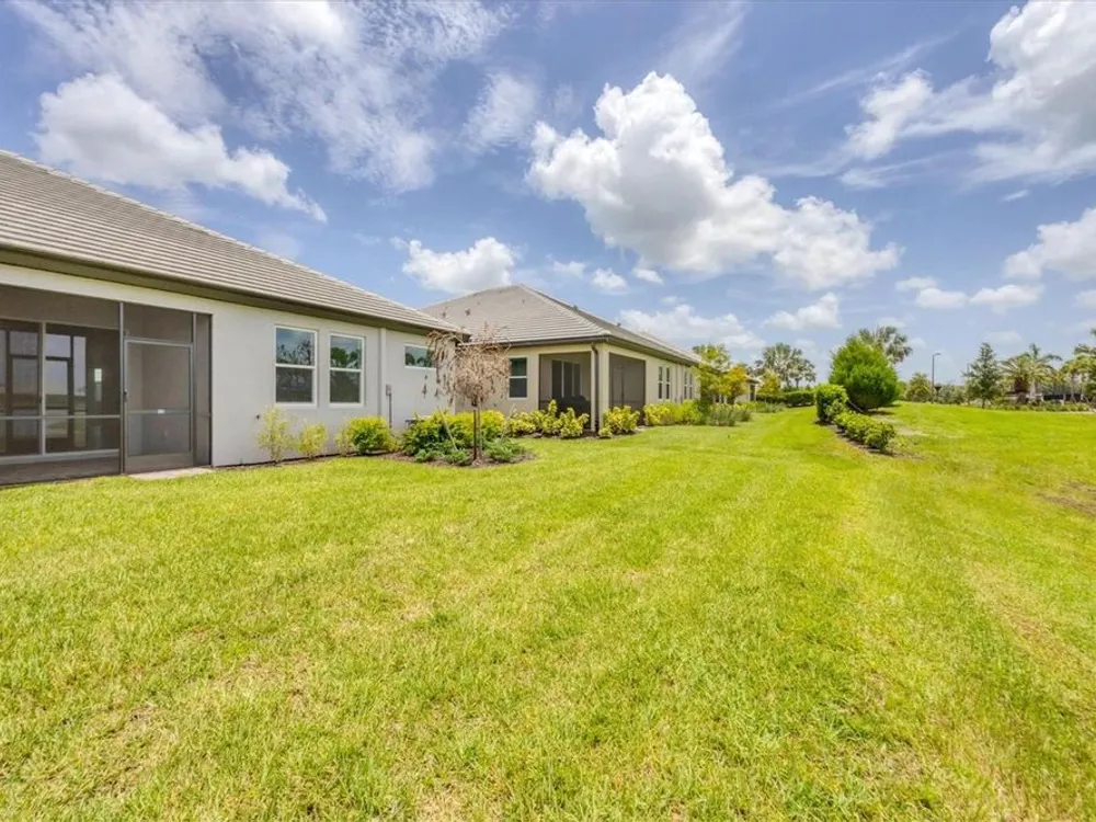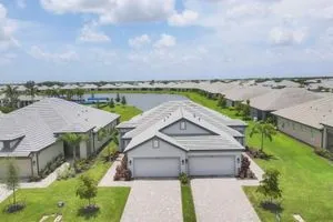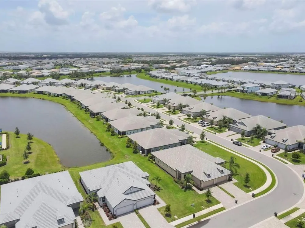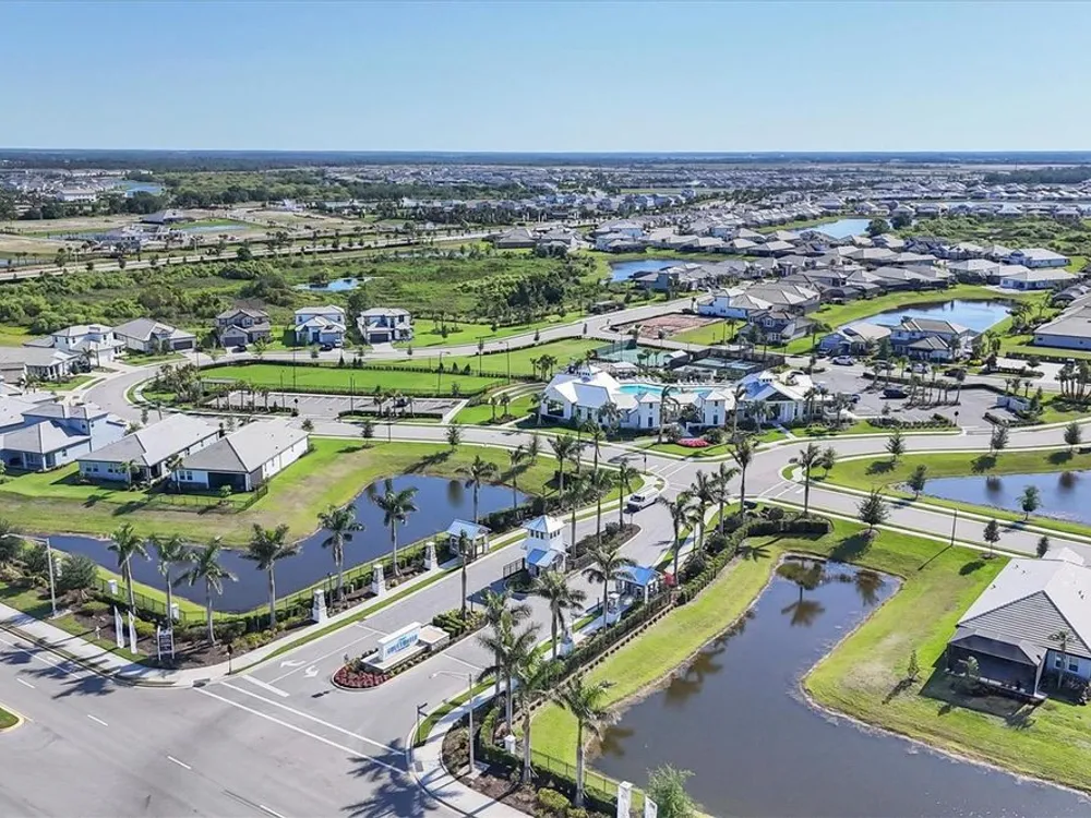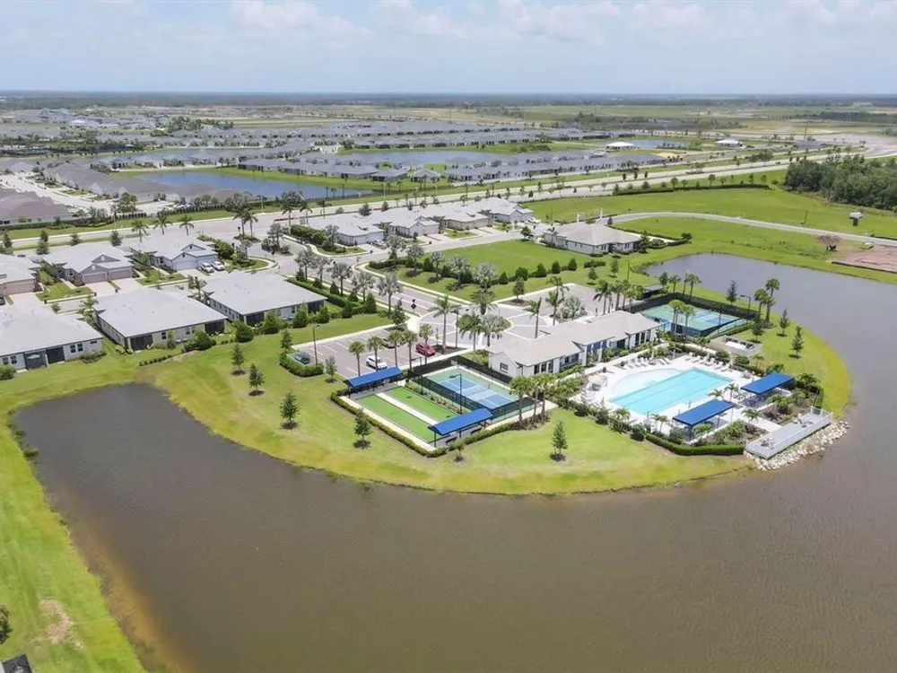 One or more photo(s) has been virtually staged. Why wait to build when you can move right into this new, never-lived-in Emerald model by M/I Homes? Enjoy serene, long water views from this beautifully designed maintenance-free villa near the Sweetwater Villas amenity center and pool. This thoughtfully laid-out home features two bedrooms plus a versatile den with double doors, ideal as a home office, guest room or hobby space. The open-concept floor plan flows seamlessly from the spacious great room to the paver, screened lanai overlooking the lake, an ideal setting for relaxing or entertaining. Inside, you'll find neutral tile flooring throughout, bright white paint and an elegant kitchen featuring white cabinetry, new stainless steel appliances, quartz countertops, a breakfast bar and a sleek glossy white backsplash. The primary suite offers peaceful lake views, a large walk-in closet, and an en-suite bath with dual sinks, quartz counters, white cabinetry and a walk-in glass-enclosed shower. The guest suite is privately tucked away and includes a stylish bath with a marbled tile walk-in shower. A two-car garage and paver driveway complete this move-in-ready home. Enjoy effortless, maintenance-free living with professional landscaping and irrigation included, all in a gated neighborhood offering plentiful resort-style amenities for a carefree lifestyle. Sweetwater at Lakewood Ranch offers an exceptional array of amenities, including two amenity centers, heated pool, playground, multi-purpose sports court, pickleball courts, bocce ball courts, a 24-hour fitness room, social hall, festival lawn and amphitheater. Easy living, lock and leave, ideal for a winter getaway! Your new home awaits in this vibrant, amenity-rich community. This is Florida living at its finest.