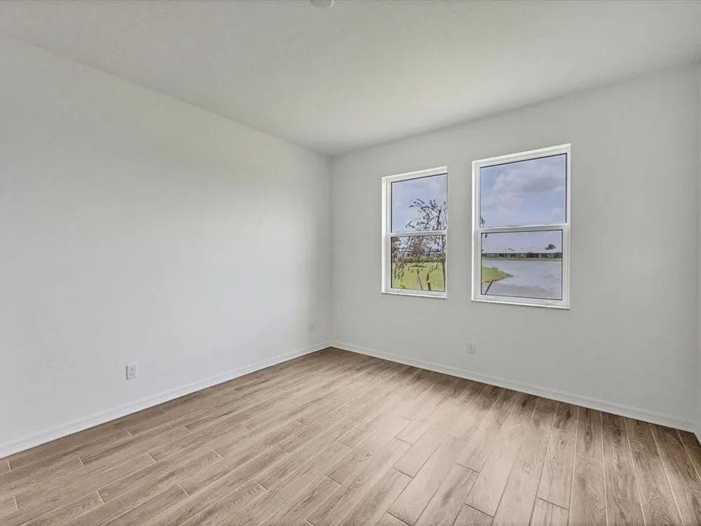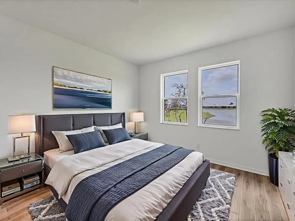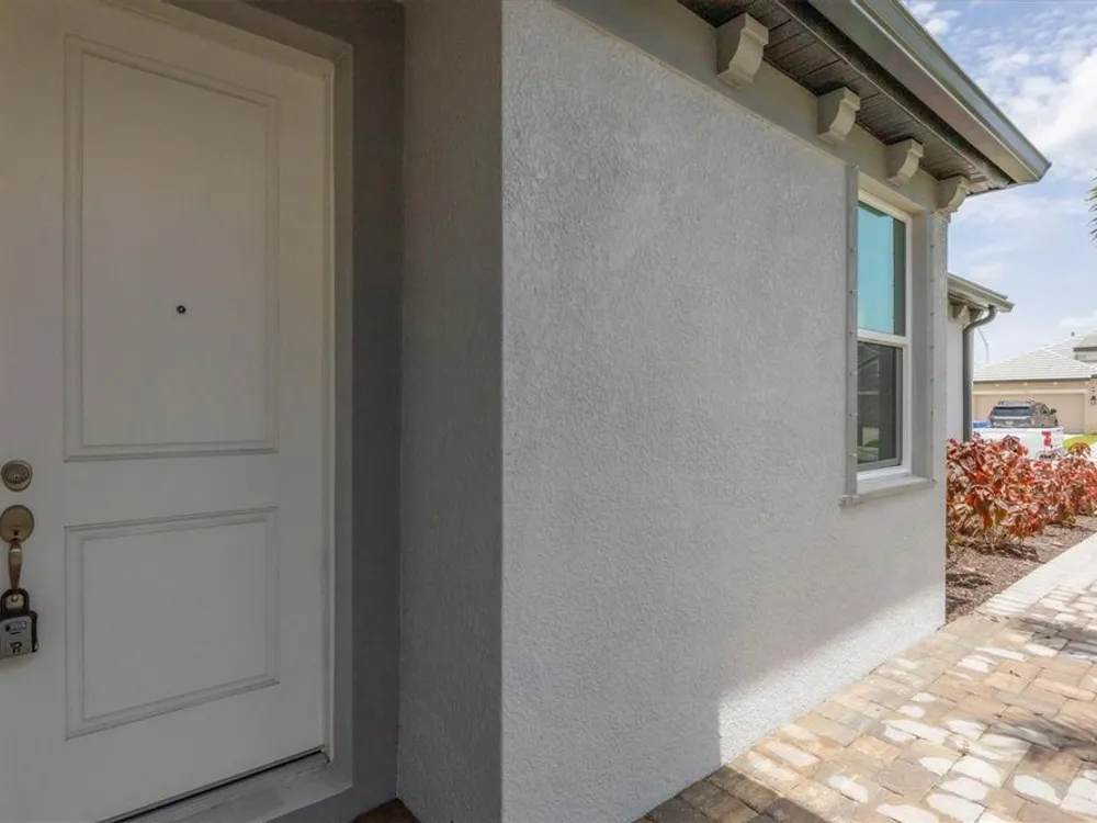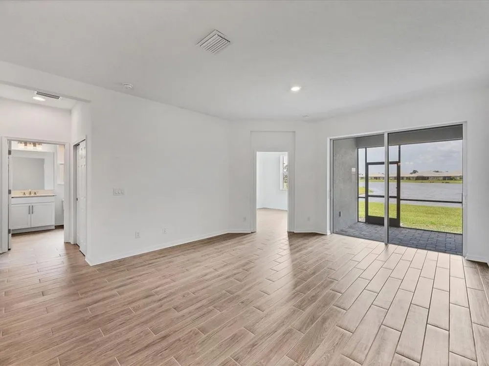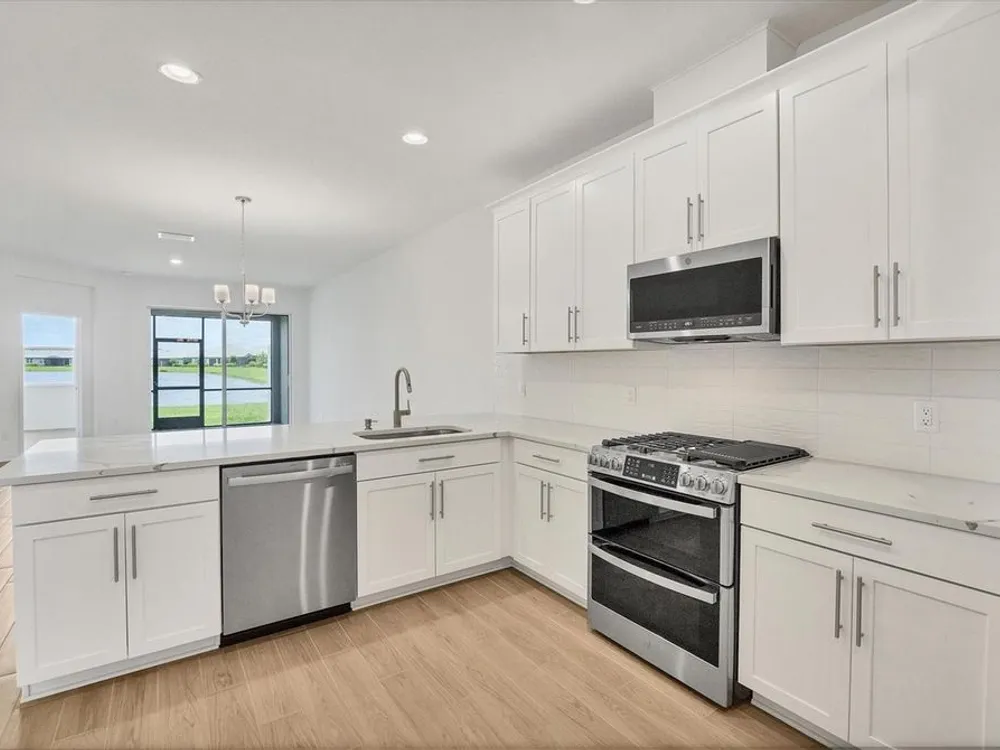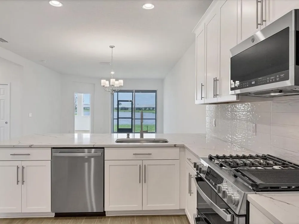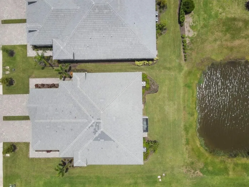 One or more photo(s) has been virtually staged. Why wait to build when you can move right into this new, never-lived-in Emerald model by M/I Homes? Enjoy serene, long water views from this beautifully designed maintenance-free villa near the Sweetwater Villas amenity center and pool. This thoughtfully laid-out home features two bedrooms plus a versatile den with double doors, ideal as a home office, guest room or hobby space. The open-concept floor plan flows seamlessly from the spacious great room to the paver, screened lanai overlooking the lake, an ideal setting for relaxing or entertaining. Inside, you'll find neutral tile flooring throughout, bright white paint and an elegant kitchen featuring white cabinetry, new stainless steel appliances, quartz countertops, a breakfast bar and a sleek glossy white backsplash. The primary suite offers peaceful lake views, a large walk-in closet, and an en-suite bath with dual sinks, quartz counters, white cabinetry and a walk-in glass-enclosed shower. The guest suite is privately tucked away and includes a stylish bath with a marbled tile walk-in shower. A two-car garage and paver driveway complete this move-in-ready home. Enjoy effortless, maintenance-free living with professional landscaping and irrigation included, all in a gated neighborhood offering plentiful resort-style amenities for a carefree lifestyle. Sweetwater at Lakewood Ranch offers an exceptional array of amenities, including two amenity centers, heated pool, playground, multi-purpose sports court, pickleball courts, bocce ball courts, a 24-hour fitness room, social hall, festival lawn and amphitheater. Easy living, lock and leave, ideal for a winter getaway! Your new home awaits in this vibrant, amenity-rich community. This is Florida living at its finest.