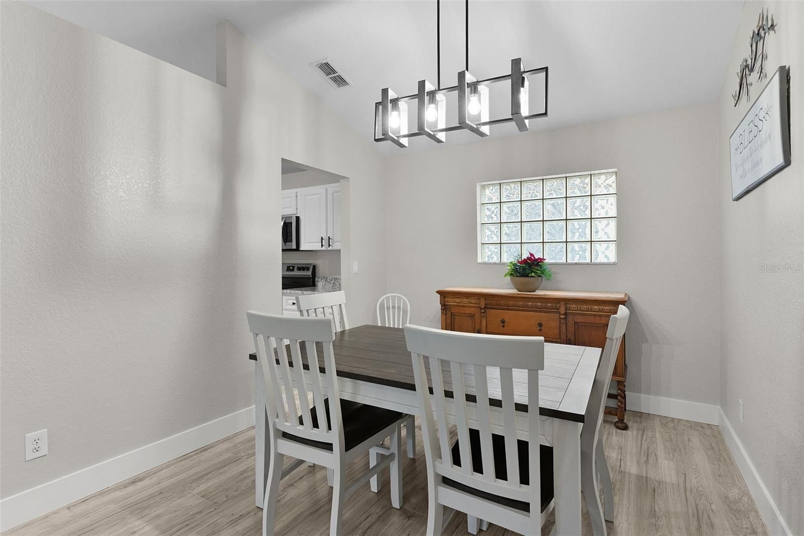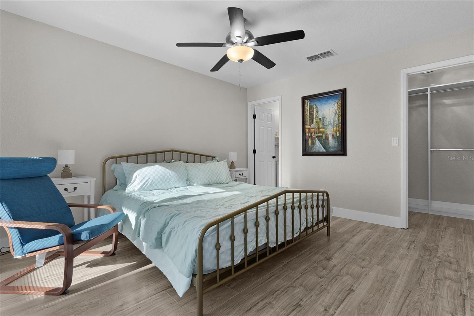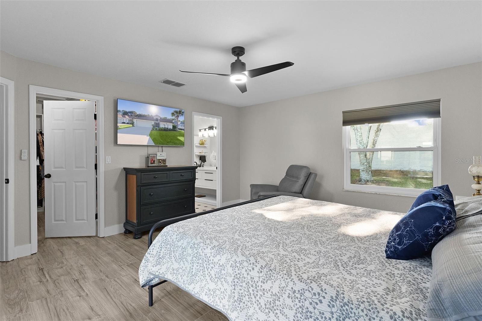- Ceiling Fan(s), Eat-in Kitchen, Living/Dining Room, Open Floorplan, Main Level Primary, Solid Surface Counters, Thermostat, Vaulted Ceiling(s), Walk-In Closet(s), Window Treatments