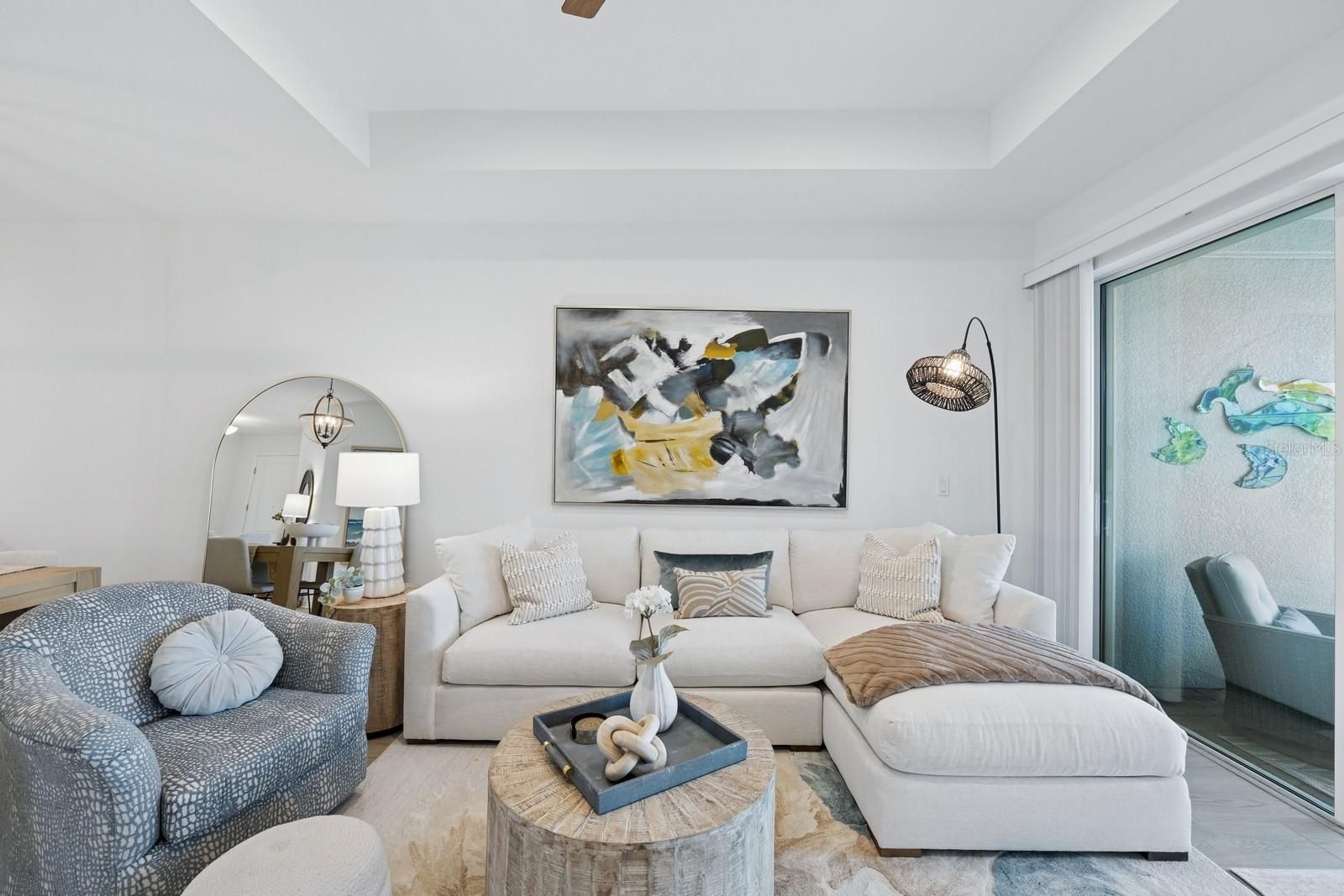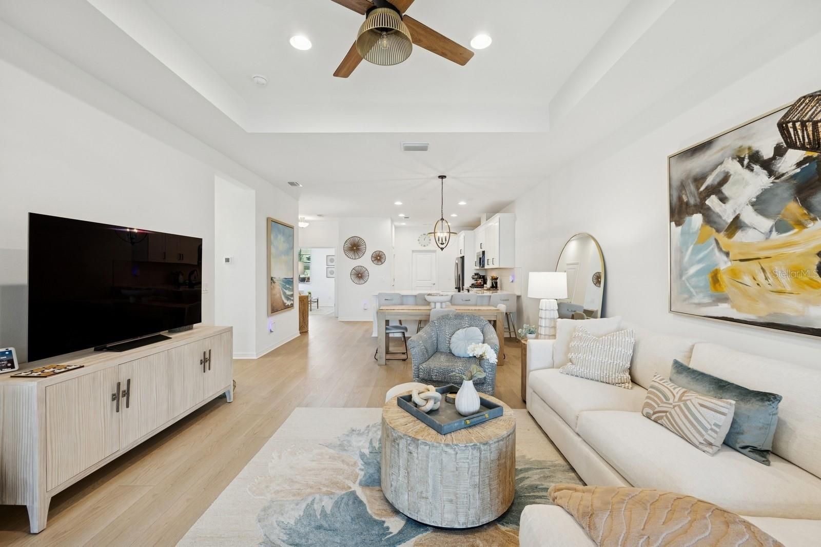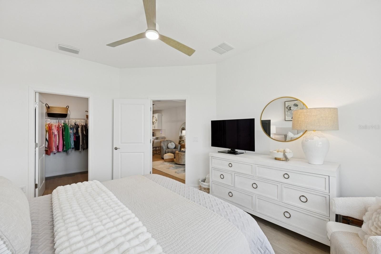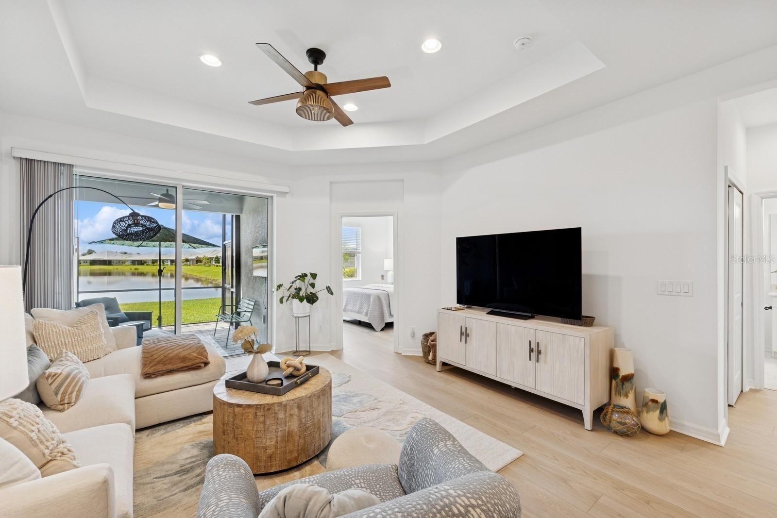 - High Ceilings, Living/Dining Room, Open Floorplan, Main Level Primary, Solid Surface Counters, Tray Ceiling(s), Walk-In Closet(s)
