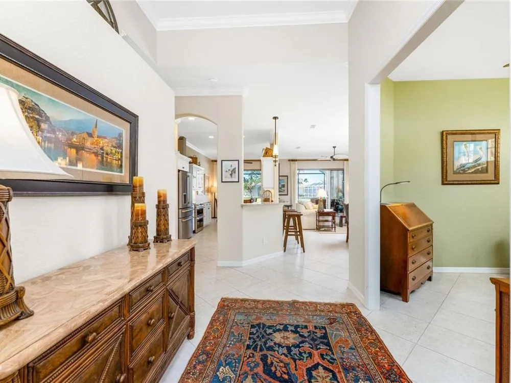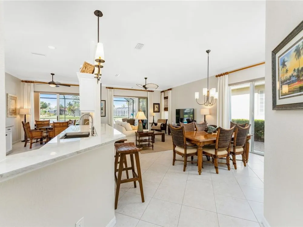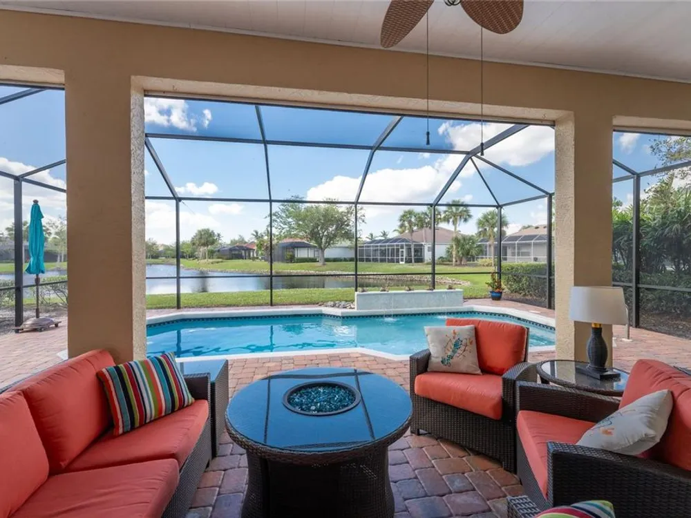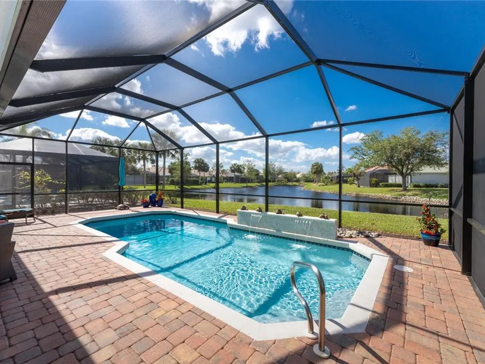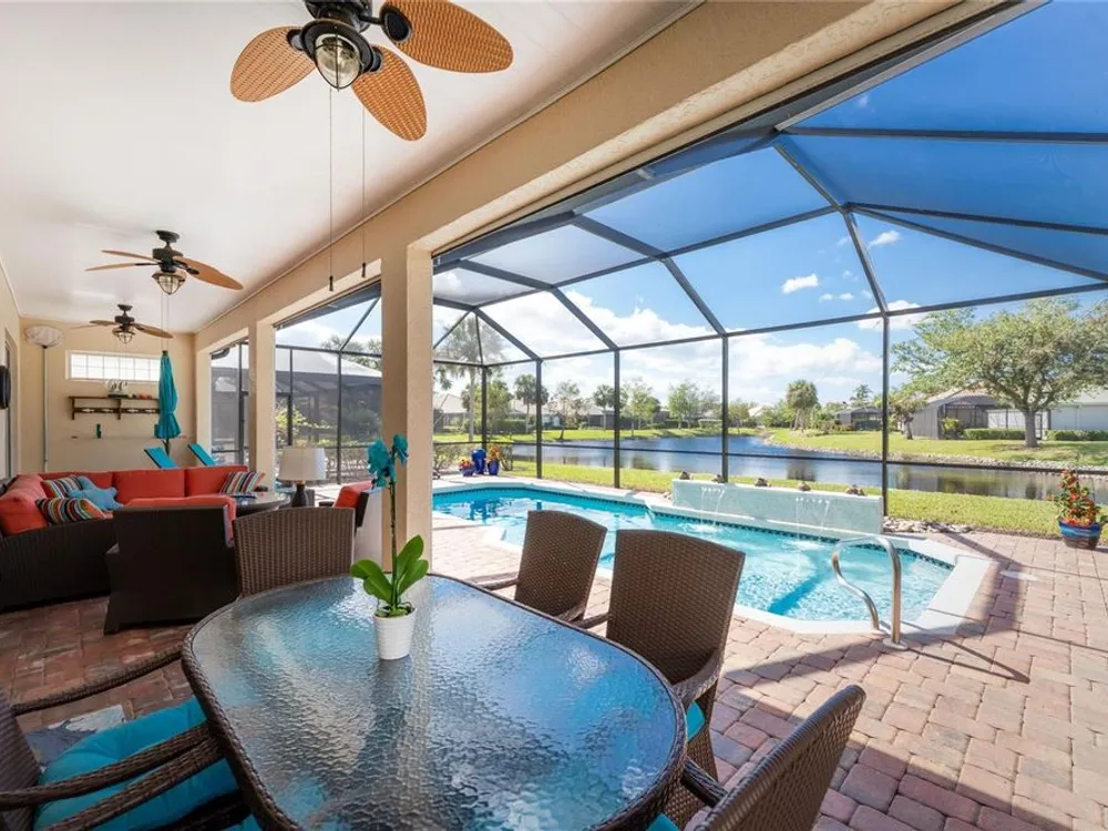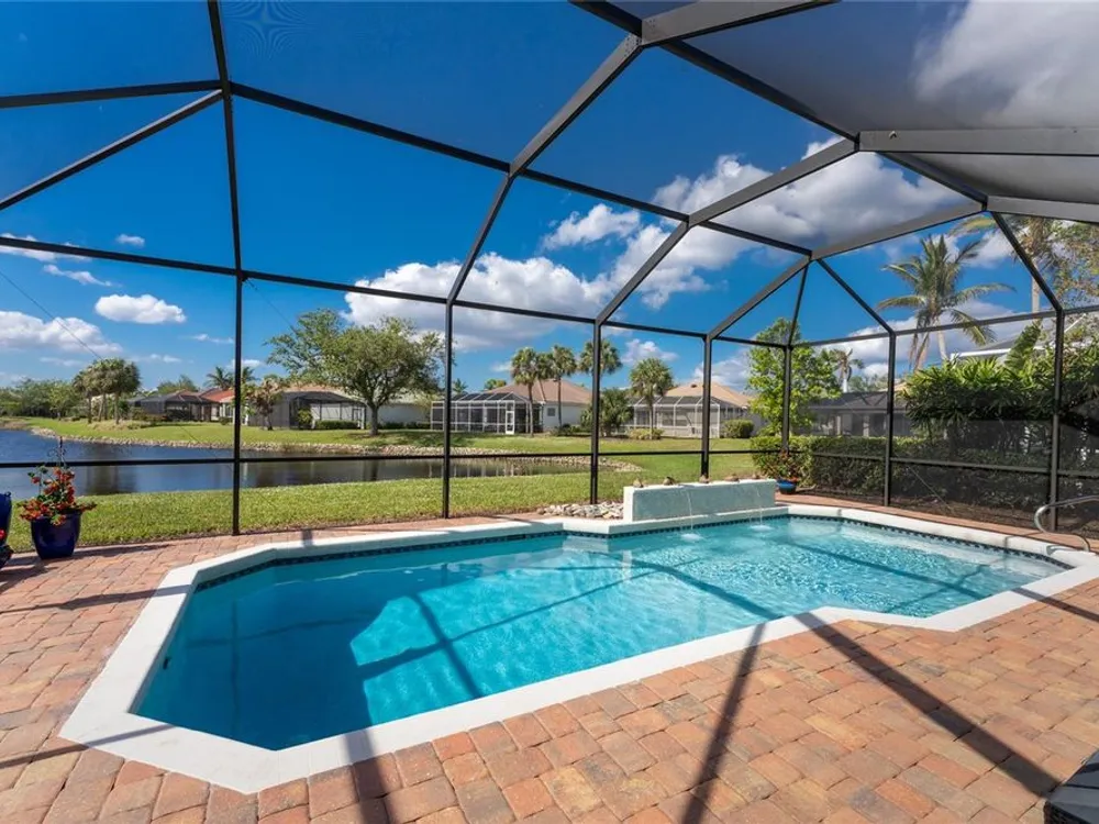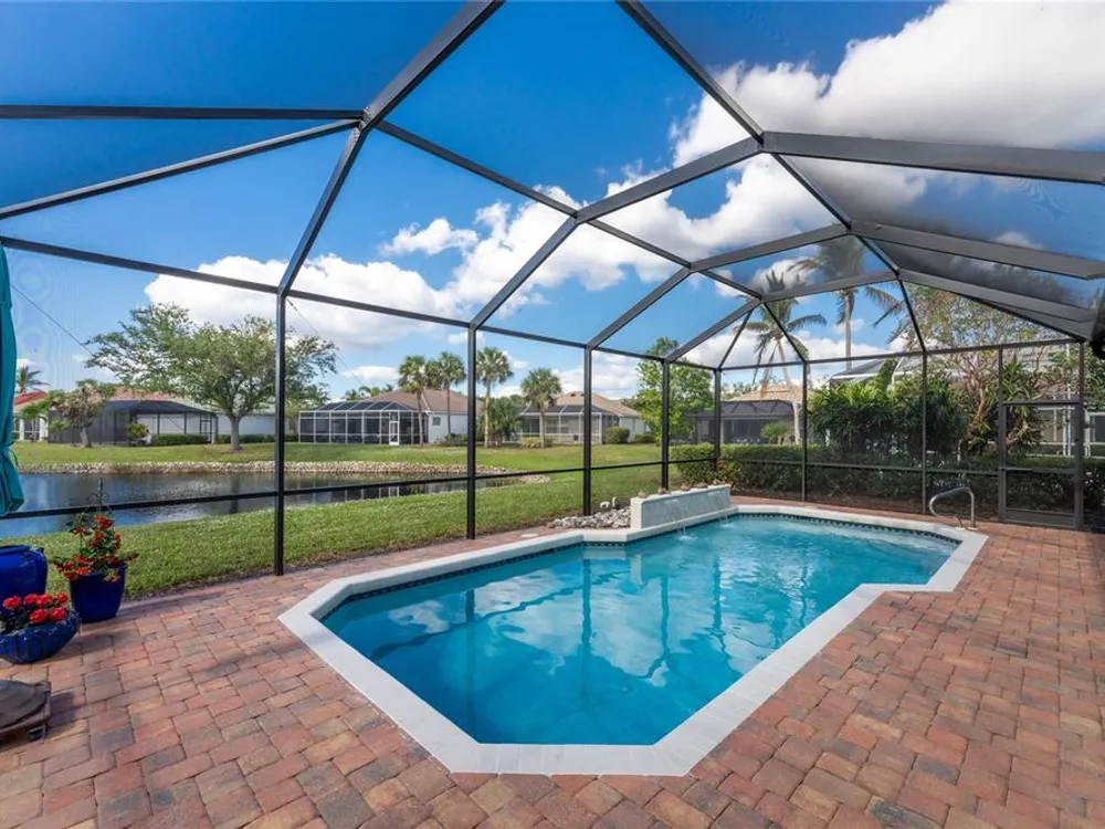 No detail has been overlooked in this brilliantly updated two bedroom plus den lakefront home, located in the coveted neighborhood of Courtside Landings in Burnt Store Marina. Nestled in the heart of the community, this home is just a short walk to Cass Cay waterfront restaurant, the Trading Post, the south marina basin, fitness, pickleball and tennis. As you approach this charming retreat, you are sure to appreciate the paver drive, pleasing landscape and the handsome new roof - installed in 2023. This stunning Lacoste floor plan is being offered partially furnished, so you can move right in and begin living the vibrant Florida lifestyle you’ve been dreaming of! You are sure to be impressed with the striking architecture from the moment you enter the inviting foyer. At the heart of the home, the freshly renovated kitchen showcases impeccable craftsmanship by Cornerstone Builders. Extensive white shaker cabinetry is adorned with Taj Mahal quartzite countertops, zellige tile backsplash, and sleek GE Café stainless steel appliances, including a double oven and induction cooktop with stainless hood…a true chef’s delight! Crisp white cabinetry is accentuated by decorative glass insets, pull out shelving and a handy touch faucet that add sophistication to this stylish space. The main living area exudes refinement, featuring crown molding, diamond-set tile flooring, custom drapery, and plenty of natural light through three sets of sliding doors. Step outside to the expansive paver pool deck, where a large pool with double waterfall, promises endless relaxation and entertainment, all set against the serene backdrop of the lake. The home’s thoughtful layout includes two bedrooms plus a den, providing flexible space for guests or a home office. Your guests will be delighted to stay in the attractive guest suite which enjoys abundant sunshine, laminate flooring and a tasteful bath updated by Cornerstone. The spacious primary suite is a private retreat with tasteful tray ceiling, laminate flooring and pool and pond views framed by sliding doors that lead out to the lanai. Two closets flank the hall leading to the luxurious en-suite bath with dual sinks and a spacious tiled walk-in shower. Full hurricane protection provides peace of mind, including convenient motorized storm screens on the lanai, and an upgraded hurricane grade garage door. Step outside and enjoy easy access to the community’s friendly social and recreational culture. The gated community of Burnt Store Marina boasts a 27-hole golf course, clubhouse with tiki bar, two on-site restaurants, tennis, pickleball, fitness center, and lots of great people! Come for the lifestyle…stay for life!