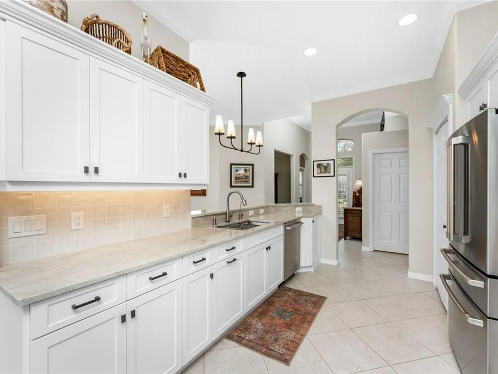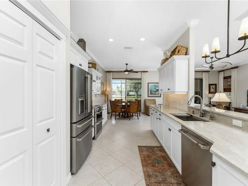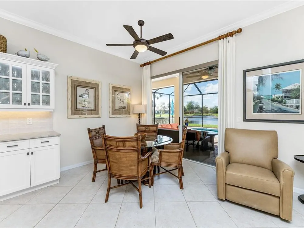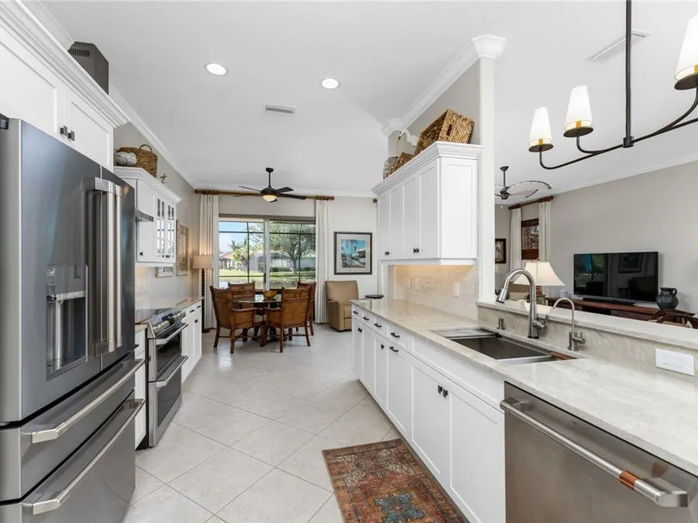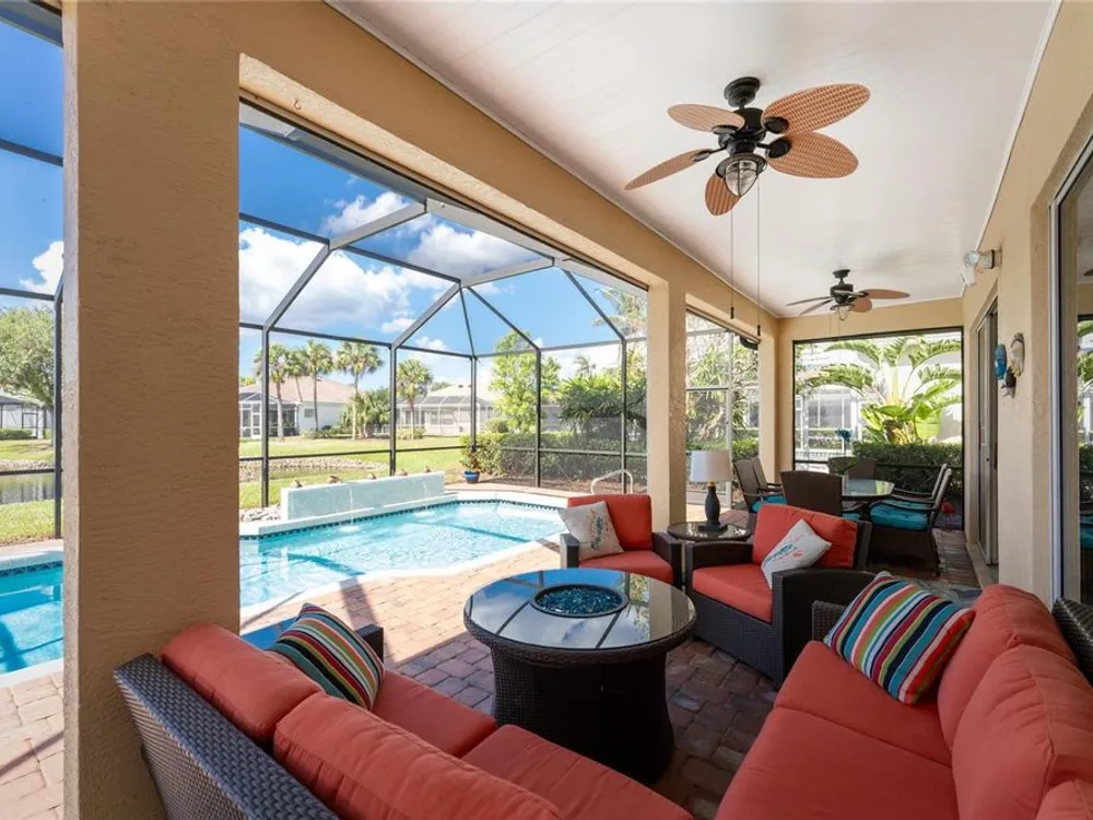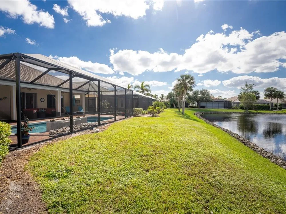 No detail has been overlooked in this brilliantly updated two bedroom plus den lakefront home, located in the coveted neighborhood of Courtside Landings in Burnt Store Marina. Nestled in the heart of the community, this home is just a short walk to Cass Cay waterfront restaurant, the Trading Post, the south marina basin, fitness, pickleball and tennis. As you approach this charming retreat, you are sure to appreciate the paver drive, pleasing landscape and the handsome new roof - installed in 2023. This stunning Lacoste floor plan is being offered partially furnished, so you can move right in and begin living the vibrant Florida lifestyle you’ve been dreaming of! You are sure to be impressed with the striking architecture from the moment you enter the inviting foyer. At the heart of the home, the freshly renovated kitchen showcases impeccable craftsmanship by Cornerstone Builders. Extensive white shaker cabinetry is adorned with Taj Mahal quartzite countertops, zellige tile backsplash, and sleek GE Café stainless steel appliances, including a double oven and induction cooktop with stainless hood…a true chef’s delight! Crisp white cabinetry is accentuated by decorative glass insets, pull out shelving and a handy touch faucet that add sophistication to this stylish space. The main living area exudes refinement, featuring crown molding, diamond-set tile flooring, custom drapery, and plenty of natural light through three sets of sliding doors. Step outside to the expansive paver pool deck, where a large pool with double waterfall, promises endless relaxation and entertainment, all set against the serene backdrop of the lake. The home’s thoughtful layout includes two bedrooms plus a den, providing flexible space for guests or a home office. Your guests will be delighted to stay in the attractive guest suite which enjoys abundant sunshine, laminate flooring and a tasteful bath updated by Cornerstone. The spacious primary suite is a private retreat with tasteful tray ceiling, laminate flooring and pool and pond views framed by sliding doors that lead out to the lanai. Two closets flank the hall leading to the luxurious en-suite bath with dual sinks and a spacious tiled walk-in shower. Full hurricane protection provides peace of mind, including convenient motorized storm screens on the lanai, and an upgraded hurricane grade garage door. Step outside and enjoy easy access to the community’s friendly social and recreational culture. The gated community of Burnt Store Marina boasts a 27-hole golf course, clubhouse with tiki bar, two on-site restaurants, tennis, pickleball, fitness center, and lots of great people! Come for the lifestyle…stay for life!