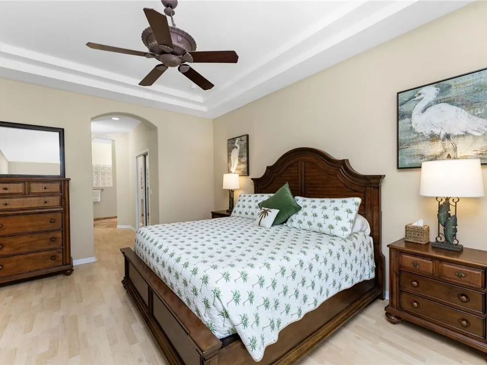- Ceiling Fan(s), Crown Molding, Eat-in Kitchen, High Ceilings, Living/Dining Room, Open Floorplan, Main Level Primary, Split Bedrooms, Stone Counters, Tray Ceiling(s), Walk-In Closet(s), Window Treatments