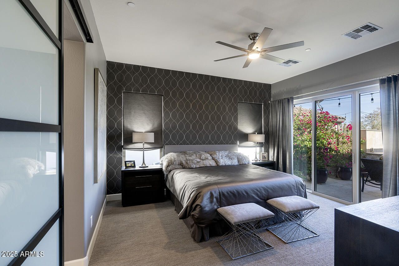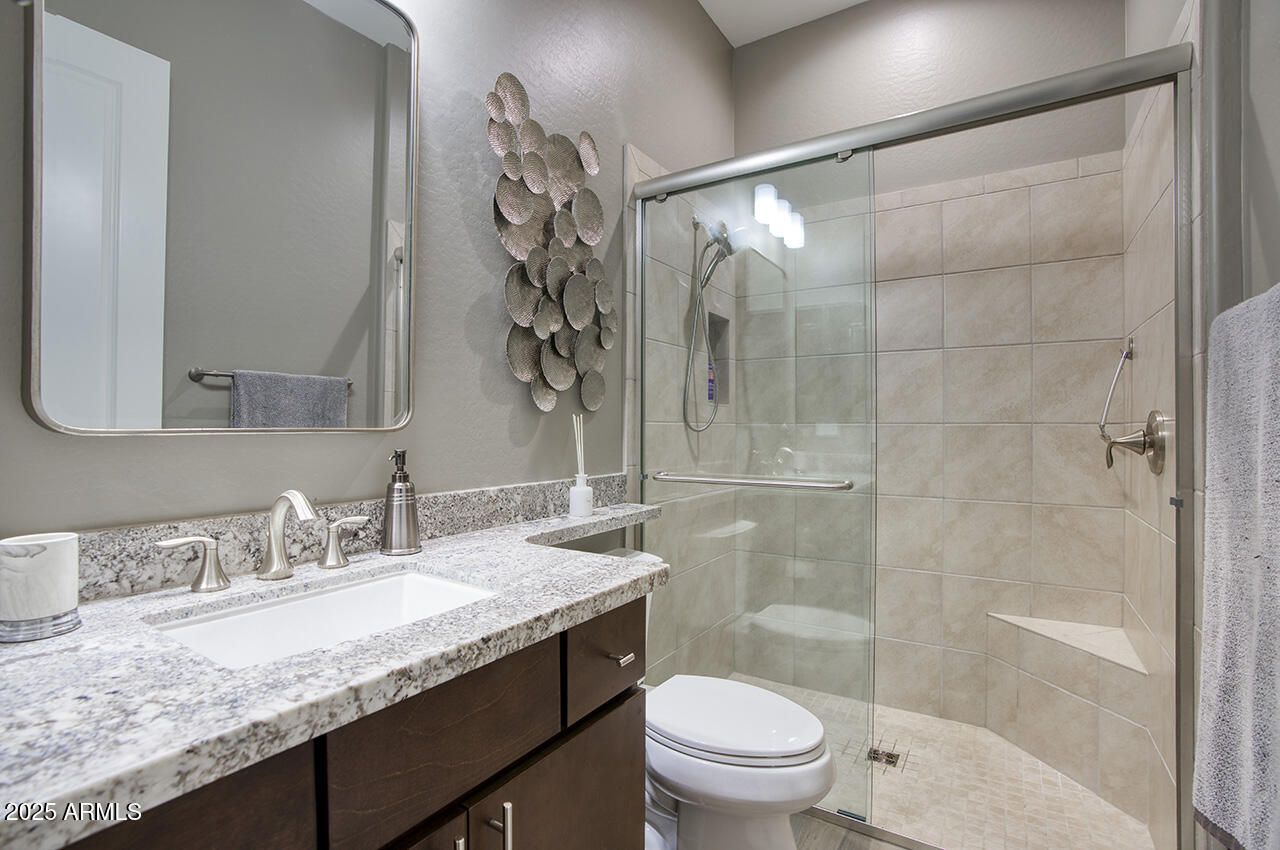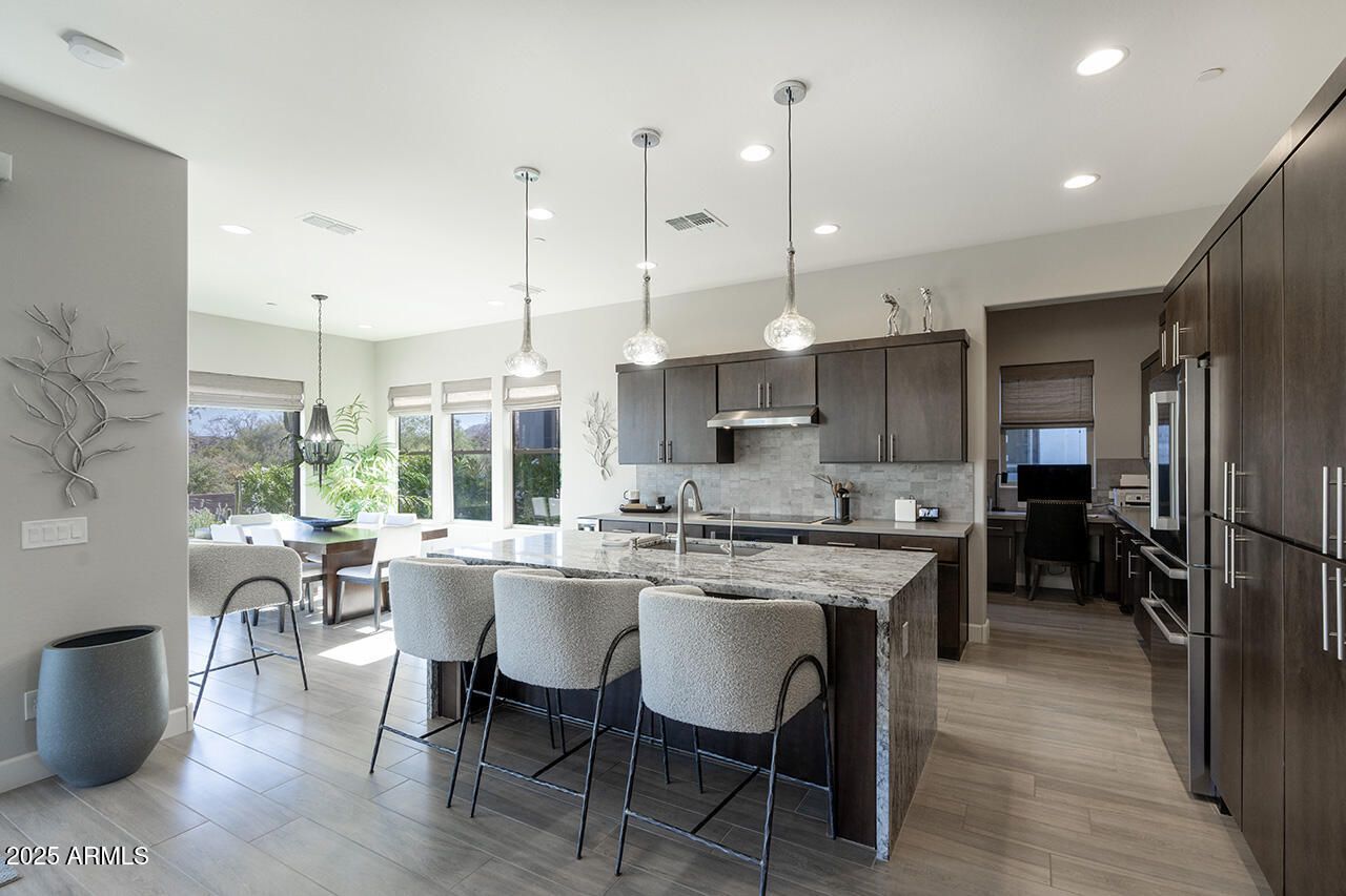 REDUCED! Available Furnished! HIghly upgraded home with privacy and open concept. Kitchen has induction cooktop with granite waterfall island. Added room off garage creates additional space. Tile plank floors, Barn doors in Master Bath and Den create a home you can lock and leave or stay forever. Outdoor living with Putting green, cooking area and views to the South. Patio looks out to arroyo and Four Peak mountains creating the privacy everyone wants, but few have. Don't miss this one.