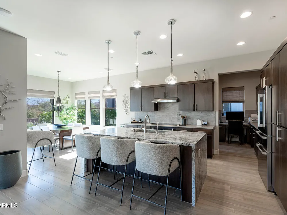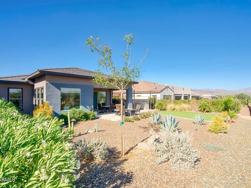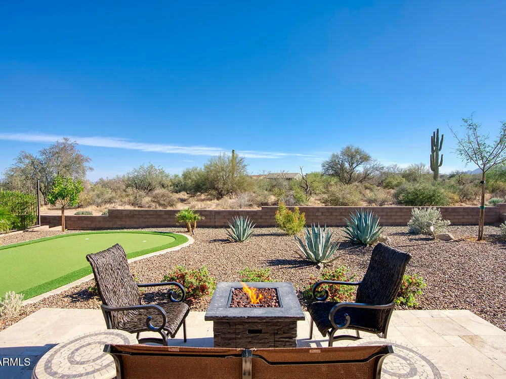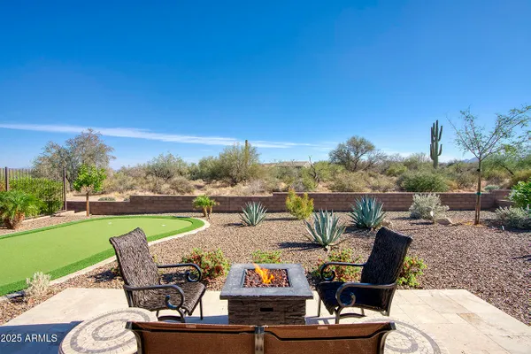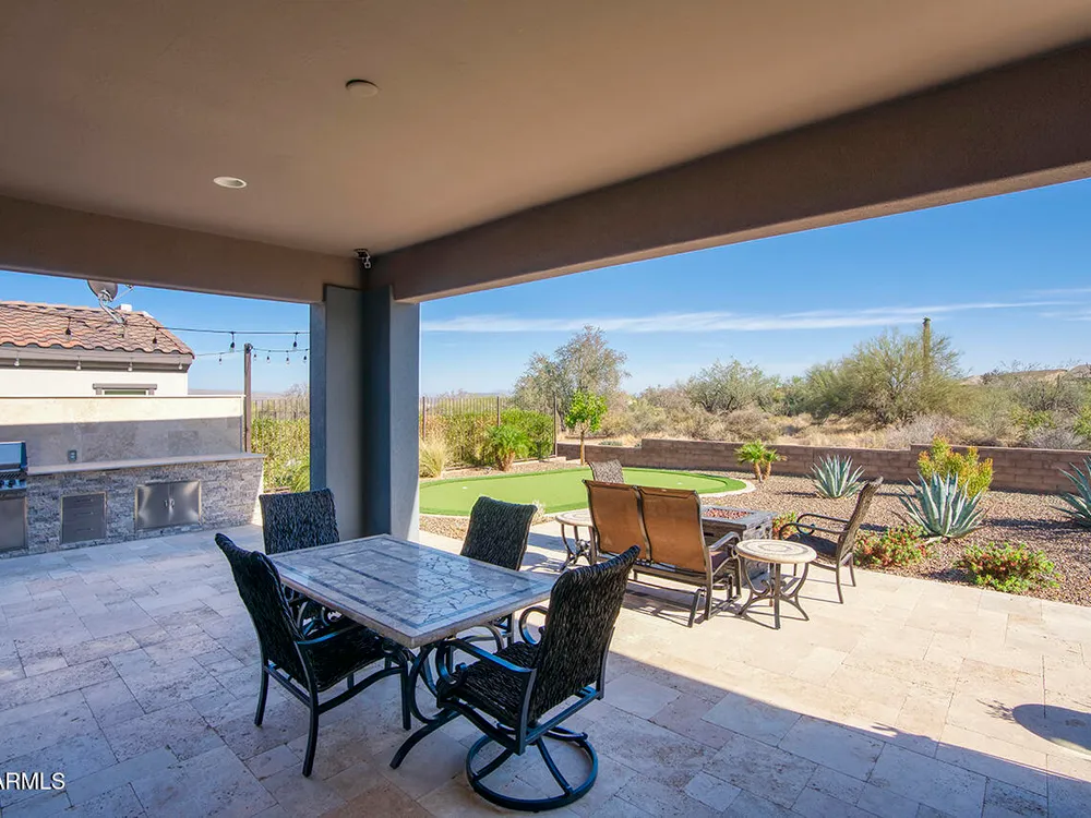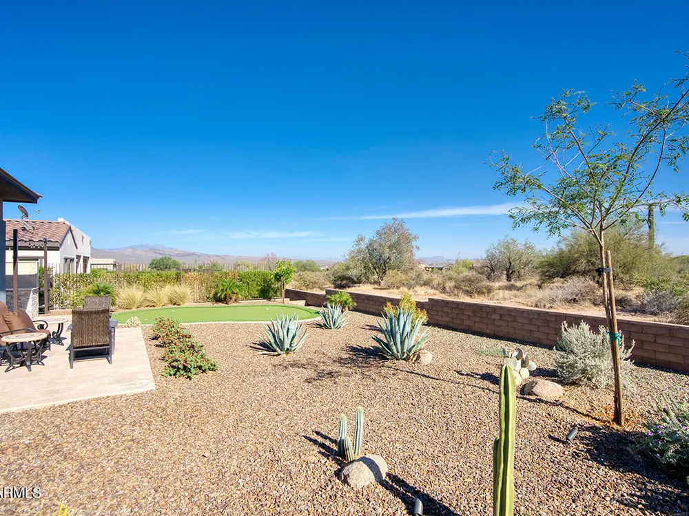 HIghly upgraded home with privacy and open concept. Kitchen has induction cooktop with granite waterfall island. Added room off garage creates additional space. Tile plank floors, Barn doors in Master Bath and Den create a home you can lock and leave or stay forever. Outdoor living with Putting green, cooking area and views to the South. Patio looks out to arroyo and Four Peak mountains creating the privacy everyone wants, but few have. Don't miss this one.