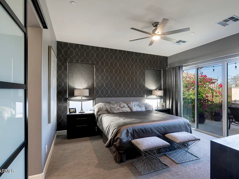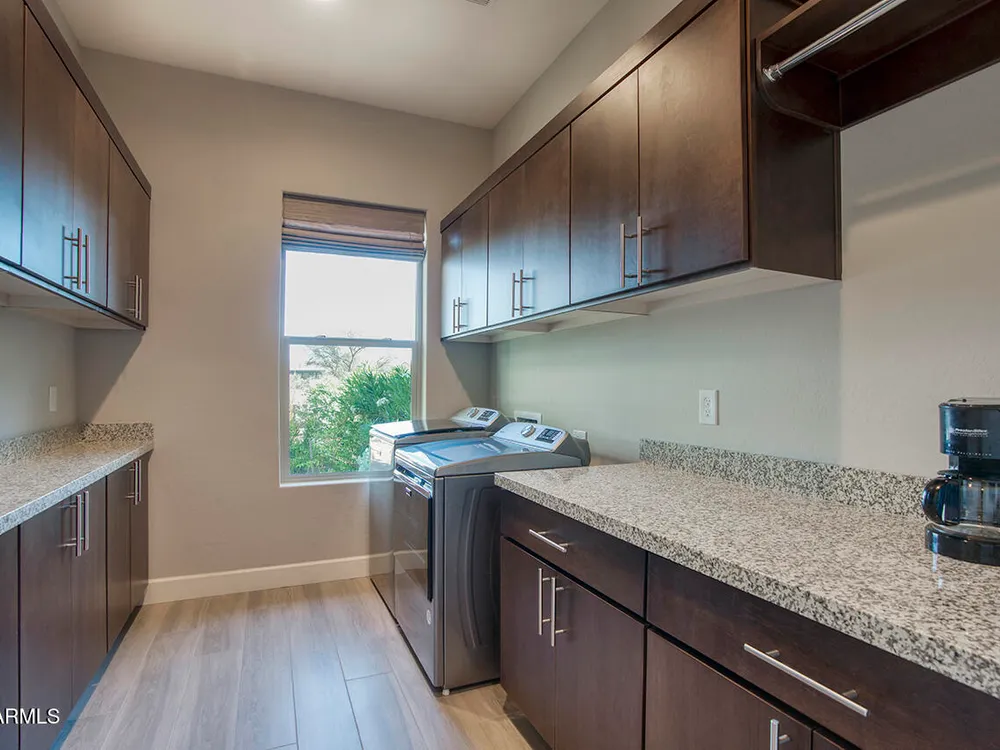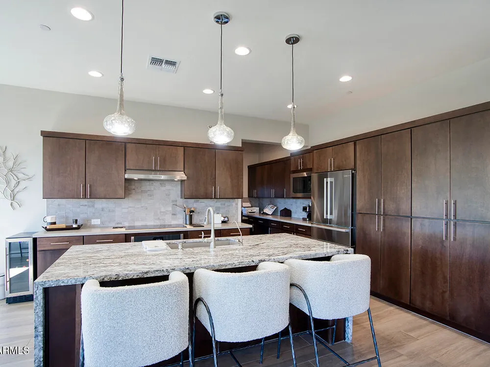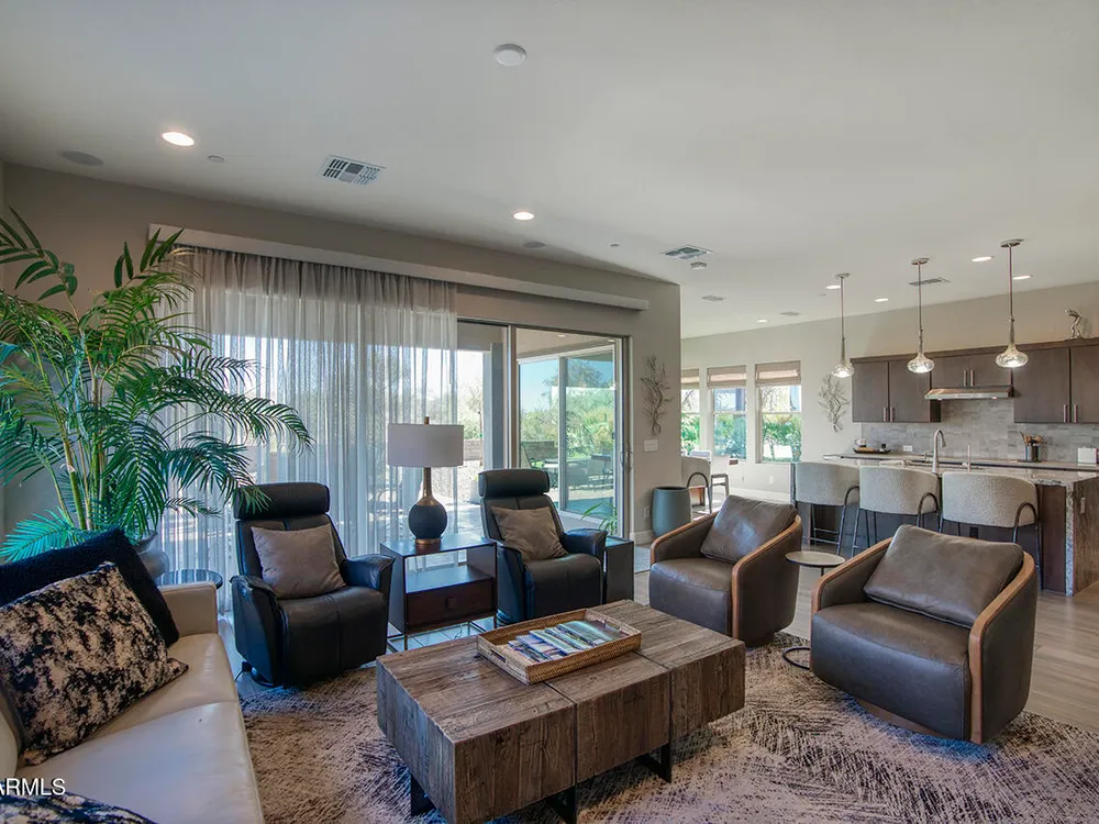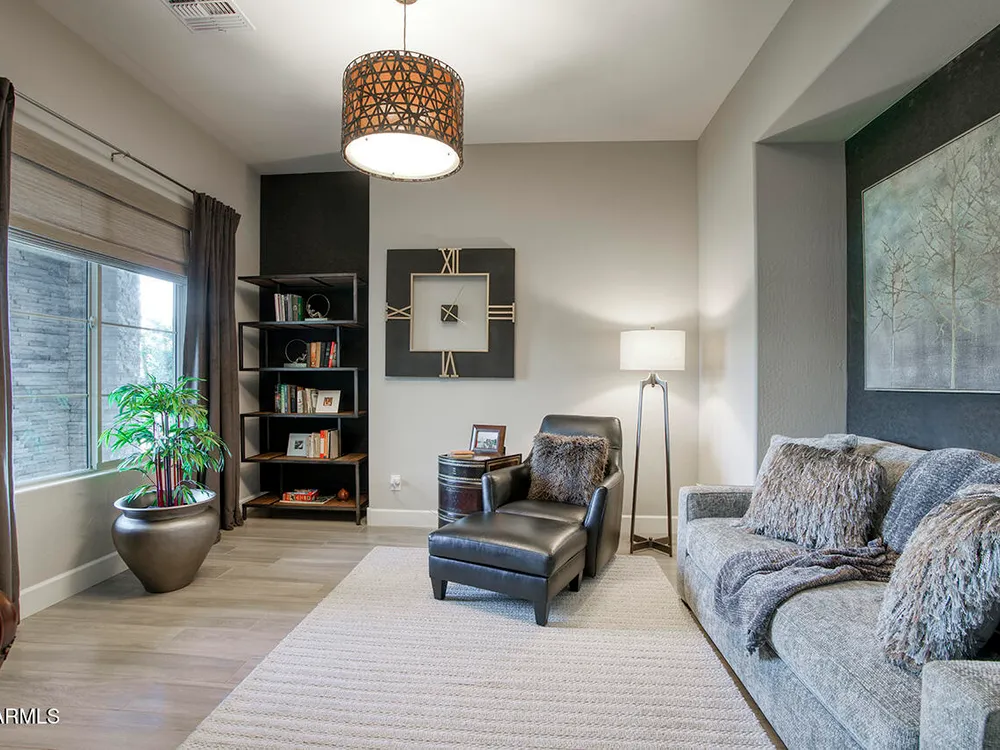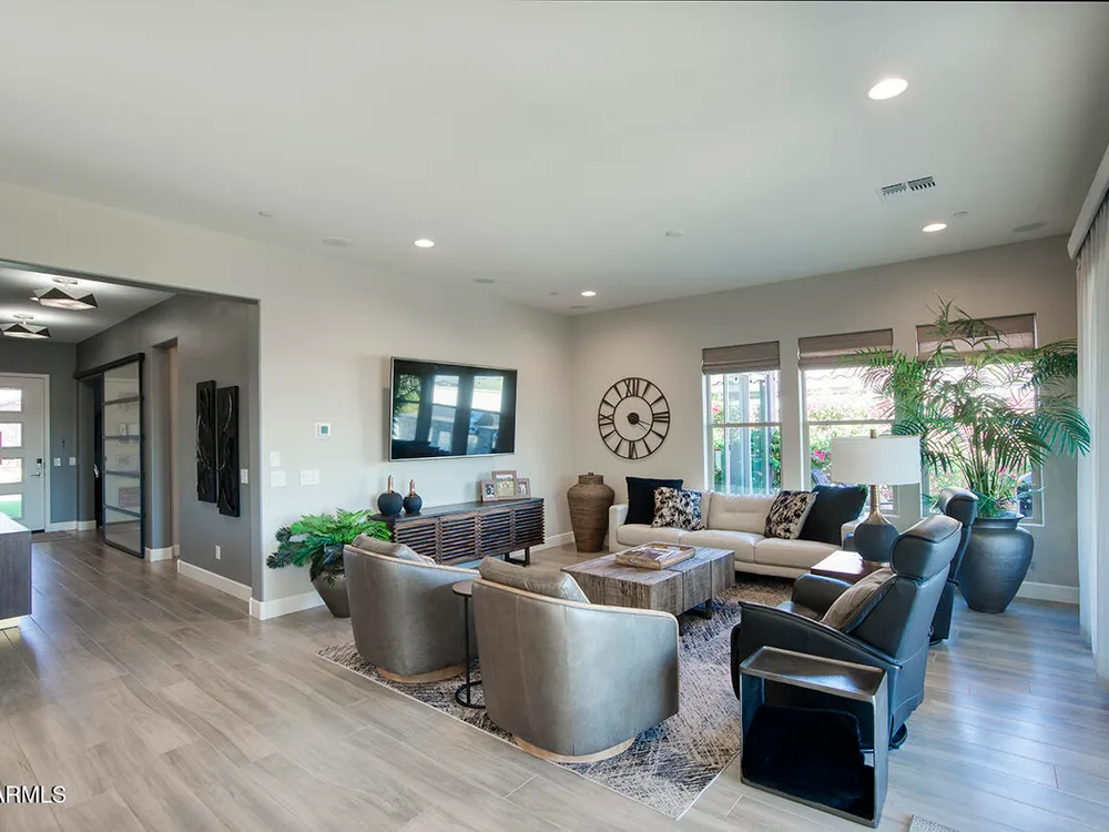 HIghly upgraded home with privacy and open concept. Kitchen has induction cooktop with granite waterfall island. Added room off garage creates additional space. Tile plank floors, Barn doors in Master Bath and Den create a home you can lock and leave or stay forever. Outdoor living with Putting green, cooking area and views to the South. Patio looks out to arroyo and Four Peak mountains creating the privacy everyone wants, but few have. Don't miss this one.