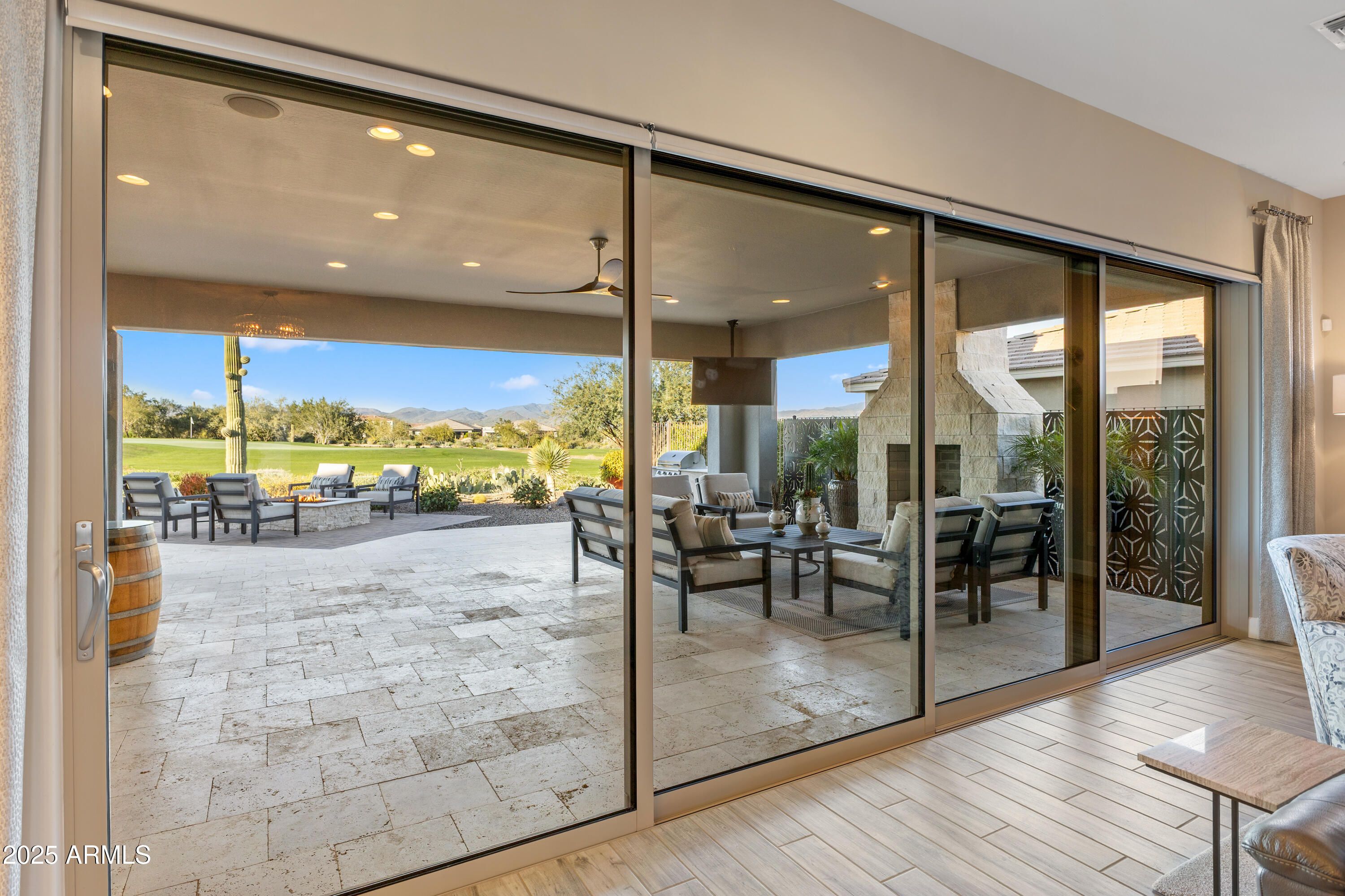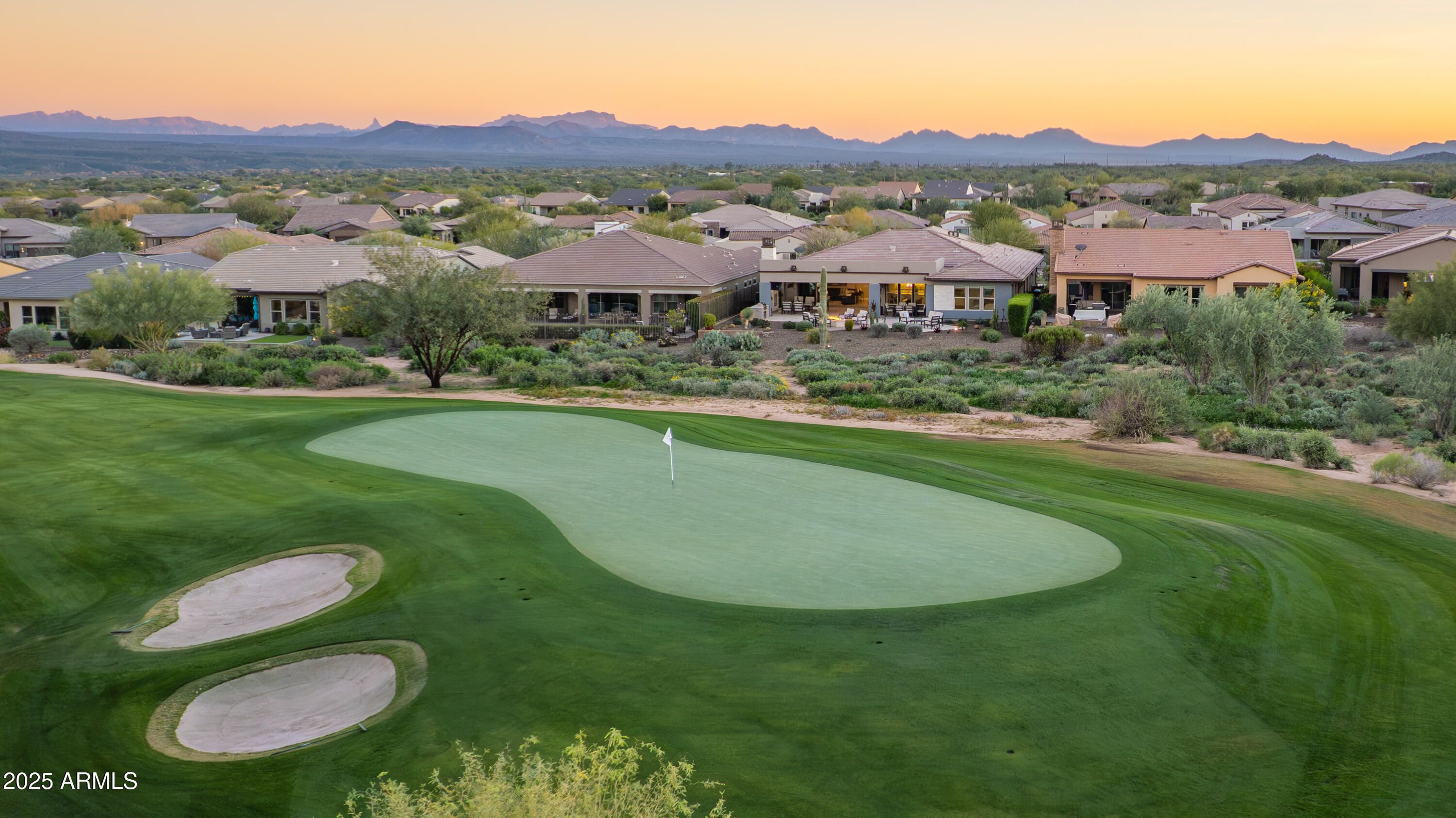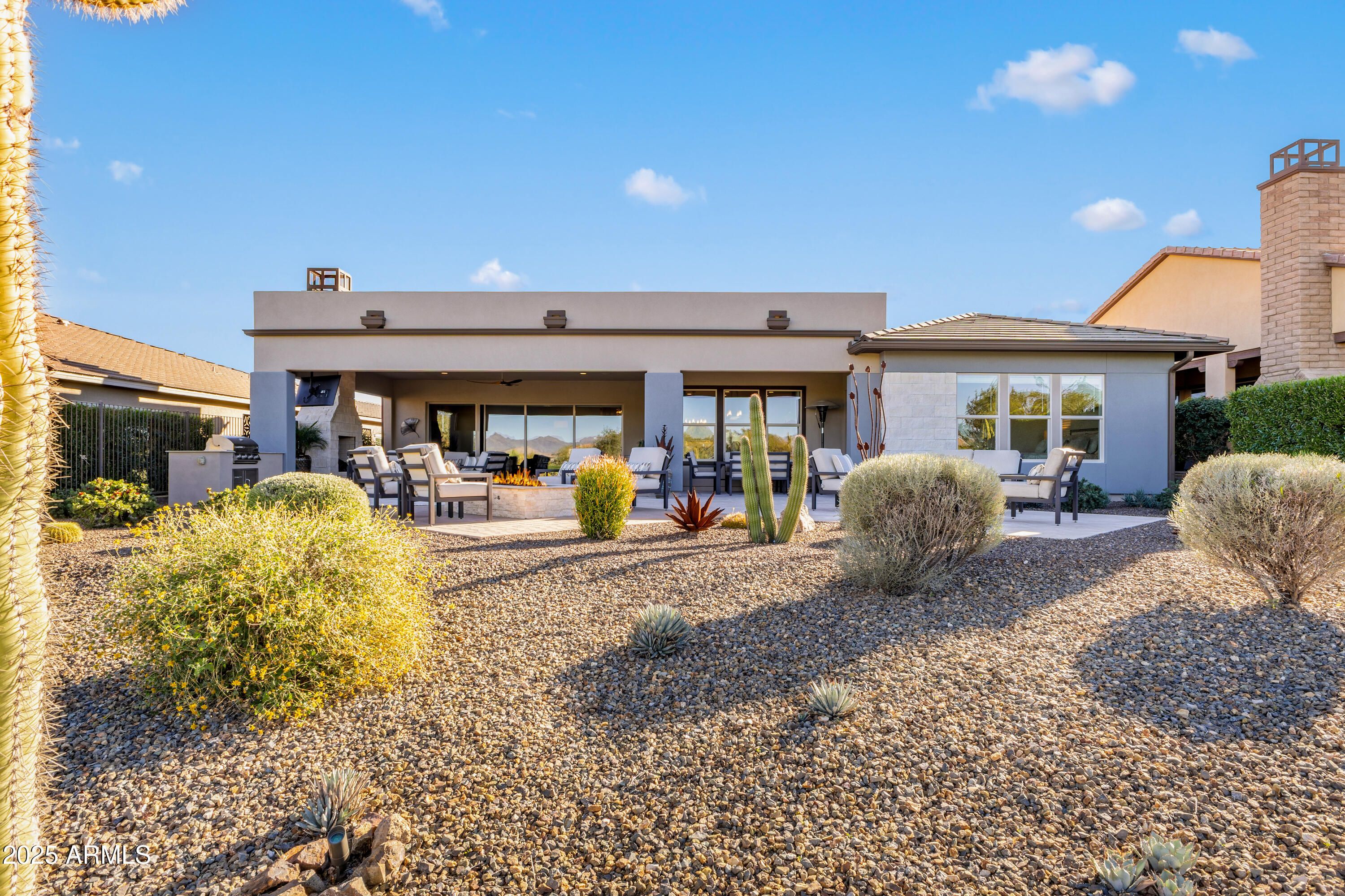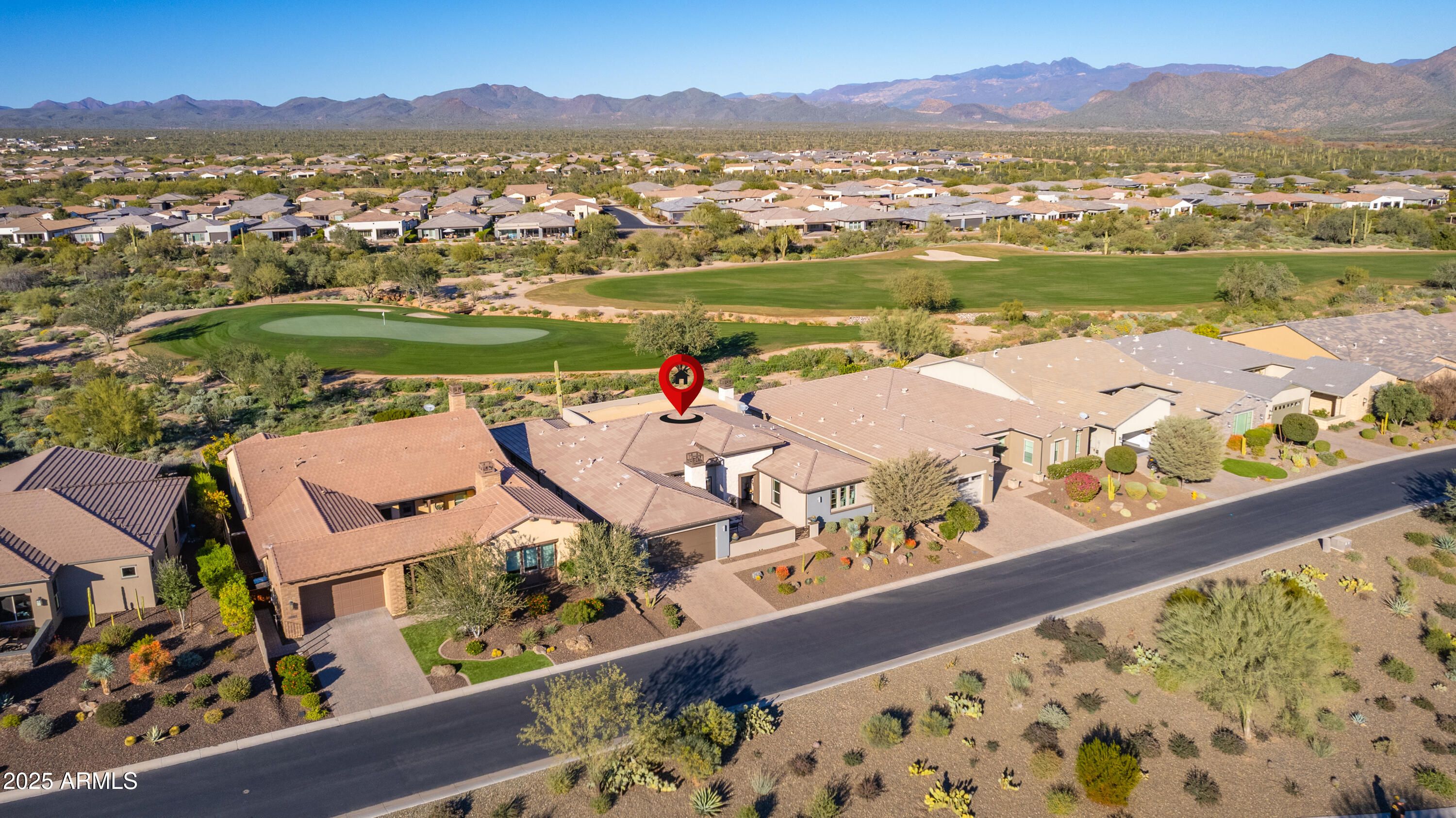 Experience the pinnacle of desert living in this former designer home, north-facing and perfectly positioned at the green on the coveted 16th hole with sweeping mountain views. Ideally situated on a peaceful, non-through street, this home offers exceptional open-view frontage with no homes across the street, yet remains just a short walk to the clubhouse, pool, and community amenities. Thoughtfully designed with a seamless Vela floor plan, this 3-bedroom + den, 3.5-bath masterpiece defines luxury. A front paver courtyard with a striking masonry gas fireplace welcomes you, setting the stage for the opulence inside. The heart of the home is the highly upgraded gourmet kitchen, featuring GE Monogram appliances, Arctic White cabinetry with pull-out drawers in all cabinets, granite countertops a walk-in pantry, and an extended island ideal for entertaining. The great room transitions effortlessly to the outdoors via 20' multi-sliding doors, revealing an expansive covered travertine patio equipped with an additional exterior masonry fireplace, built-in BBQ, firepit, and custom landscaping. Retreat to the primary suite, where a 9' rolling wall with motorized shades frame breathtaking mountain views and provides direct patio access. The spa-like primary bath boasts dual quartzite vanities, a soaking tub, and a custom walk-in closet by "Classy Closets." Two secondary bedrooms feature en-suite baths and quartzite counters with additional linen closets. Just off the kitchen lies a unique "Smart Space"a laundry room evolved, featuring built-in desks, cabinetry, and a utility sink. Car enthusiasts will adore the 4-car air-conditioned garage with epoxy floors and 30 linear feet of storage. Additional upgrades include custom Norman blinds, porcelain plank tile throughout, abundant storage, Rinnai tankless water heater, and a whole-house surge protector. Automatic access to a golf membership is included with the purchase of this home. This is a rare opportunity to own a thoughtfully curated, move-in-ready luxury home with a premier golf course and mountain view setting. Trilogy at Verde River is a resort-style community featuring something for everyone! Golf, tennis, pickleball, bocce ball, heated lap pool and swimming pool, hot tub, fitness center, demonstration kitchen, and a 7.5-acre dog park. The community center has casual and fine dining, a luxury spa, and an events center. Trilogy at Verde River is adjacent to the Tonto National Forest and is situated in the middle of miles and miles of hiking and biking trails. Live like you're on vacation!