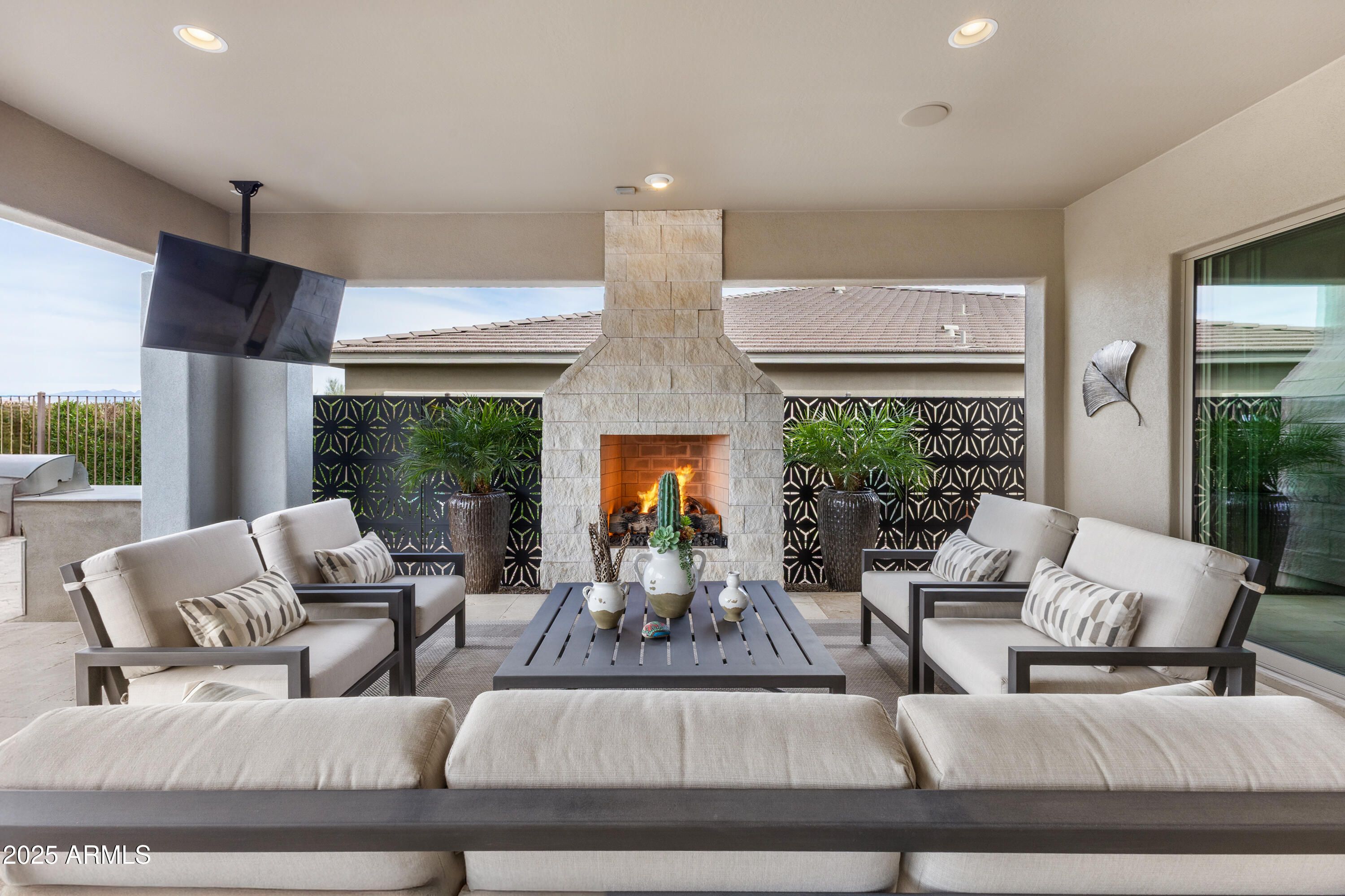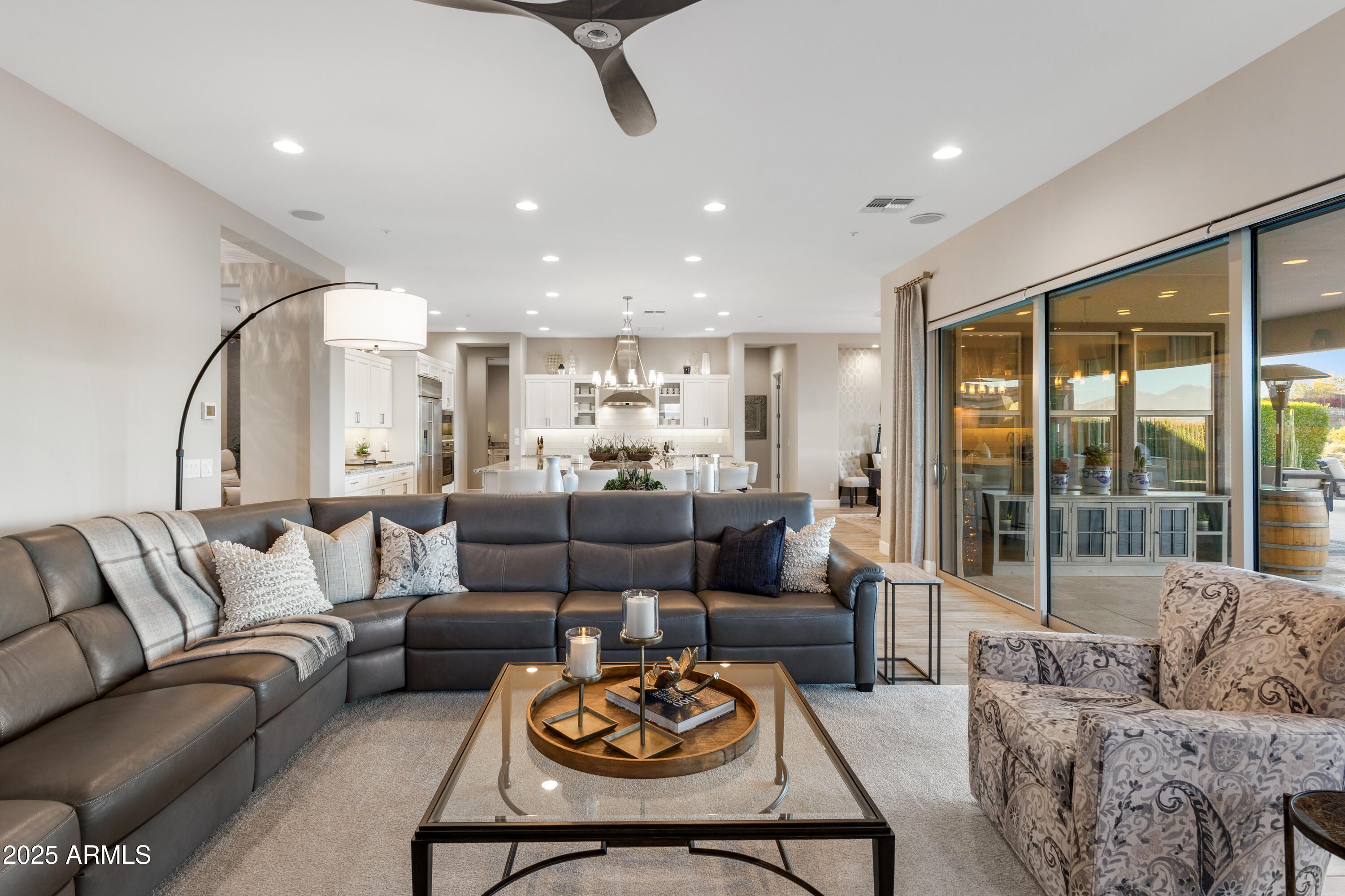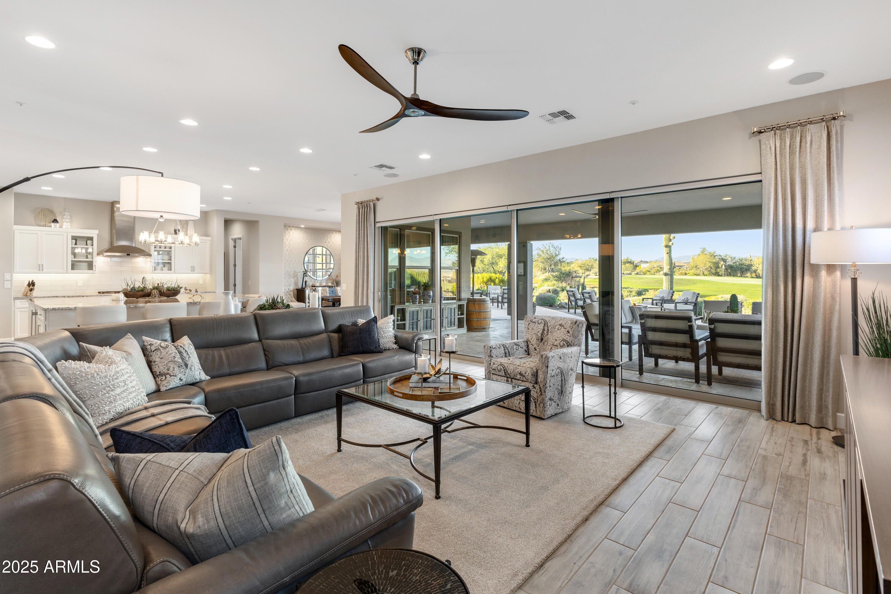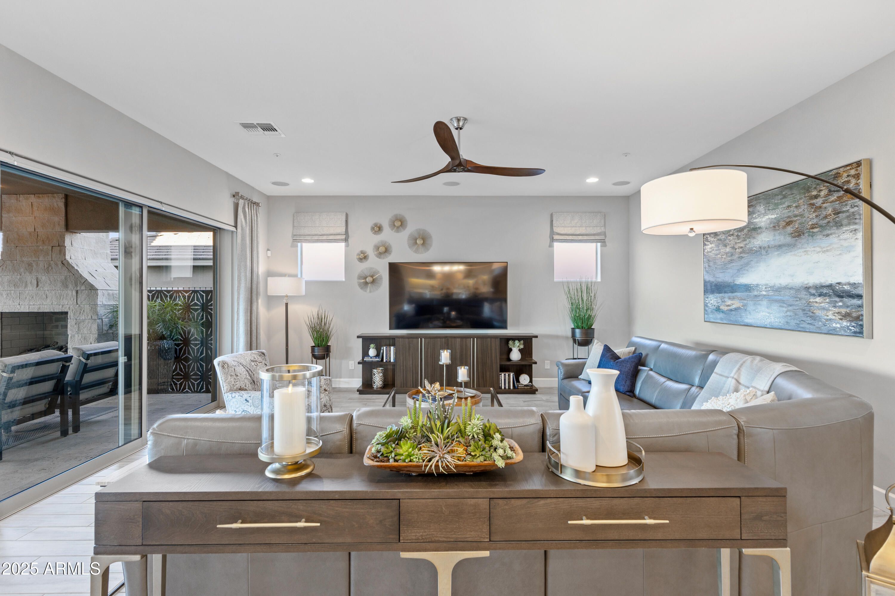 Experience the pinnacle of desert living in this former designer home, north-facing and perfectly positioned at the green on the coveted 16th hole with sweeping mountain views. Ideally situated on a peaceful, non-through street, this home offers exceptional open-view frontage with no homes across the street, yet remains just a short walk to the clubhouse, pool, and community amenities. Thoughtfully designed with a seamless Vela floor plan, this 3-bedroom + den, 3.5-bath masterpiece defines luxury. A front paver courtyard with a striking masonry gas fireplace welcomes you, setting the stage for the opulence inside. The heart of the home is the highly upgraded gourmet kitchen, featuring GE Monogram appliances, Arctic White cabinetry with pull-out drawers in all cabinets, granite countertops a walk-in pantry, and an extended island ideal for entertaining. The great room transitions effortlessly to the outdoors via 20' multi-sliding doors, revealing an expansive covered travertine patio equipped with an additional exterior masonry fireplace, built-in BBQ, firepit, and custom landscaping. Retreat to the primary suite, where a 9' rolling wall with motorized shades frame breathtaking mountain views and provides direct patio access. The spa-like primary bath boasts dual quartzite vanities, a soaking tub, and a custom walk-in closet by "Classy Closets." Two secondary bedrooms feature en-suite baths and quartzite counters with additional linen closets. Just off the kitchen lies a unique "Smart Space"a laundry room evolved, featuring built-in desks, cabinetry, and a utility sink. Car enthusiasts will adore the 4-car air-conditioned garage with epoxy floors and 30 linear feet of storage. Additional upgrades include custom Norman blinds, porcelain plank tile throughout, abundant storage, Rinnai tankless water heater, and a whole-house surge protector. Automatic access to a golf membership is included with the purchase of this home. This is a rare opportunity to own a thoughtfully curated, move-in-ready luxury home with a premier golf course and mountain view setting. Trilogy at Verde River is a resort-style community featuring something for everyone! Golf, tennis, pickleball, bocce ball, heated lap pool and swimming pool, hot tub, fitness center, demonstration kitchen, and a 7.5-acre dog park. The community center has casual and fine dining, a luxury spa, and an events center. Trilogy at Verde River is adjacent to the Tonto National Forest and is situated in the middle of miles and miles of hiking and biking trails. Live like you're on vacation!