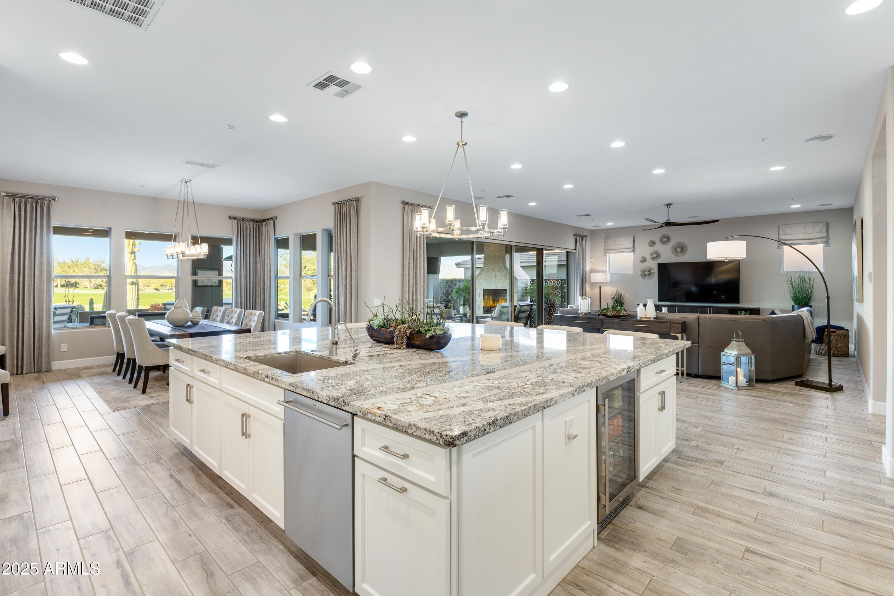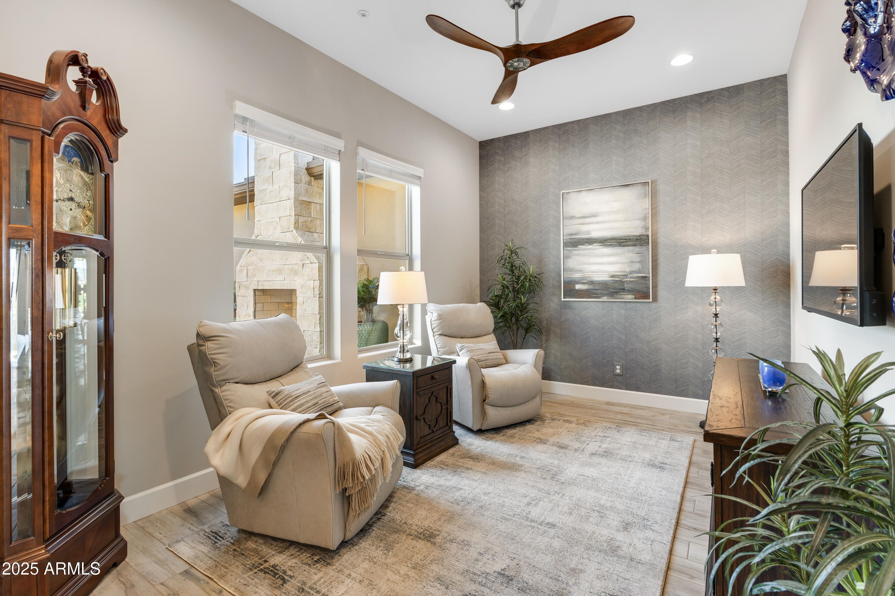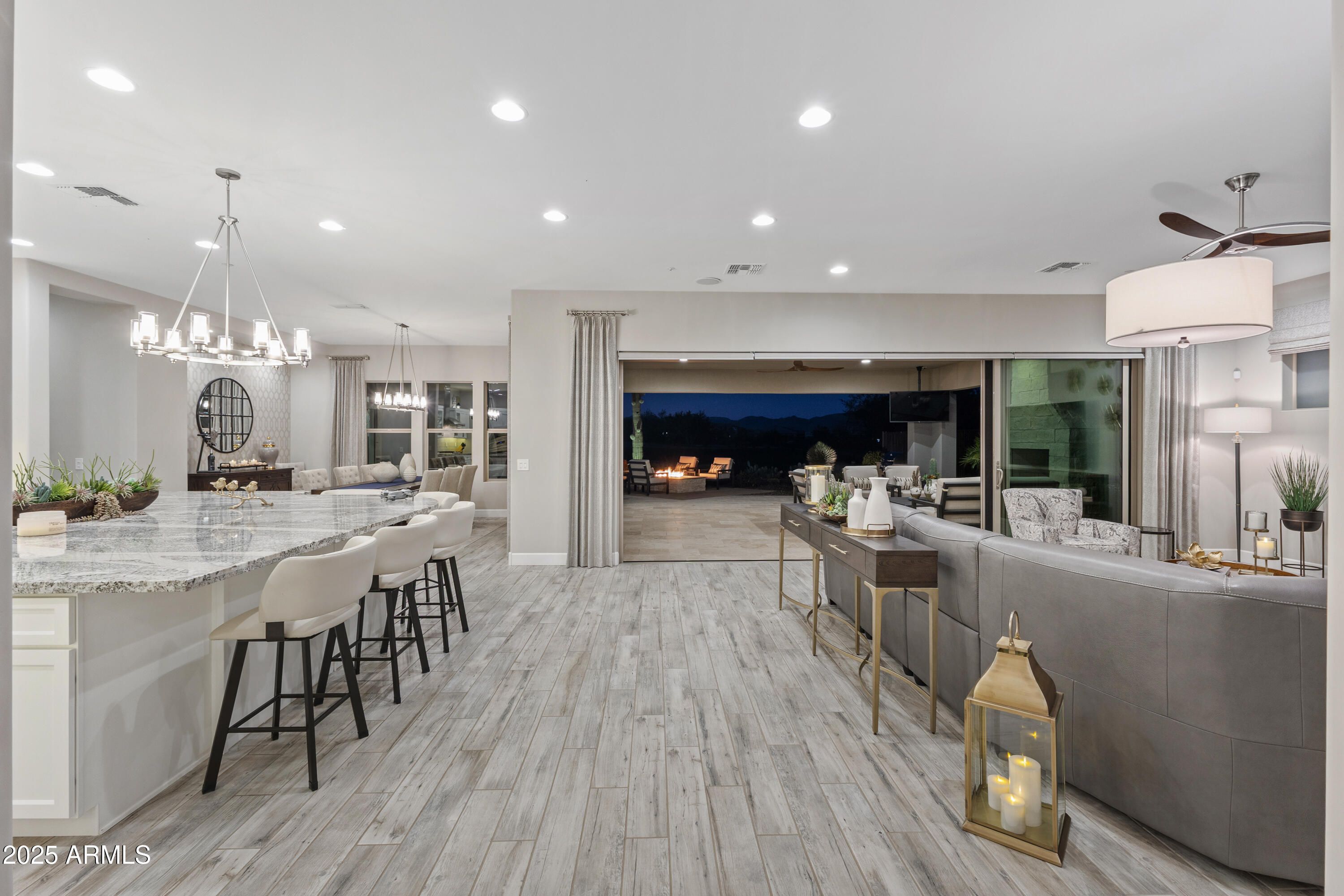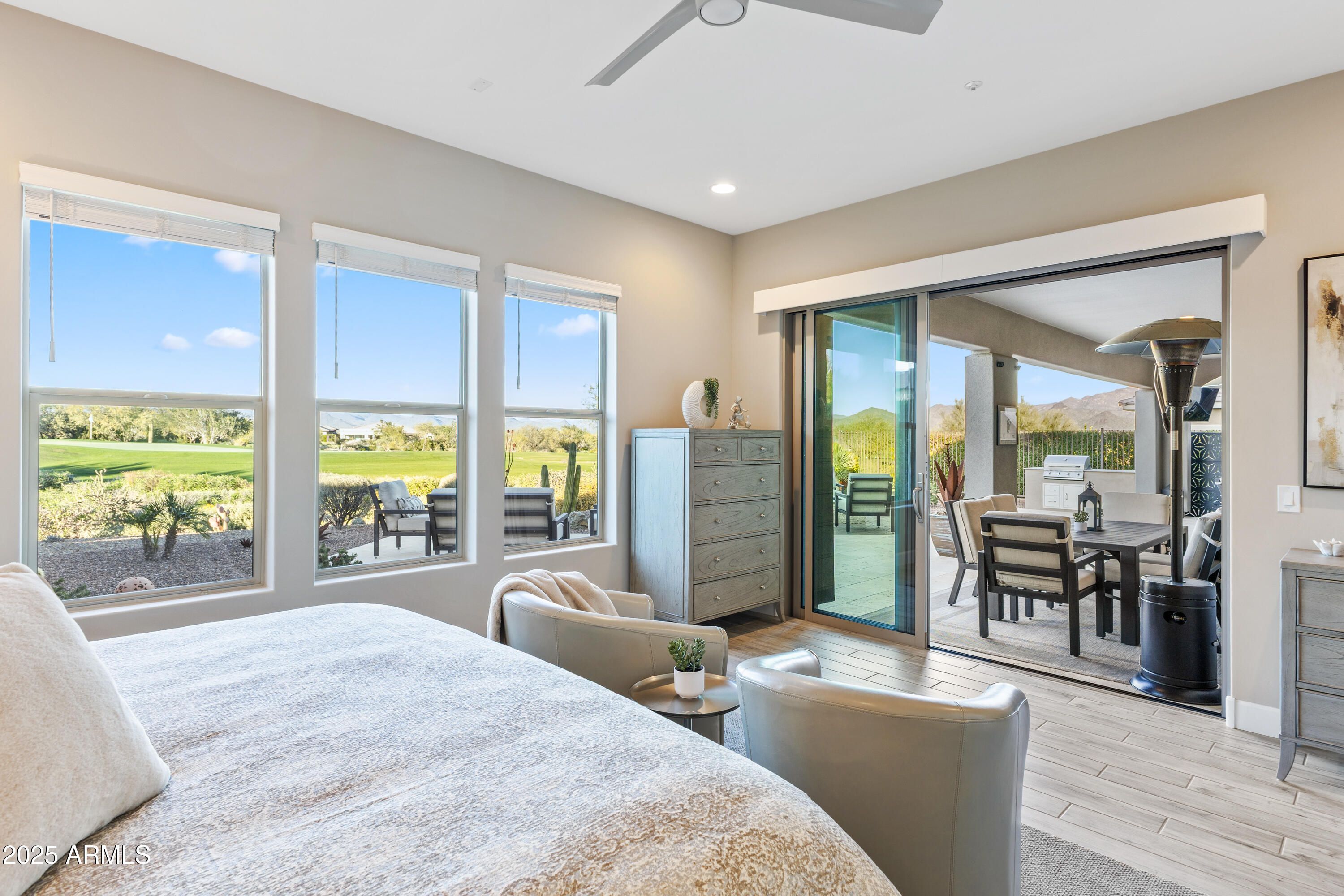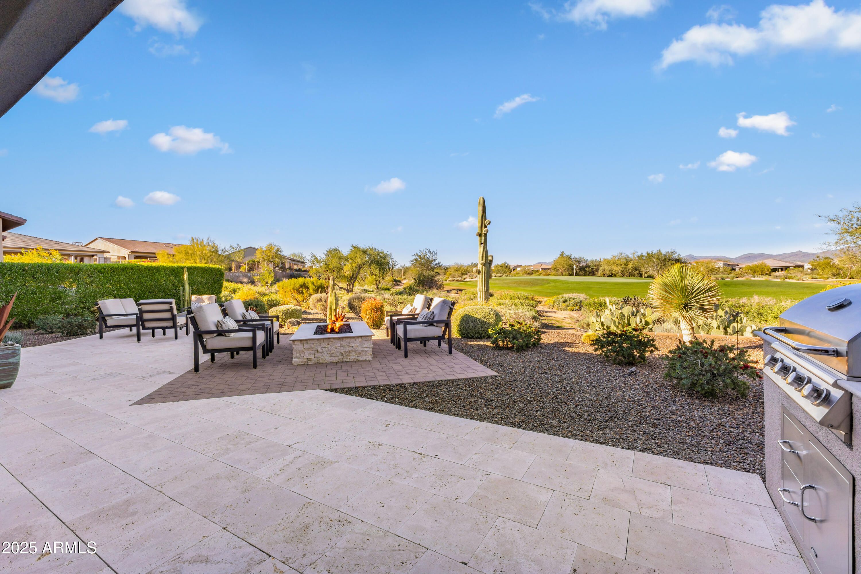 Experience the pinnacle of desert living in this former designer home, north-facing and perfectly positioned at the green on the coveted 16th hole with sweeping mountain views. Ideally situated on a peaceful, non-through street, this home offers exceptional open-view frontage with no homes across the street, yet remains just a short walk to the clubhouse, pool, and community amenities. Thoughtfully designed with a seamless Vela floor plan, this 3-bedroom + den, 3.5-bath masterpiece defines luxury. A front paver courtyard with a striking masonry gas fireplace welcomes you, setting the stage for the opulence inside. The heart of the home is the highly upgraded gourmet kitchen, featuring GE Monogram appliances, Arctic White cabinetry with pull-out drawers in all cabinets, granite countertops a walk-in pantry, and an extended island ideal for entertaining. The great room transitions effortlessly to the outdoors via 20' multi-sliding doors, revealing an expansive covered travertine patio equipped with an additional exterior masonry fireplace, built-in BBQ, firepit, and custom landscaping. Retreat to the primary suite, where a 9' rolling wall with motorized shades frame breathtaking mountain views and provides direct patio access. The spa-like primary bath boasts dual quartzite vanities, a soaking tub, and a custom walk-in closet by "Classy Closets." Two secondary bedrooms feature en-suite baths and quartzite counters with additional linen closets. Just off the kitchen lies a unique "Smart Space"a laundry room evolved, featuring built-in desks, cabinetry, and a utility sink. Car enthusiasts will adore the 4-car air-conditioned garage with epoxy floors and 30 linear feet of storage. Additional upgrades include custom Norman blinds, porcelain plank tile throughout, abundant storage, Rinnai tankless water heater, and a whole-house surge protector. Automatic access to a golf membership is included with the purchase of this home. This is a rare opportunity to own a thoughtfully curated, move-in-ready luxury home with a premier golf course and mountain view setting. Trilogy at Verde River is a resort-style community featuring something for everyone! Golf, tennis, pickleball, bocce ball, heated lap pool and swimming pool, hot tub, fitness center, demonstration kitchen, and a 7.5-acre dog park. The community center has casual and fine dining, a luxury spa, and an events center. Trilogy at Verde River is adjacent to the Tonto National Forest and is situated in the middle of miles and miles of hiking and biking trails. Live like you're on vacation!