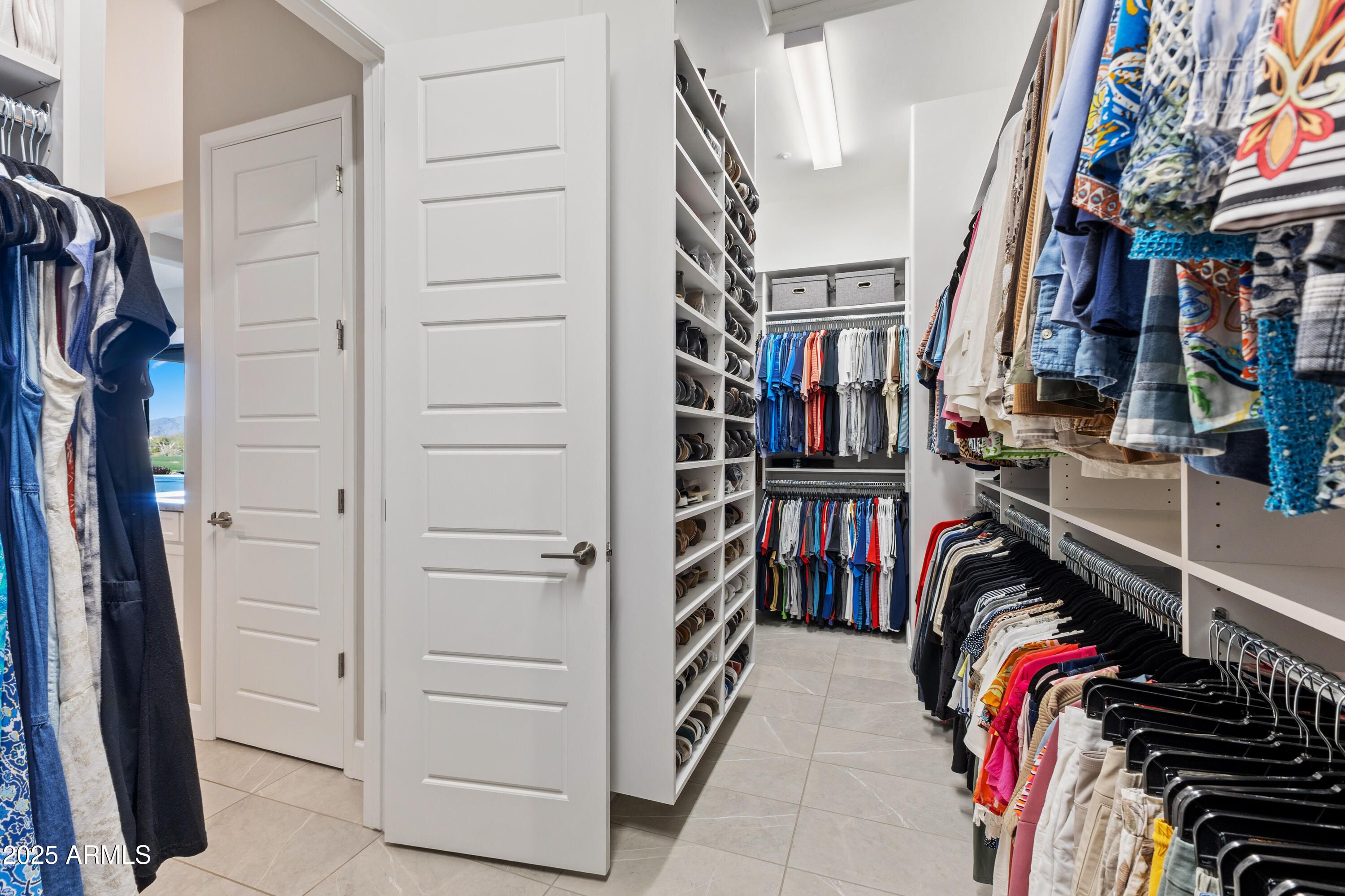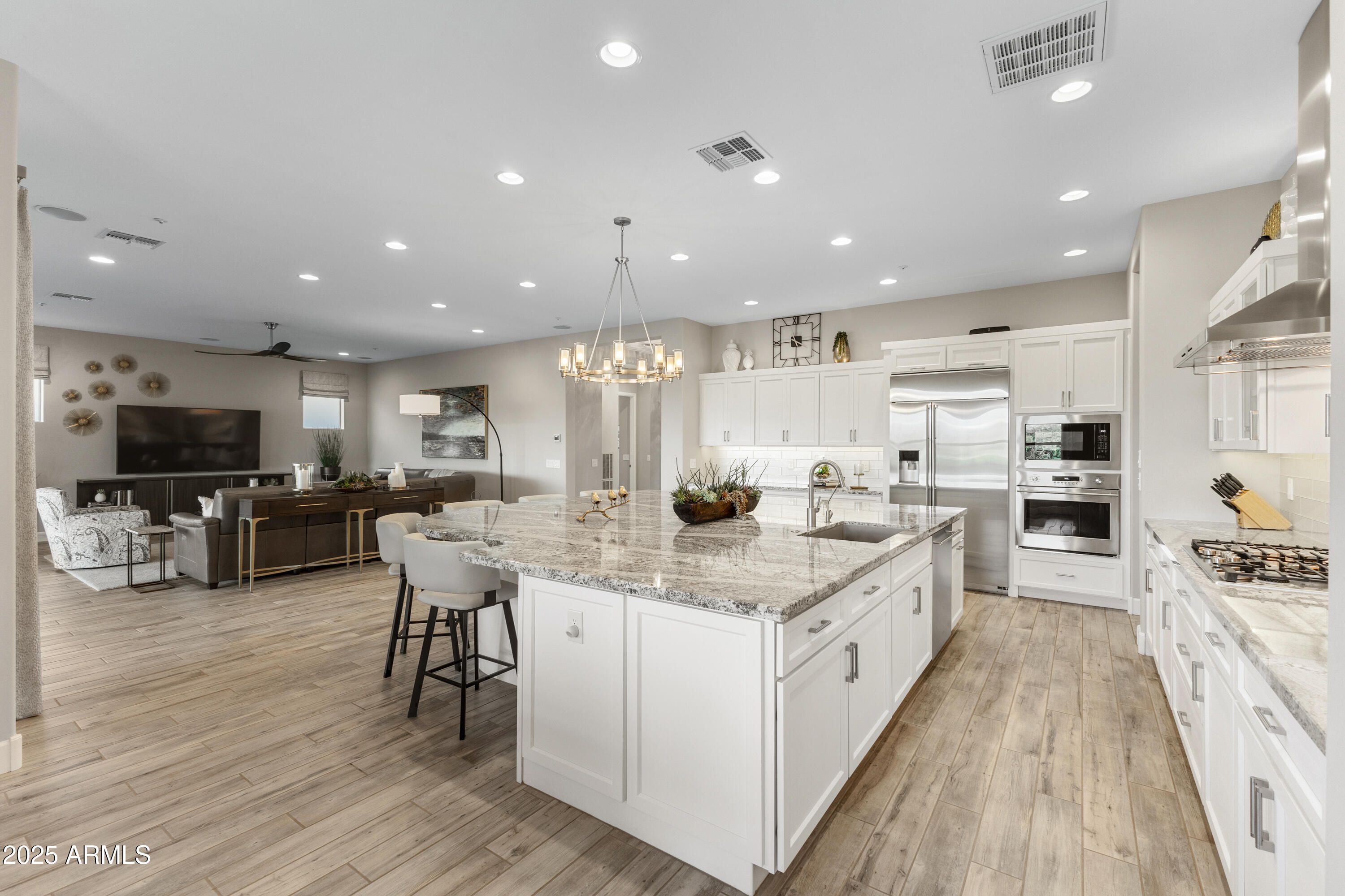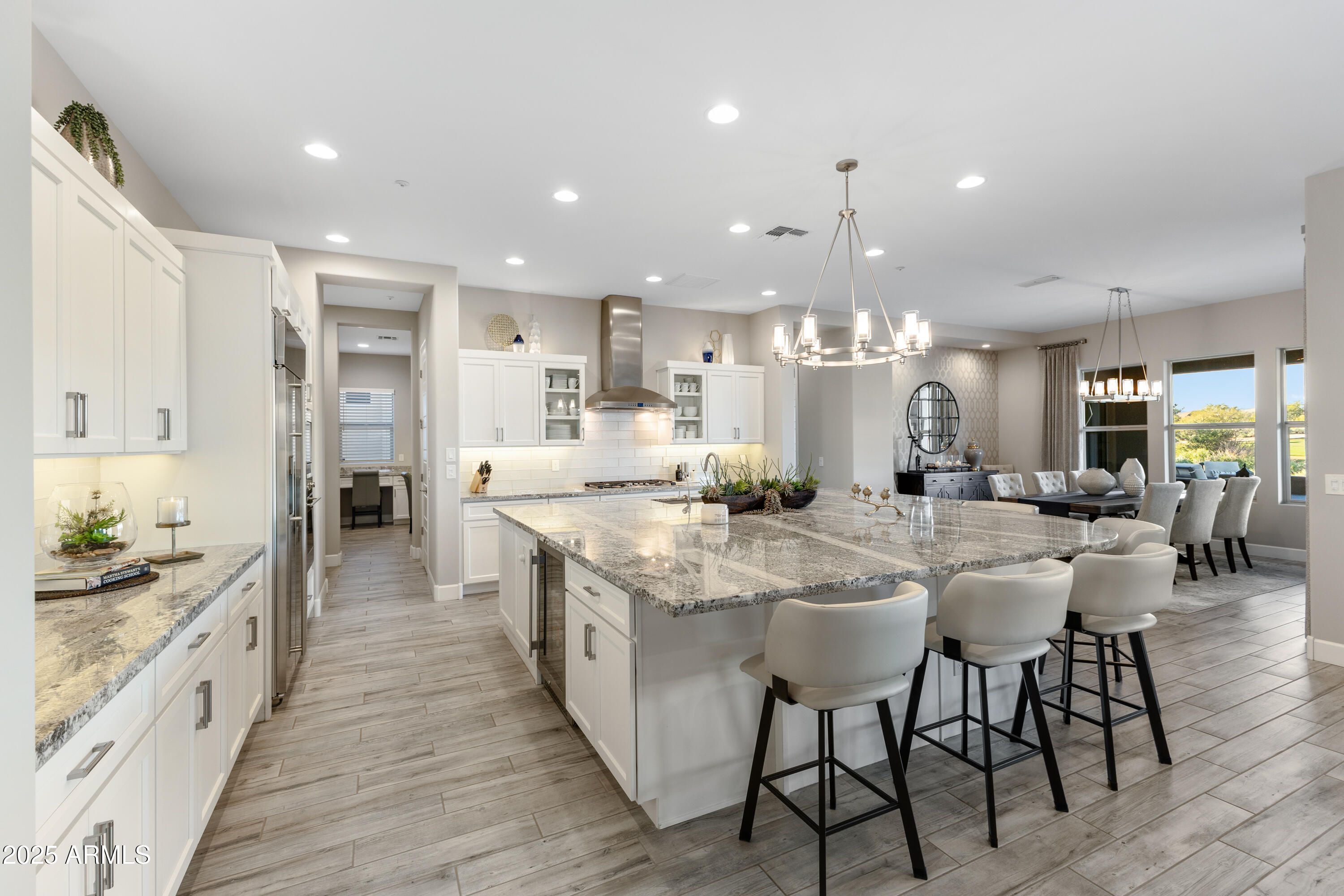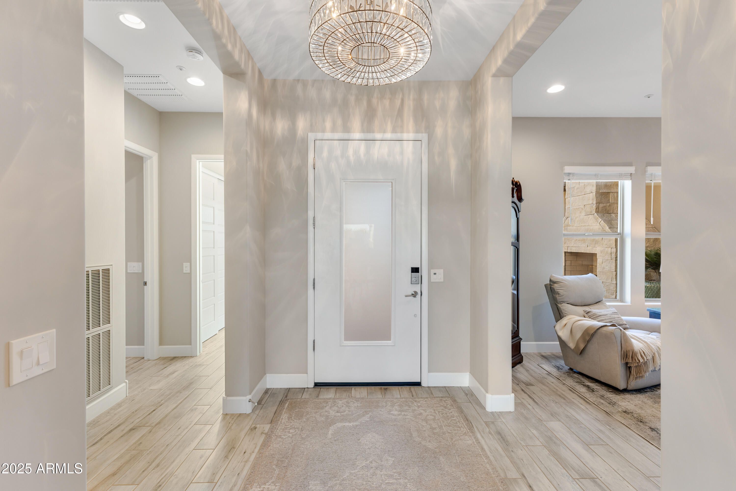Experience the pinnacle of desert living in this former designer home, north-facing and perfectly positioned at the green on the coveted 16th hole with sweeping mountain views. Ideally situated on a peaceful, non-through street, this home offers exceptional open-view frontage with no homes across the street, yet remains just a short walk to the clubhouse, pool, and community amenities. Thoughtfully designed with a seamless Vela floor plan, this 3-bedroom + den, 3.5-bath masterpiece defines luxury. A front paver courtyard with a striking masonry gas fireplace welcomes you, setting the stage for the opulence inside. The heart of the home is the highly upgraded gourmet kitchen, featuring GE Monogram appliances, Arctic White cabinetry with pull-out drawers in all cabinets, granite countertops a walk-in pantry, and an extended island ideal for entertaining. The great room transitions effortlessly to the outdoors via 20' multi-sliding doors, revealing an expansive covered travertine patio equipped with an additional exterior masonry fireplace, built-in BBQ, firepit, and custom landscaping. Retreat to the primary suite, where a 9' rolling wall with motorized shades frame breathtaking mountain views and provides direct patio access. The spa-like primary bath boasts dual quartzite vanities, a soaking tub, and a custom walk-in closet by "Classy Closets." Two secondary bedrooms feature en-suite baths and quartzite counters with additional linen closets. Just off the kitchen lies a unique "Smart Space"a laundry room evolved, featuring built-in desks, cabinetry, and a utility sink. Car enthusiasts will adore the 4-car air-conditioned garage with epoxy floors and 30 linear feet of storage. Additional upgrades include custom Norman blinds, porcelain plank tile throughout, abundant storage, Rinnai tankless water heater, and a whole-house surge protector. Automatic access to a golf membership is included with the purchase of this home. This is a rare opportunity to own a thoughtfully curated, move-in-ready luxury home with a premier golf course and mountain view setting. Trilogy at Verde River is a resort-style community featuring something for everyone! Golf, tennis, pickleball, bocce ball, heated lap pool and swimming pool, hot tub, fitness center, demonstration kitchen, and a 7.5-acre dog park. The community center has casual and fine dining, a luxury spa, and an events center. Trilogy at Verde River is adjacent to the Tonto National Forest and is situated in the middle of miles and miles of hiking and biking trails. Live like you're on vacation!
