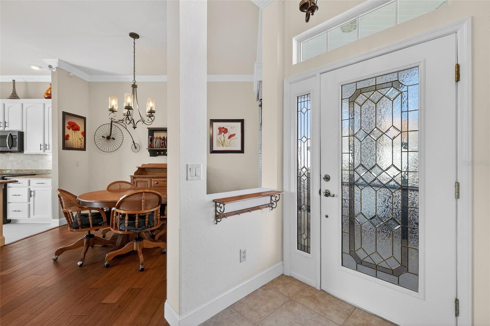 GOLF FRONT living at its finest in the sought-after 55+ gated community of Stonecrest! Perfectly positioned on the tee box at the end of a quiet cul-de-sac, this beautifully maintained 3-bedroom, 2-bath home offers stunning golf course views and an impressive list of updates, including a new roof (2021), HVAC (2021), and updated windows. Arrive to a large decorative driveway, impressive landscaping, and a 2-car plus golf cart garage, all welcoming you through a leaded-glass front door with a tranquil waterfall feature. Inside, the open floor plan is filled with natural light and showcases ENGINEERED HARDWOOD and TILE flooring, crown molding, and elegant cornices throughout. The updated kitchen is both stylish and functional, featuring GRANITE countertops, tile backsplash, newer STAINLESS STEEL APPLIANCES, a closet pantry, pull-out cabinet drawers, and a charming eat-in nook- the perfect spot to enjoy your morning coffee while watching the golfers go by. The spacious primary suite offers a walk-in closet and an en suite bath with double sink granite countertops, a relaxing garden tub, and a walk-in tiled shower. A guest hallway with linen closet leads to a comfortable guest bedroom (with closet) and an updated guest bath with granite countertops and walk-in shower. The versatile third bedroom (no closet) with french doors can be used as bedroom or office/den. Additional highlights include updated lighting and ceiling fans, an interior laundry room with extra storage, and exceptional outdoor living. Step onto the lanai with birdcage, finished in Chattahoochee river rock, and enjoy peaceful golf course views year-round. *ELECTRIC GOLF CART INCLUDED AND FURNITURE IS NEGOTIABLE* Stonecrest is a vibrant, amenity-rich 55+ community centered around the Broad Stripes Golf & Social Club, an 18-hole championship golf course with an on-site restaurant—and NO CDD or bond. Residents enjoy a clubhouse, fitness center, indoor pool, three outdoor pools, spa, fishing at Crestview Lake, pickleball, tennis, bocce, shuffleboard, softball field, dog park, cornhole, RV storage (additional fee), and 75+ clubs and activity groups. With private golf cart access to shopping, dining, and everyday conveniences, and located just 2.5 miles from The Villages and Spanish Springs Town Square, this home offers the perfect blend of comfort, convenience, and lifestyle. Come relax, entertain, and enjoy the best of Florida living—this golf-front gem is ready to welcome you home!