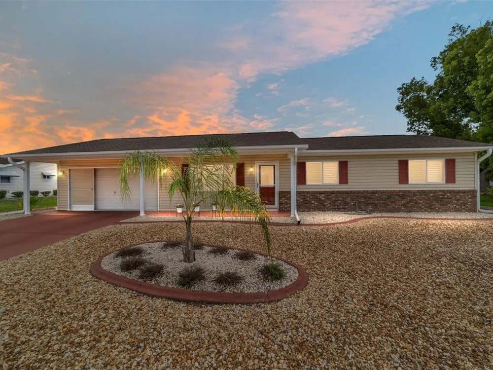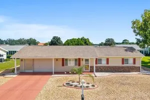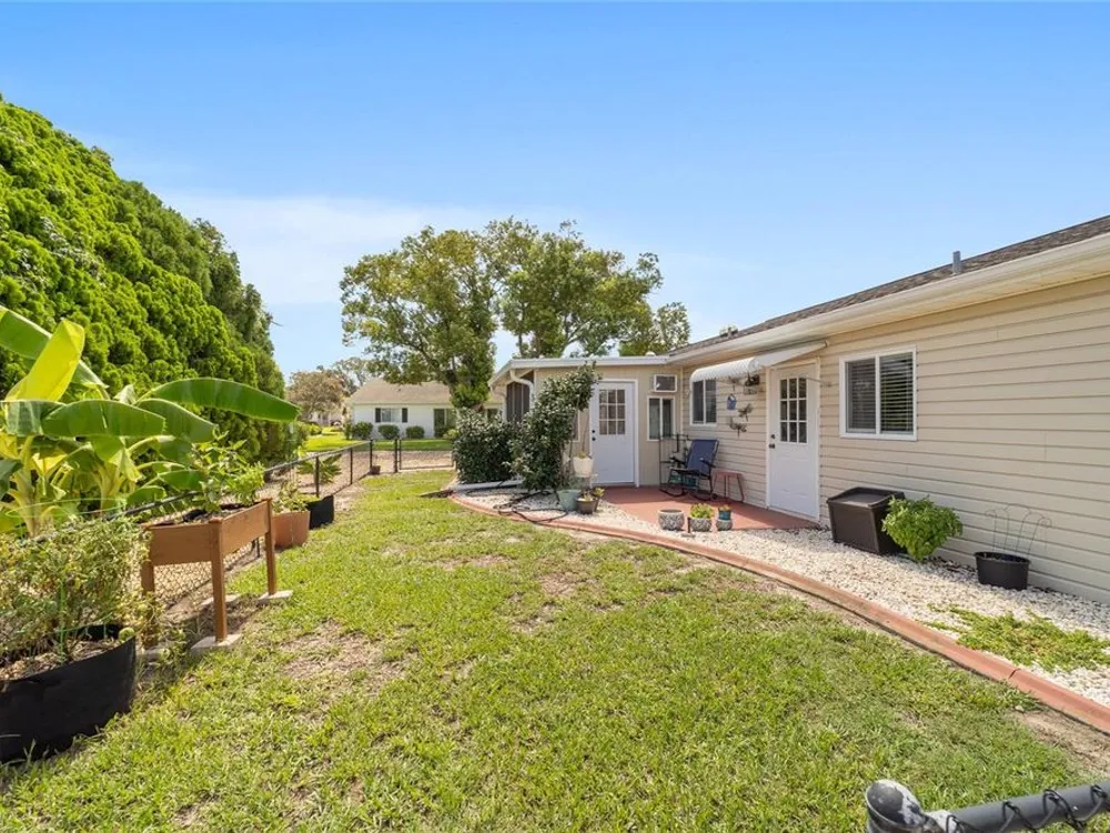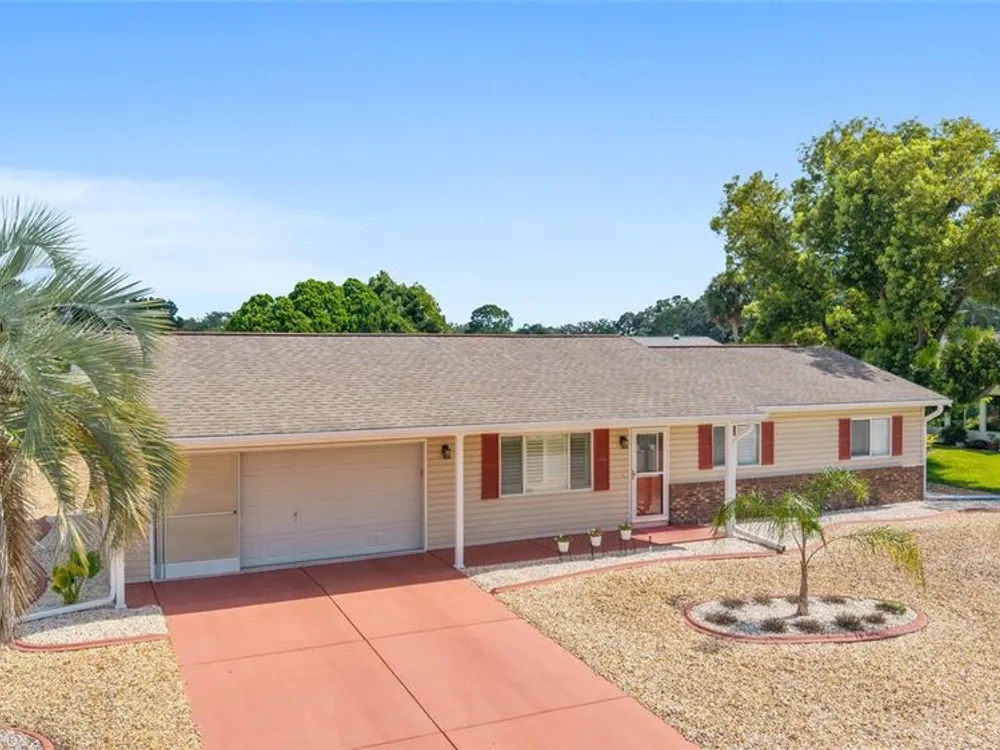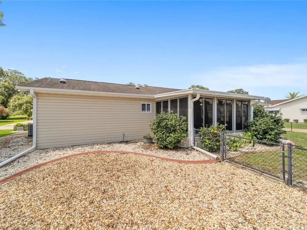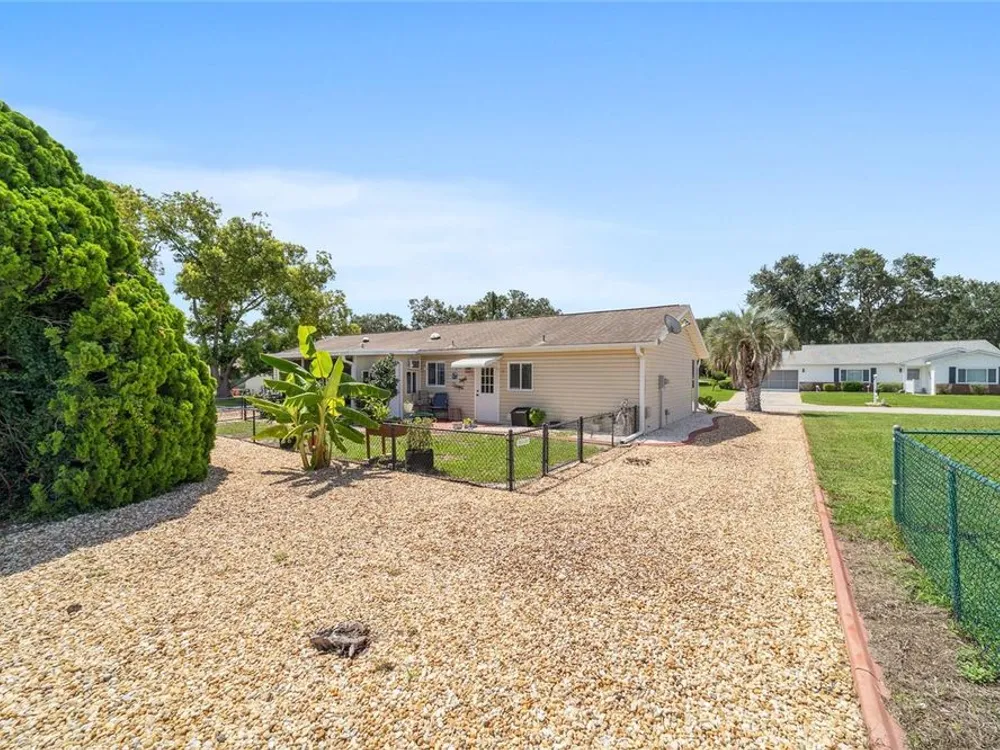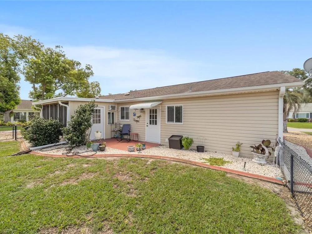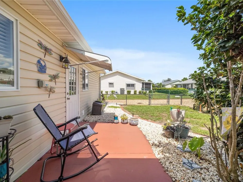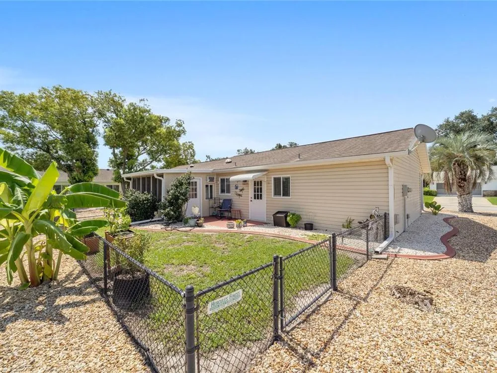 This charming 2-bedroom, 2-bath brick home, located in a gated 55+ community next to The Villages, offers 1,158 sq ft of meticulously maintained living space. It boasts modern updates including a refreshed kitchen with granite countertops, soft-closing cabinets, and a stylish backsplash, along with artistically designed bathrooms featuring soft-closing cabinets, and stylish mid-tone vinyl plank flooring throughout. The beautifully landscaped yard features designer stone accents and a fenced area for your pet, all complemented by vaulted ceilings and fresh paint. Roof (2012), HVAC (2018). New refrigerator 11/2023, new microwave 2/2024, new range 9/2024 with air fryer & convection oven, replaced all hardware & faucet in kitchen, added french doors to lanai, replaced door & 2 windows in lanai, replace Living and dining room ceiling fans with LEDs & remotes, painted front door, landscaped front yard, replaced ceiling fixture in hallway, added shelf in master closet, 6 panel doors & hardware Conveniently situated near community amenities like a center, exercise facilities, and social activities, with easy golf cart access to shopping and healthcare. THIS HOME IS NOT LOCATED IN THE FEMA FLOOD ZONE. NO FLOOD INSURANCE REQUIRED