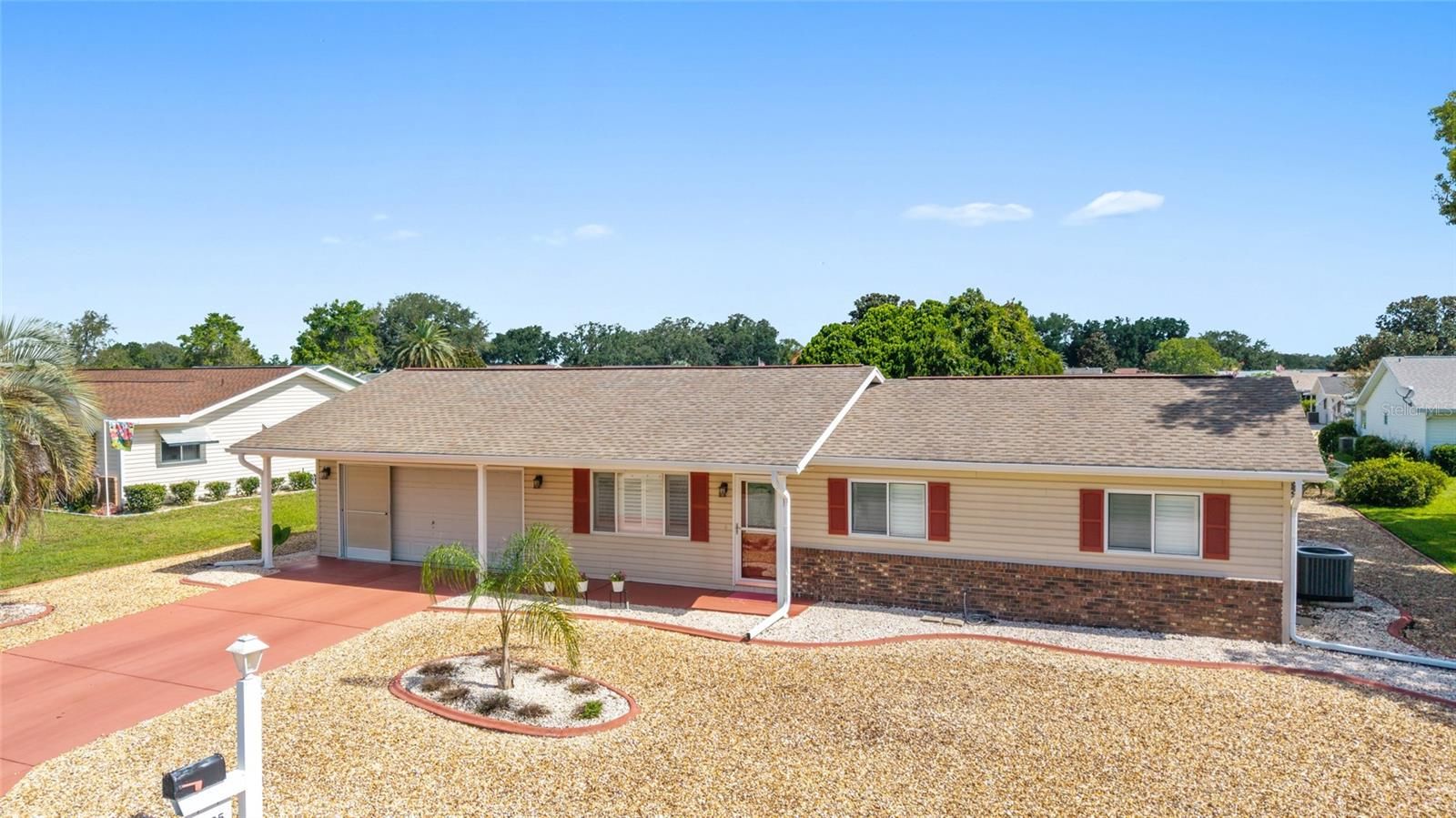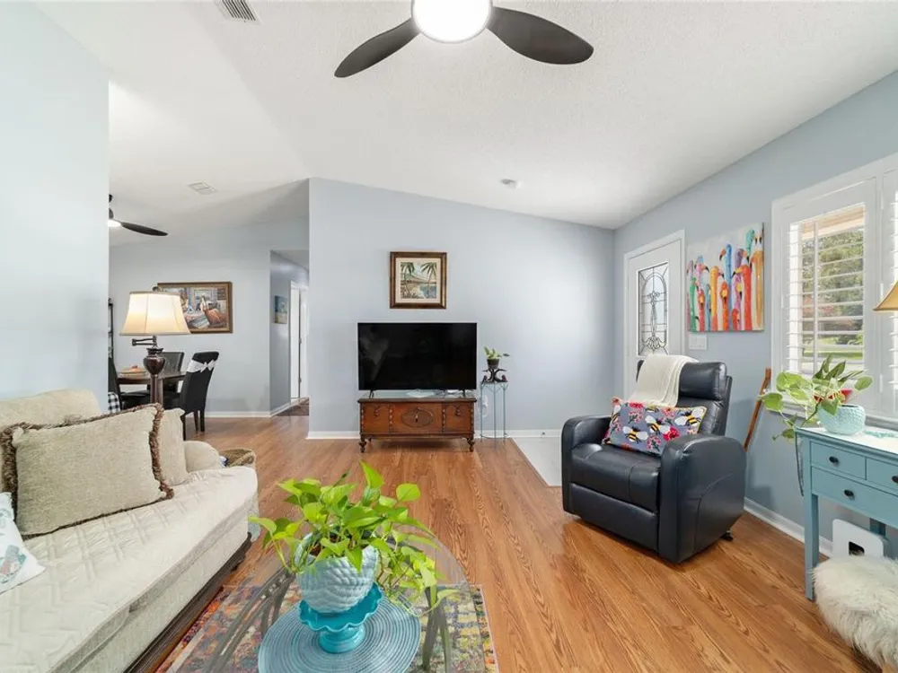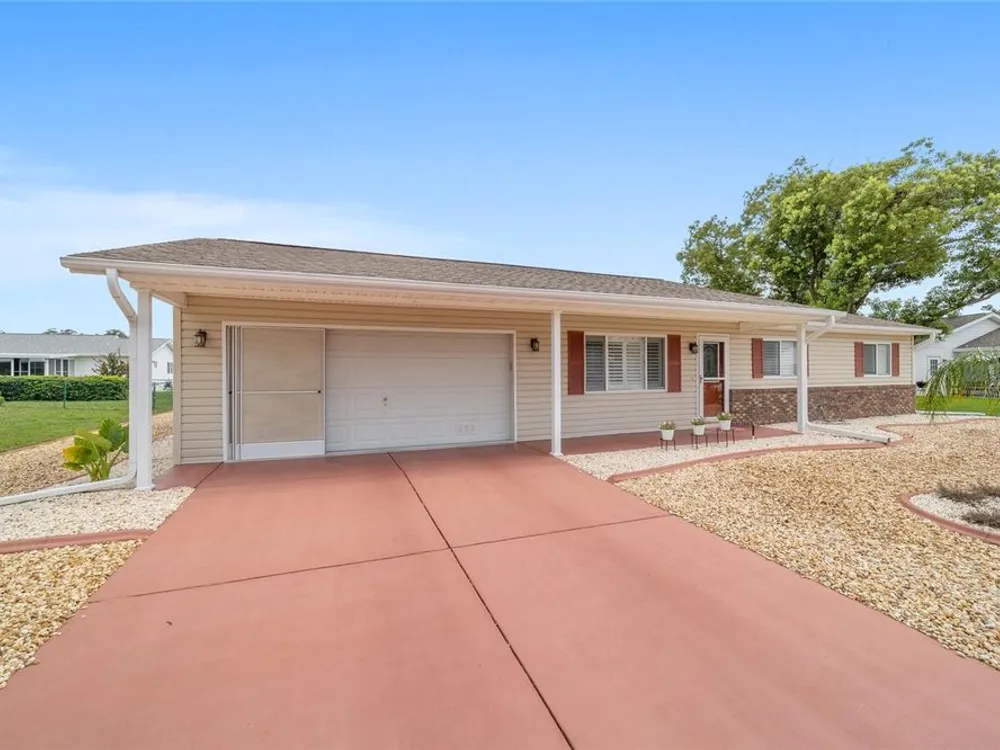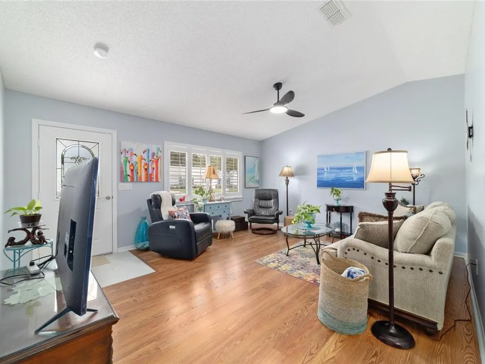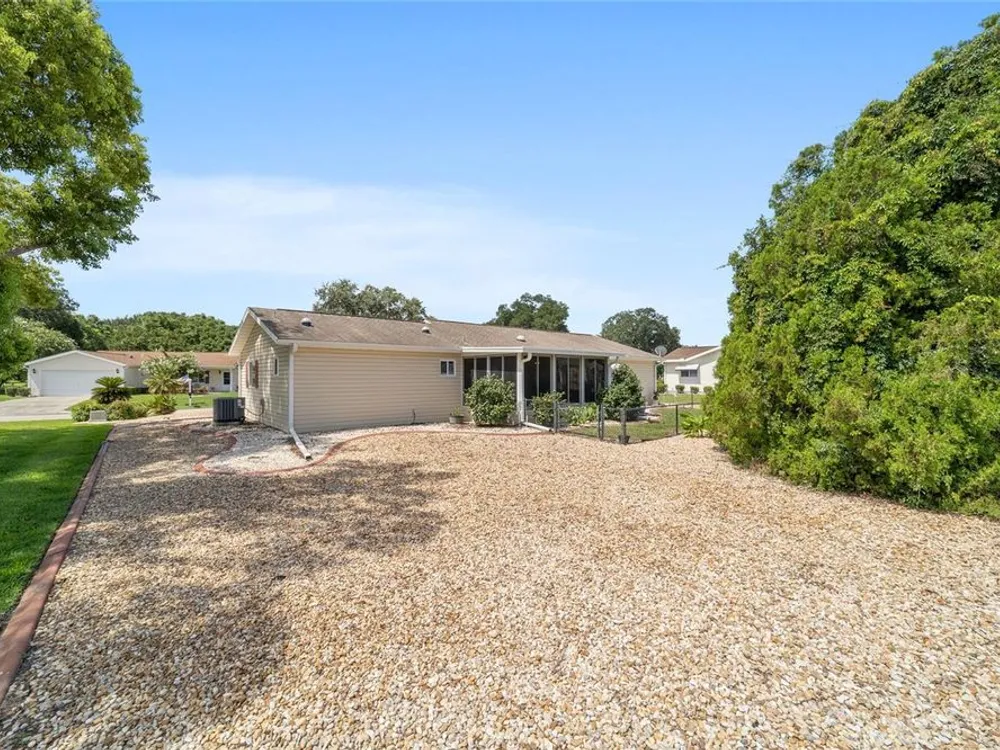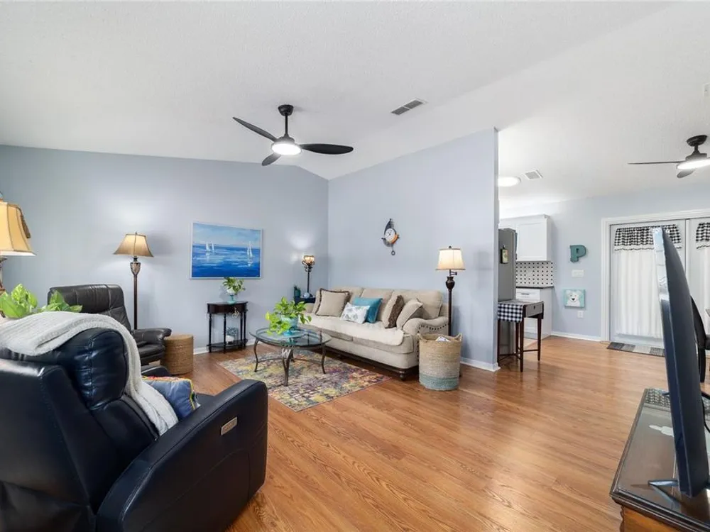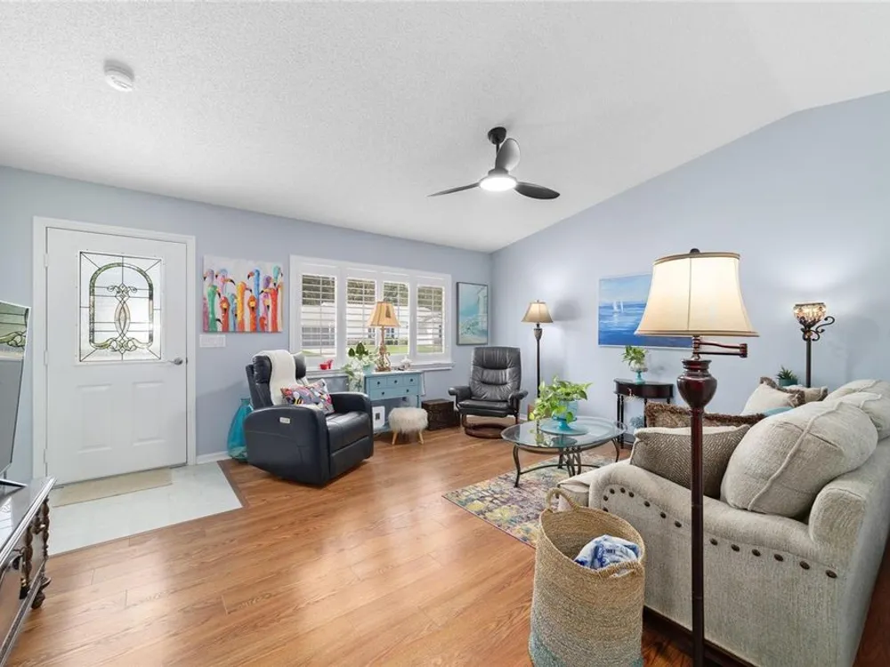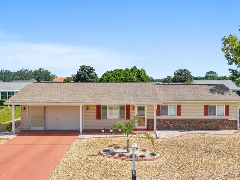 This charming 2-bedroom, 2-bath brick home, located in a gated 55+ community next to The Villages, offers 1,158 sq ft of meticulously maintained living space. It boasts modern updates including a refreshed kitchen with granite countertops, soft-closing cabinets, and a stylish backsplash, along with artistically designed bathrooms featuring soft-closing cabinets, and stylish mid-tone vinyl plank flooring throughout. The beautifully landscaped yard features designer stone accents and a fenced area for your pet, all complemented by vaulted ceilings and fresh paint. Roof (2012), HVAC (2018). New refrigerator 11/2023, new microwave 2/2024, new range 9/2024 with air fryer & convection oven, replaced all hardware & faucet in kitchen, added french doors to lanai, replaced door & 2 windows in lanai, replace Living and dining room ceiling fans with LEDs & remotes, painted front door, landscaped front yard, replaced ceiling fixture in hallway, added shelf in master closet, 6 panel doors & hardware Conveniently situated near community amenities like a center, exercise facilities, and social activities, with easy golf cart access to shopping and healthcare. THIS HOME IS NOT LOCATED IN THE FEMA FLOOD ZONE. NO FLOOD INSURANCE REQUIRED