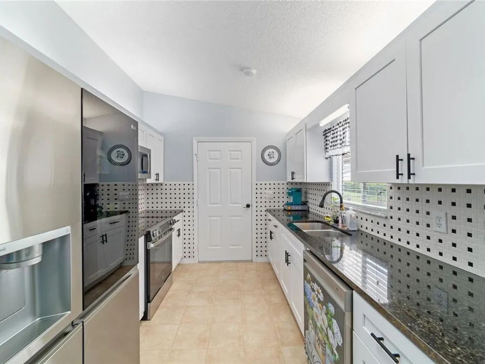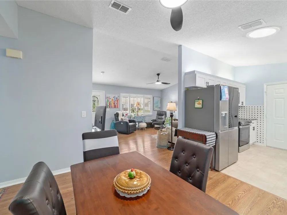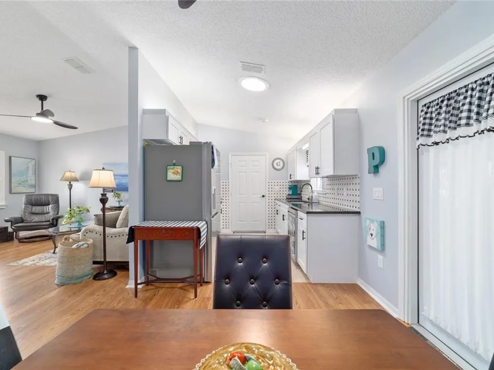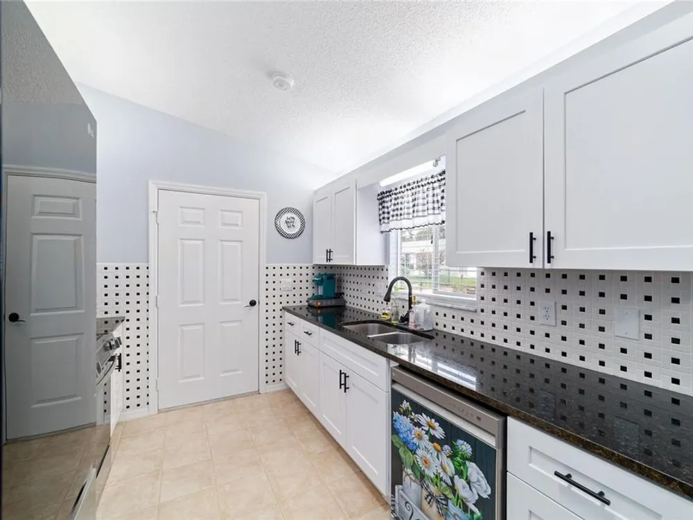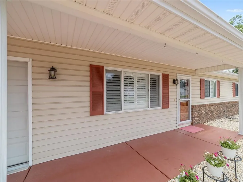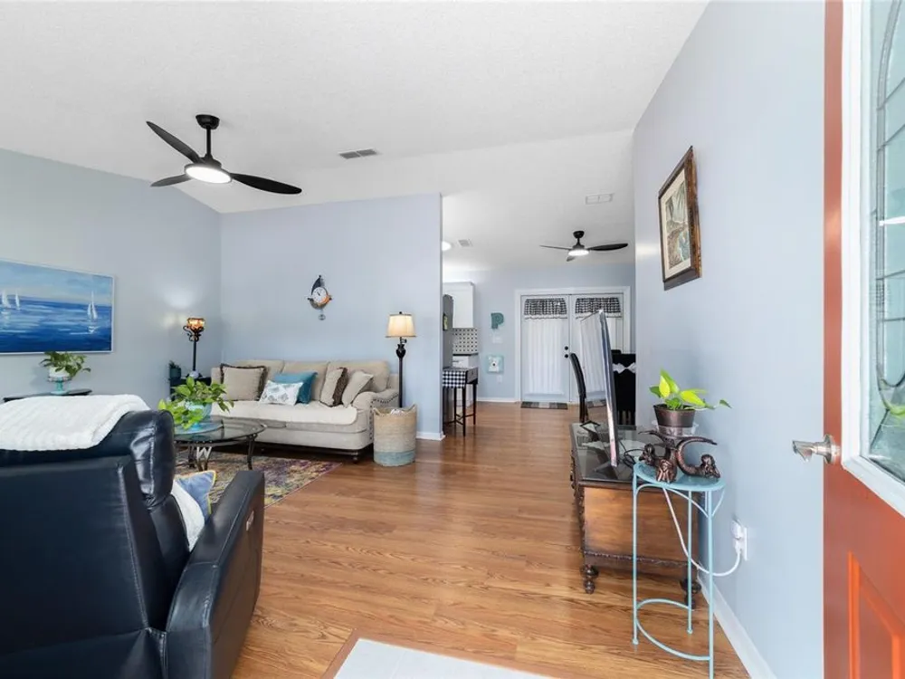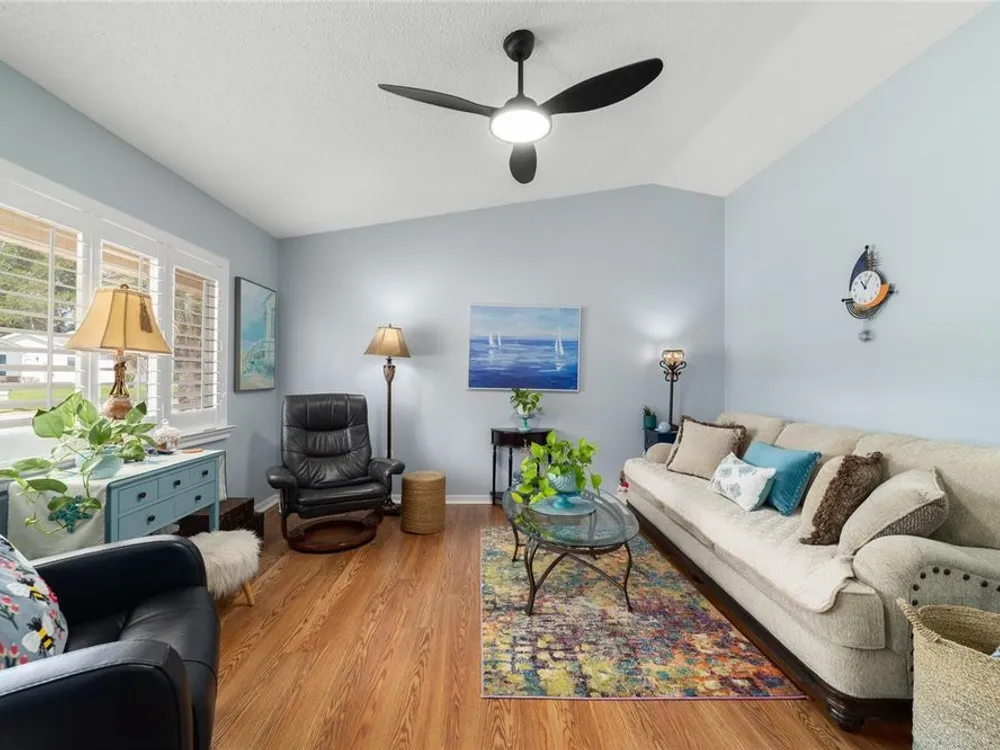 This charming 2-bedroom, 2-bath brick home, located in a gated 55+ community next to The Villages, offers 1,158 sq ft of meticulously maintained living space. It boasts modern updates including a refreshed kitchen with granite countertops, soft-closing cabinets, and a stylish backsplash, along with artistically designed bathrooms featuring soft-closing cabinets, and stylish mid-tone vinyl plank flooring throughout. The beautifully landscaped yard features designer stone accents and a fenced area for your pet, all complemented by vaulted ceilings and fresh paint. Roof (2012), HVAC (2018). New refrigerator 11/2023, new microwave 2/2024, new range 9/2024 with air fryer & convection oven, replaced all hardware & faucet in kitchen, added french doors to lanai, replaced door & 2 windows in lanai, replace Living and dining room ceiling fans with LEDs & remotes, painted front door, landscaped front yard, replaced ceiling fixture in hallway, added shelf in master closet, 6 panel doors & hardware Conveniently situated near community amenities like a center, exercise facilities, and social activities, with easy golf cart access to shopping and healthcare. THIS HOME IS NOT LOCATED IN THE FEMA FLOOD ZONE. NO FLOOD INSURANCE REQUIRED
