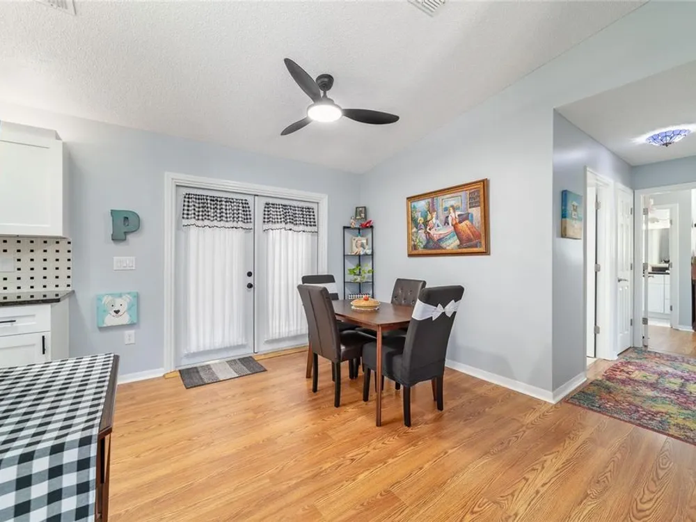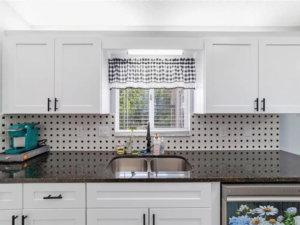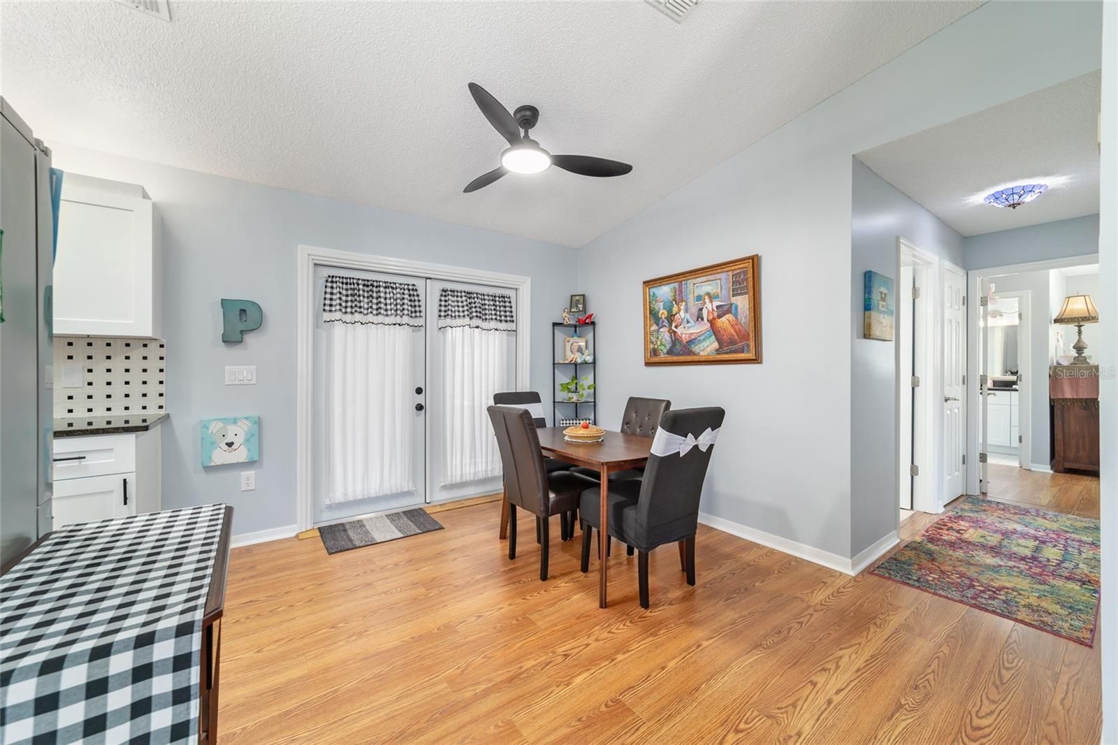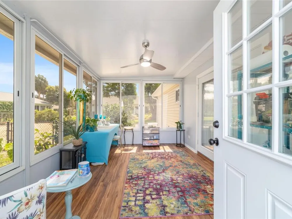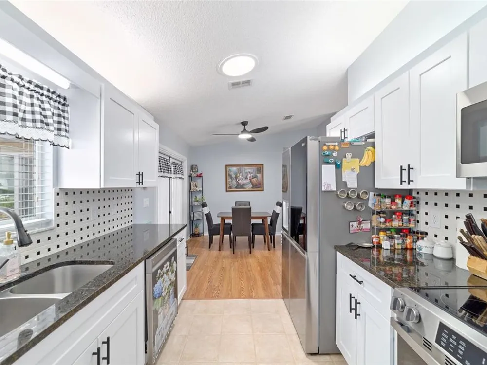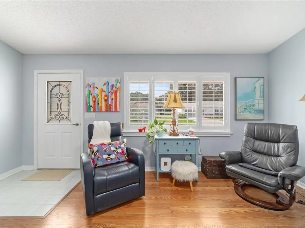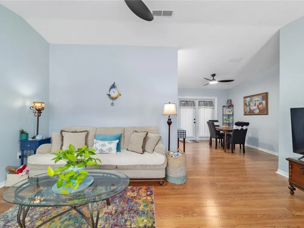 This charming 2-bedroom, 2-bath brick home, located in a gated 55+ community next to The Villages, offers 1,158 sq ft of meticulously maintained living space. It boasts modern updates including a refreshed kitchen with granite countertops, soft-closing cabinets, and a stylish backsplash, along with artistically designed bathrooms featuring soft-closing cabinets, and stylish mid-tone vinyl plank flooring throughout. The beautifully landscaped yard features designer stone accents and a fenced area for your pet, all complemented by vaulted ceilings and fresh paint. Roof (2012), HVAC (2018). New refrigerator 11/2023, new microwave 2/2024, new range 9/2024 with air fryer & convection oven, replaced all hardware & faucet in kitchen, added french doors to lanai, replaced door & 2 windows in lanai, replace Living and dining room ceiling fans with LEDs & remotes, painted front door, landscaped front yard, replaced ceiling fixture in hallway, added shelf in master closet, 6 panel doors & hardware Conveniently situated near community amenities like a center, exercise facilities, and social activities, with easy golf cart access to shopping and healthcare. THIS HOME IS NOT LOCATED IN THE FEMA FLOOD ZONE. NO FLOOD INSURANCE REQUIRED