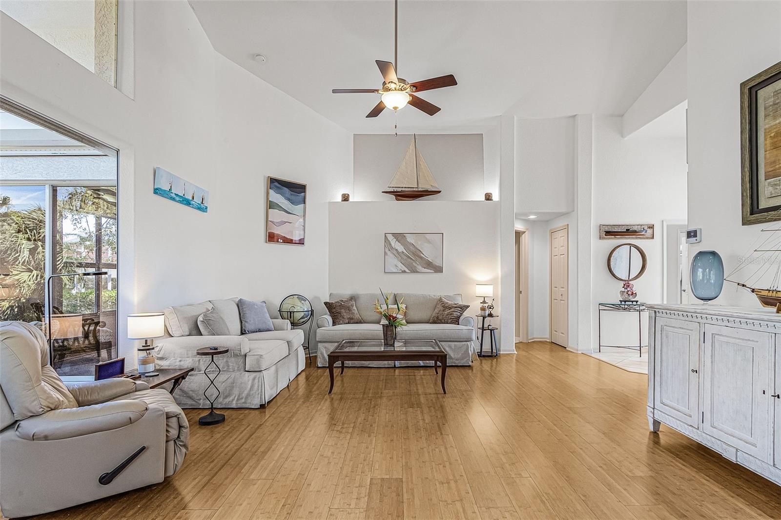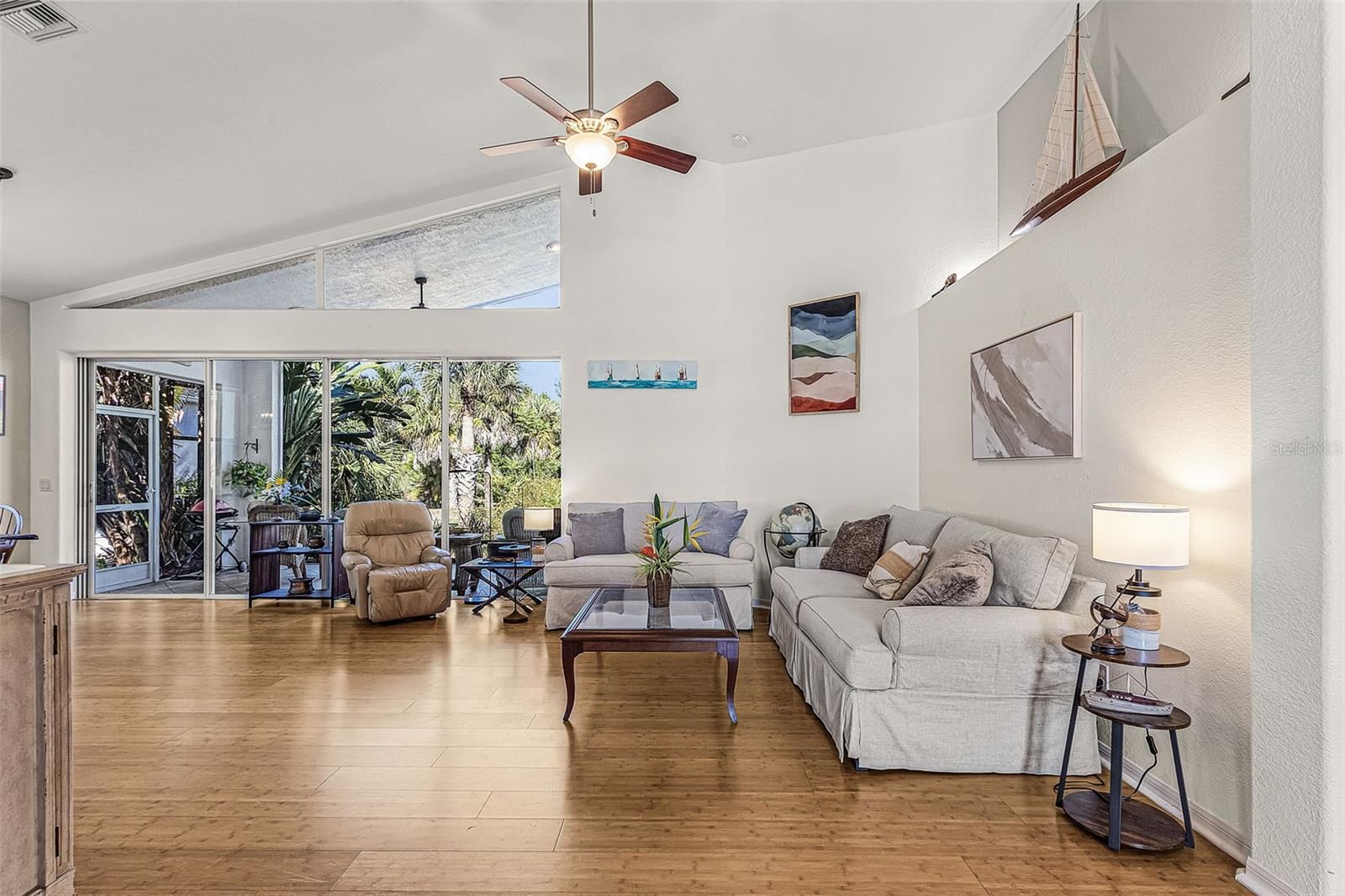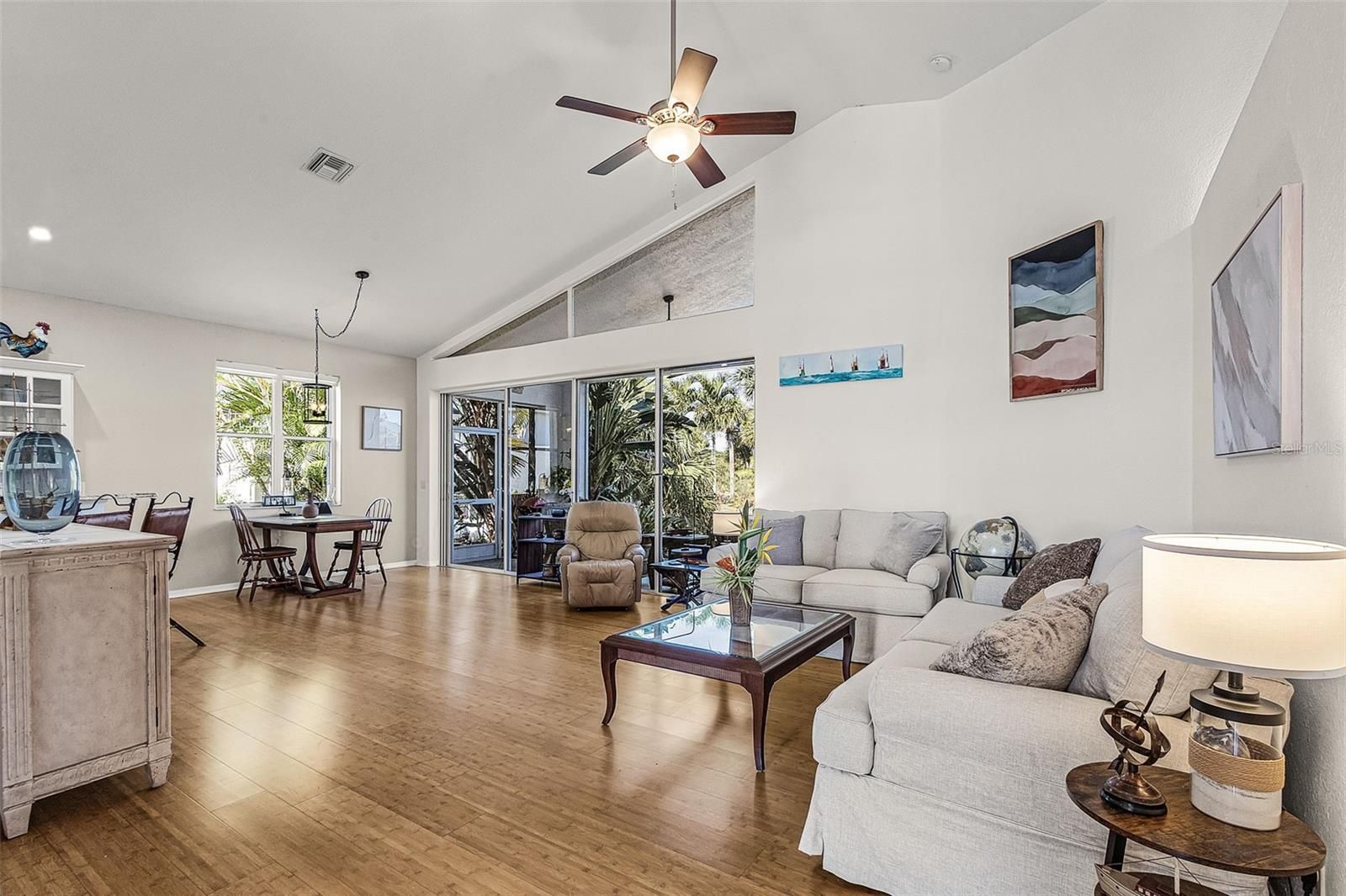 - Ceiling Fan(s), High Ceilings, Living/Dining Room, Open Floorplan, Main Level Primary, Split Bedrooms, Stone Counters, Vaulted Ceiling(s), Walk-In Closet(s), Window Treatments