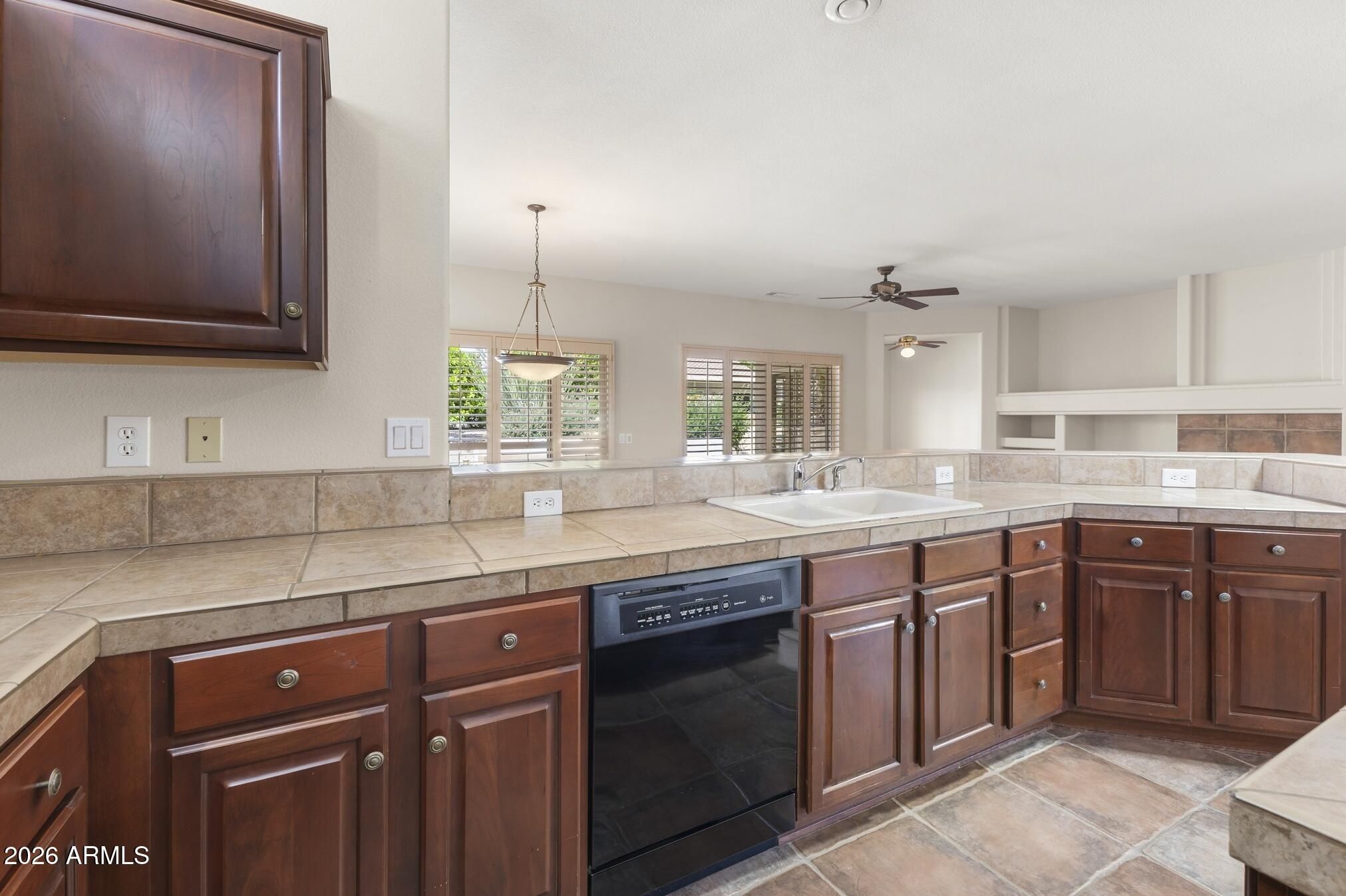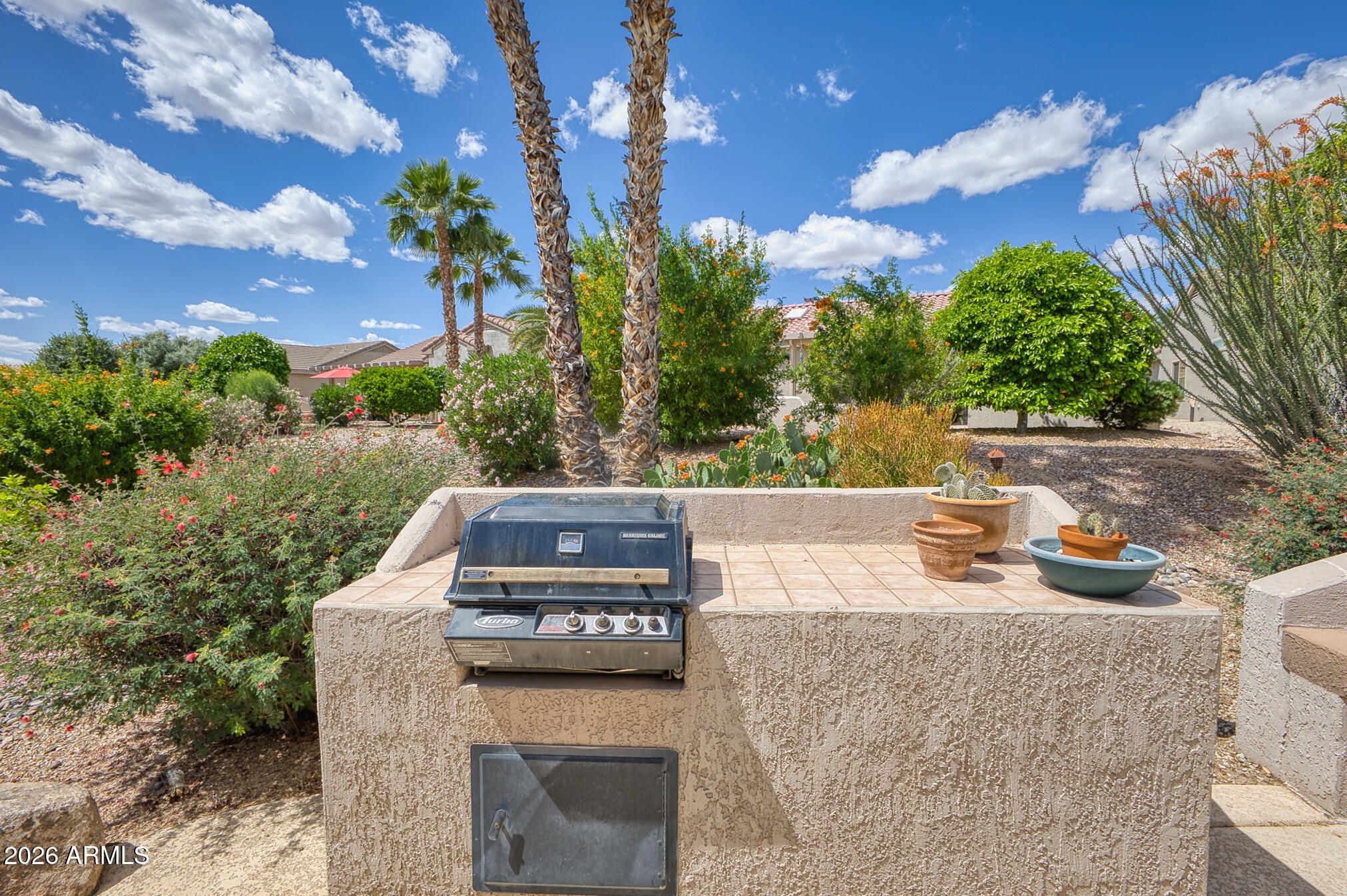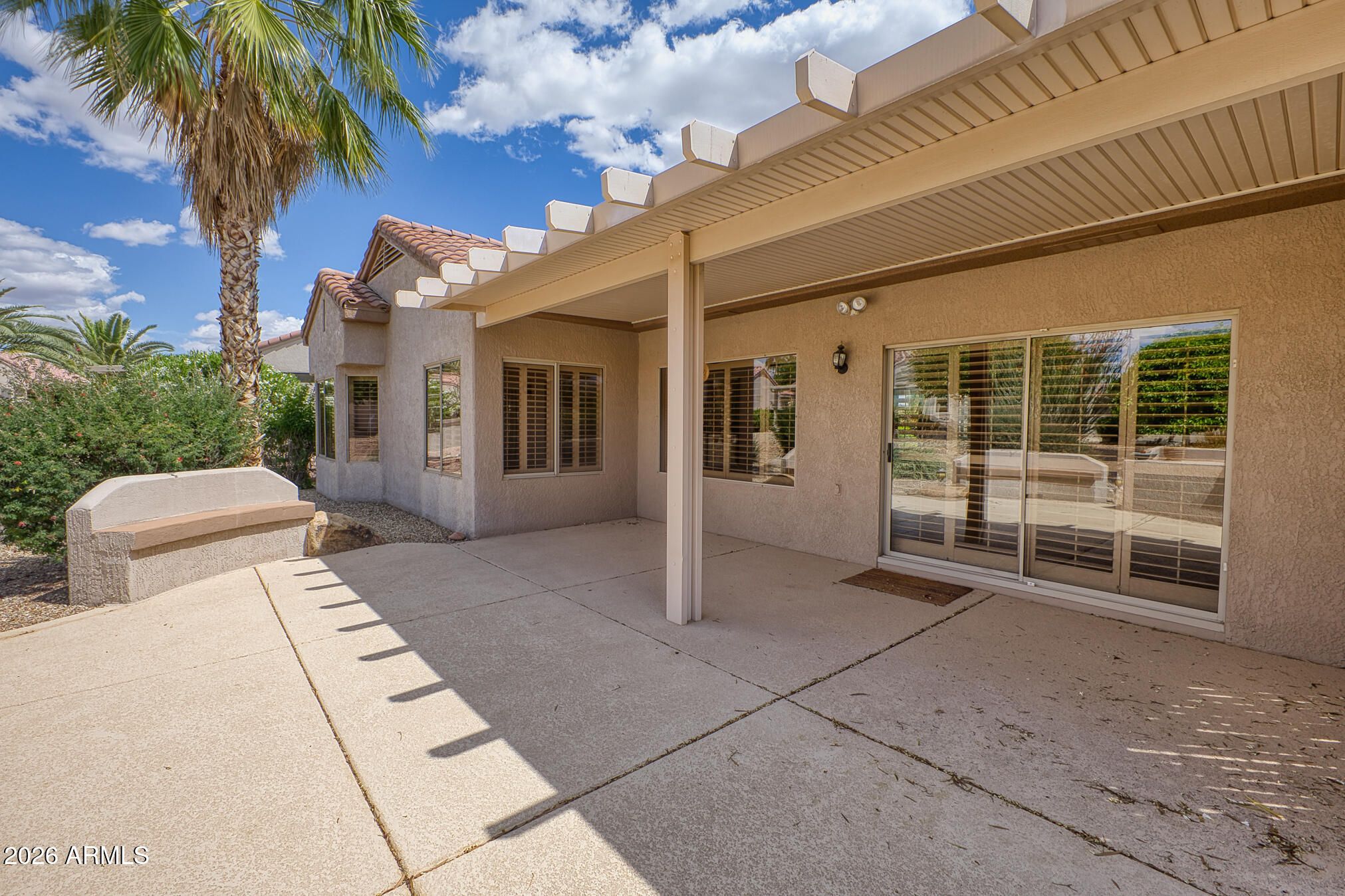 Highly desirable Sun City Grand Desert Rose/Verde model offering exceptional value, upgrades, and curb appeal. Cool-decked walkways welcome you to this well-maintained 1,782 sq ft home featuring 2 bedrooms, 2 baths, and a versatile den. Open-concept layout with tile in main areas and plantation shutters throughout. The kitchen showcases cherry cabinetry, center island, and large pantry. Spacious primary suite with bay window creates a relaxing retreat. Primary bath has two sinks. Interior laundry with built-in storage. Extended garage with built-in cabinets. Enjoy the private, extended backyard patio privacy walls and built-in barbecue--ideal for relaxing or entertaining. 2015 AC/Furnace. Netmetering solar billing at just $60/month enhances efficiency savings. This home delivers it all!