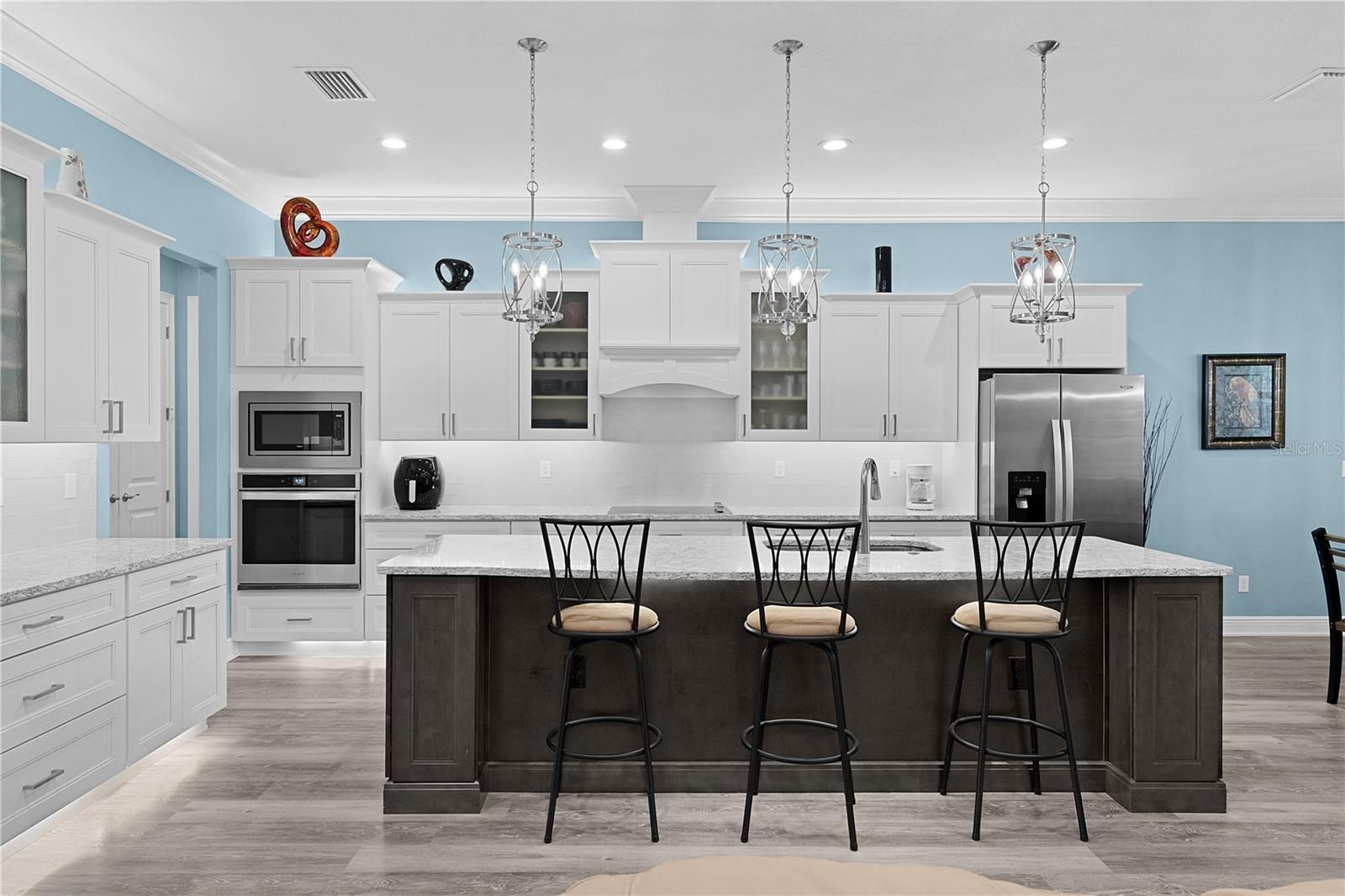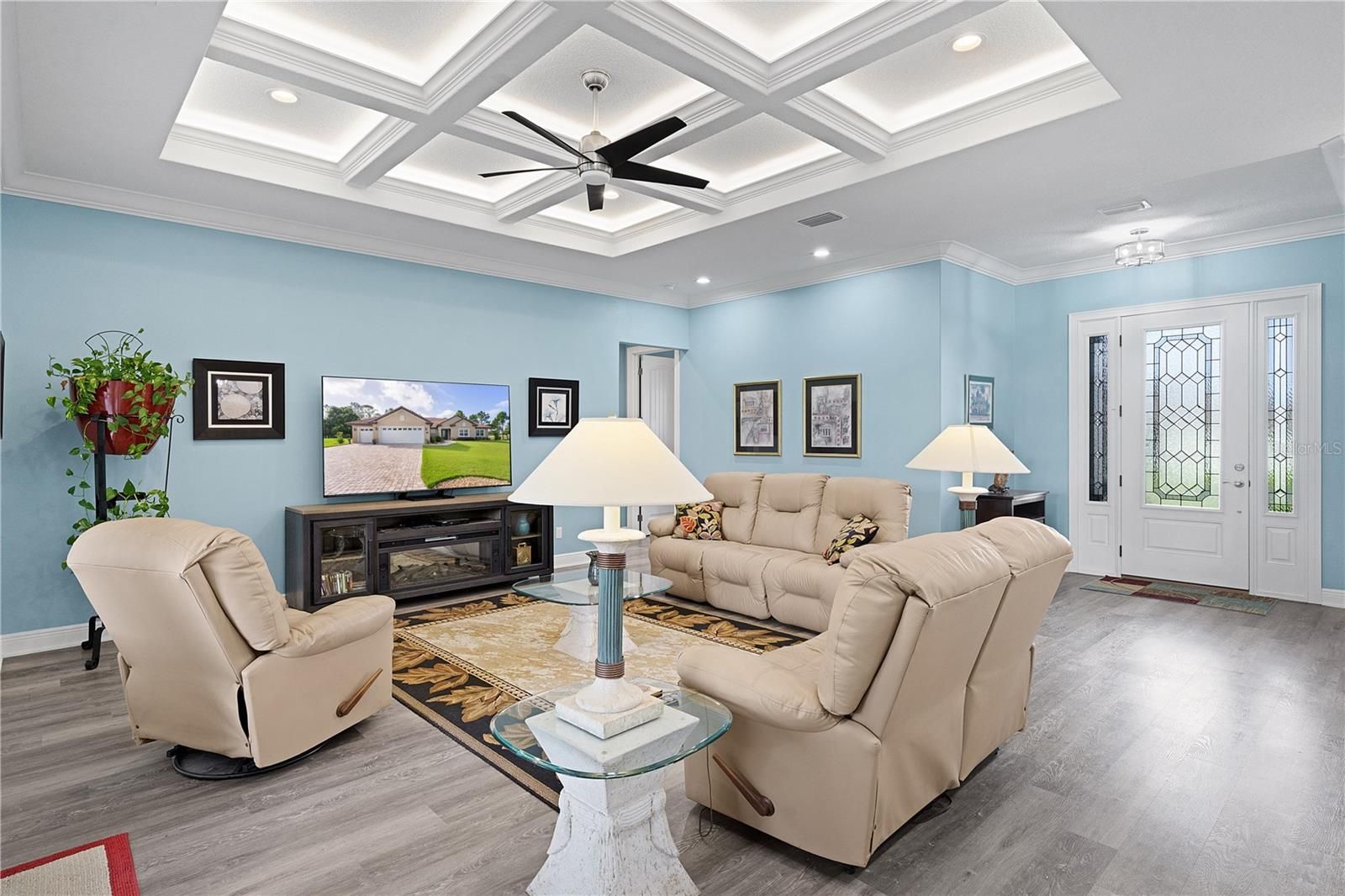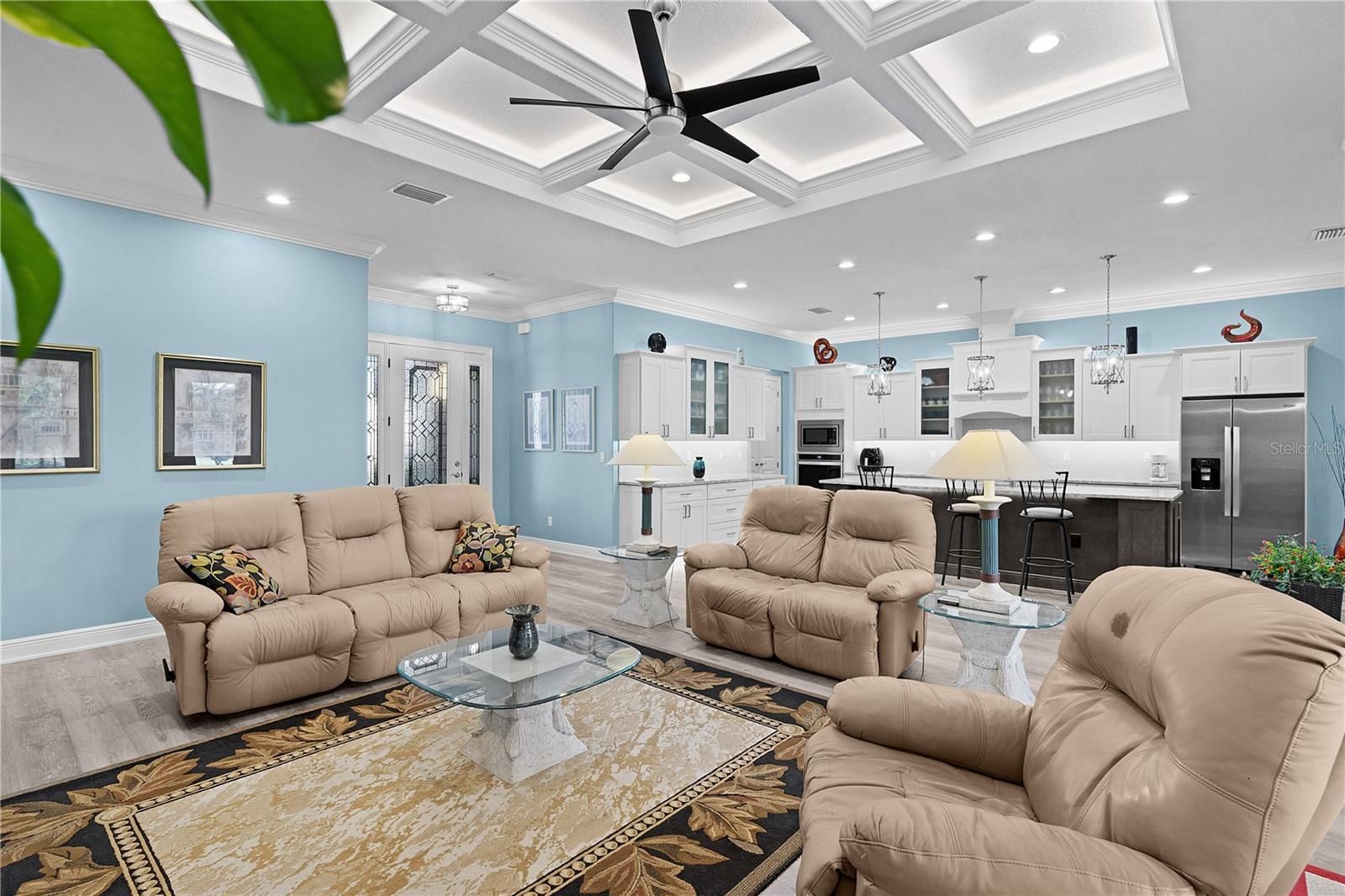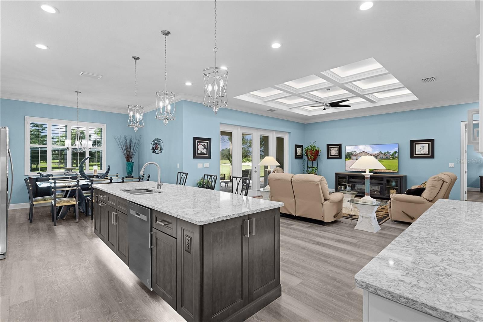 - Coffered Ceiling(s), Crown Molding, Eat-in Kitchen, High Ceilings, Kitchen/Family Room Combo, Open Floorplan, Stone Counters, Thermostat, Tray Ceiling(s), Walk-In Closet(s), Window Treatments