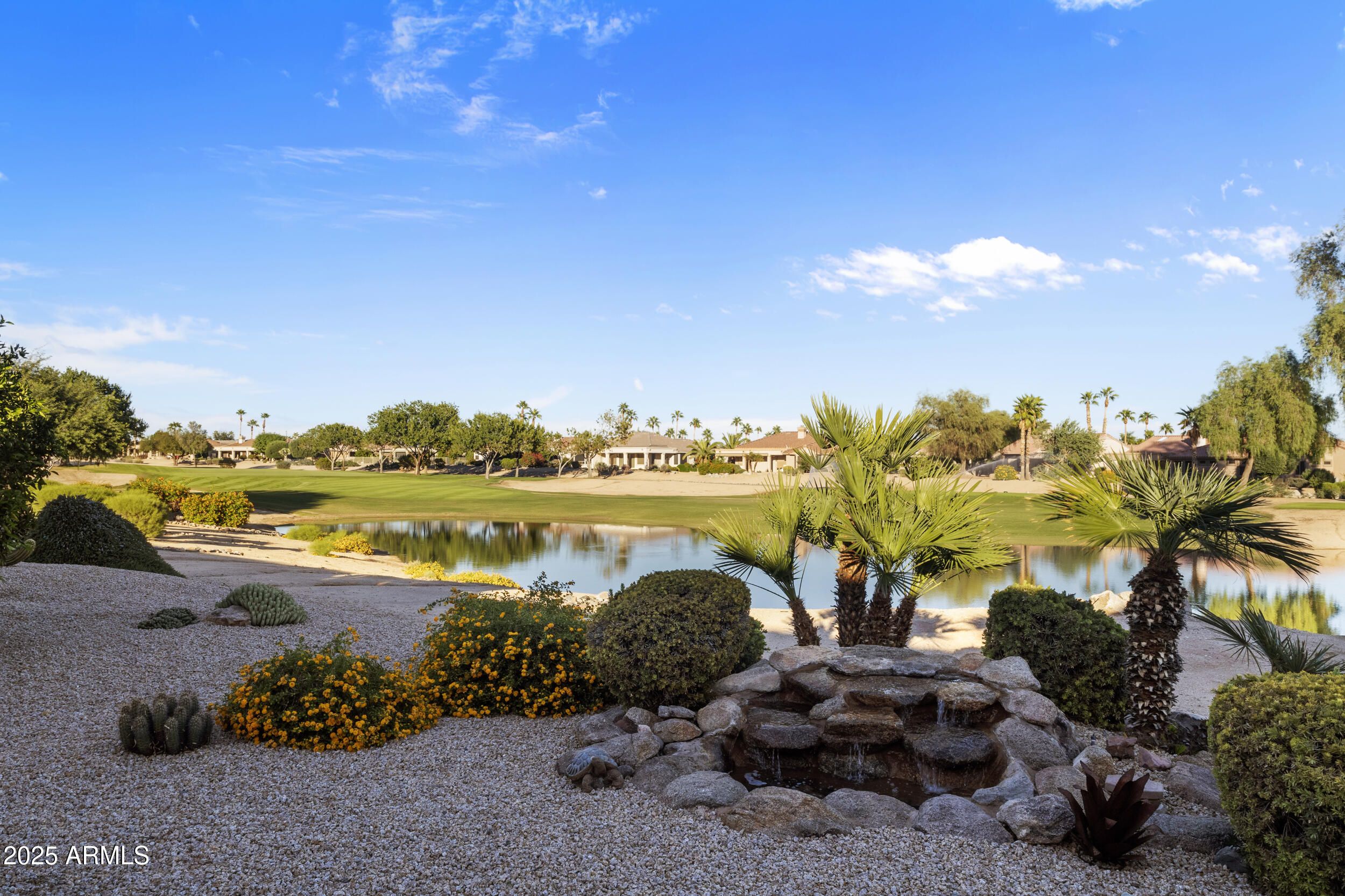 Extended Stonecrest 3 bed/2 bath with stunning water and golf views on Granite Falls South #17 in The Grand—Jasper Point. Enjoy panoramic vistas from tee box to green through expansive picture windows or from the Arizona room as herons visit the pond. Interior highlights include soaring ceilings, travertine floors, open layout, and a custom media wall with fireplace. The chef's kitchen features Cayden cherry cabinetry, Copenhagen granite, double ovens, and GE Profile appliances. Luxurious owner's suite offers a spa-like travertine shower, dual vanities, and custom closet. Guest bath includes curbless shower and designer finishes. Outdoor living boasts an extended patio, built-in BBQ, water feature, and golf cart garage. Major updates: roof underlayment (2021), flat patio roof (2021), awning (2019), and new Lennox furnace/16 SEER AC (2024).