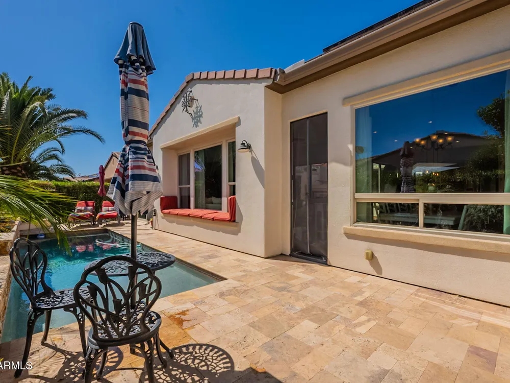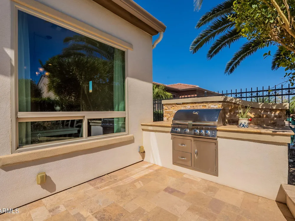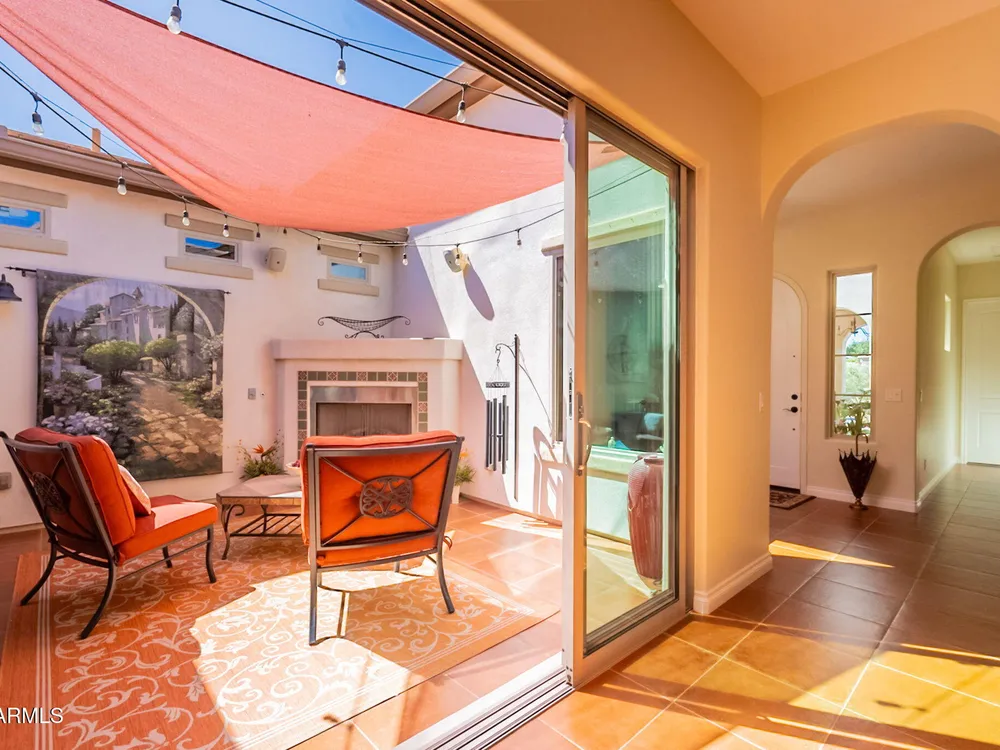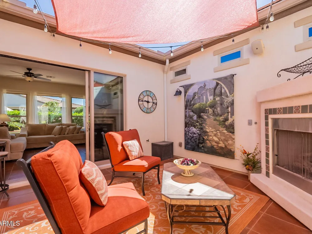 This fabulous Positano floor plan welcomes you immediately through the elongated front courtyard into an inviting foyer, where the warm interior courtyard with fireplace opens on 2 sides to a great room and a large kitchen extending your living space for perfect entertaining space or private serenity! Separate guest quarters with private bath for ultimate split floor plan! Gorgeous use of terra cotta tile floors, warm wood cabinets and copper like backsplash along with granite counters feel welcoming and ''at home! Your backyard is a private oasis with inviting pool, private built in bar b que makes this an entertainers delight! All of this with PAID SOLAR! All new paint makes this home move in ready! AND this fabulous home is NOT in the 55+ section of Encanterra!!