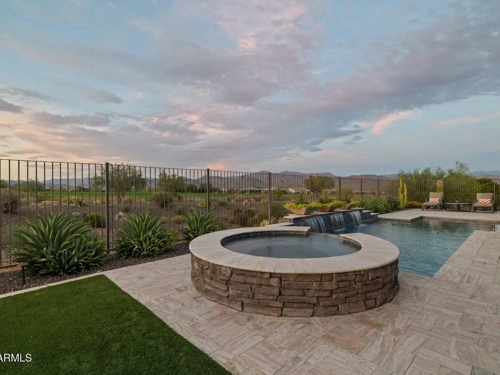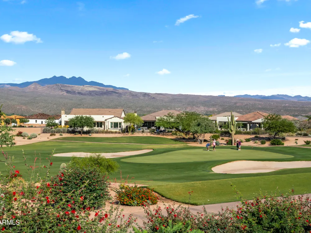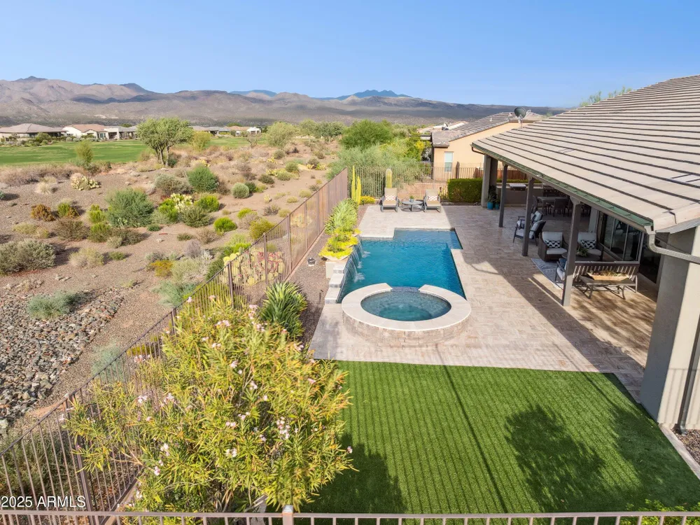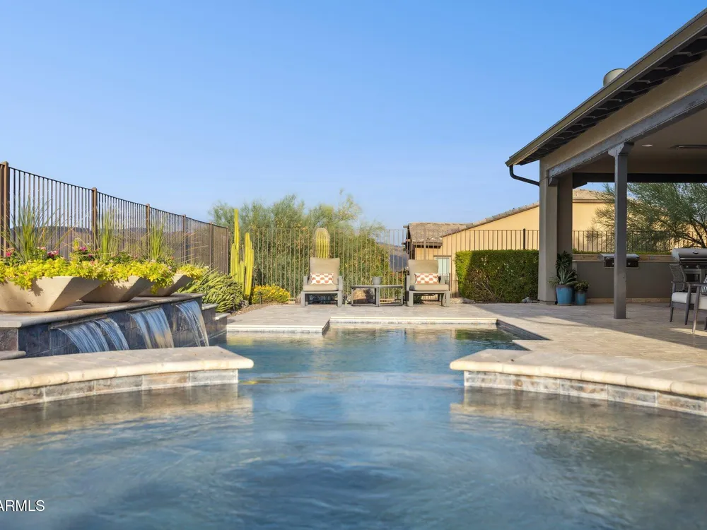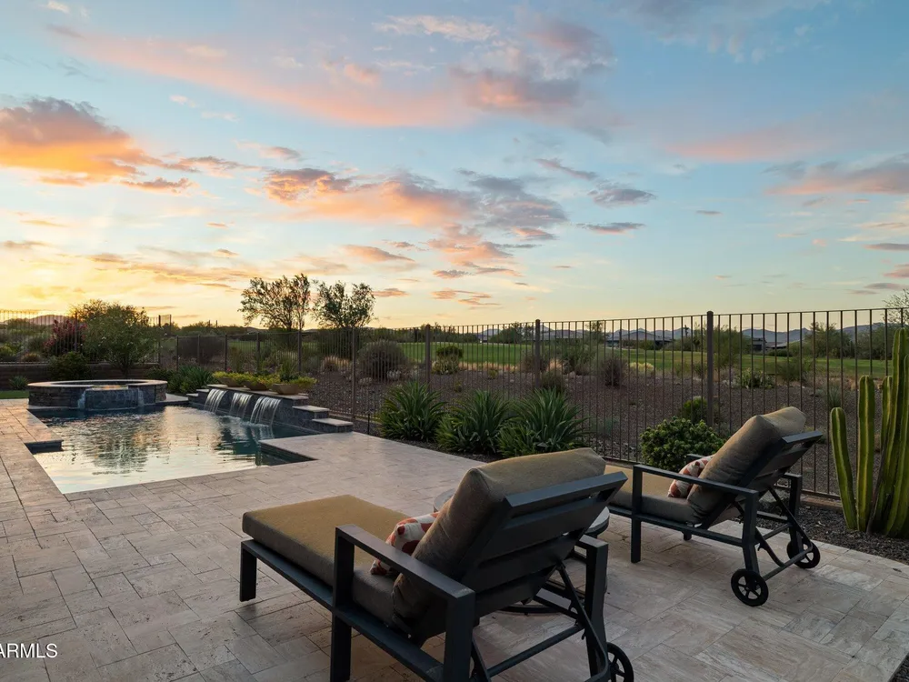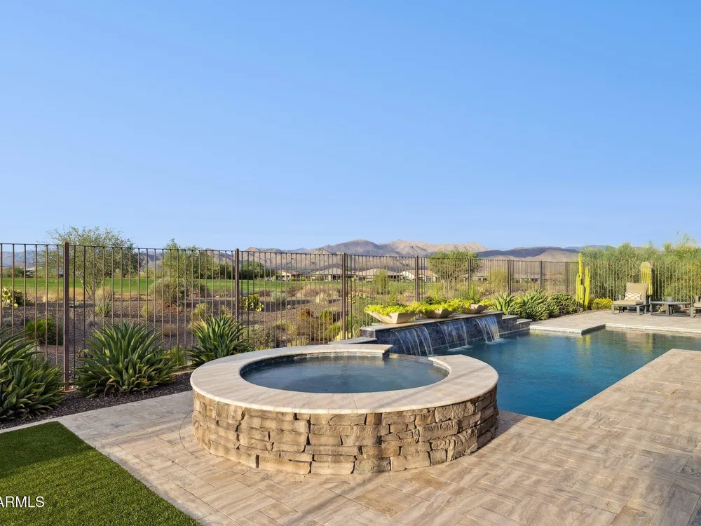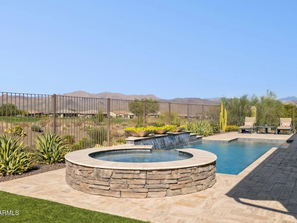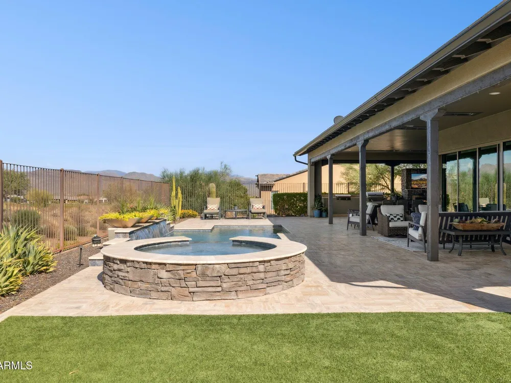 Stunning Golf Course Home with Mountain Views in Trilogy at Verde River! Located on the 16th fairway, this beautifully upgraded 3-bedroom, 3.5-bathroom home features an office, a bonus media room, and a spacious 3-car garage. Enjoy unobstructed Mazatzal Mountain views and breathtaking sunsets from your private resort-style backyard, complete with a pool, spa, built-in fireplace, and BBQ under a generous covered patio—perfect for outdoor entertaining. Inside, you'll find new wood flooring, quartzite kitchen countertops, designer window treatments, custom light fixtures, and an under-counter wine fridge. The primary suite offers a custom closet system and spa-like bathroom, while the great room, office, and media room showcase elegant custom cabinetry. The laundry room is thoughtfully designed with extra pantry space, cabinetry, and drying racks. The epoxy-coated garage includes built-in storage. Located in the prestigious, guard-gated Trilogy at Verde River, a premier resort community with golf, tennis, pickleball, pools, fitness center, spa, fine dining, and more.