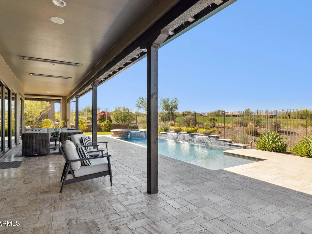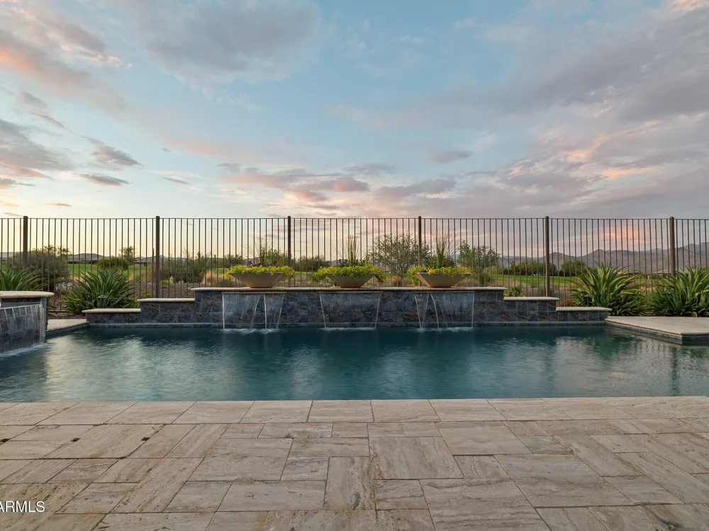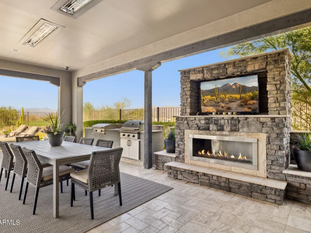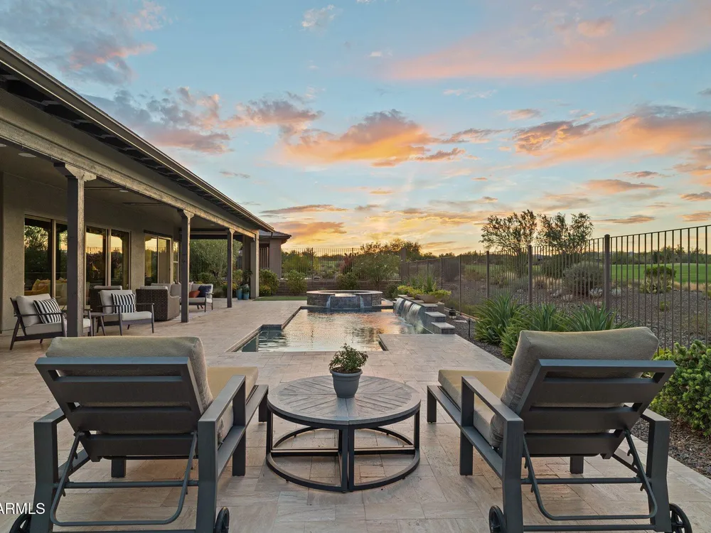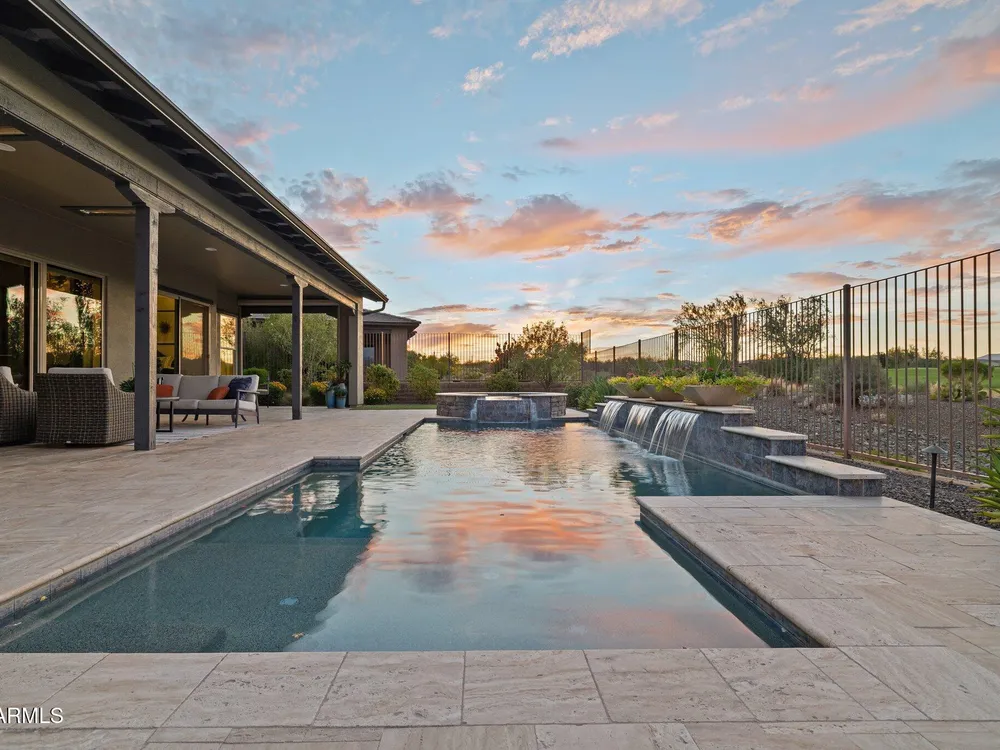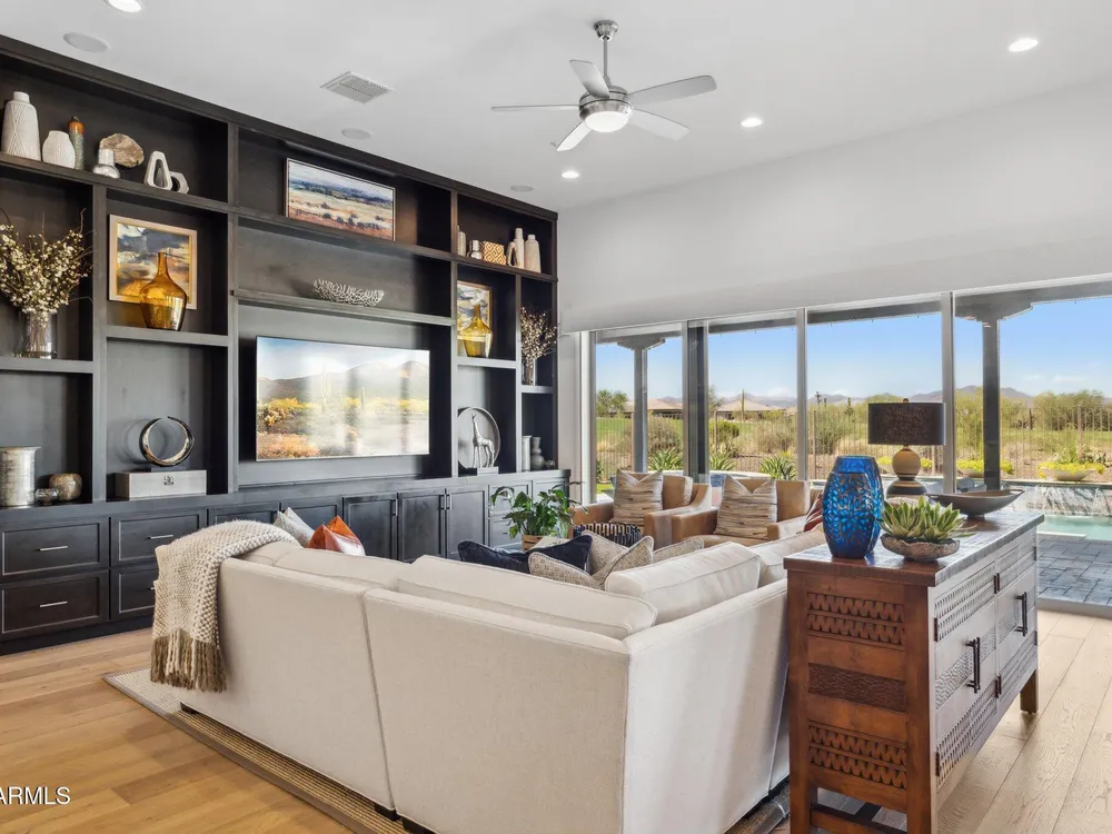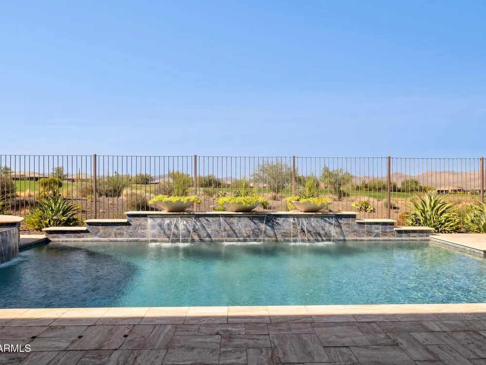 Stunning Golf Course Home with Mountain Views in Trilogy at Verde River! Located on the 16th fairway, this beautifully upgraded 3-bedroom, 3.5-bathroom home features an office, a bonus media room, and a spacious 3-car garage. Enjoy unobstructed Mazatzal Mountain views and breathtaking sunsets from your private resort-style backyard, complete with a pool, spa, built-in fireplace, and BBQ under a generous covered patio—perfect for outdoor entertaining. Inside, you'll find new wood flooring, quartzite kitchen countertops, designer window treatments, custom light fixtures, and an under-counter wine fridge. The primary suite offers a custom closet system and spa-like bathroom, while the great room, office, and media room showcase elegant custom cabinetry. The laundry room is thoughtfully designed with extra pantry space, cabinetry, and drying racks. The epoxy-coated garage includes built-in storage. Located in the prestigious, guard-gated Trilogy at Verde River, a premier resort community with golf, tennis, pickleball, pools, fitness center, spa, fine dining, and more.
