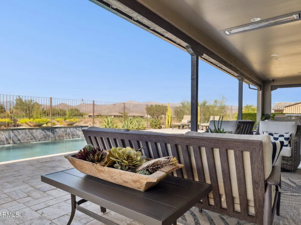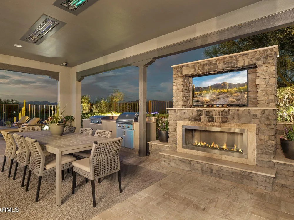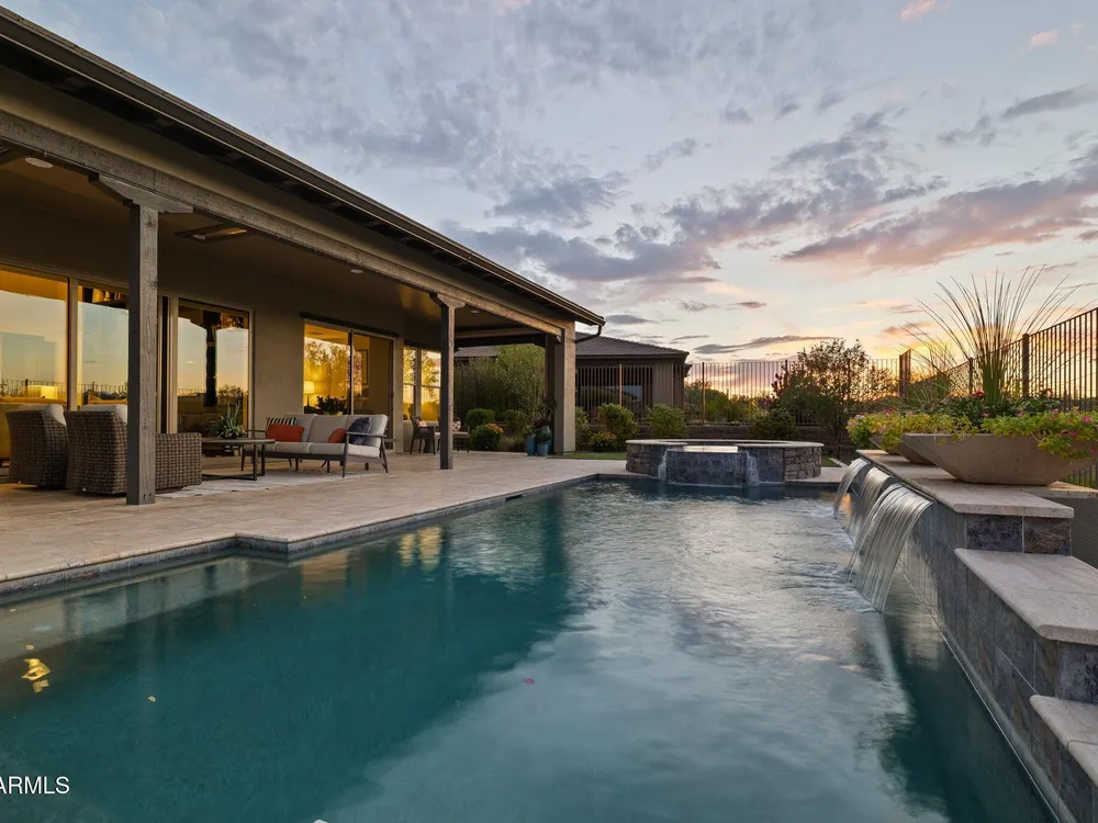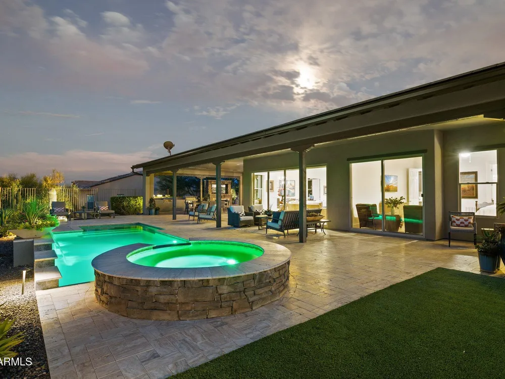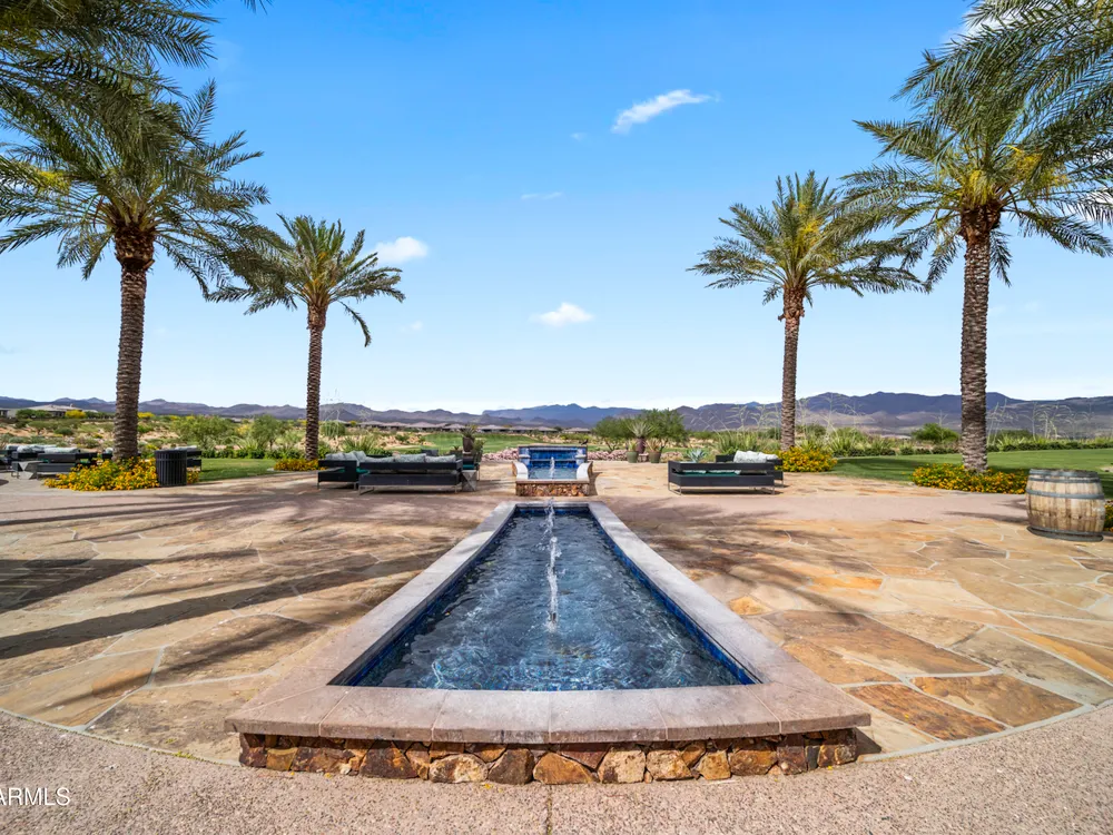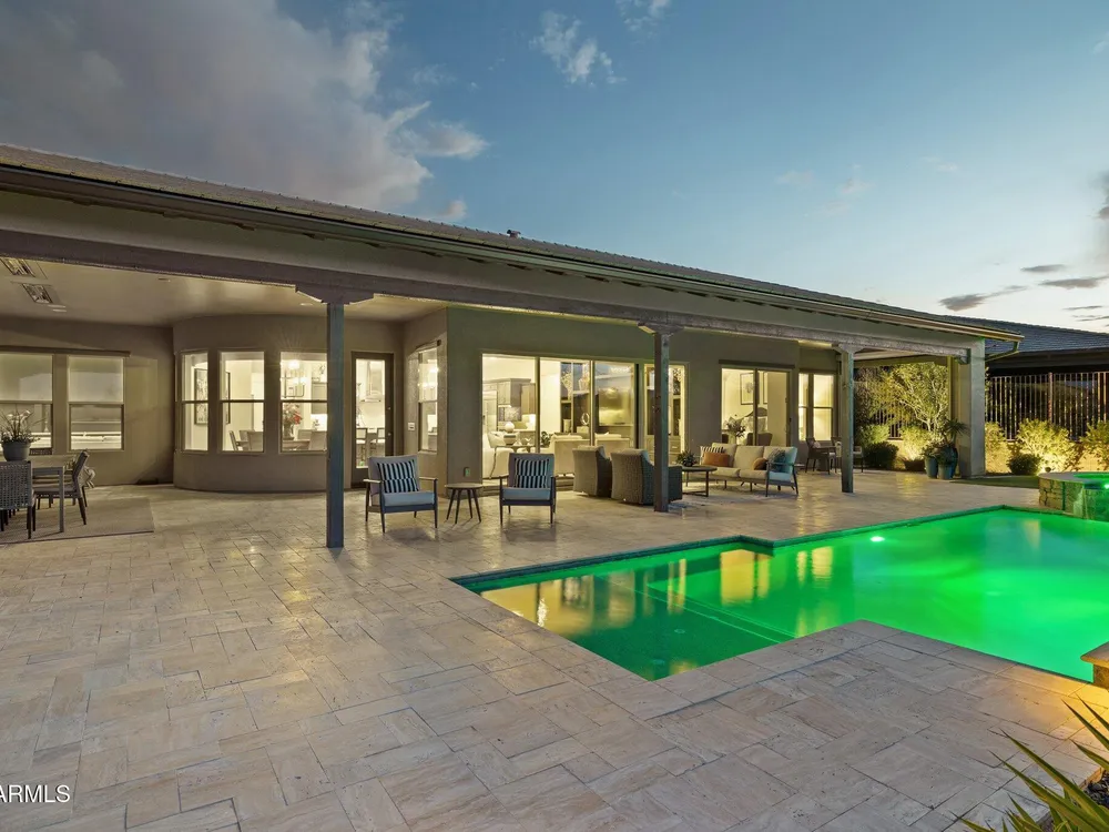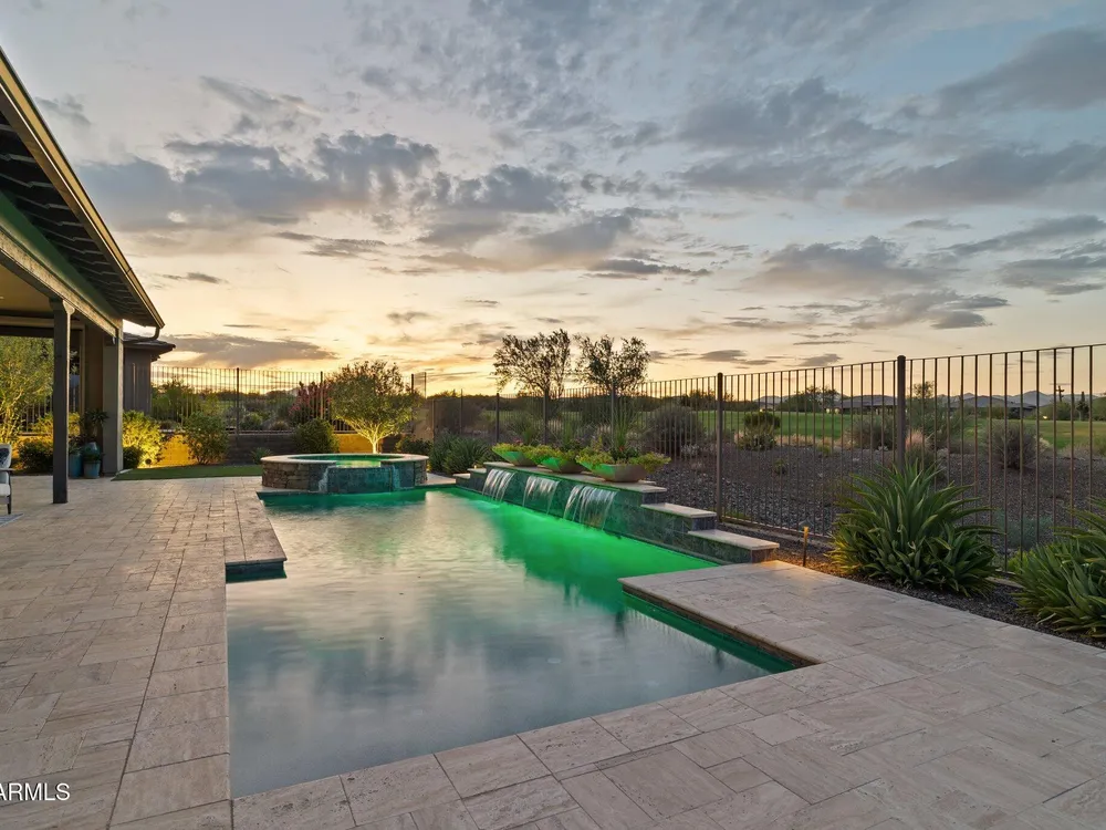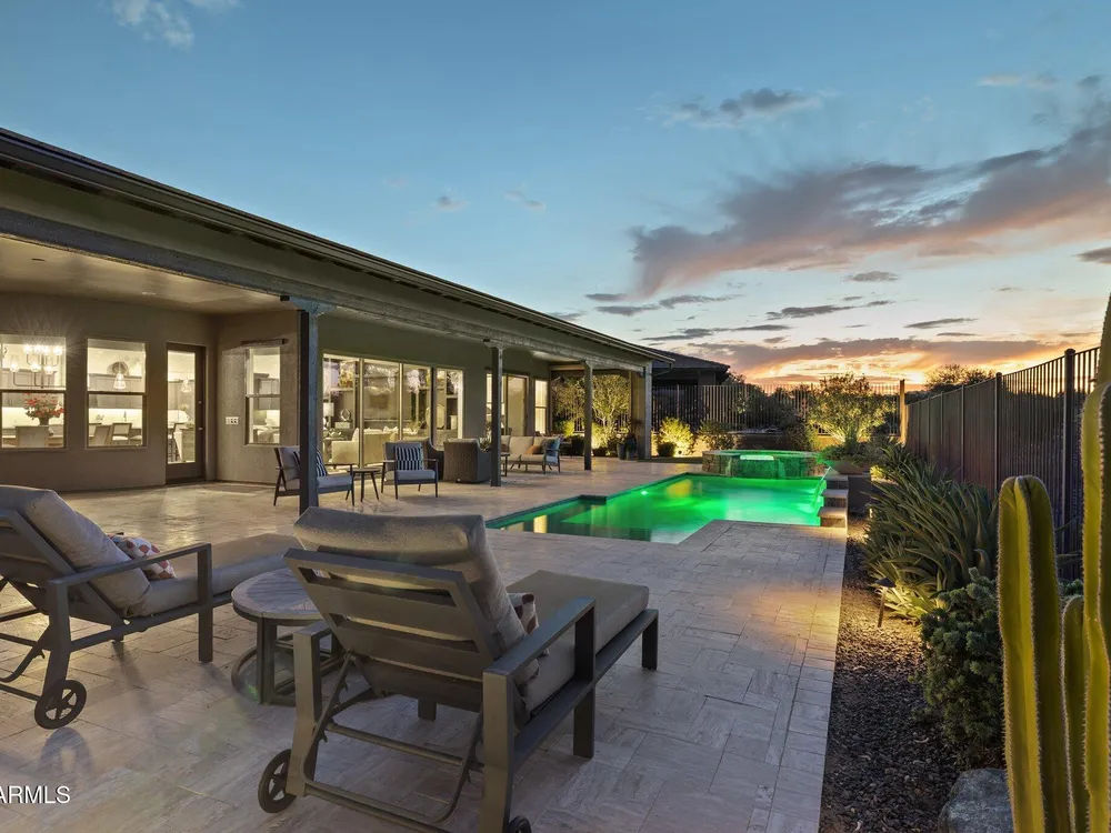 Stunning Golf Course Home with Mountain Views in Trilogy at Verde River! Located on the 16th fairway, this beautifully upgraded 3-bedroom, 3.5-bathroom home features an office, a bonus media room, and a spacious 3-car garage. Enjoy unobstructed Mazatzal Mountain views and breathtaking sunsets from your private resort-style backyard, complete with a pool, spa, built-in fireplace, and BBQ under a generous covered patio—perfect for outdoor entertaining. Inside, you'll find new wood flooring, quartzite kitchen countertops, designer window treatments, custom light fixtures, and an under-counter wine fridge. The primary suite offers a custom closet system and spa-like bathroom, while the great room, office, and media room showcase elegant custom cabinetry. The laundry room is thoughtfully designed with extra pantry space, cabinetry, and drying racks. The epoxy-coated garage includes built-in storage. Located in the prestigious, guard-gated Trilogy at Verde River, a premier resort community with golf, tennis, pickleball, pools, fitness center, spa, fine dining, and more.