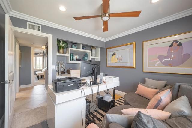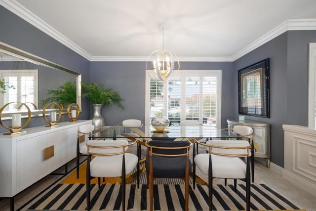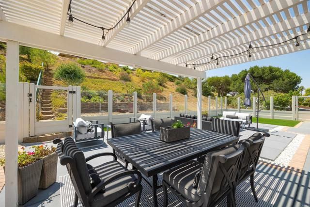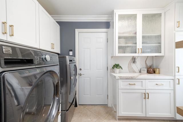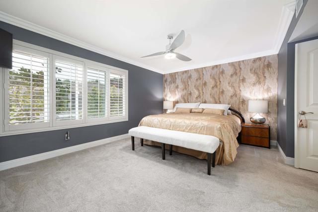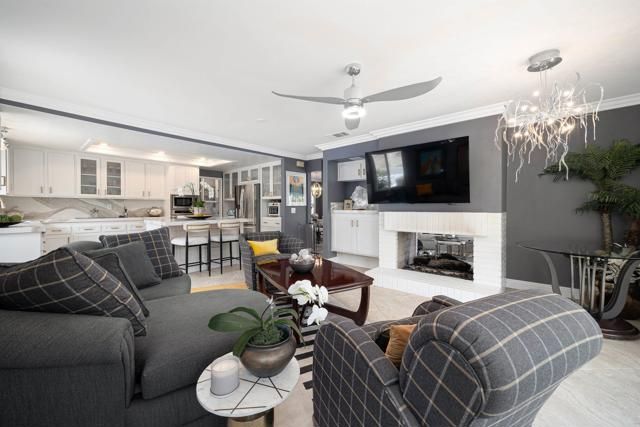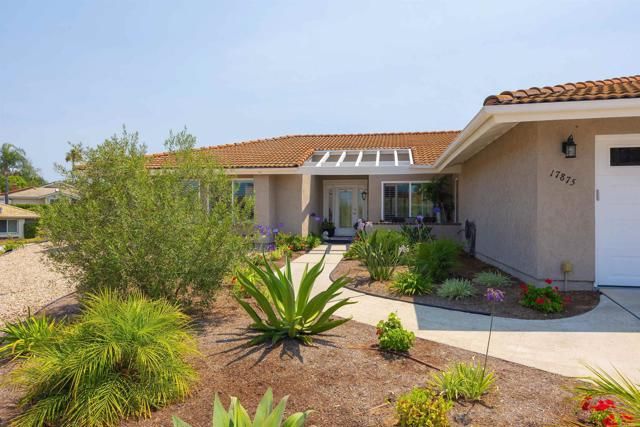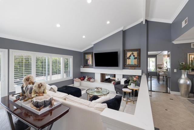 Discover this beautifully renovated single-story home tucked away on a quiet cul-de-sac in the highly sought after Oaks North 55+ community of Rancho Bernardo. Thoughtfully redesigned with high-end finishes, this home offers the perfect balance of style, comfort & effortless livability. Large windows flood the interior with natural light, while vaulted ceilings create an open, airy feel. Upon entry you're welcomed by a stunning floor-to-ceiling custom wall unit with integrated LED lighting-ideal for showcasing art & treasured pieces. A dramatic two-sided fireplace anchors the living, family & dining areas, adding warmth & architectural interest throughout the open-concept layout. The remodeled kitchen is a showpiece, featuring quartz countertops, SS appliances, custom cabinetry with decorative glass & designer hardware & an expanded butler's pantry & laundry area for exceptional storage & functionality-perfect for everyday living & entertaining alike. The primary suite offers a sophisticated retreat with designer paint selections, statement wallpaper accents, a custom closet system & an updated walk-in shower. Secondary bedrooms are currently configured to provide flexible space for guests, a home office or hobbies. Outside the tranquil space is perfect for entertaining with shaded sitting areas, privacy, mature fruit trees, gardening zone & elevated view perches. All new vinyl & glass fencing wraps the backyard to provide a secure haven for pets & comfort. Landscape has been totally redesigned with harmonious native drought tolerant plantings to create an architecturally sound & esthetic environment. Freshly epoxied flooring, EV charging station & added safe racks with additional cabinets enhance the oversized attached garage. Enjoy all that the community of Rancho Bernardo offers with nearby golf courses, workout center, pools, Bernardo Winery & farmers markets, tennis & pickleball courts. A home & community to treasure.