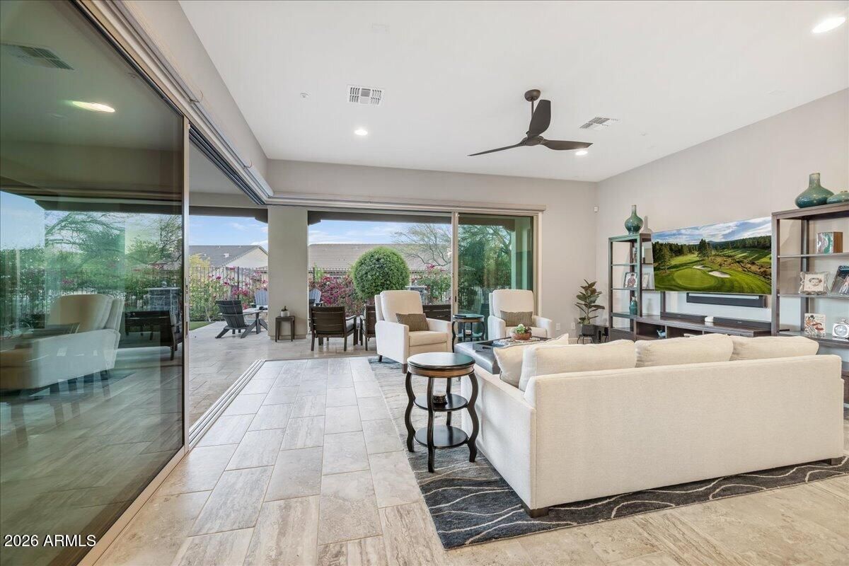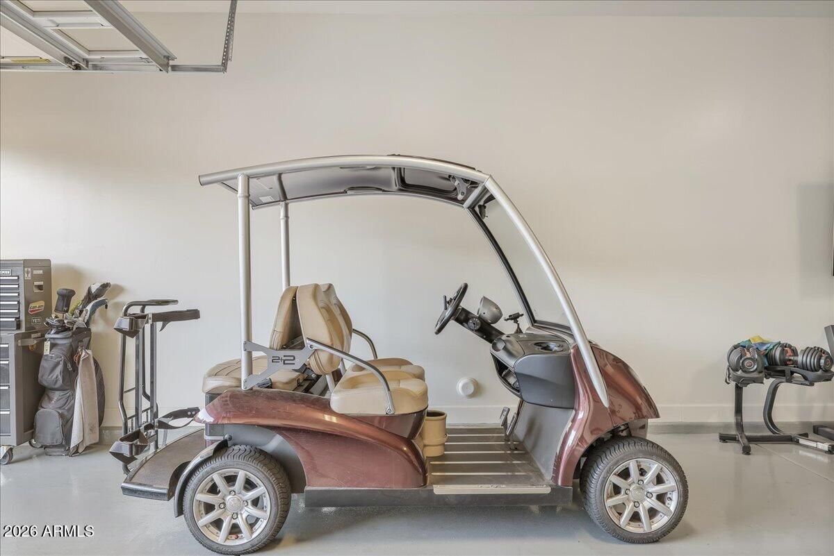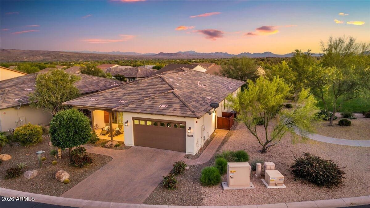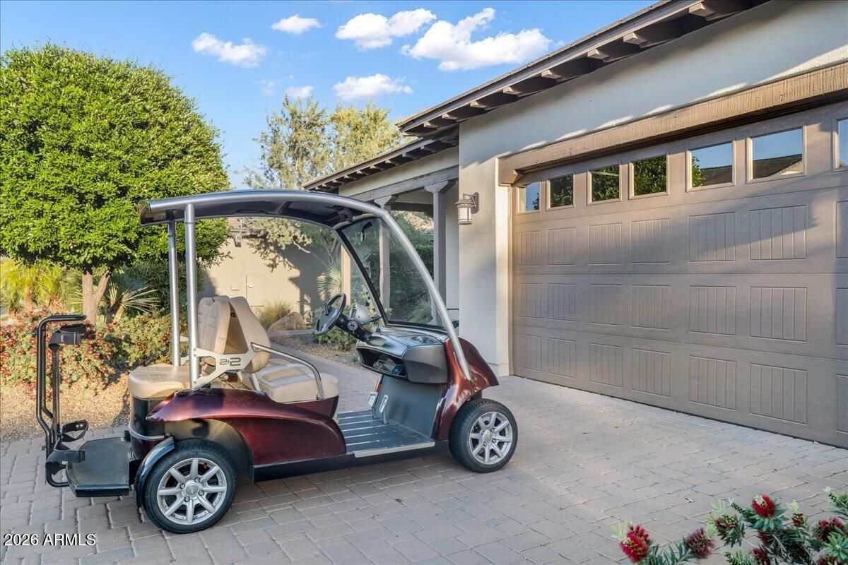 Experience elevated desert living in this beautifully upgraded Alisal model home, offering 2 bedrooms, 2.5 bathrooms, and 2,253 sq ft in the prestigious Trilogy at Verde River Golf & Social Club. Designed for both comfort and style, this residence showcases numerous builder upgrades and thoughtful enhancements throughout. The open-concept layout features tile flooring, 9-foot solid core doors, plantation shutters, and expansive double sliding glass doors with automatic shades that seamlessly connect indoor and outdoor living. The gourmet kitchen is equipped with premium GE Monogram appliances, including an additional wall oven--perfect for entertaining. Step outside to a private backyard retreat with low-maintenance desert landscaping, a covered patio, built-in BBQ, and breathtaking Four Peaks views. The oversized garage boasts an epoxy-coated floor, adding both durability and a polished finish. Additional highlights include a striking 42" x 96" custom iron front door from First Impressions Ironworks (Desert Contemporary design), ceiling fans throughout, climate controled (mini-split heating & cooling) garage space, and a Garia 2+2 luxury golf car included in the sale--well-maintained, low mileage, and a significant value. Located within one of Arizona's most desirable active adult communities, Trilogy at Verde River offers a true resort lifestyle. Residents enjoy access to a vibrant social club featuring a restaurant, coffee bar, market, culinary studio, fitness center, full-service spa, and resort-style pools with a poolside bar and grill. Recreational amenities include golf, tennis, pickleball, bocce, and a full calendar of social events. Ideal as a full-time residence or seasonal retreat, this home also benefits from reliable water service--unaffected by Rio Verde Foothills hauling concerns--and includes potential golf membership incentives. A rare opportunity to own a highly upgraded designer home in a premier community with unmatched amenities and stunning natural surroundings.