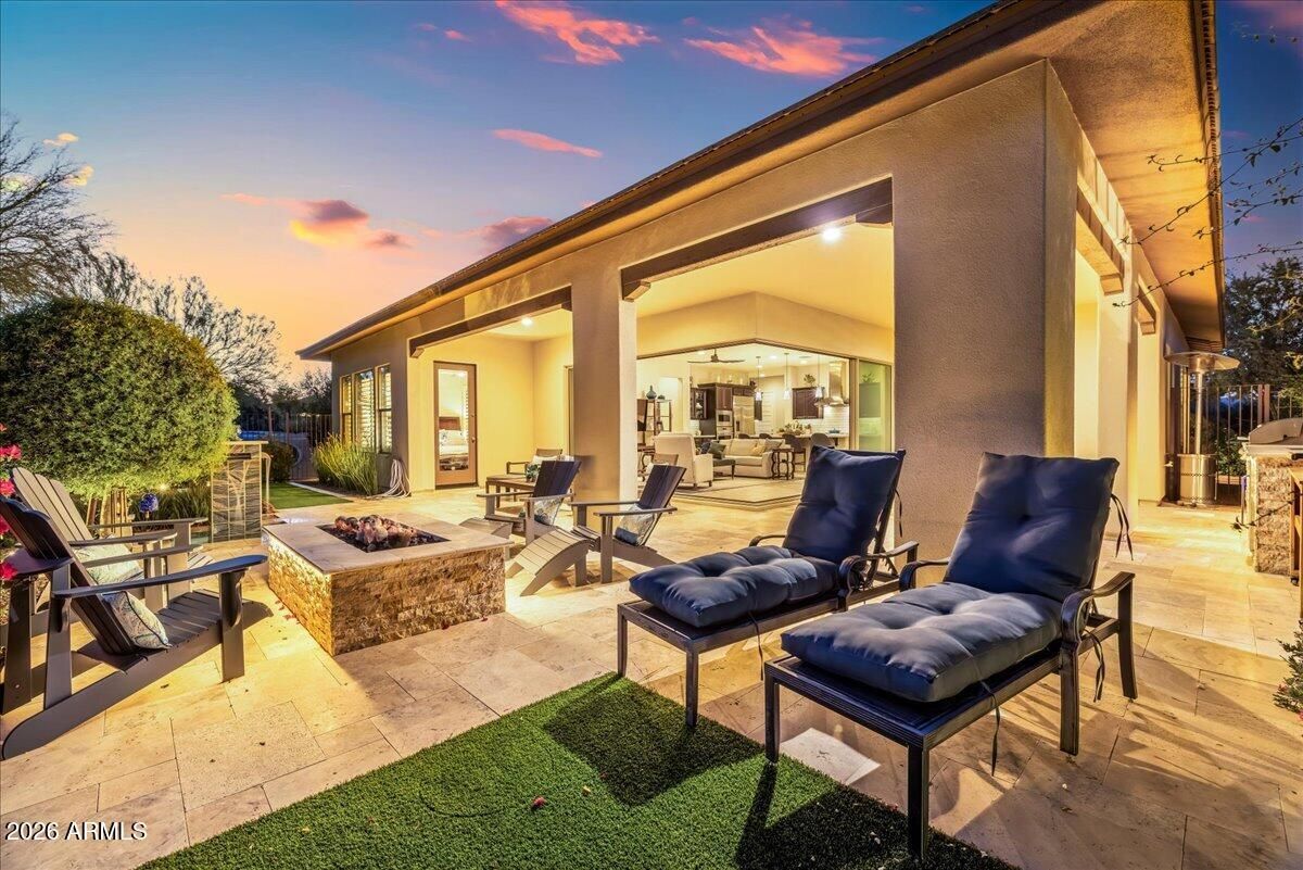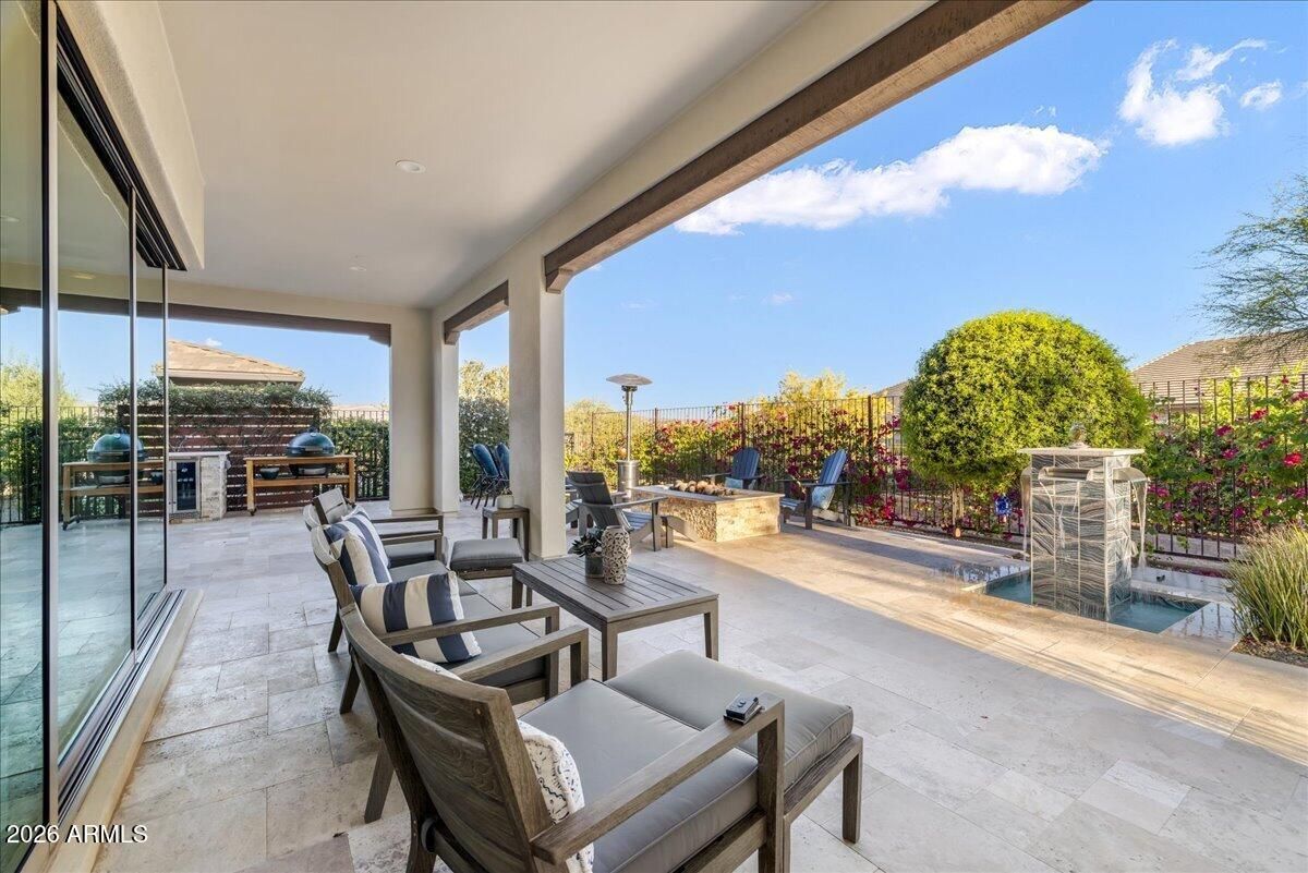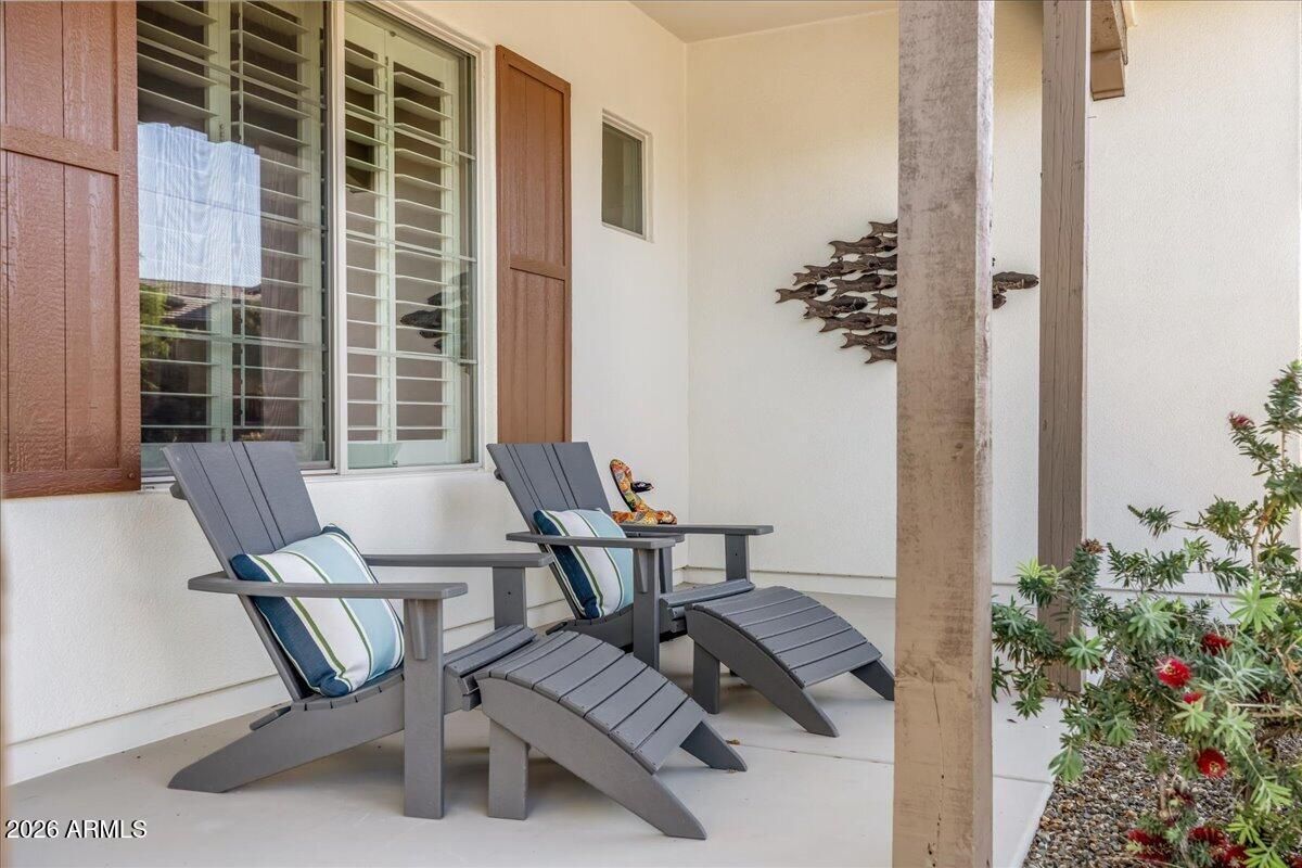 Experience elevated desert living in this beautifully upgraded Alisal model home, offering 2 bedrooms, 2.5 bathrooms, and 2,253 sq ft in the prestigious Trilogy at Verde River Golf & Social Club. Designed for both comfort and style, this residence showcases numerous builder upgrades and thoughtful enhancements throughout. The open-concept layout features tile flooring, 9-foot solid core doors, plantation shutters, and expansive double sliding glass doors with automatic shades that seamlessly connect indoor and outdoor living. The gourmet kitchen is equipped with premium GE Monogram appliances, including an additional wall oven--perfect for entertaining. Step outside to a private backyard retreat with low-maintenance desert landscaping, a covered patio, built-in BBQ, and breathtaking Four Peaks views. The oversized garage boasts an epoxy-coated floor, adding both durability and a polished finish. Additional highlights include a striking 42" x 96" custom iron front door from First Impressions Ironworks (Desert Contemporary design), ceiling fans throughout, climate controled (mini-split heating & cooling) garage space, and a Garia 2+2 luxury golf car included in the sale--well-maintained, low mileage, and a significant value. Located within one of Arizona's most desirable active adult communities, Trilogy at Verde River offers a true resort lifestyle. Residents enjoy access to a vibrant social club featuring a restaurant, coffee bar, market, culinary studio, fitness center, full-service spa, and resort-style pools with a poolside bar and grill. Recreational amenities include golf, tennis, pickleball, bocce, and a full calendar of social events. Ideal as a full-time residence or seasonal retreat, this home also benefits from reliable water service--unaffected by Rio Verde Foothills hauling concerns--and includes potential golf membership incentives. A rare opportunity to own a highly upgraded designer home in a premier community with unmatched amenities and stunning natural surroundings.