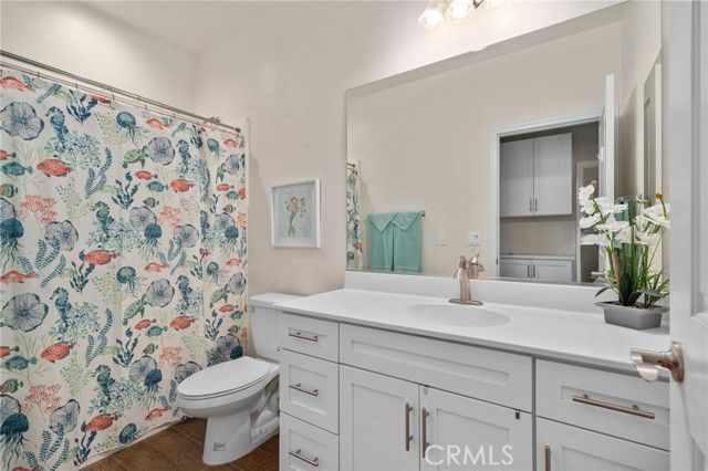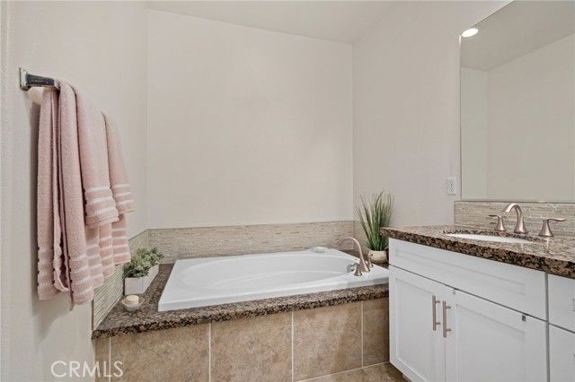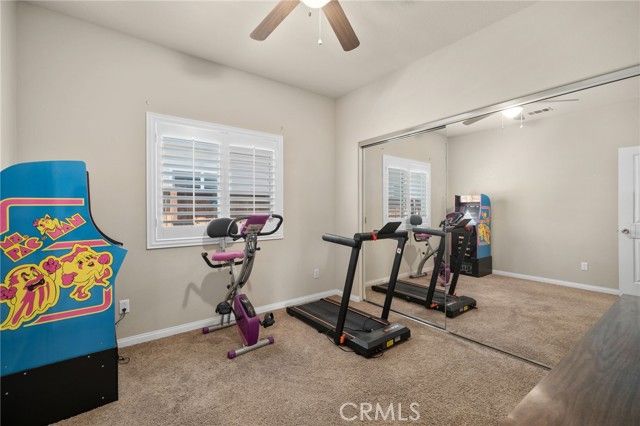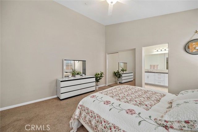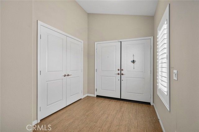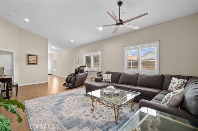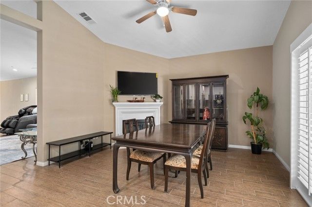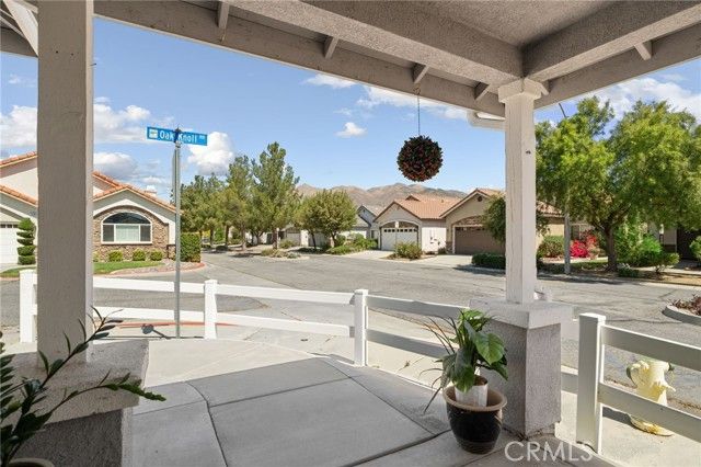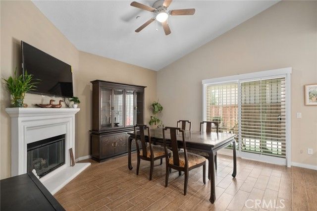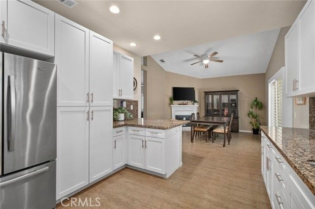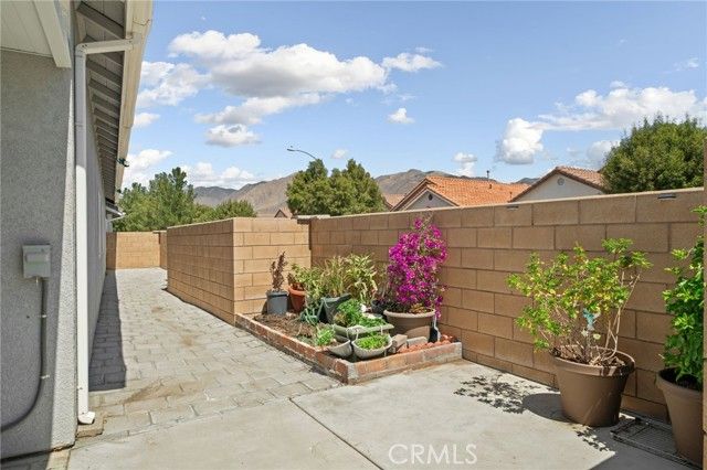Welcome to this charming corner-lot home located in a desirable gated 55+ community in San Jacinto, complete with a private clubhouse and beautifully maintained surroundings. Offering 2 bedrooms, 2 bathrooms, and a spacious 2-car garage, this home combines comfort, functionality, and low-maintenance living. The front exterior is fully concrete for easy upkeep and features a cozy covered porch and inviting double-door entry. Inside, you’ll find a convenient coat closet with double doors, leading into a bright and airy family room complete with a ceiling fan and elegant plantation shutters. Further into the home, a versatile dining area awaits—featuring a ceiling fan and a cozy fireplace—perfect for entertaining or easily used as a second living space. The spacious kitchen boasts granite countertops, a peninsula for additional seating, a full granite backsplash, and newer cabinetry, offering both style and practicality. The primary suite is generously sized and includes plantation shutters, a ceiling fan, mirrored closet doors, and dual closets. The en-suite bathroom features dual sinks with granite counters, a large soaking tub, and a separate walk-in shower. The secondary bedroom is equally inviting with plantation shutters, a ceiling fan, and mirrored closet doors. A second full bathroom and a dedicated laundry closet with built-in cabinetry add to the home’s convenience. Step outside to enjoy a private backyard with a covered patio, full concrete for easy maintenance, and a relaxing spa—perfect for unwinding or hosting guests. This well-maintained home offers the ideal blend of comfort and simplicity in a welcoming 55+ community setting.