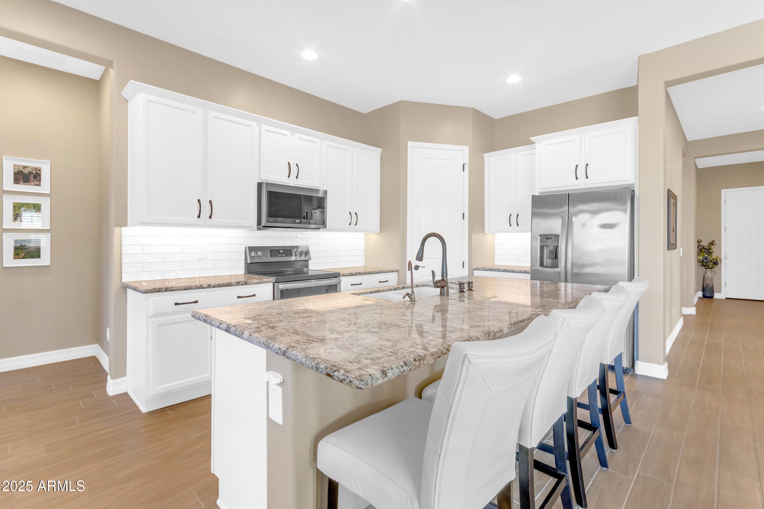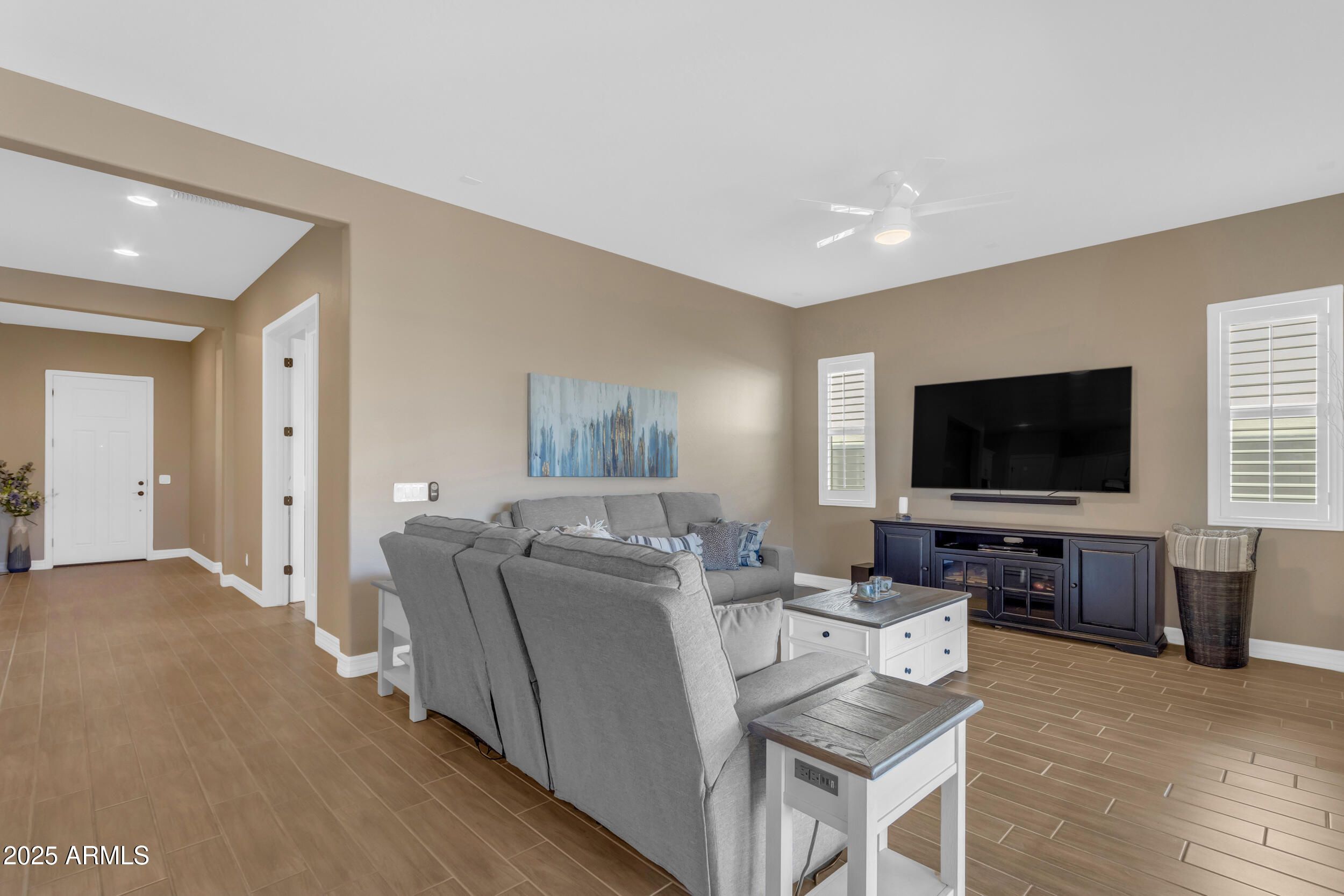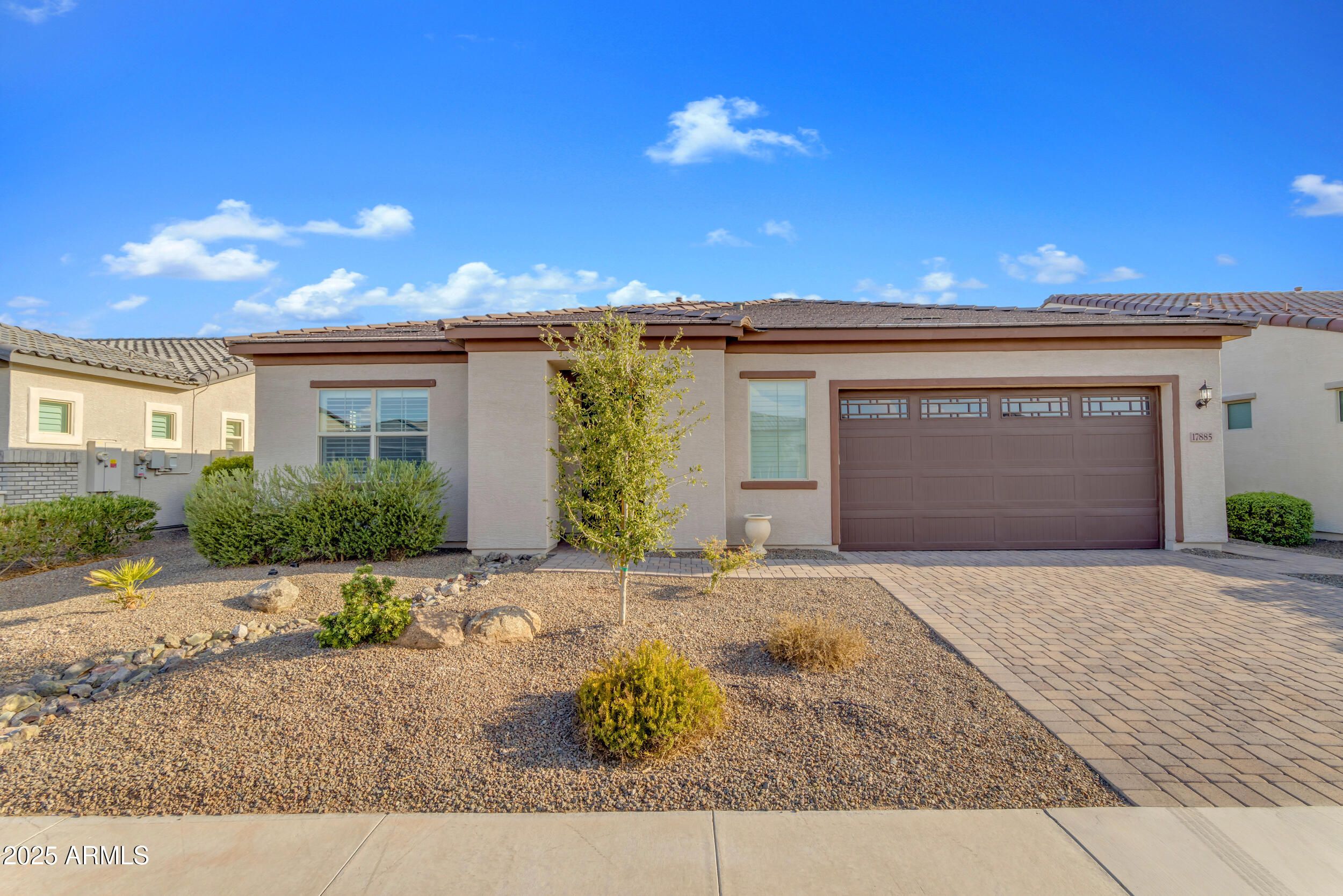 Located in the active adult community of Cantamia at Estrella, this well-kept home offers a smart layout with upgrades where they count. The kitchen features granite countertops, stainless steel appliances, and a large Island and it is all open right into the great room—ideal for everyday living or entertaining. The main areas have durable wood-look tile, with soft carpet in the bedrooms for comfort. The primary suite includes dual sinks, a walk-in shower, and a spacious closet. Out back, you've got an easy-care yard with a covered patio **Living in Cantamia means access to indoor and outdoor pools, pickleball, gym, art rooms, and plenty of activities built into the community lifestyle. The Pride of homeownership shows very well! Turn key opportunity!