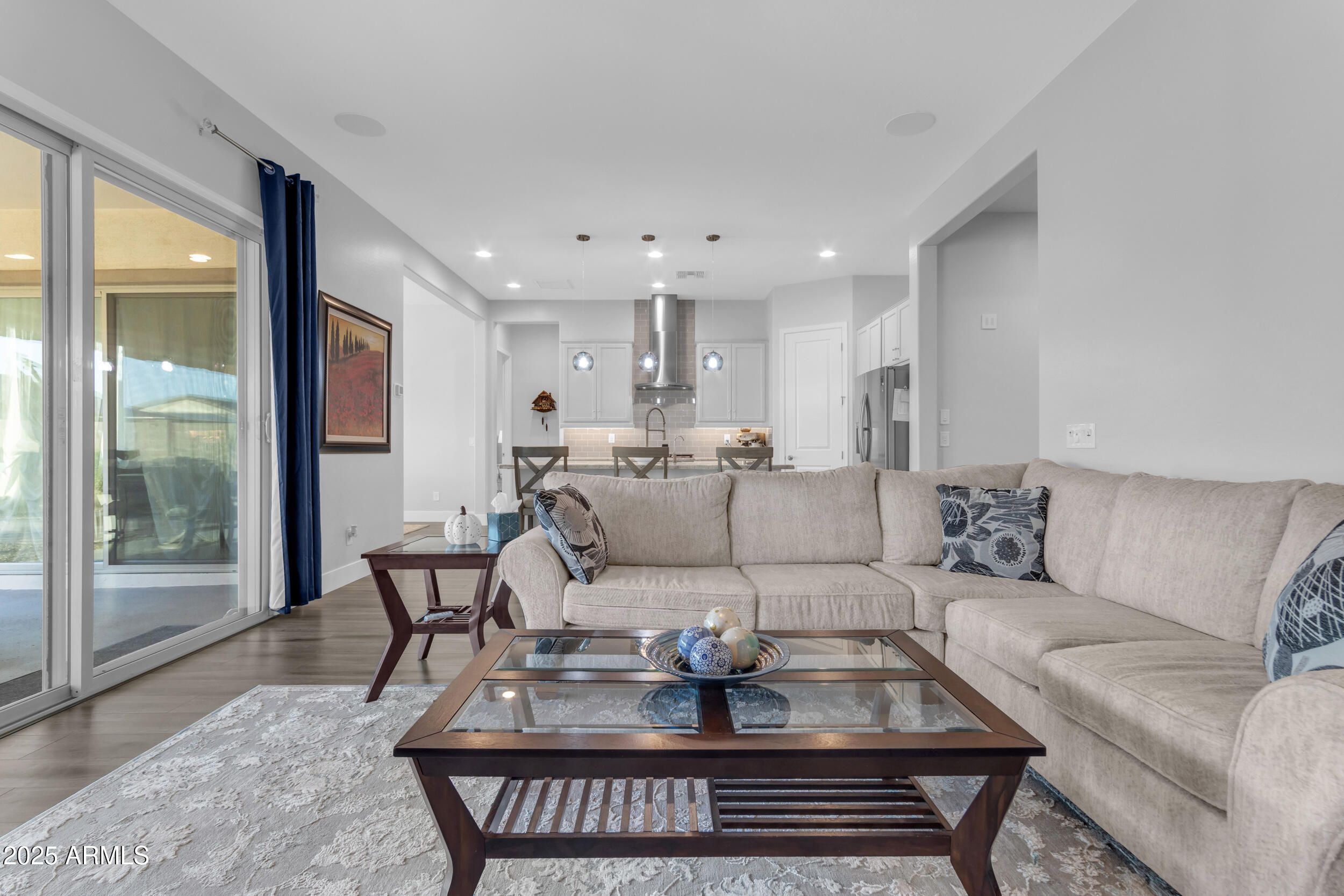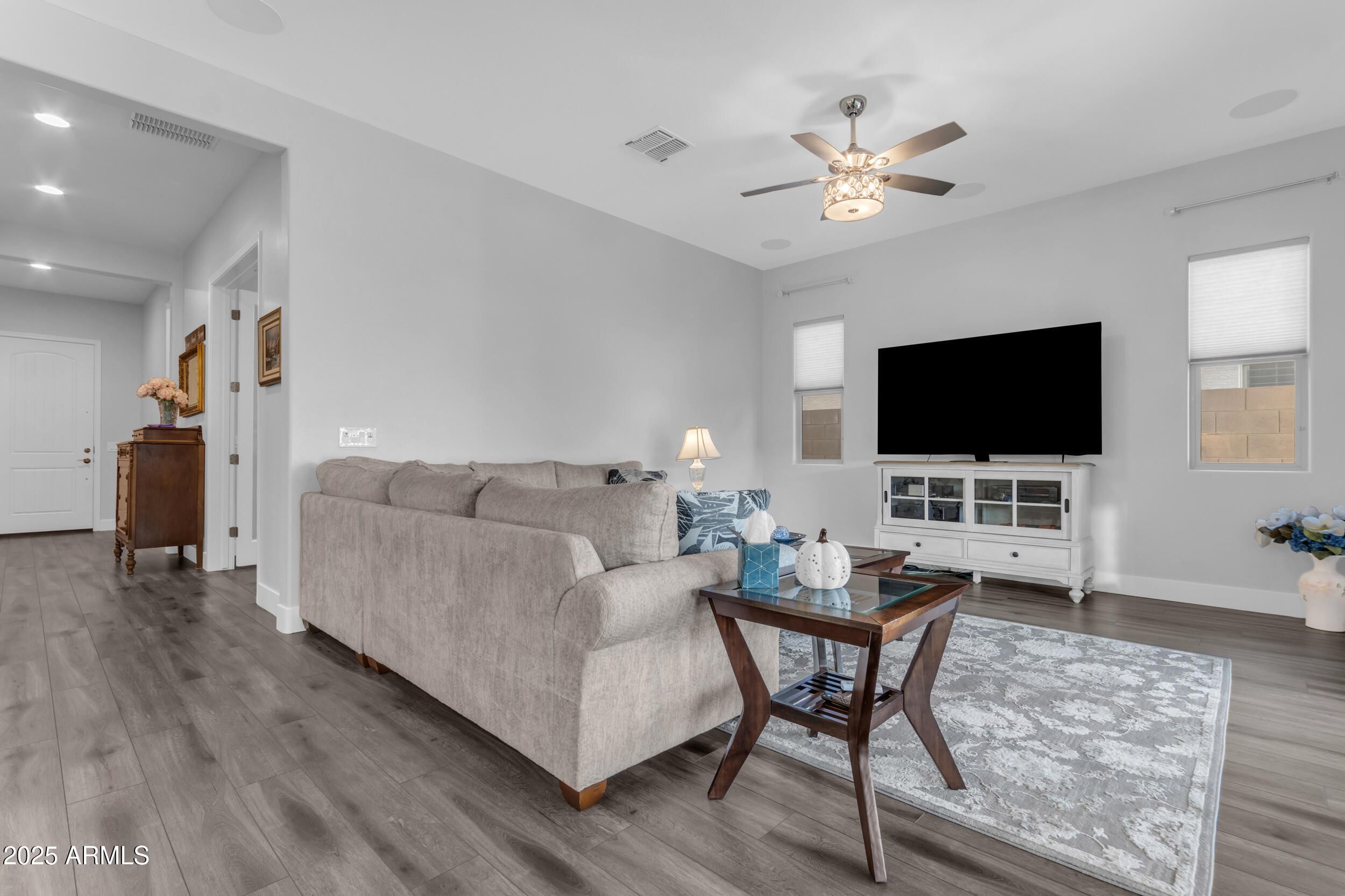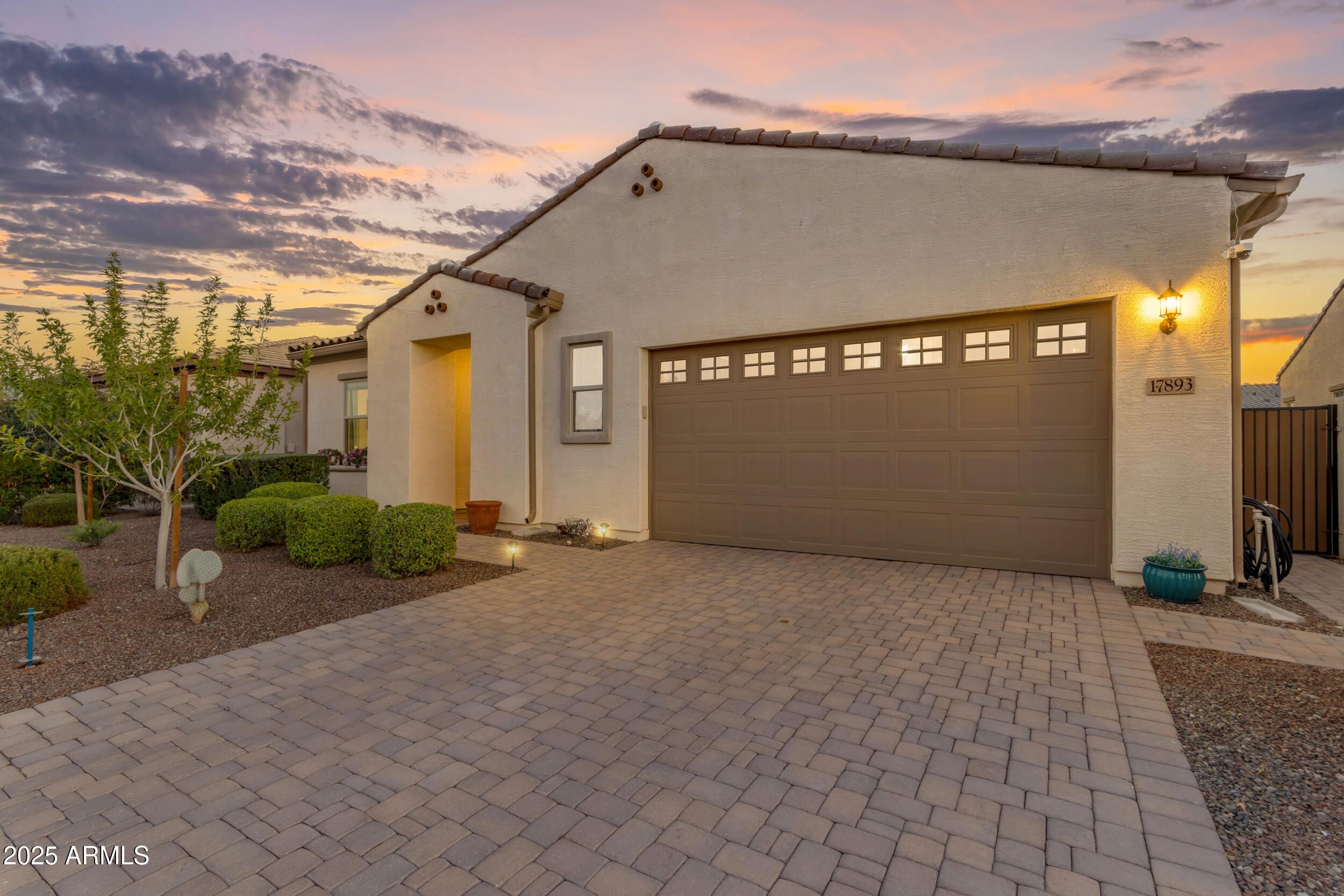 Welcome to this beautifully maintained 2 bed + den, 2 bath home in the sought-after CantaMia 55+ community! This open and inviting floor plan features tall ceilings, wood-look flooring, and a spacious great room perfect for relaxing or entertaining. The upgraded kitchen includes quartz counters, subway tile backsplash, stainless appliances, pendant lighting, and a large island. The split layout provides privacy, with a serene primary suite offering dual sinks, a walk-in shower, and a generous closet. The backyard is a peaceful retreat with covered patio, lush green turf and low maintenance plants. Immaculate curb appeal, paver driveway, and true pride of ownership throughout! TILE throughout- NO Carpet! Upgraded fixtures, hardware, 6' baseboards, and epoxy flooring in Garage shows THE - Pride of homeownership! Den / Craft Room has built in's from California closet professionally designed. Useful Cabinets in Utility Room w/ additional sink is perfect for Dog bathing. Home has h20 softener & Reverse osmosis upgrade. Security camera can also convey with the sale of the home. Truly a one f a kind- see it for yourself today. compare VS new construction & Save $$$!!! Garage has a GOLF CART Garage space. LOW maintenance landscaping was designed for the lock and leave concept part time residence. Cantamia is a Gated community resort style living with amenities galore such as: bocce, pickleball, community center with inside pools outside pools, gym, yoga room, and much much more. Tons of clubs and inclusive activities for sociability. *** ATTN VA ASSUMABLE 2.75% RATE***