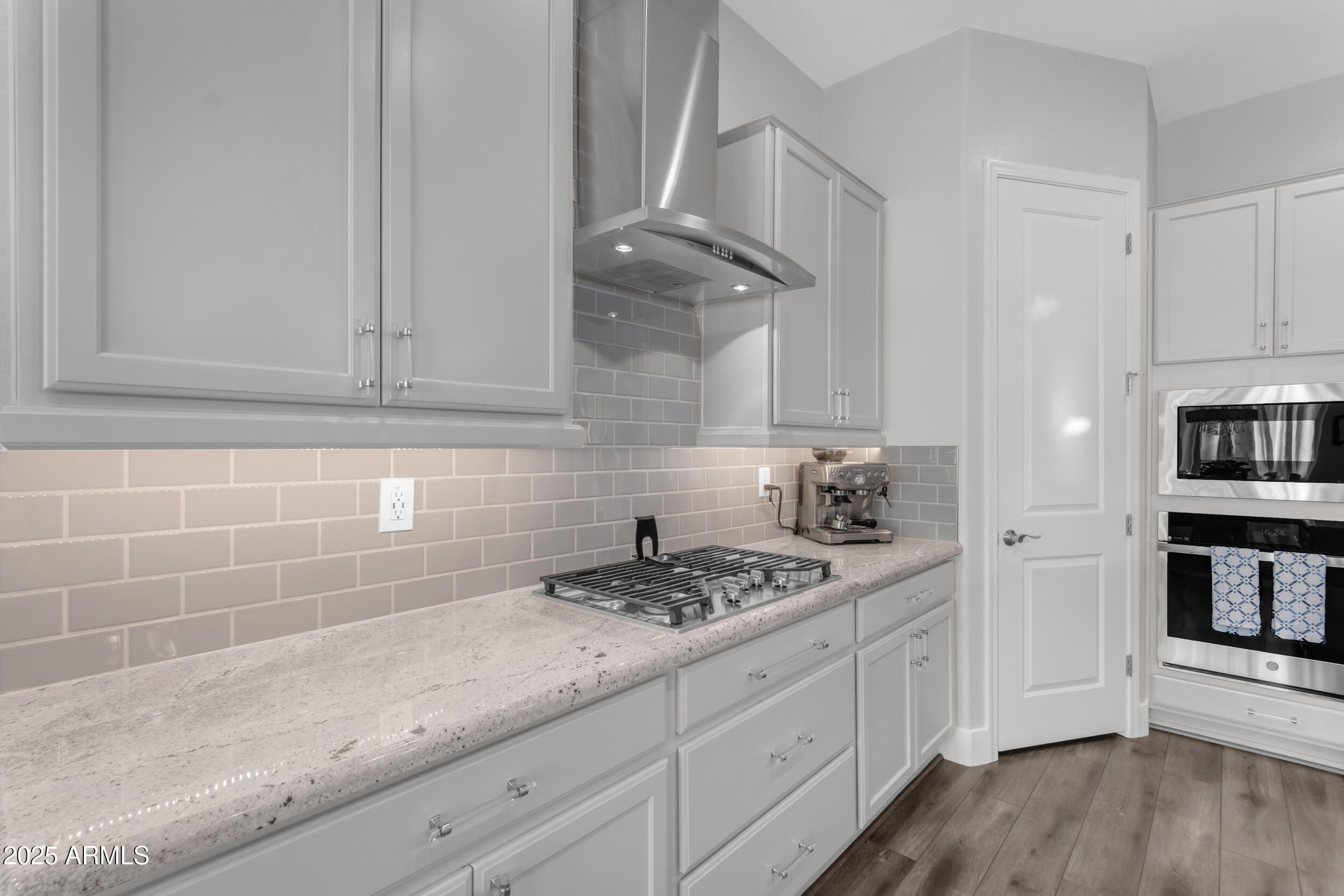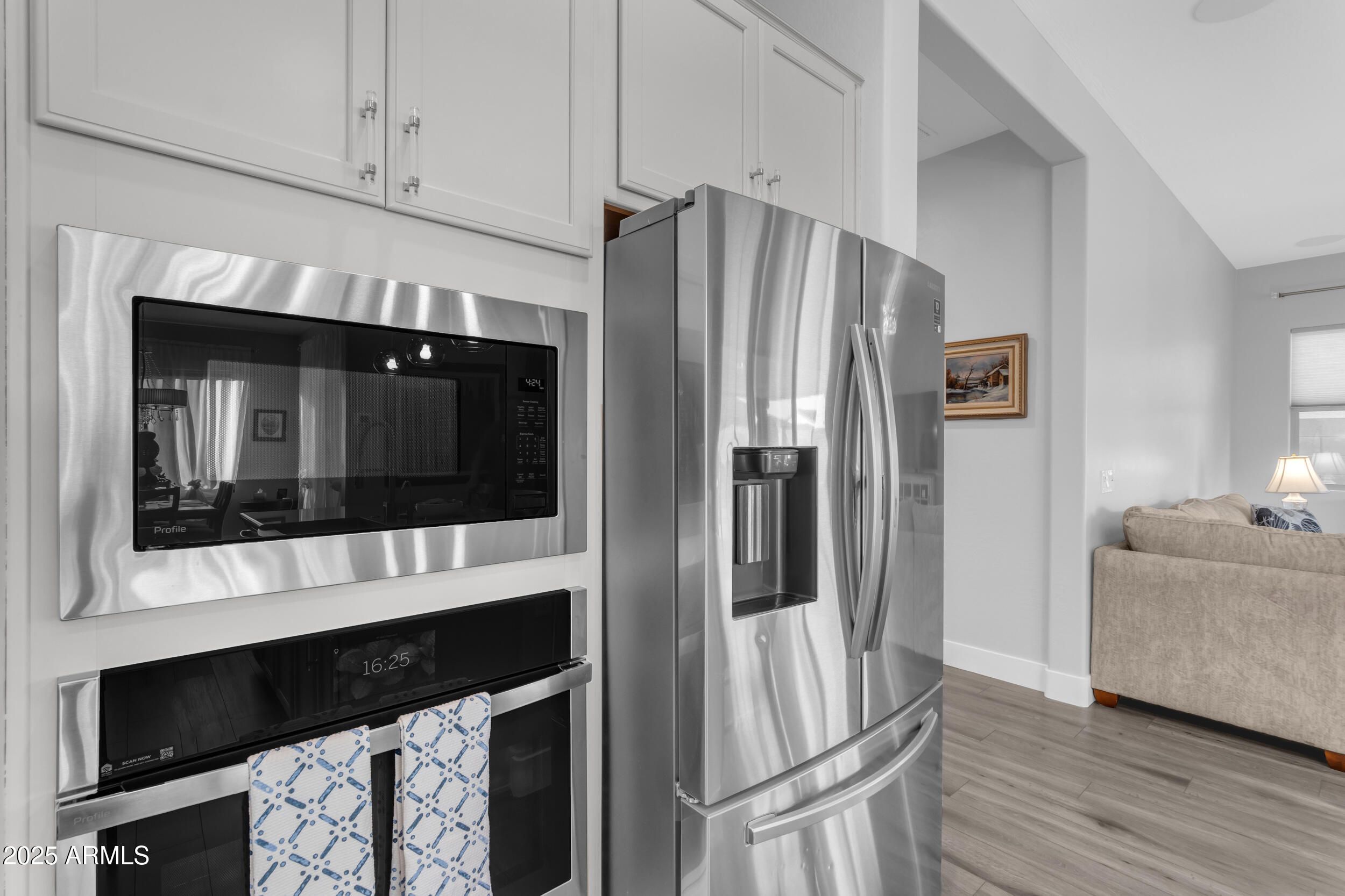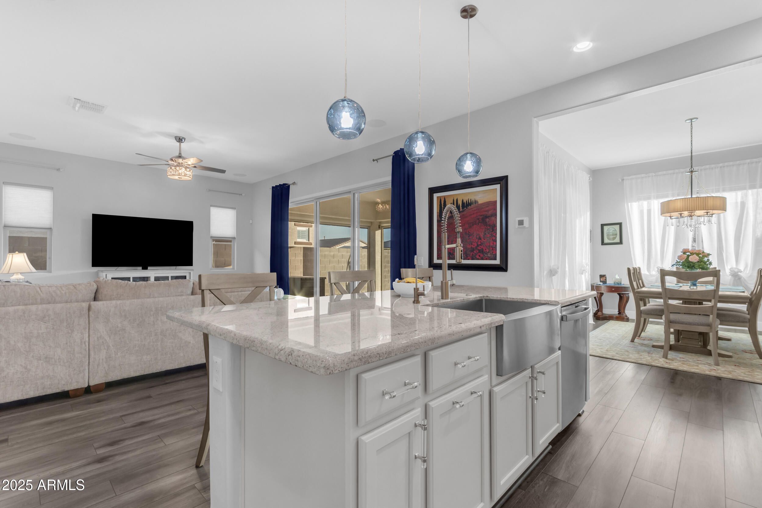 Welcome to this beautifully maintained 2 bed + den, 2 bath home in the sought-after CantaMia 55+ community! This open and inviting floor plan features tall ceilings, wood-look flooring, and a spacious great room perfect for relaxing or entertaining. The upgraded kitchen includes quartz counters, subway tile backsplash, stainless appliances, pendant lighting, and a large island. The split layout provides privacy, with a serene primary suite offering dual sinks, a walk-in shower, and a generous closet. The backyard is a peaceful retreat with covered patio, lush green turf and low maintenance plants. Immaculate curb appeal, paver driveway, and true pride of ownership throughout! TILE throughout- NO Carpet! Upgraded fixtures, hardware, 6' baseboards, and epoxy flooring in Garage shows THE - Pride of homeownership! Den / Craft Room has built in's from California closet professionally designed. Useful Cabinets in Utility Room w/ additional sink is perfect for Dog bathing. Home has h20 softener & Reverse osmosis upgrade. Security camera can also convey with the sale of the home. Truly a one f a kind- see it for yourself today. compare VS new construction & Save $$$!!! Garage has a GOLF CART Garage space. LOW maintenance landscaping was designed for the lock and leave concept part time residence. Cantamia is a Gated community resort style living with amenities galore such as: bocce, pickleball, community center with inside pools outside pools, gym, yoga room, and much much more. Tons of clubs and inclusive activities for sociability. *** ATTN VA ASSUMABLE 2.75% RATE***