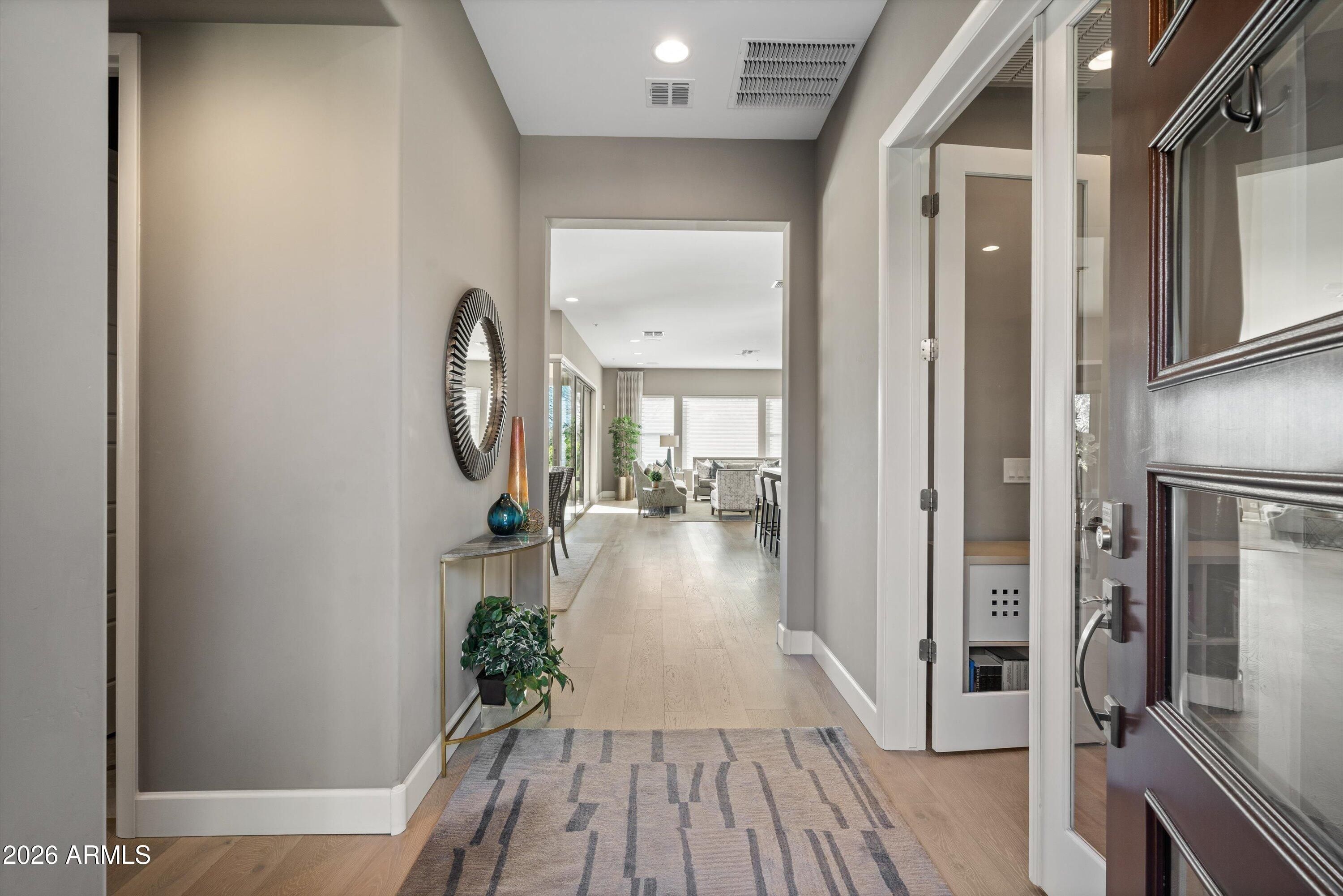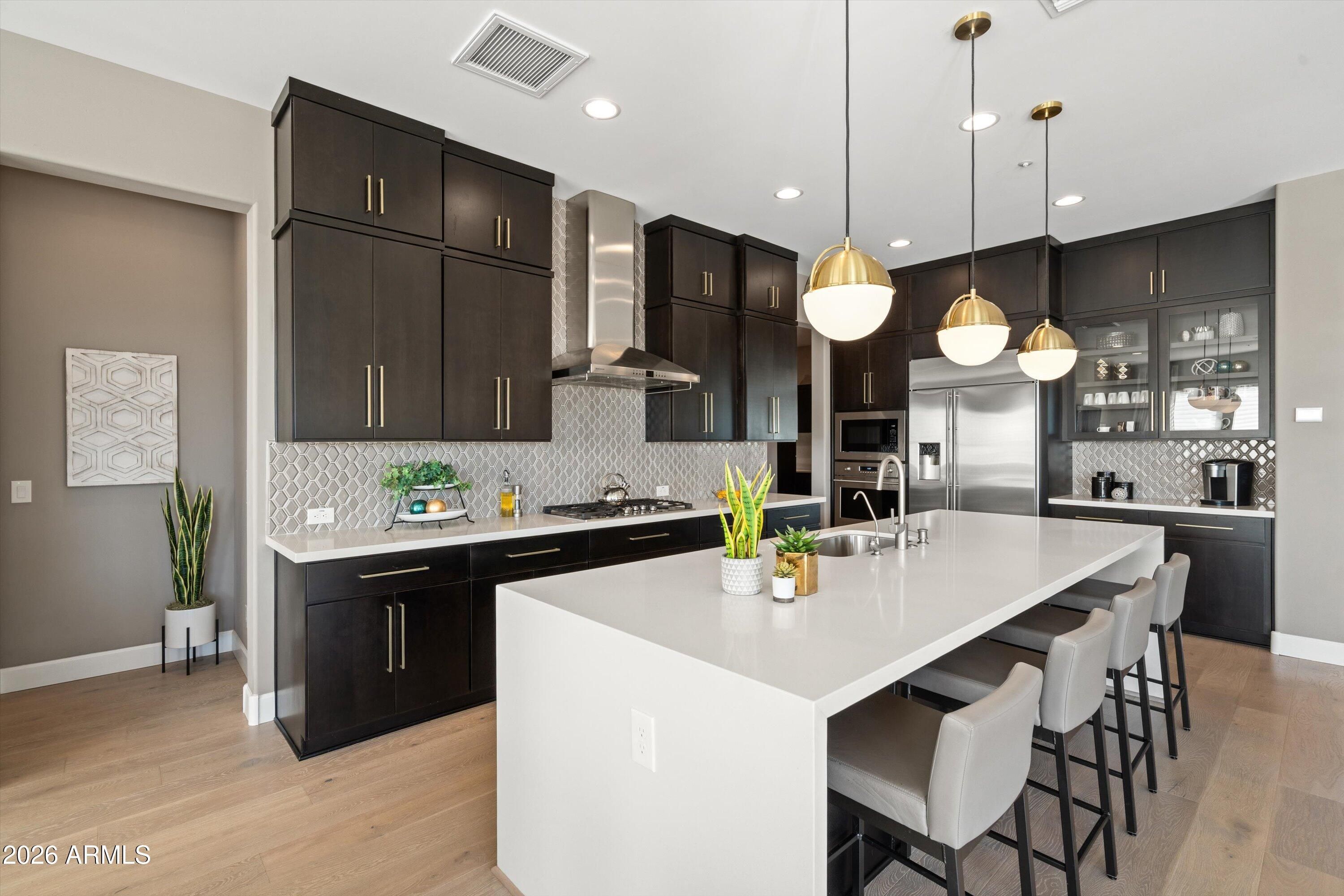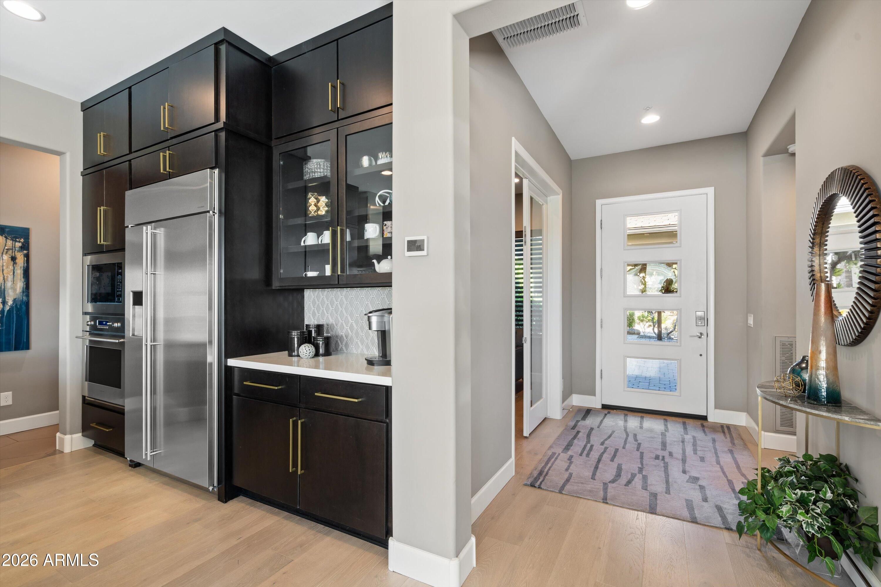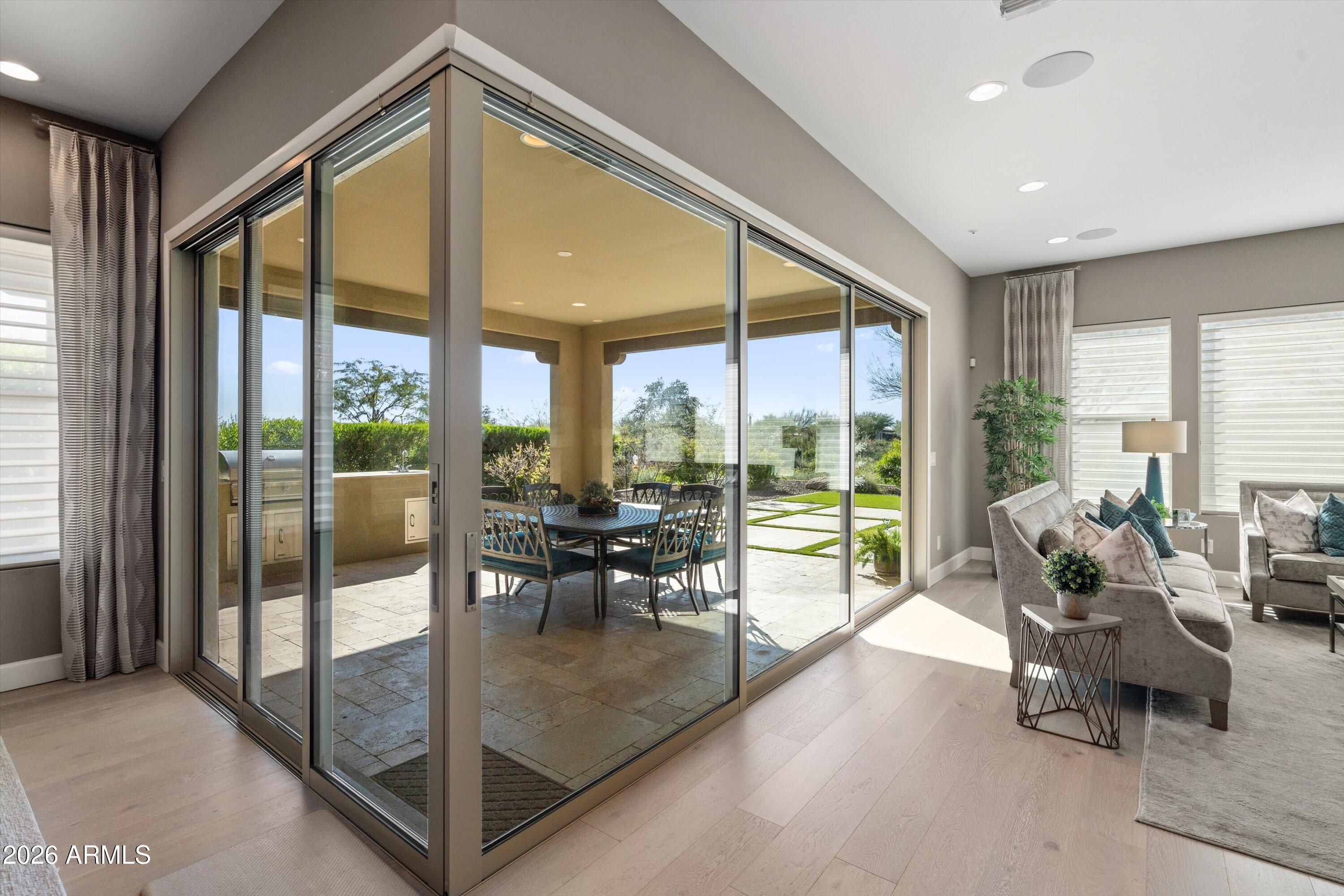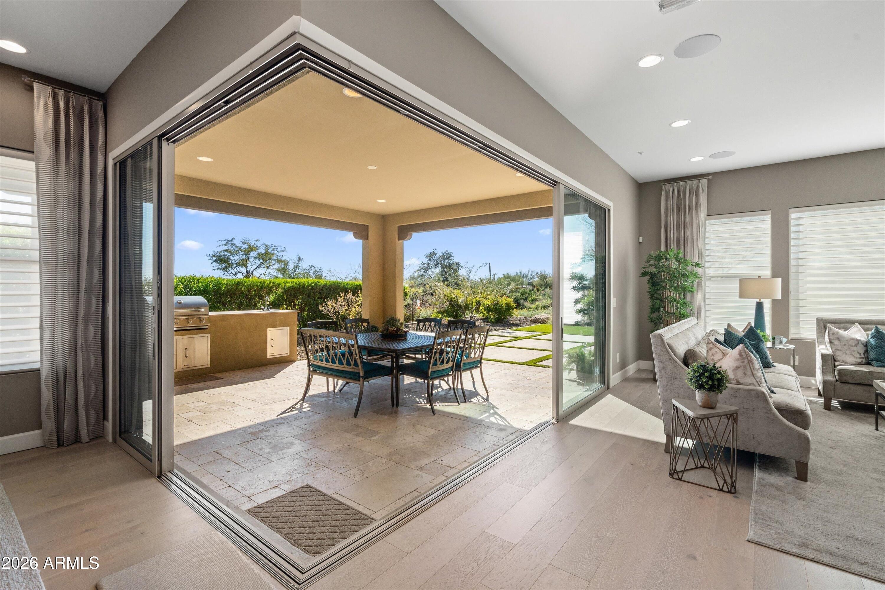 Four Peaks views set the backdrop for this contemporary Latigo floor plan in the Trilogy Golf Resort. Thoughtfully upgraded and impeccably maintained, this home offers a refined, turnkey living experience with seamless indoor-outdoor flow. The primary suite features two custom walk-in closets and a spa-inspired bath with soaking tub, upgraded fixtures, and an oversized glass-enclosed shower. A guest ensuite bedroom, private ensuite casita with cabinetry, and a dedicated office or study provide exceptional flexibility and privacy. The chef's kitchen is both functional and elegant, showcasing a gourmet Monogram appliance package, quartz countertops, a striking waterfall island, custom tile backsplash, cabinetry to the ceiling, under-cabinet lighting, reverse osmosis system, and generous storage. Whitewashed oak wood flooring, upgraded 8' interior doors, 5" baseboards, two-tone paint, and custom window treatments elevate the home's sophisticated aesthetic. A sliding glass window wall opens to the covered patio, complete with a custom outdoor gas BBQ, perfectly positioned to overlook the Tonto National Forest. Professionally designed landscaping includes courtyard pavers, gas fire pit, stone tile insets, artificial turf, and integrated landscape lighting. Additional highlights include surround sound, central vacuum, wired security with camera pre-wire, upgraded SEER-rated HVAC, and a 3-car tandem garage with EV pre-wire, decorative garage door with windows, side entry door, and a 750-gallon propane tank delivering both luxury and long-term efficiency.