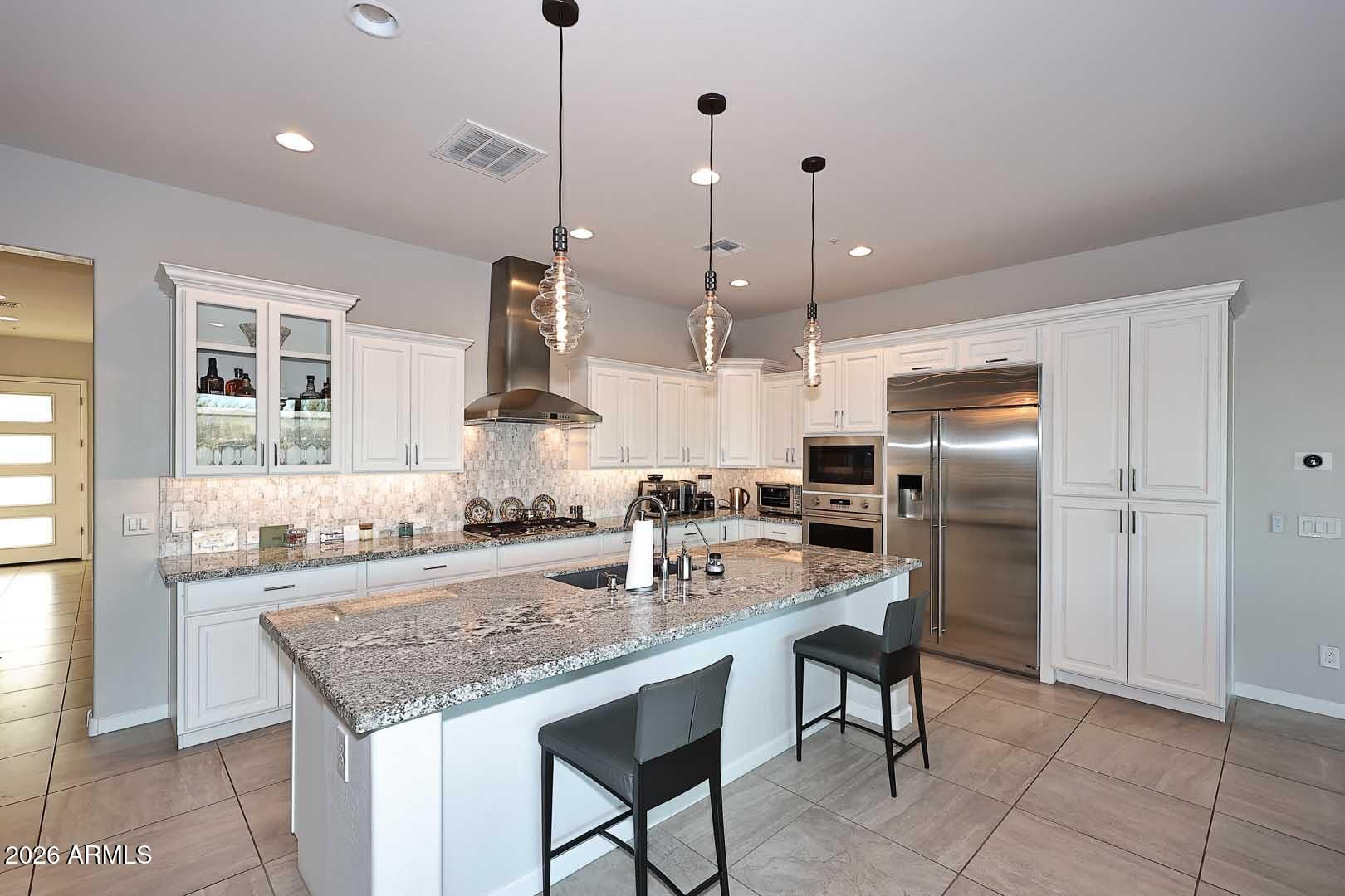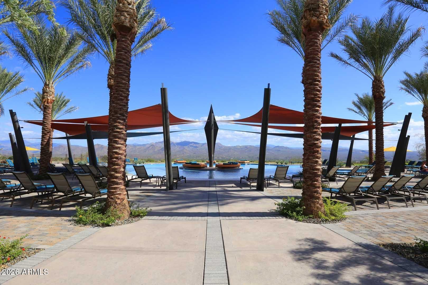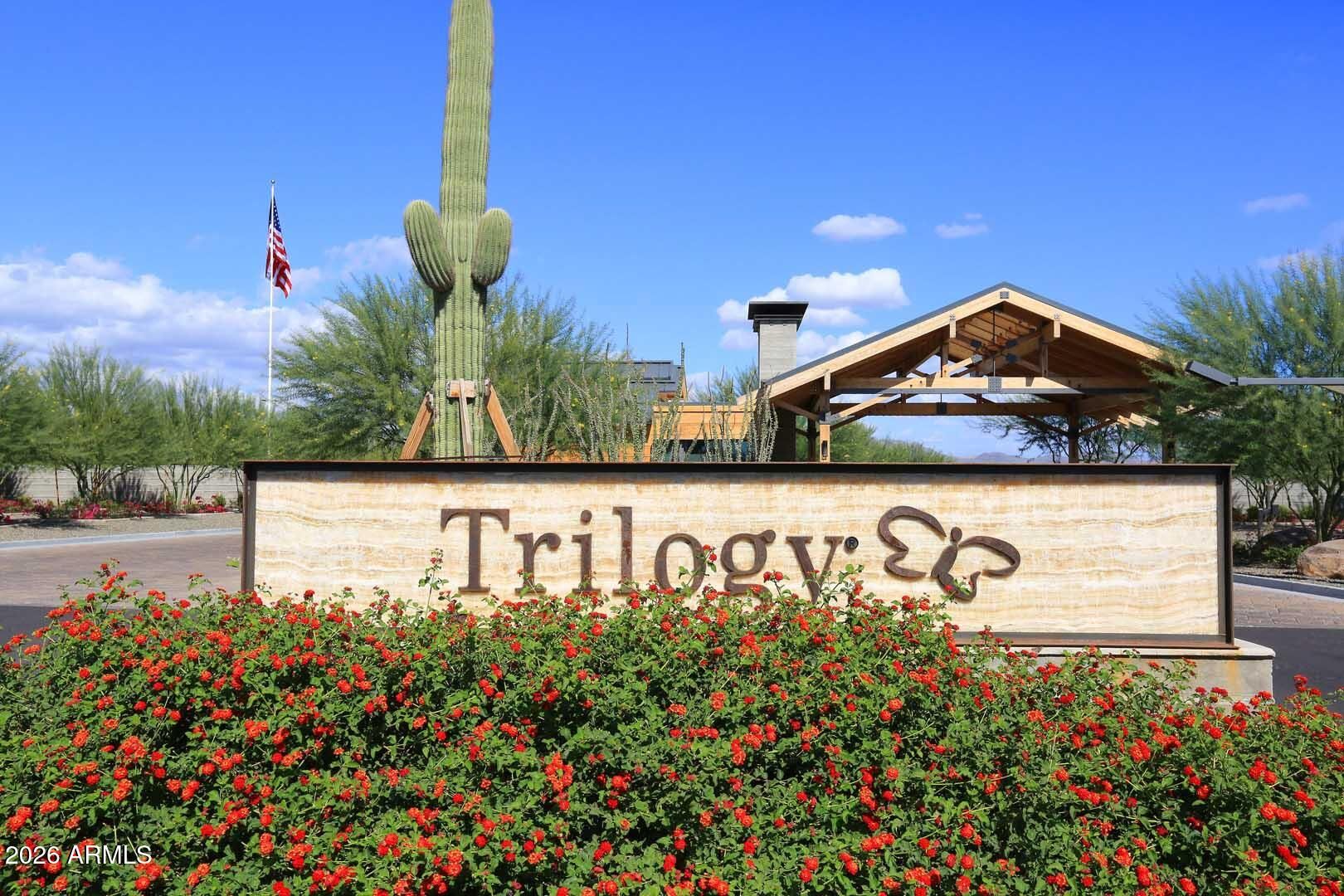 Upon entering this single-level home, located in the upscale Trilogy community, you are immediately drawn to its exceptional curb appeal, highlighted by elegant stonework across the front of the property and a welcoming entryway. This thoughtfully designed residence offers two bedrooms plus a den, providing flexible space for work, hobbies, or guests. Inside, the open-concept kitchen, living, and dining area immediately captures your attention with stunning mountain views. Expansive sliding glass doors create a seamless indoor-outdoor connection, opening to a true resort-style backyard ideal for entertaining or relaxing. The kitchen is beautifully appointed with granite countertops, stainless steel appliances, and a designer backsplash that cohesively ties the the space together. Every detail reflects professional design and quality finishes throughout the home. The spacious primary bedroom offers a peaceful retreat, complemented by a gorgeous primary bath featuring a walk-in shower and upscale finishes. Step outside to the covered back patio with elegant stone flooring, where breathtaking mountain views create the perfect backdrop for Arizona living. The outdoor space is complete with a built-in barbecue pit and a built-in fire pit, offering an ideal setting for year-round gatherings. Additionally, the garage features epoxy-coated floors and custom built-in cabinetry, providing ample storage and a clean, finished space for both vehicles and organization.