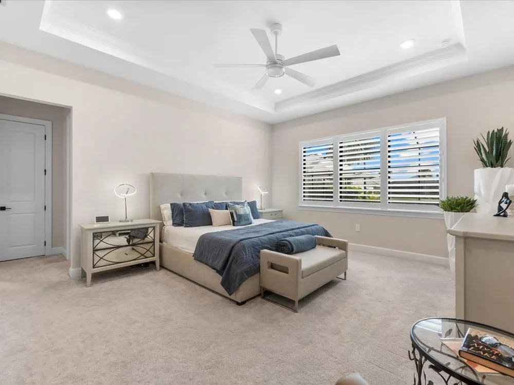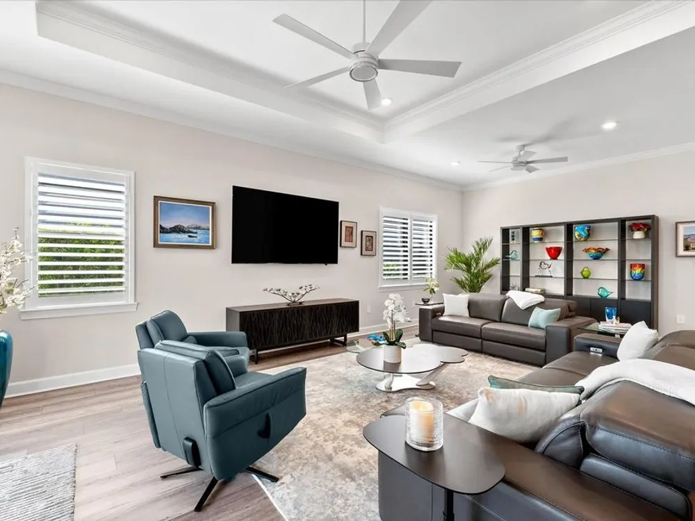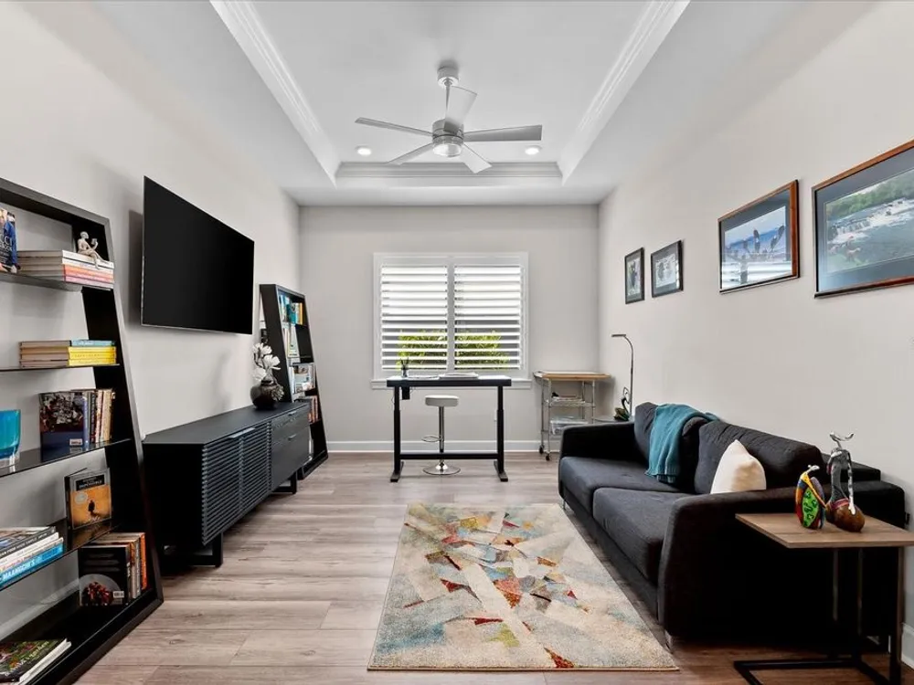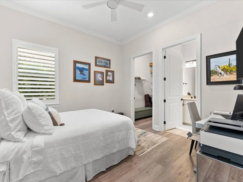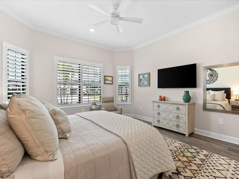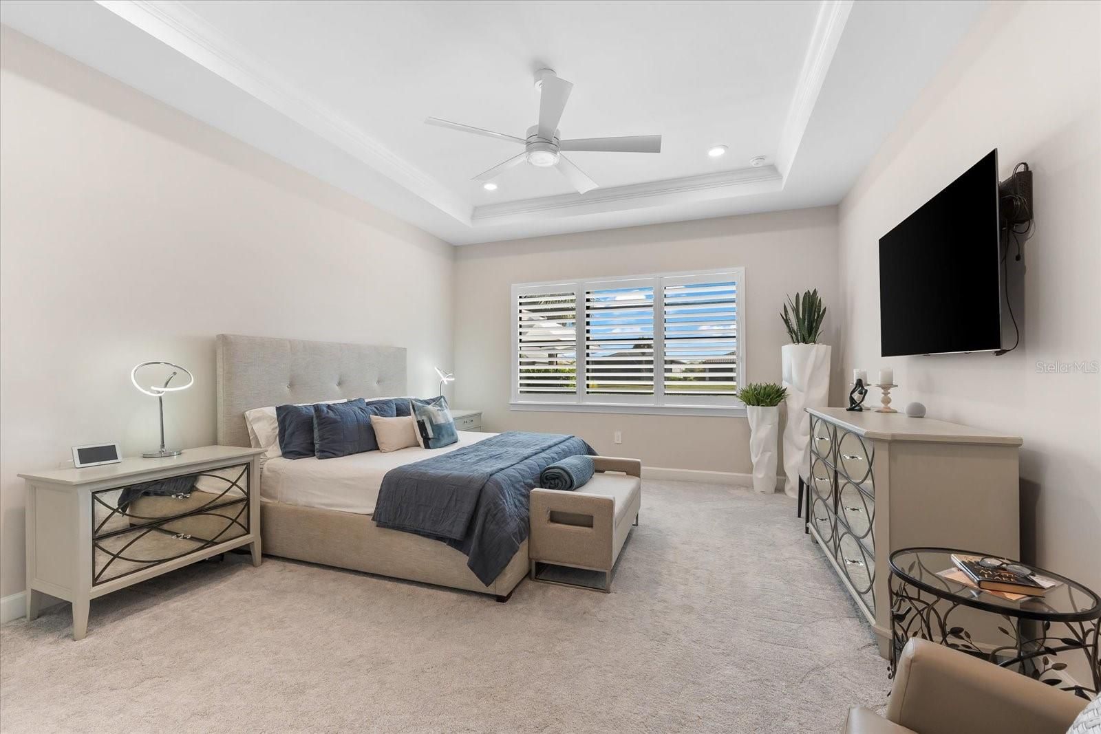 - Ceiling Fan(s), Crown Molding, Eat-in Kitchen, High Ceilings, Open Floorplan, Main Level Primary, Smart Home, Solid-Wood Cabinets, Split Bedrooms, Stone Counters, Thermostat, Tray Ceiling(s), Walk-In Closet(s), Window Treatments