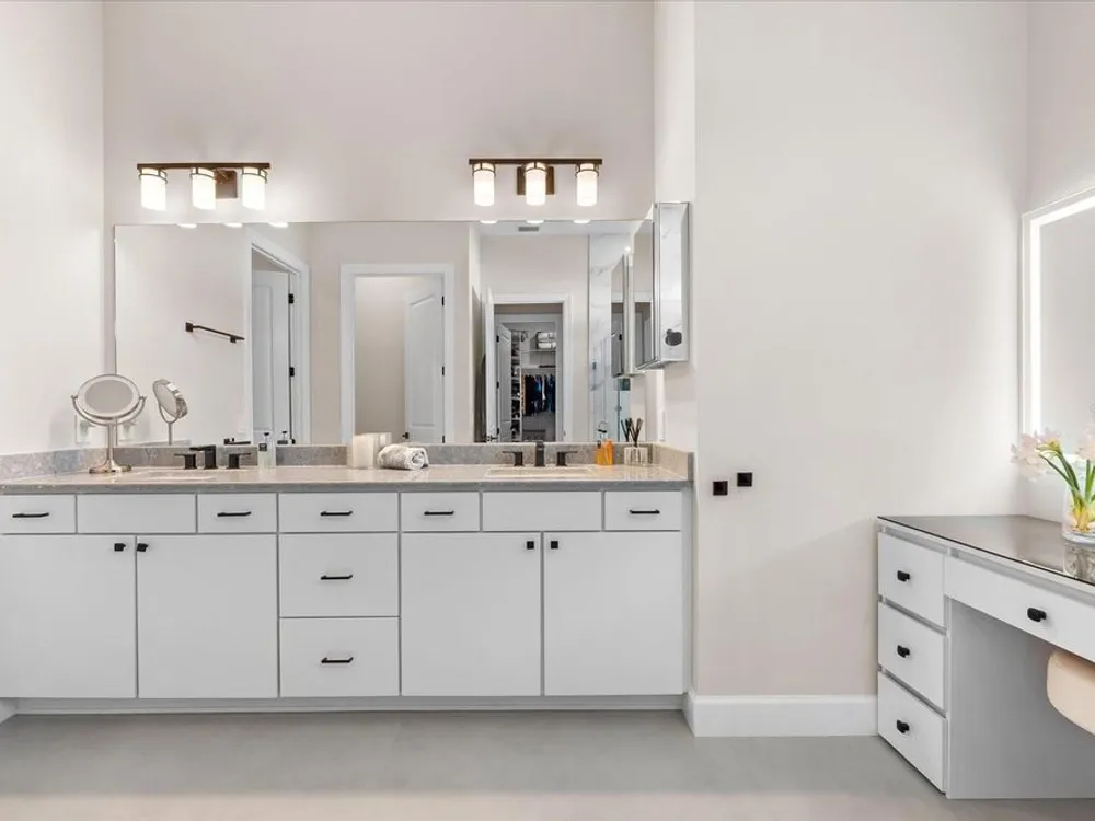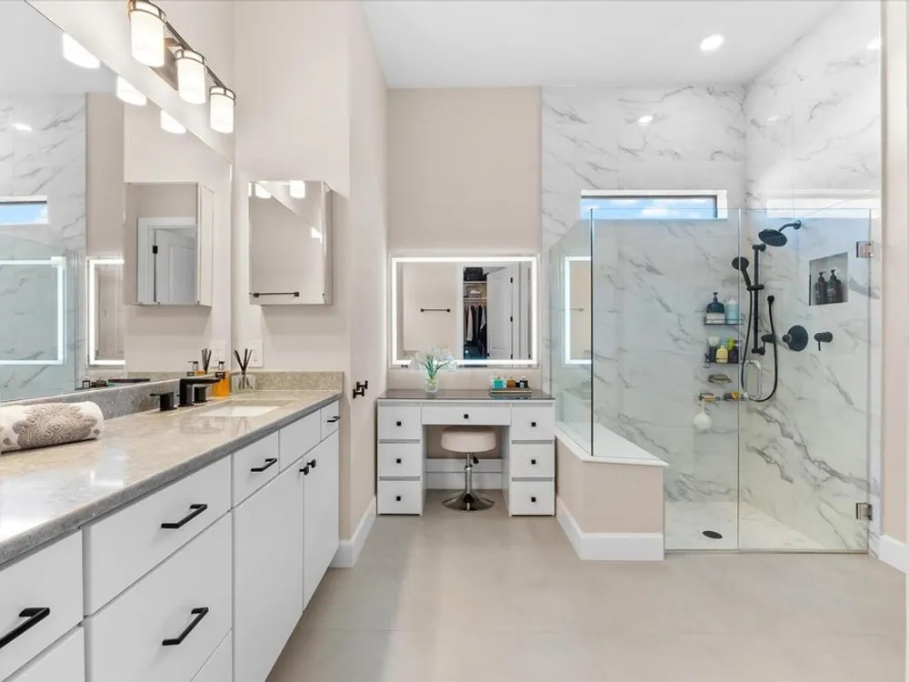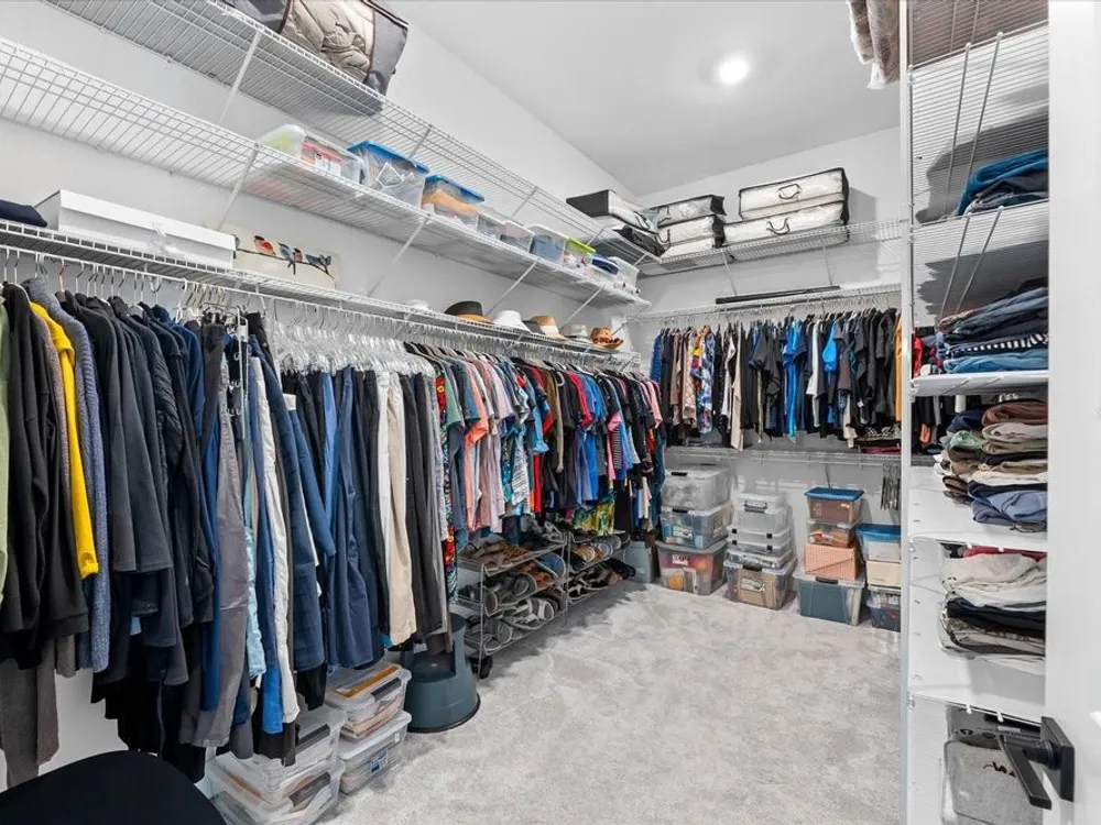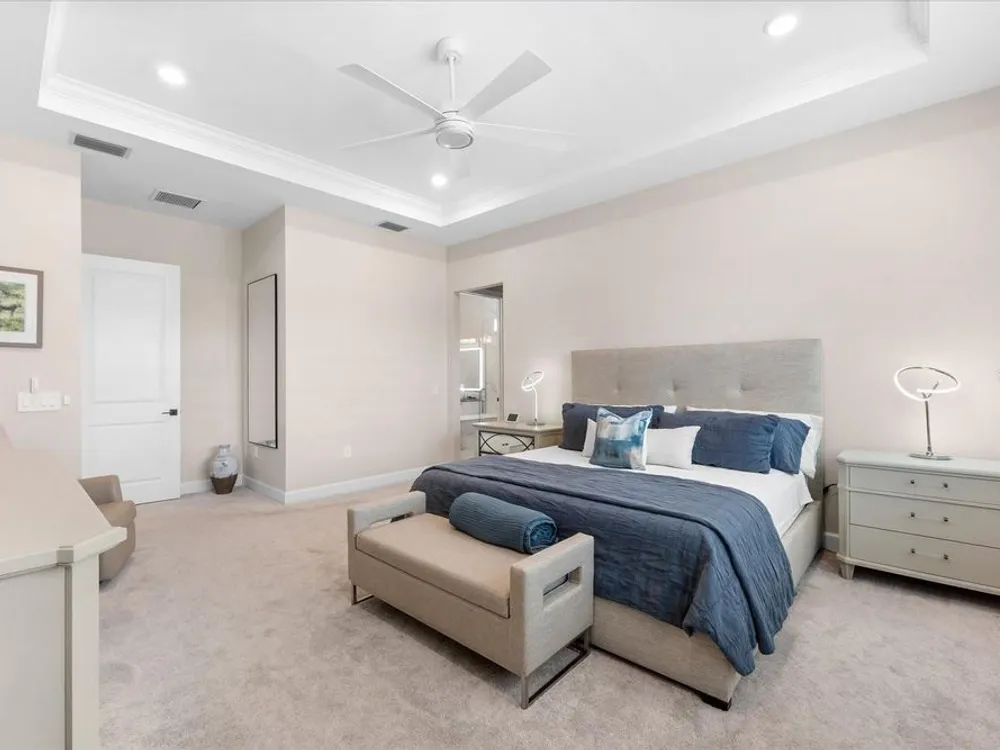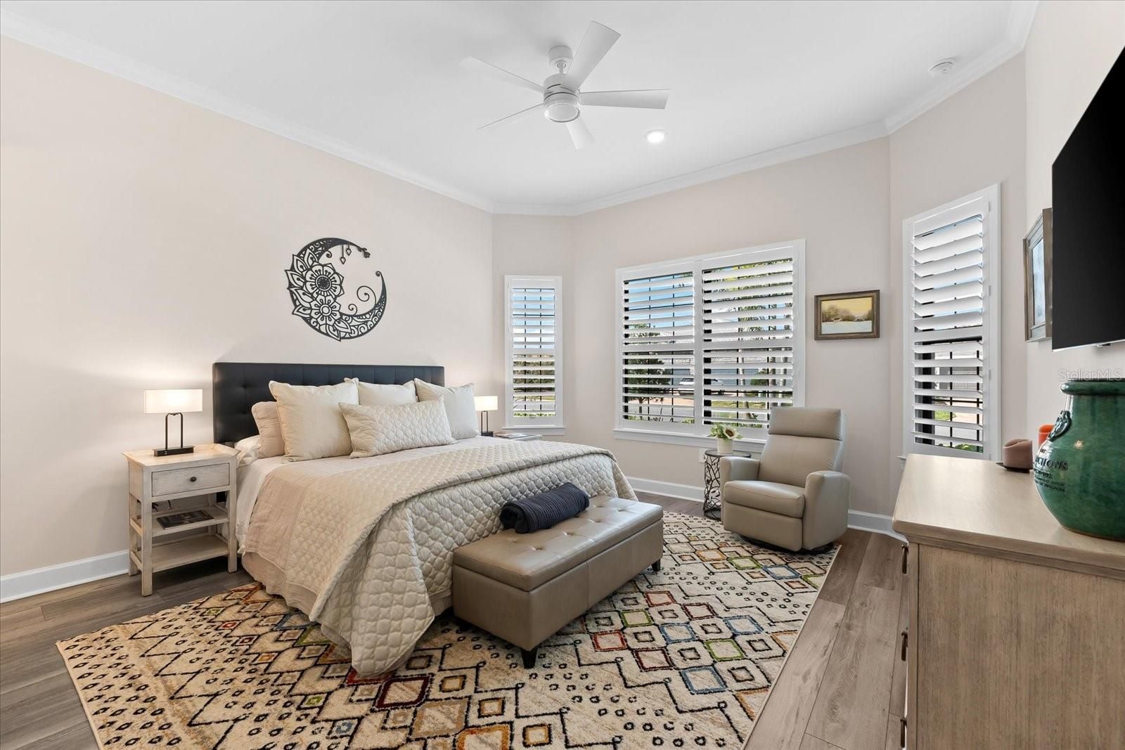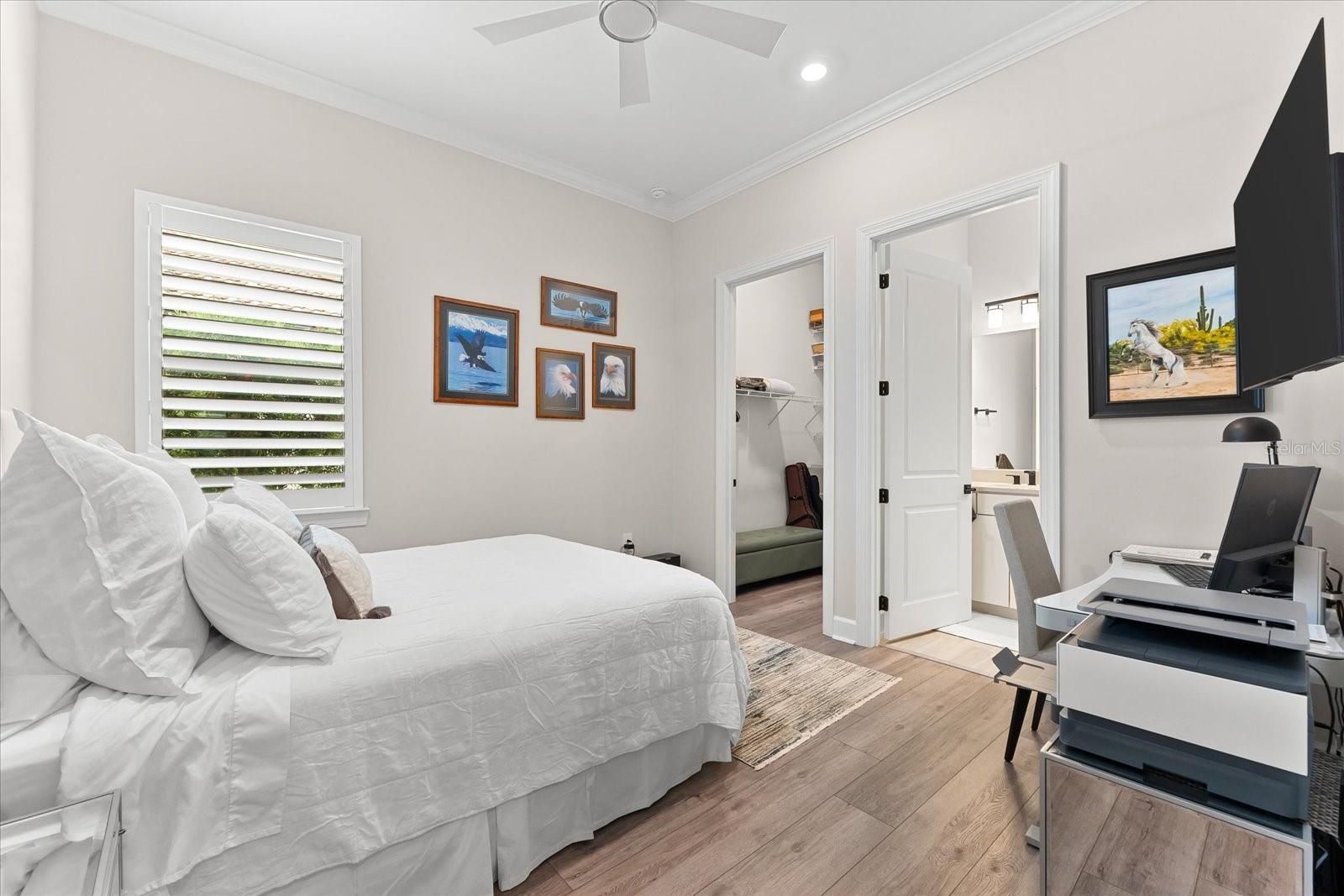 - Ceiling Fan(s), Crown Molding, Eat-in Kitchen, High Ceilings, Open Floorplan, Main Level Primary, Smart Home, Solid-Wood Cabinets, Split Bedrooms, Stone Counters, Thermostat, Tray Ceiling(s), Walk-In Closet(s), Window Treatments