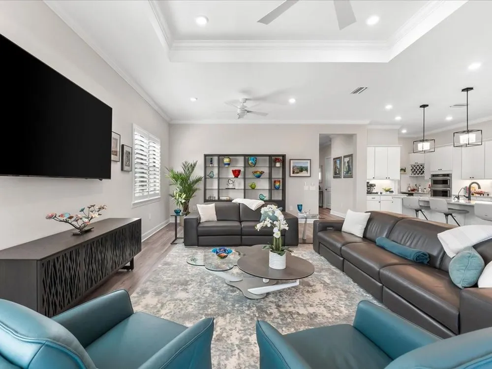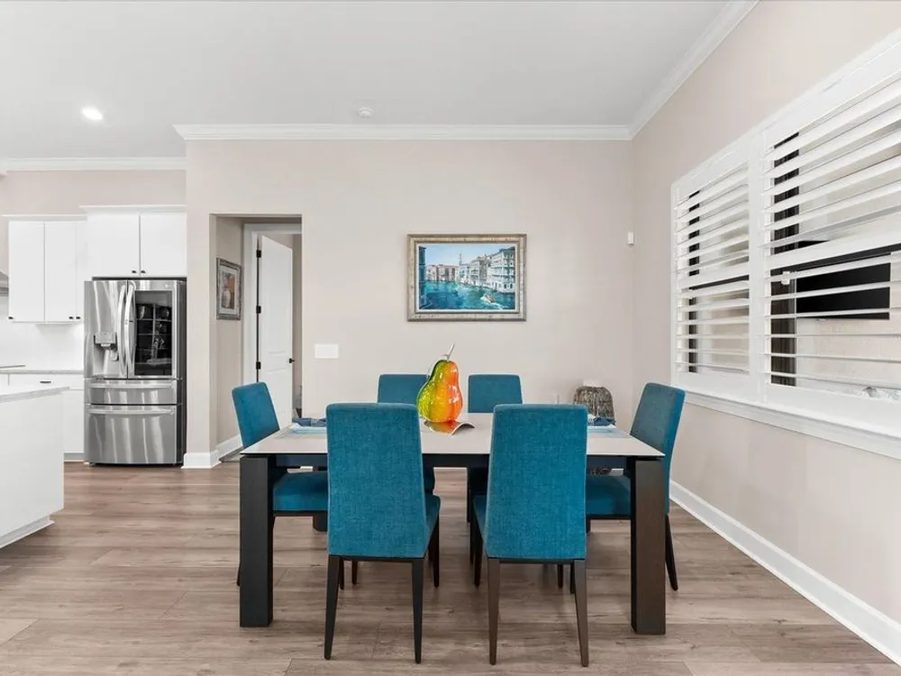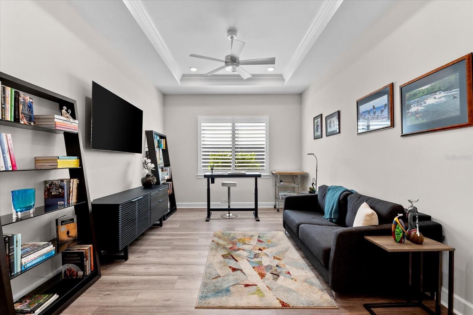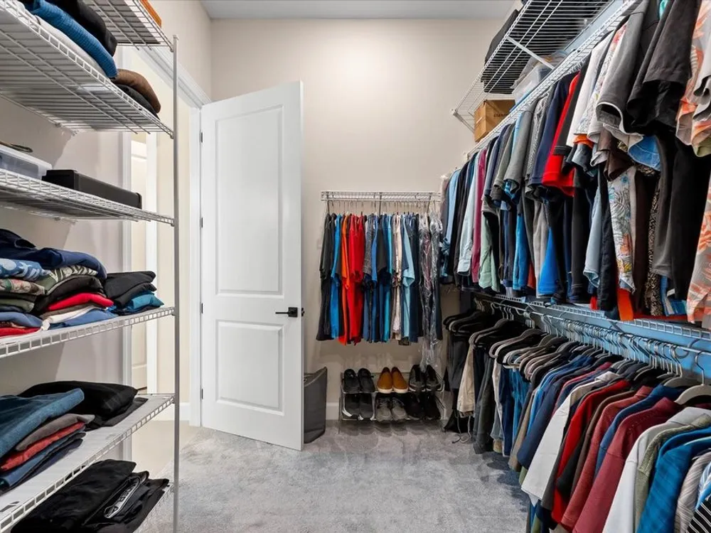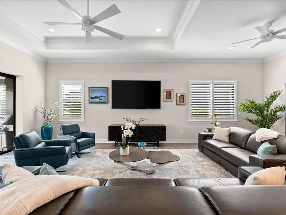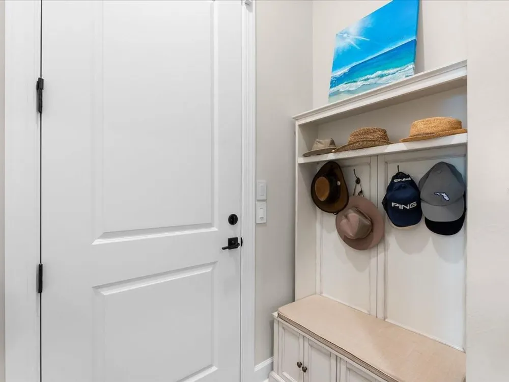 - Ceiling Fan(s), Crown Molding, Eat-in Kitchen, High Ceilings, Open Floorplan, Main Level Primary, Smart Home, Solid-Wood Cabinets, Split Bedrooms, Stone Counters, Thermostat, Tray Ceiling(s), Walk-In Closet(s), Window Treatments