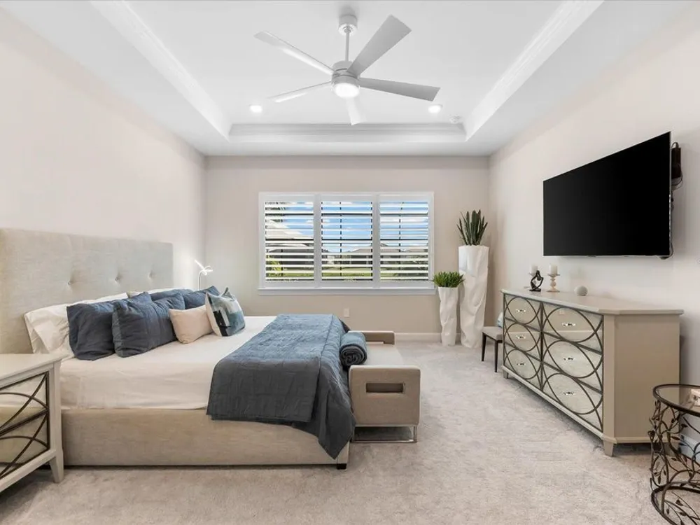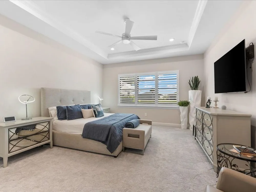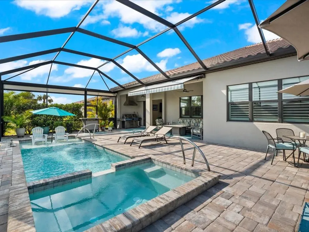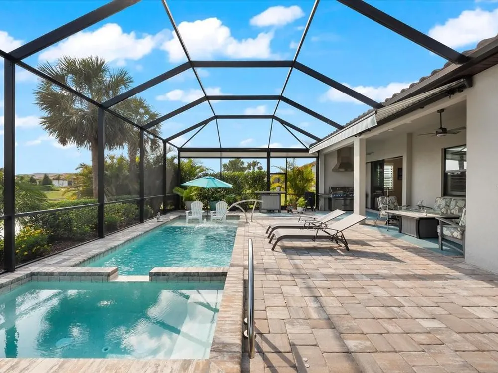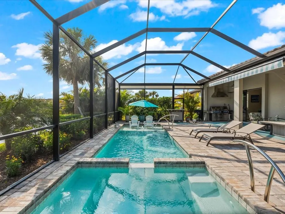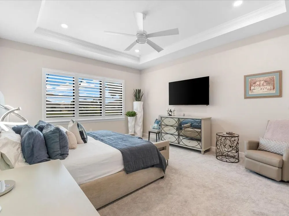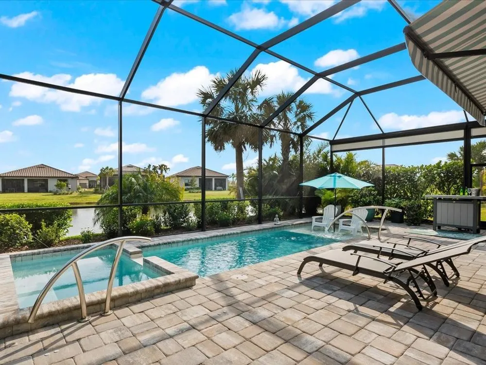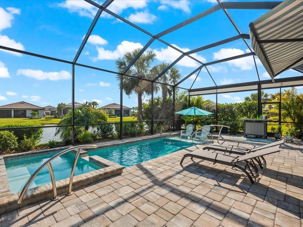 WHOLE HOUSE GENERATOR* IMPACT DOORS AND WINDOWS* PRICED TO SELL*Modern Comfort Meets Resort-Style Living in Del Webb Lakewood Ranch. Welcome to easy, elegant living in the heart of Del Webb Lakewood Ranch—one of the area's most desirable 55+ communities. Set on a premium south-facing waterfront lot, this beautifully upgraded Renown floor plan offers everything you need for comfort, style, and low-maintenance Florida living. Step inside to discover an open, airy layout with 3 spacious bedrooms, 3.5 bathrooms, and a flexible bonus room—perfect for a home office, hobby space, or additional living area. Thoughtful upgrades shine throughout the home, from tray ceilings and crown molding to plantation shutters and impact-resistant windows and doors. The gourmet kitchen is a standout feature, complete with Bosch induction cooktop, built-in double ovens, stainless steel range hood, 2-zone wine fridge, wine rack, reverse osmosis system, touchless faucet, custom cabinetry, and a perfectly organized walk-in pantry. The oversized island is the heart of the home—ideal for casual dining, entertaining, or prepping meals in style. The owner’s suite is your personal retreat, featuring a luxurious bath with dual vanities, an oversized walk-in shower, private water closet, and two custom walk-in closets. Two additional guest suites, each with their own private bath and walk-in closet, offer comfort and privacy for visitors. Enjoy peace of mind with a whole-house 24kW generator, water softener system, and an extended 3-car garage with built-in storage and epoxy floors. A separate powder room, drop zone, and large laundry room add to the home’s smart and functional design. Love the outdoors? You’ll appreciate the custom-designed heated saltwater pool and spa, extended brick-paver lanai, automatic sunshades, awning, and panoramic water views—perfect for relaxing or entertaining year-round. Large pocket sliding doors open wide to blend indoor and outdoor living effortlessly. Living in Del Webb Lakewood Ranch means more than just a beautiful home—it’s a lifestyle. Enjoy access to top-tier amenities including 6 tennis courts, 8 pickleball courts, bocce ball, a fitness center with group classes, a resort-style and lap pool, on-site restaurant and bar, and endless social opportunities organized by a full-time Lifestyle Director. With close proximity to Gulf Coast beaches, airports, shopping, dining, and culture, this home truly has it all. Move-in ready and meticulously maintained—don’t miss the opportunity to make it yours.