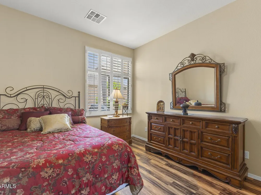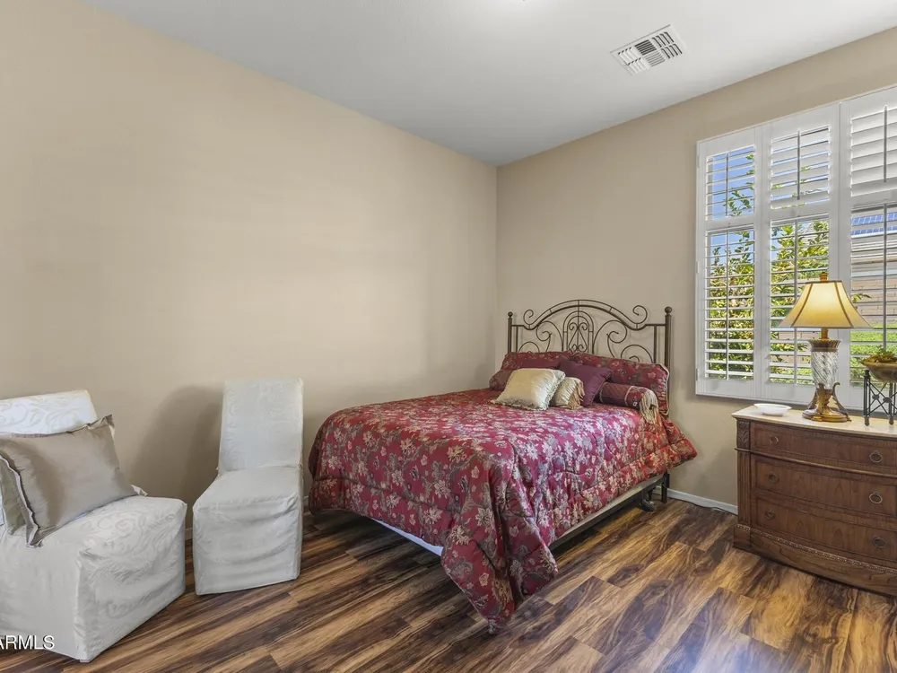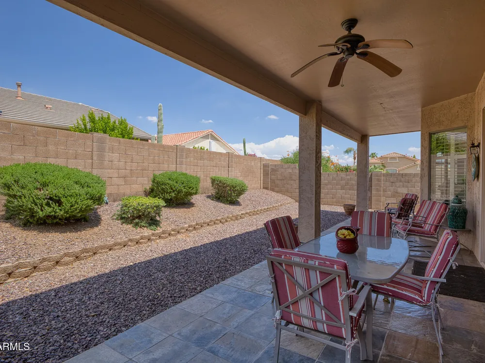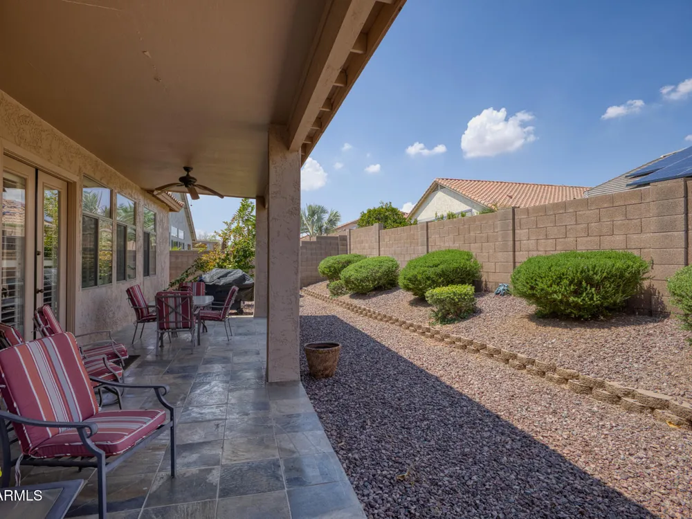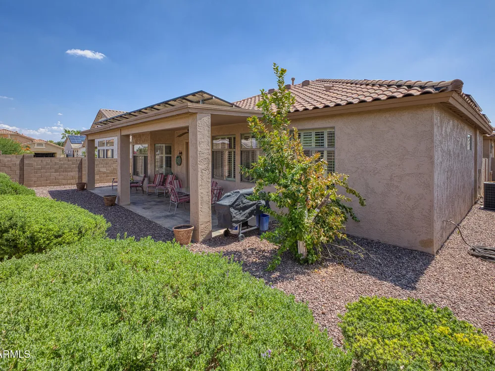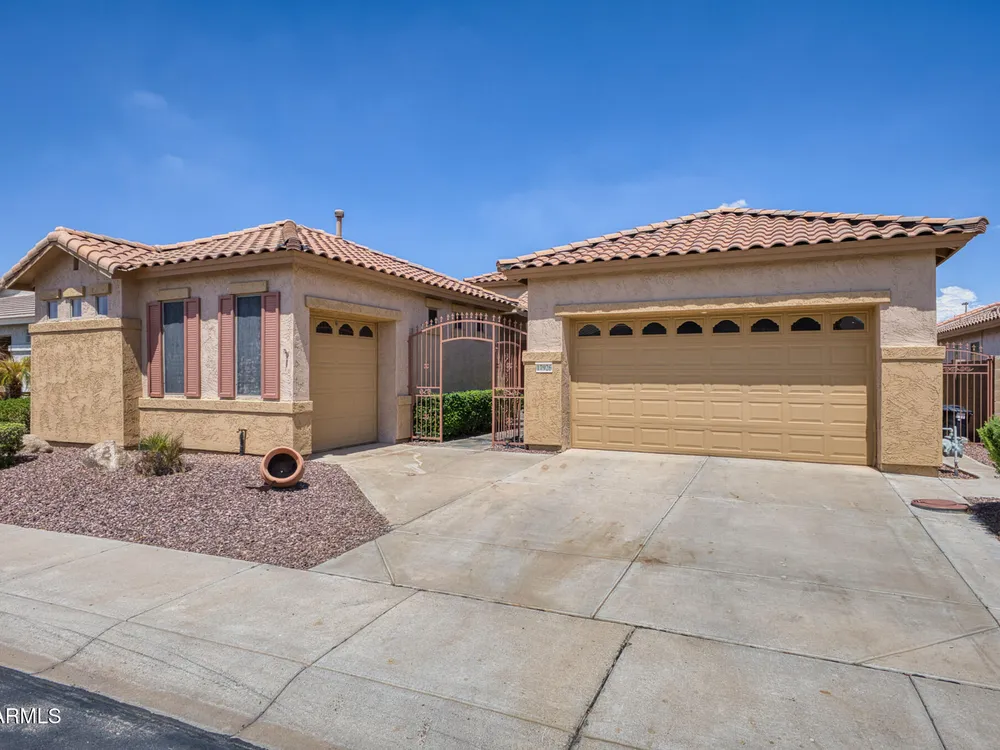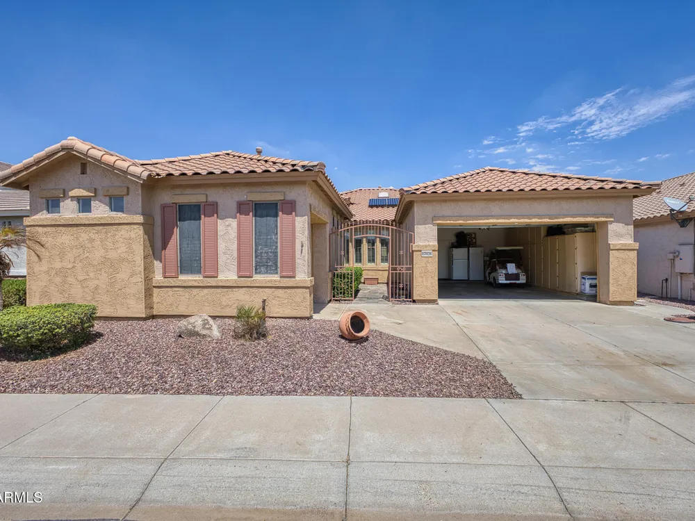 Arizona Traditions, a guard-gated 55+ community, offers golf, pickleball, a community center, fitness, woodworking, baseball, and so much more! This desirable Tapatio model with casita and 3-car garage provides the perfect blend of comfort and function. The main home is 1,962 sq ft, plus a 315 sq ft casita ideal for guests or a private office. Inside, you'll find a split-bedroom layout, plantation shutters throughout, a bay window in the main suite, and a spacious kitchen with granite counters, stainless appliances, slide out shelves, and open flow to the family room. The primary bath includes dual sinks. Additional highlights include raised-panel doors, and lots of garage cabinetry. Step outside to an extended backyard patio and private walled yard—a perfect setting for outdoor living.