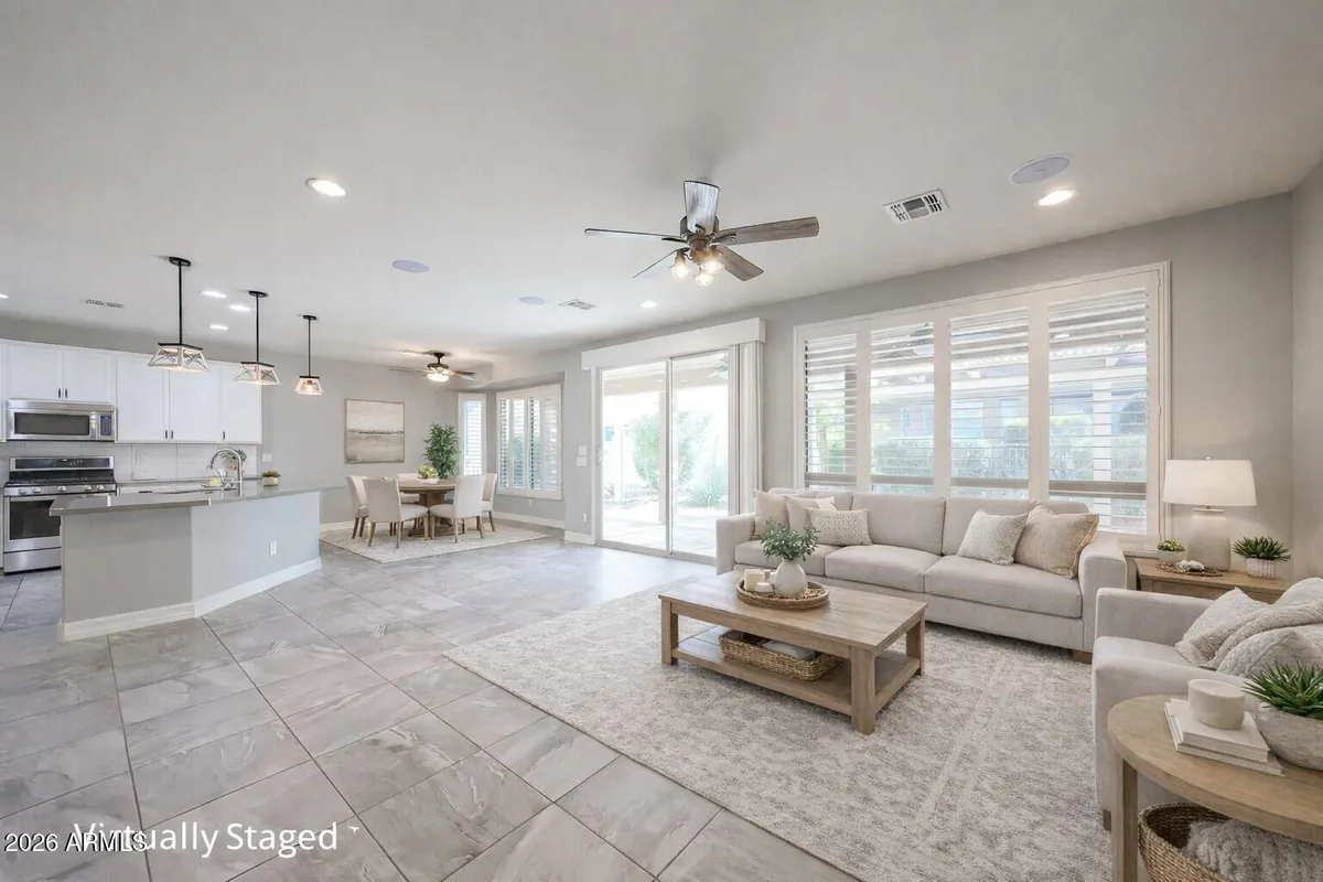 Welcome to effortless desert living in the award-winning 55+ community of CantaMia where energy efficiency, thoughtful design, and vibrant community come together beautifully. From the moment you arrive, the inviting curb appeal sets the tone. Easy-care desert landscaping, a paver driveway, and a charming paver walkway lead you to a private front courtyard--an ideal setting for peaceful morning coffee or evening conversations under Arizona's colorful skies. And with a fully owned solar system keeping average electric bills around just $24 per month for full-time living, you can enjoy exceptional comfort with impressive savings. Inside, the popular Ballad floor plan offers the perfect blend of openness and flexibility with 2 bedrooms, 2 bathrooms, and a versatile den featuring elegant double-glass doors - ideal for a home office, creative studio, or welcoming guest retreat. Abundant windows fill the home with natural light, creating a bright, cheerful atmosphere throughout. The kitchen is designed for both beauty and connection, showcasing crisp white cabinetry, stainless steel appliances, a gas stove, and stylish pendant lighting over the island with breakfast bar seating. The adjacent dining area, highlighted by a charming bay window overlooking the backyard, provides a warm and intimate space for everyday meals or hosting friends. The spacious great room continues the theme of light and openness, with expansive windows and a sliding glass door that seamlessly extends your living space to the covered patio--perfect for embracing indoor-outdoor living year-round. Plantation shutters and tile flooring in high-traffic areas add timeless style and easy maintenance, while the well-appointed laundry room with additional cabinetry offers practical storage and convenience. Your primary suite serves as a serene retreat, complete with a bay window for soft, natural light, a spa-like ensuite bath with dual sinks, a generous walk-in shower, and an expansive walk-in closet designed to keep everything beautifully organized. Step outside to your private backyard oasis, where an extended covered paver patio and pergola create the perfect environment for relaxing afternoons, outdoor dining, or entertaining friends. Low-maintenance landscaping means more time enjoying life and less time on upkeep. Living in CantaMia at Estrella means more than owning a home - it means embracing a lifestyle. Residents enjoy a stunning clubhouse, state-of-the-art fitness center, indoor and outdoor pools, pickleball courts, scenic walking trails, tranquil lakes, and a dynamic calendar of social clubs and events. It's a community centered on connection, wellness, and everyday enjoyment.