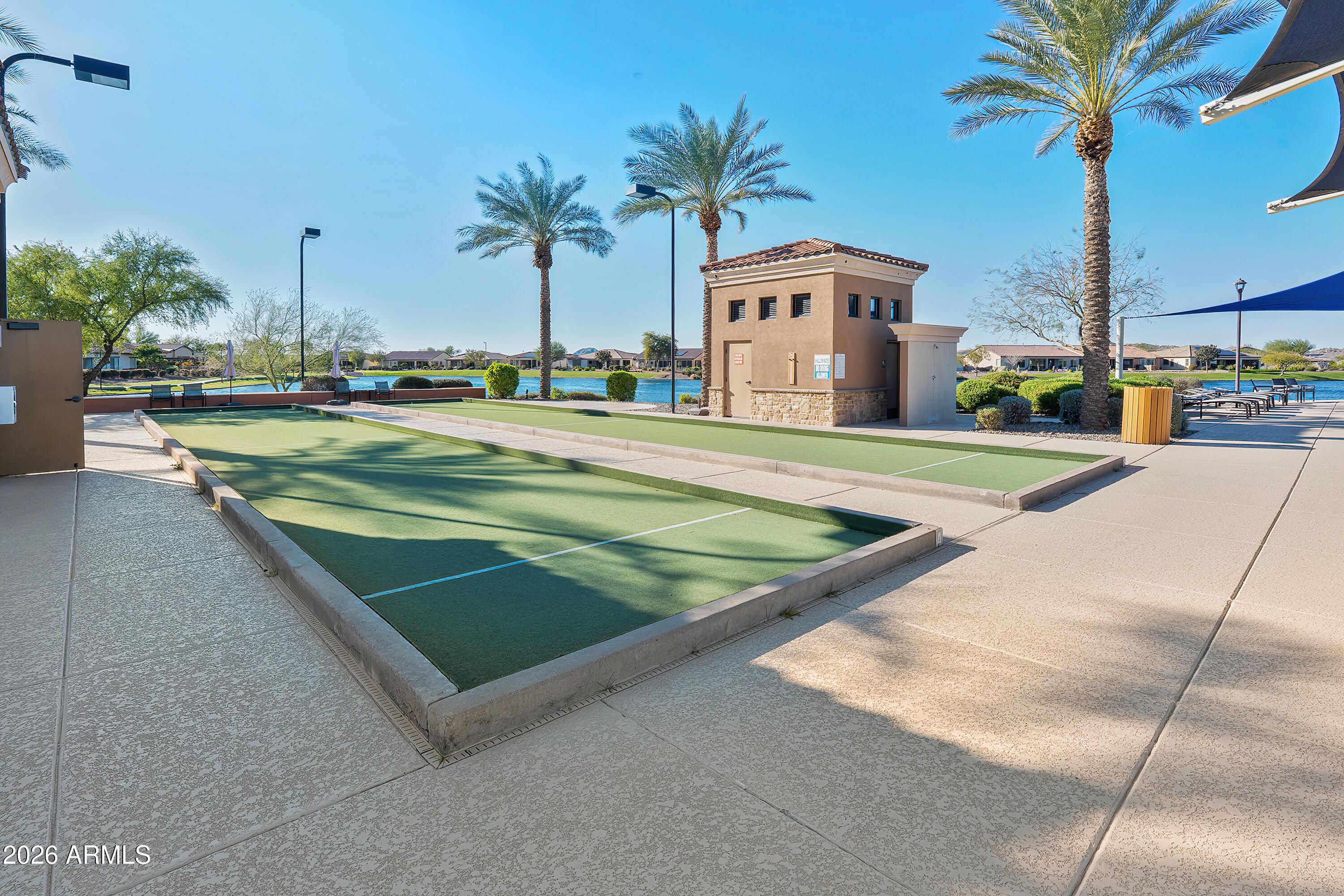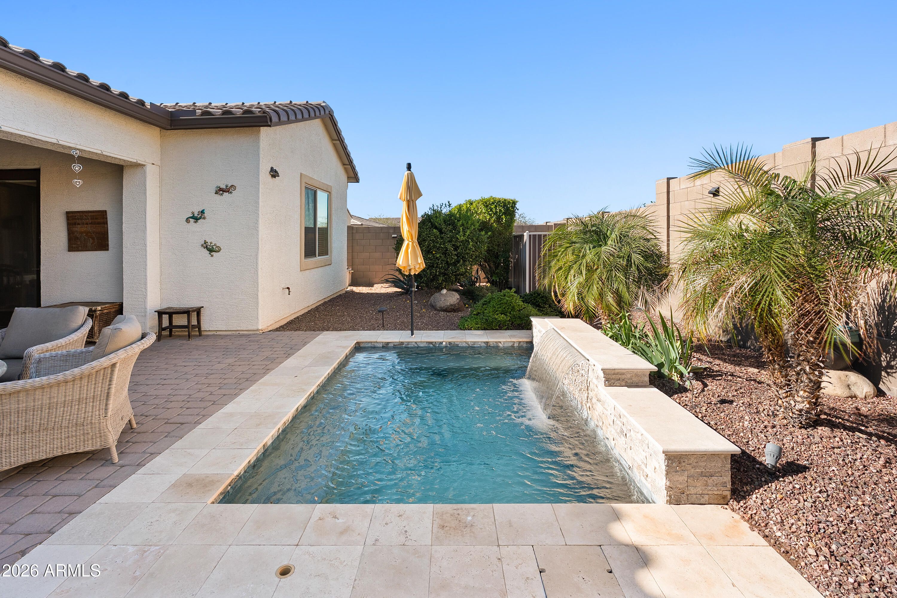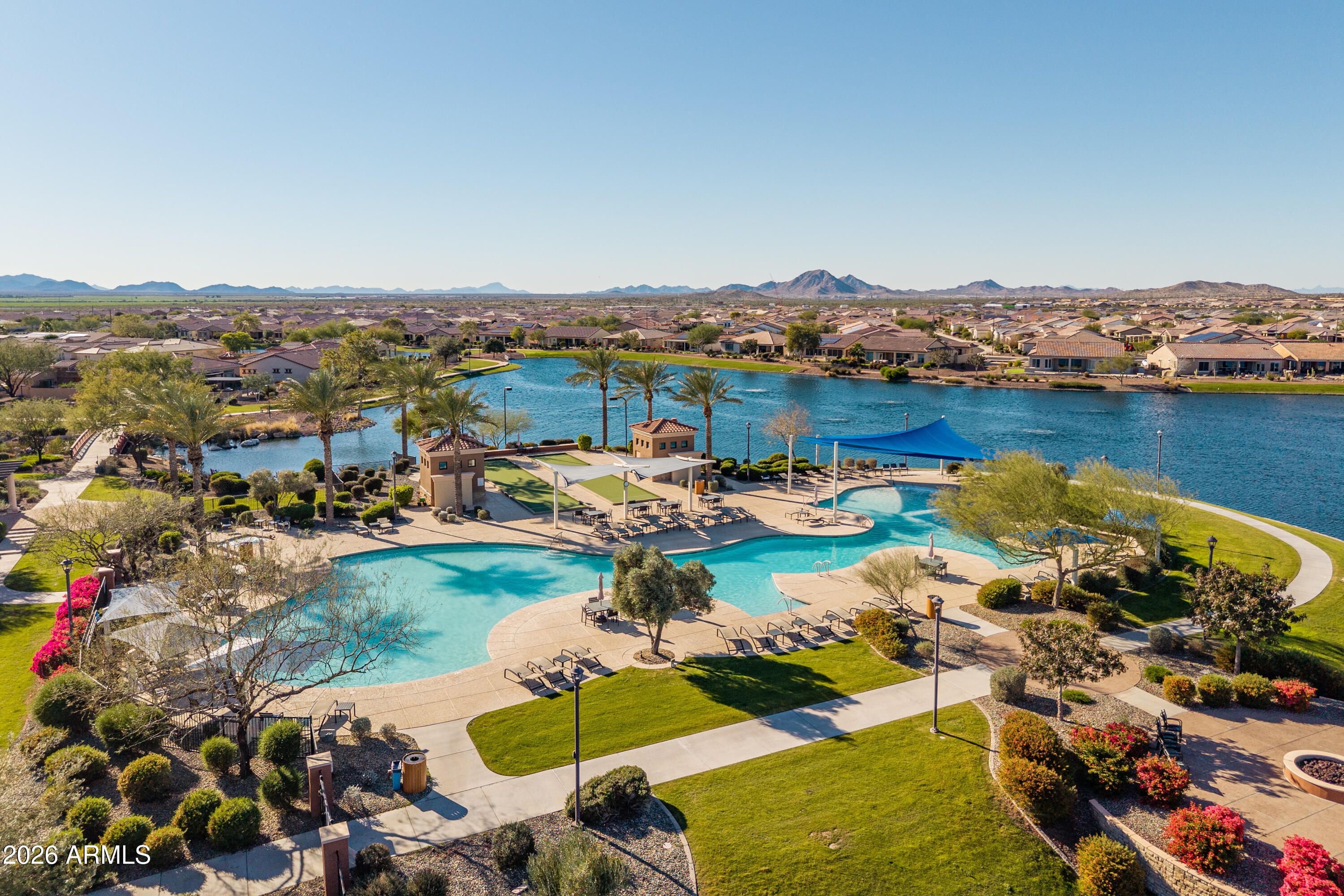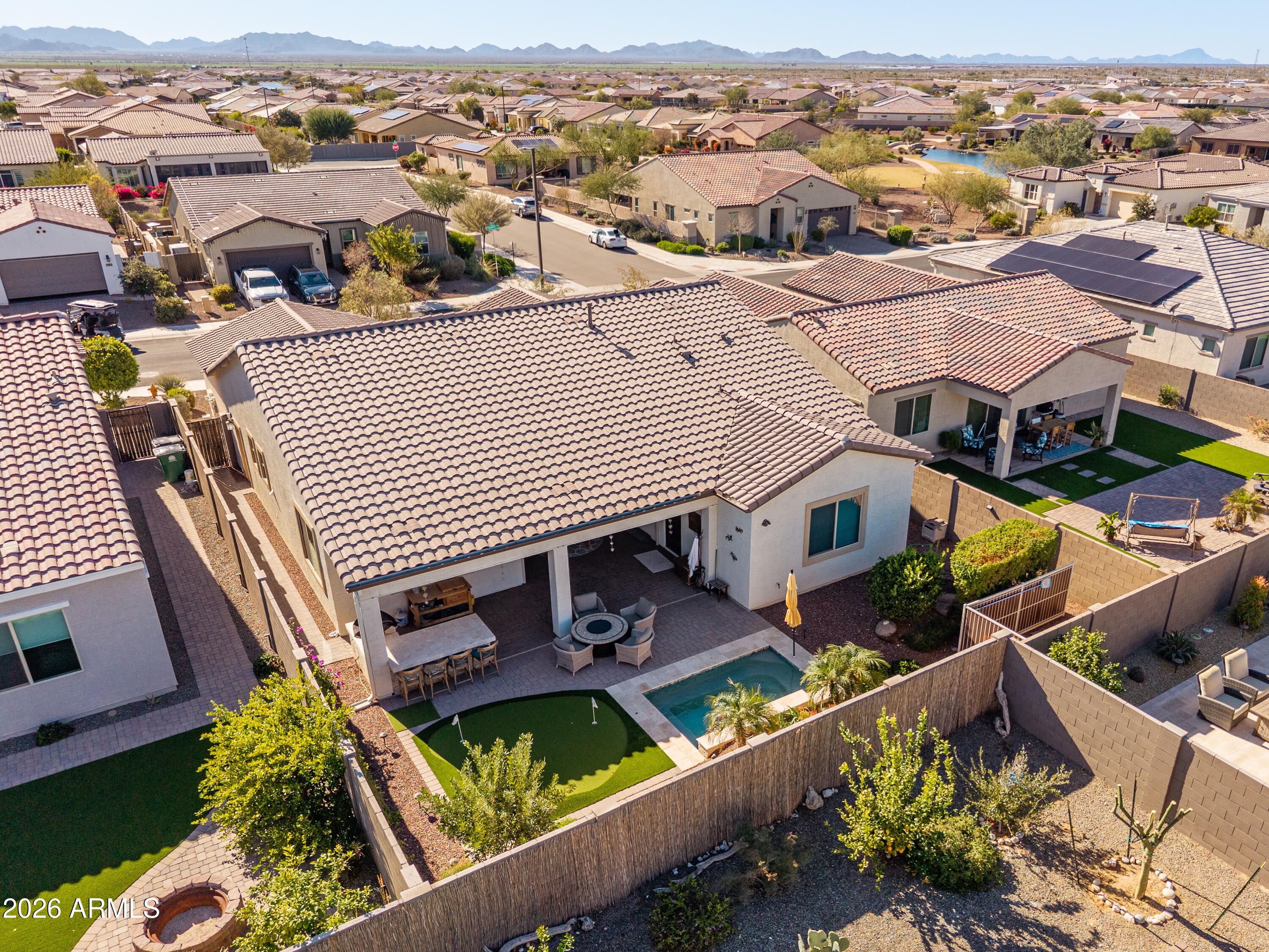 Experience the best of Arizona living in the CantaMia gated 55+ lake community. This stunning Maestro model offers an active, social lifestyle with resort-style amenities. Featuring 3 bedrooms and 2 bathrooms + Den, this impeccably maintained, move-in-ready home is one you'll be proud to showcase. Owned solar adds exceptional value, while the expansive extended covered patio leads to a heated spool and your own putting green, perfect for entertaining or relaxing year-round. Need space for extra toys? The garage includes a 4-foot extension for added storage and flexibility. With countless upgrades throughout, this home truly stands out. Don't miss your opportunity—stop by today and experience this exceptional property for yourself.