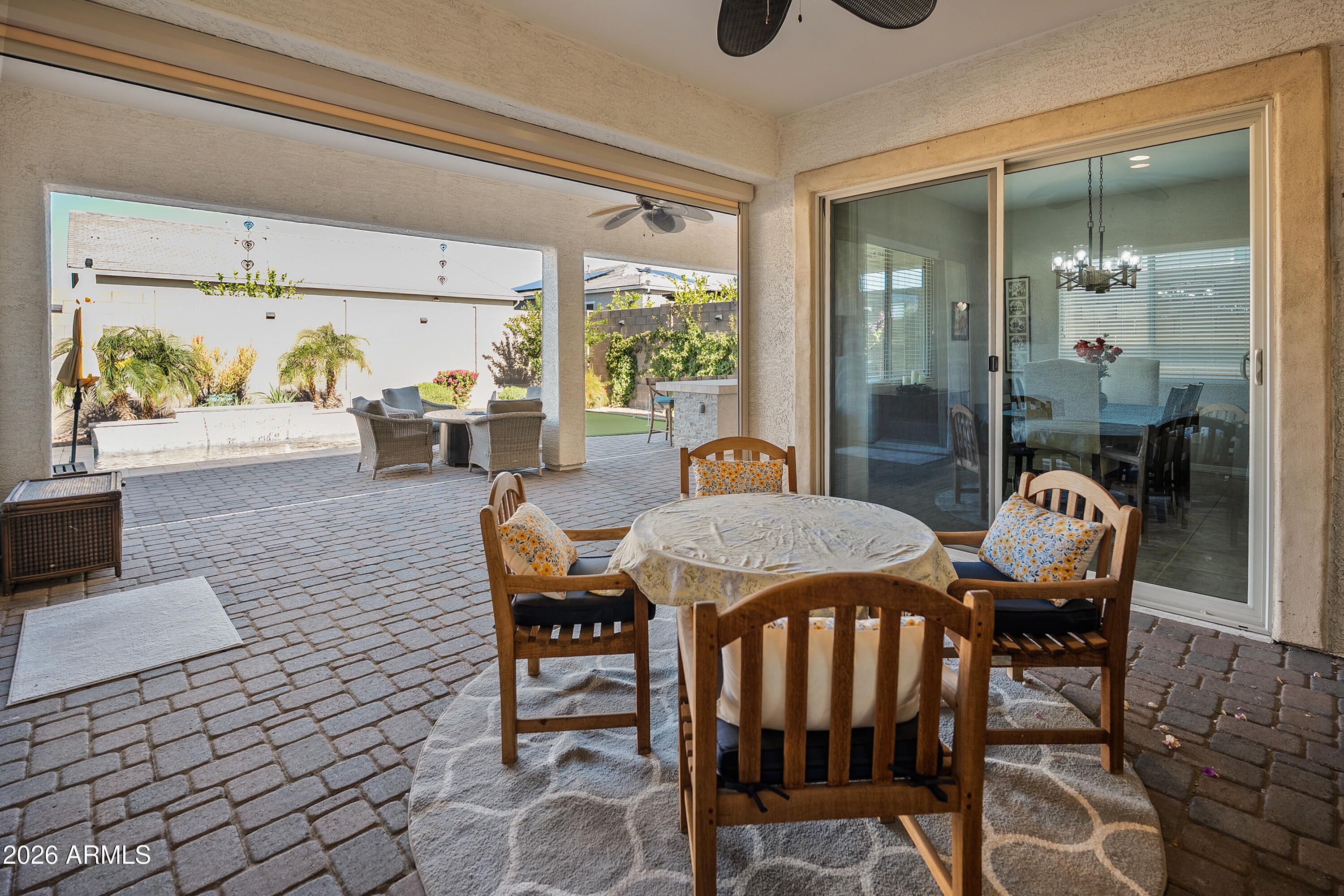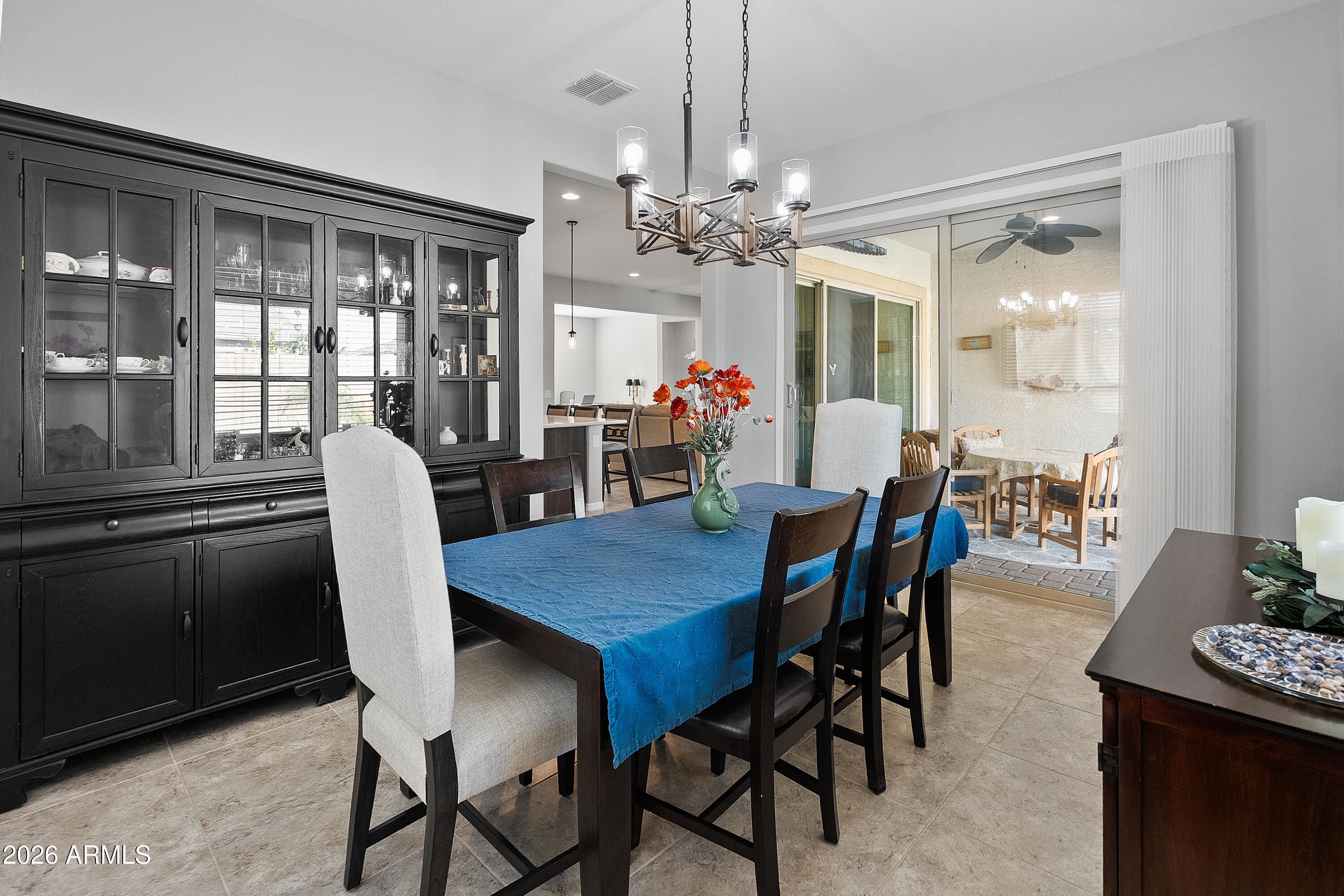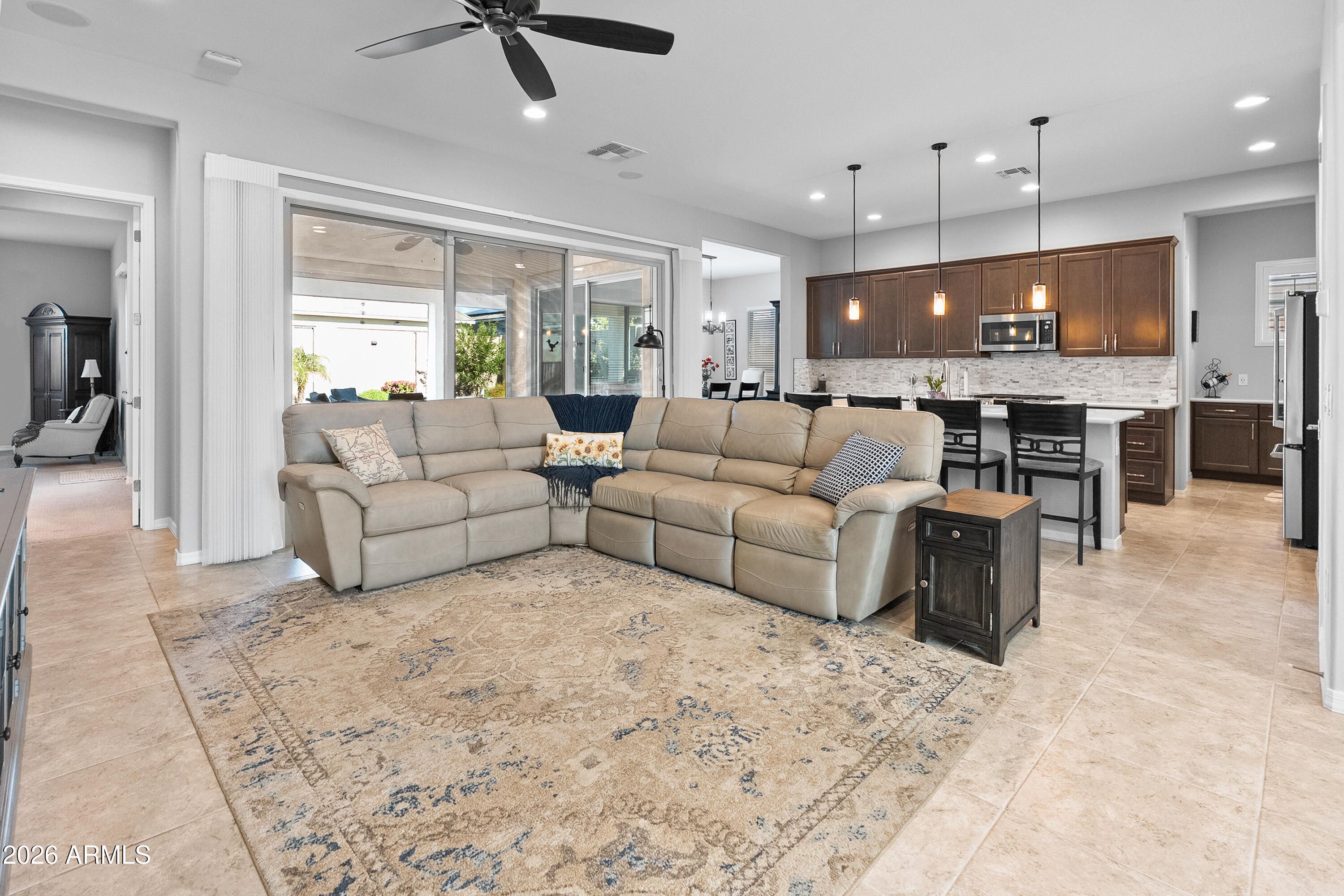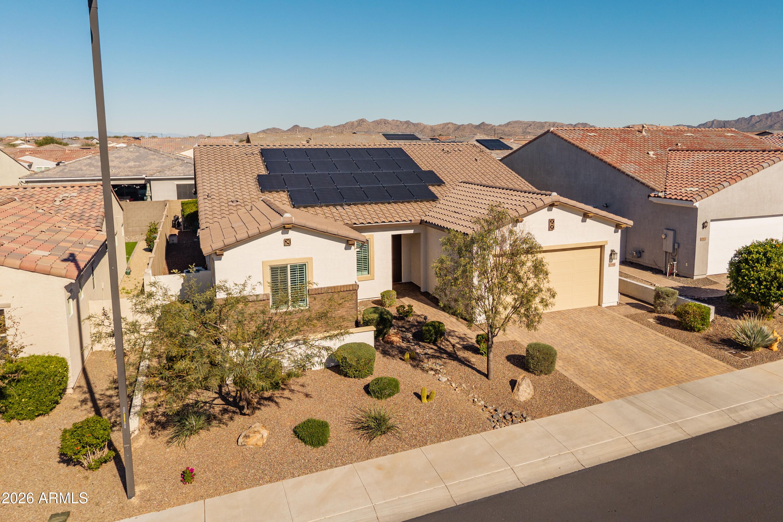 Experience the best of Arizona living in the CantaMia gated 55+ lake community. This stunning Maestro model offers an active, social lifestyle with resort-style amenities. Featuring 3 bedrooms and 2 bathrooms + Den, this impeccably maintained, move-in-ready home is one you'll be proud to showcase. Owned solar adds exceptional value, while the expansive extended covered patio leads to a heated spool and your own putting green, perfect for entertaining or relaxing year-round. Need space for extra toys? The garage includes a 4-foot extension for added storage and flexibility. With countless upgrades throughout, this home truly stands out. Don't miss your opportunity—stop by today and experience this exceptional property for yourself.