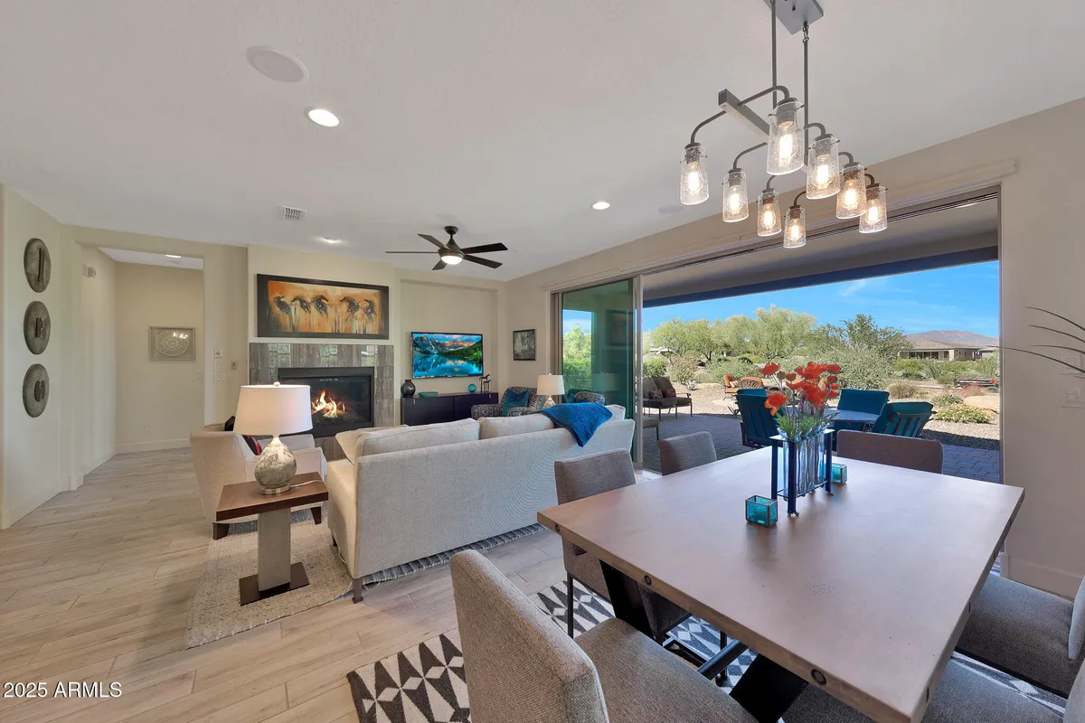 Enjoy stunning Four Peaks mountain views from the private backyard of this immaculate home in Trilogy at Verde River. Built in 2019 and sold fully furnished (with limited art exclusions), this residence is ideal for seasonal ownership or full-time living. The backyard retreat features an extended covered patio with pavers, built-in BBQ, mature landscaping, and direct access to the community walking path with views of Four Peaks mountain range. Inside, an open-concept design showcases a family room with pocketing doors, decorative tile fireplace, and wood-look tile flooring in all the right areas. The kitchen offers granite and quartz countertops, GE stainless-steel appliances, a gas cooktop, center island with seating, and a custom pantry with built-ins.