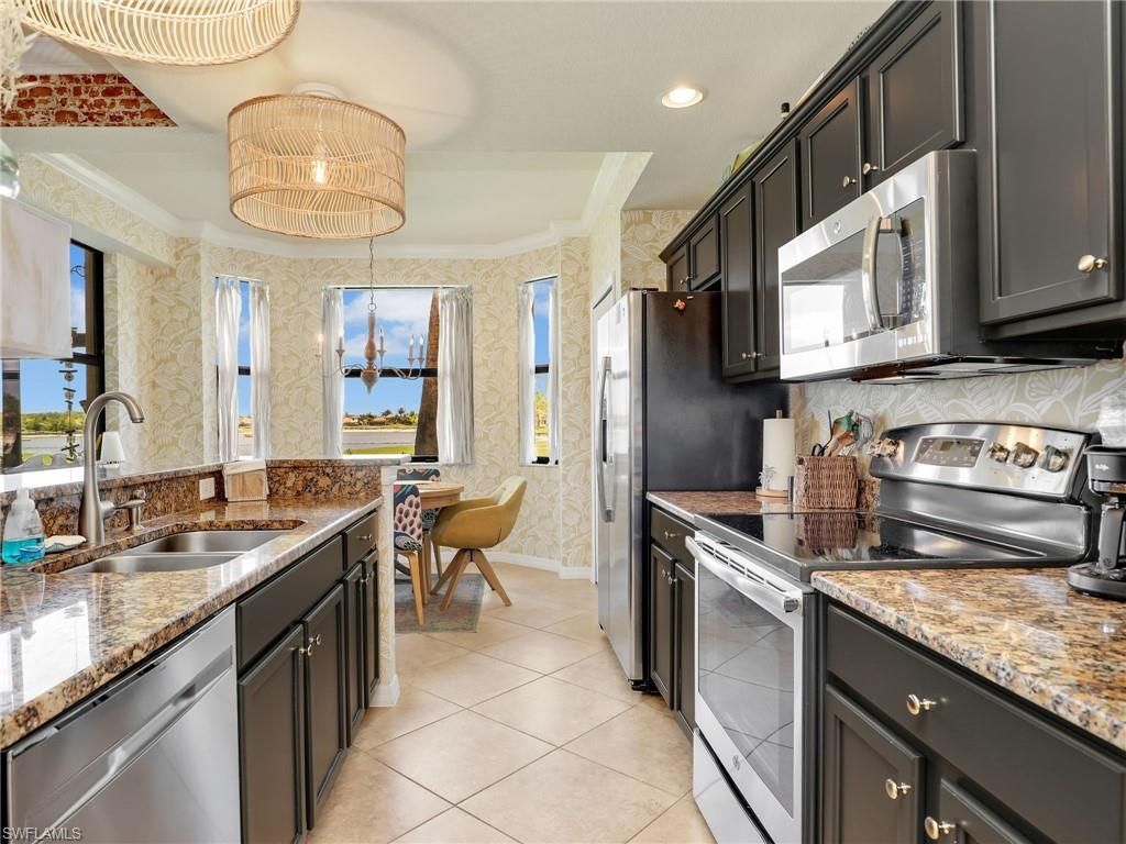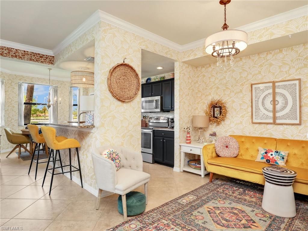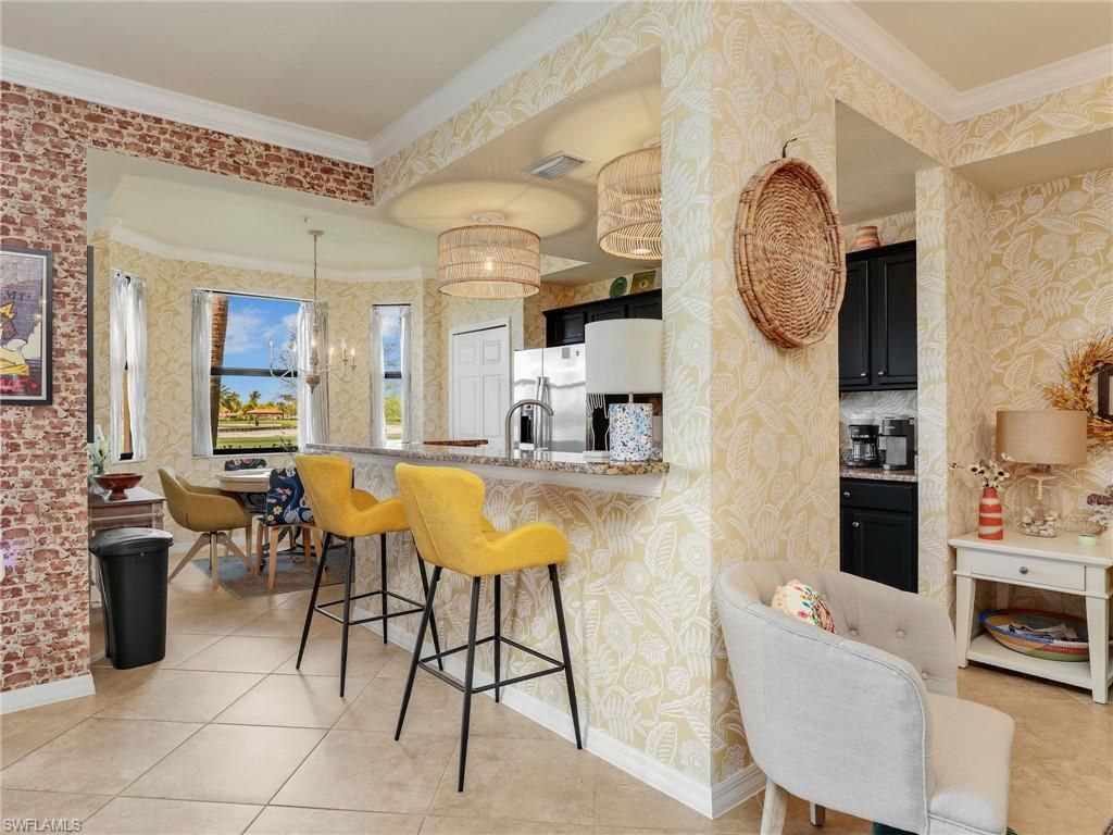 Experience the ultimate Southwest Florida lifestyle in Bonita National Golf and Country Club, one of the area’s most sought after bundled golf communities. This turnkey furnished first floor Bellini floor plan offers 2 bedrooms and 2 bathrooms with an open and inviting layout designed for comfort and convenience.The interior features tile flooring throughout and crown molding throughout, creating a clean and cohesive look. The kitchen is equipped with stainless steel appliances, granite countertops, and a charming breakfast nook that adds additional dining space. The home is tastefully furnished and ready for immediate enjoyment.The living area flows seamlessly to a private screened lanai where western exposure provides stunning sunset views overlooking the golf course. The primary suite includes a walk in shower and a well appointed layout designed for comfort.This residence includes a golf membership, giving you access to the Gordon Lewis designed championship course along with an impressive collection of resort style amenities. Residents enjoy a grand clubhouse, multiple dining options, a lagoon style pool with waterfall, poolside cabana bar and restaurant, fitness center, spa, tennis courts, and an active social calendar.Set within a gated community surrounded by lakes and preserves, this property offers a perfect balance of relaxation and recreation close to beaches, shopping, and dining.